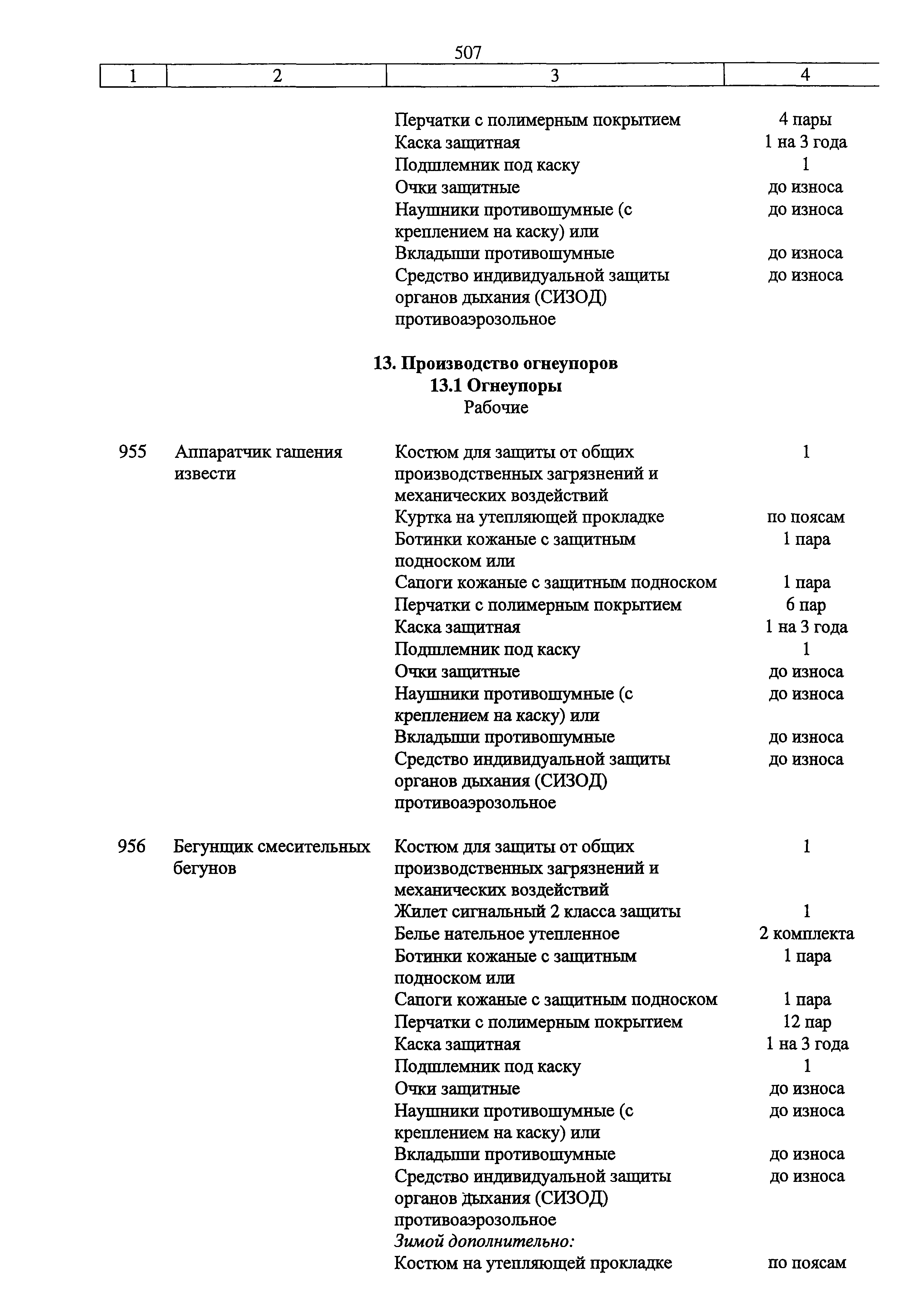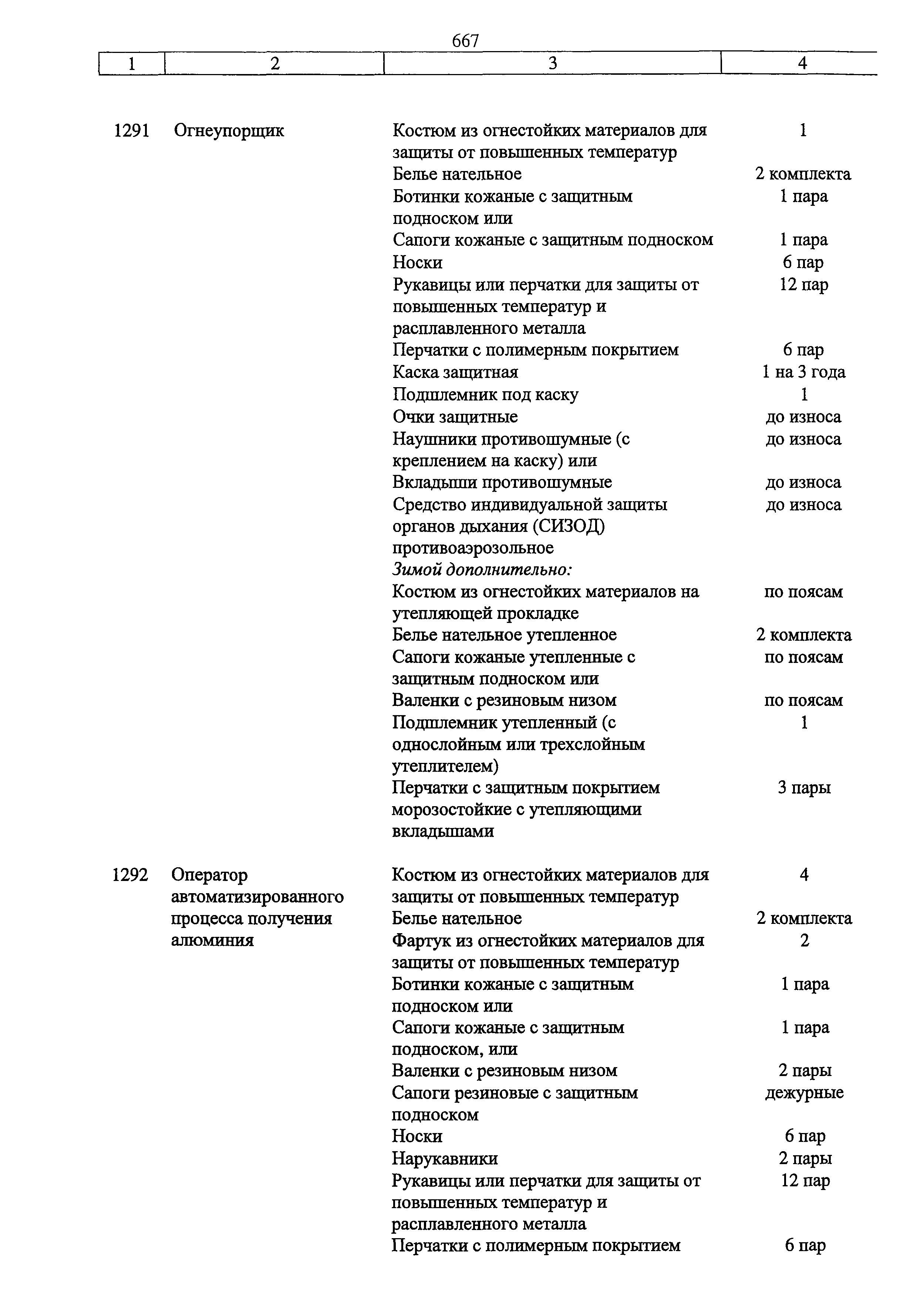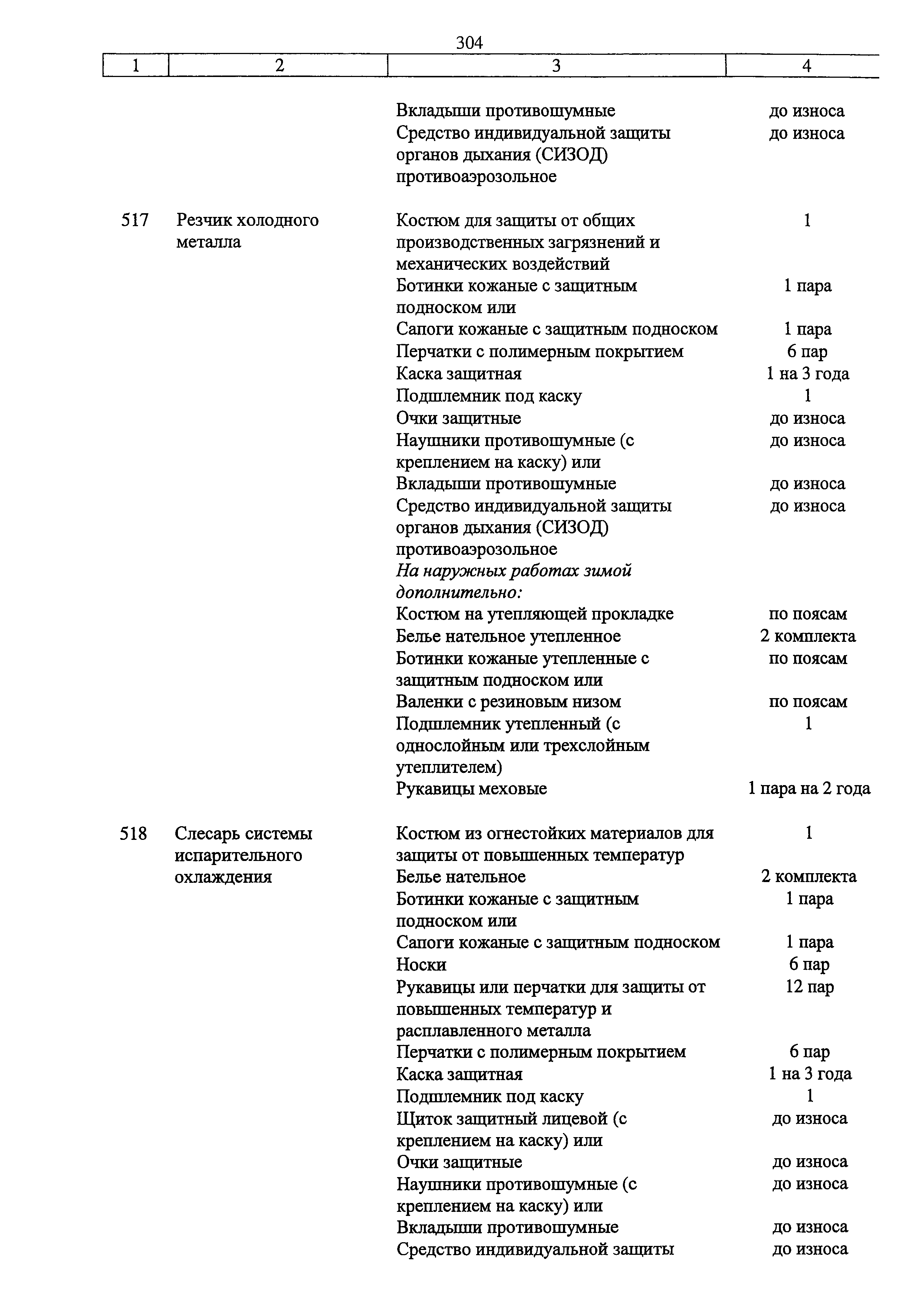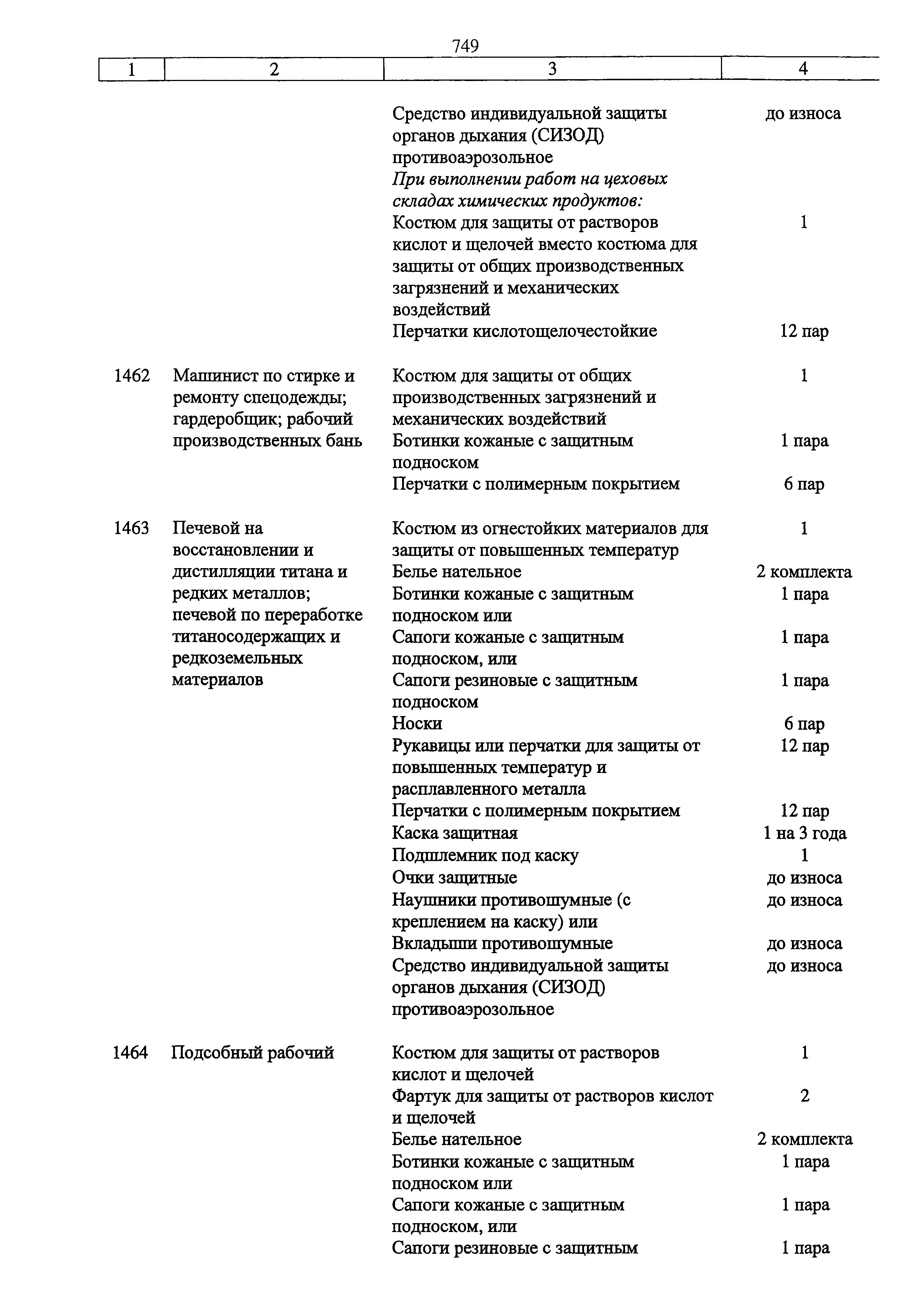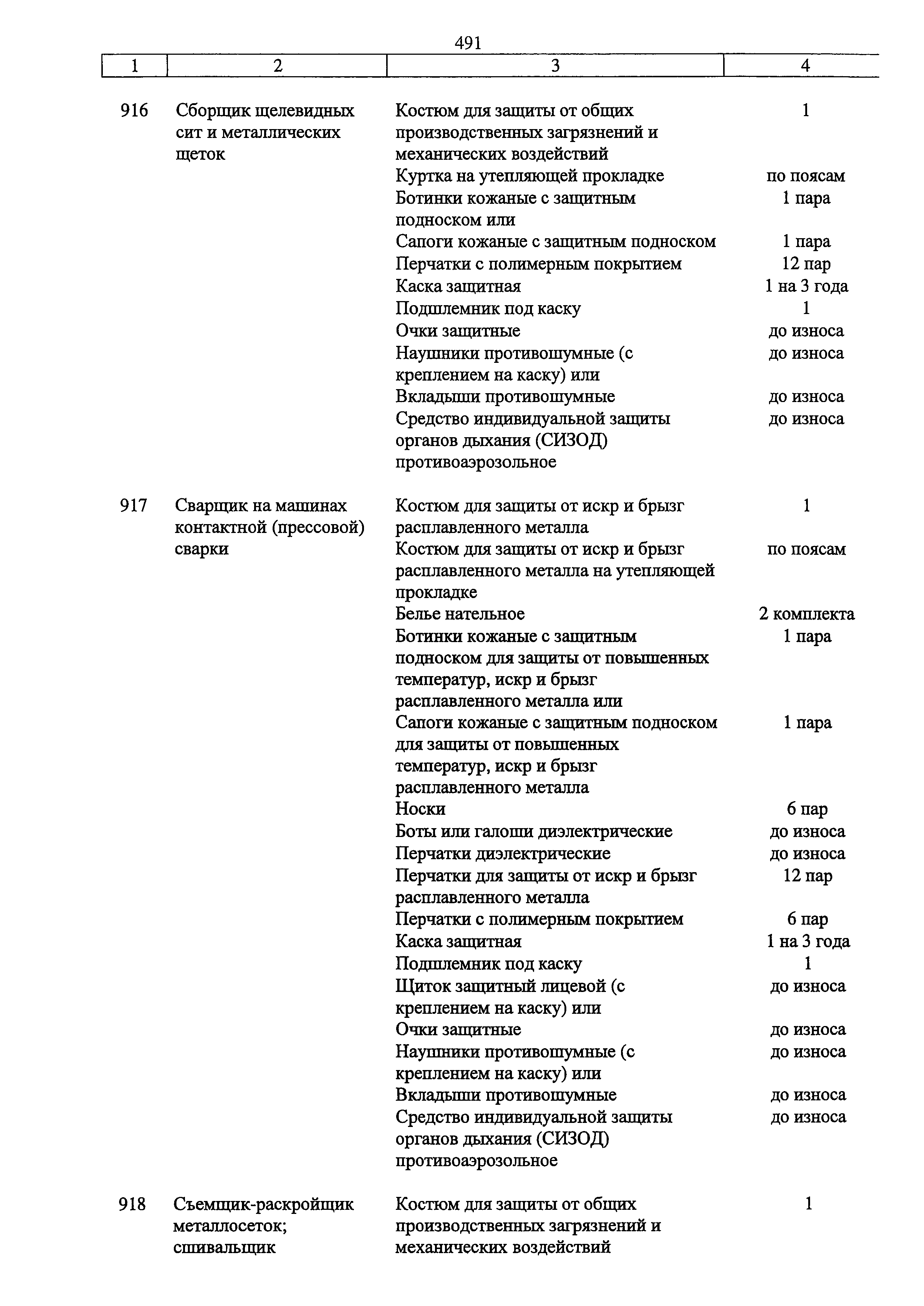 Типовые нормы бесплатной выдачи специальной одежды, специальной обуви и других средств индивидуальной защиты работникам горной и металлургической промышленности и металлургических производств других отраслей промышленности, занятым на работах с вредными и (или) опасными условиями труда, а также на работах, выполняемых в особых температурных условиях или связанных с загрязнением| Статус: | действует | | Название рус.: | Типовые нормы бесплатной выдачи специальной одежды, специальной обуви и других средств индивидуальной защиты работникам горной и металлургической промышленности и металлургических производств других отраслей промышленности, занятым на работах с вредными и (или) опасными условиями труда, а также на работах, выполняемых в особых температурных условиях или связанных с загрязнением | | Дата добавления в базу: | 01.02.2017 | | Дата актуализации: | 01.01.2021 | | Дата введения: | 14.02.2014 | | Область применения: | Нормы утверждаются локальными нормативными актами работодателя на основании результатов аттестации рабочих мест по условиям труда и могут быть включены в коллективный и (или) трудовой договор с указанием типовых норм, по сравнению с которыми улучшается обеспечение работников специальной одеждой, специальной обувью и другими средствами индивидуальной защиты. | | Оглавление: | I Горнодобывающая промышленность 1 Подземные горные работы (шахты) 2 Открытые горные работы и шахтная поверхность 3 Работа на гидравлических установках или с промывочными приборами 4 Дражные работы II Дробление, обогащение, брикетирование, обжиг, агломерация, извлечение металлов и сплавов III Черная металлургия 1 Коксохимическое производство 1.1 Углеподготовительные цеха 1.2 Углеобогатительные цеха 1.3 Производство каменноугольного кокса 1.4 Производство кристаллического нафталина, кумароновой смолы, смолоперерабатывающие цеха 1.5 Производство пиридиновых и фенольно-крезольных продуктов 1.6 Цеха улавливания химических продуктов и газовые цеха 1.7 Цеха ректификации сырого бензола 1.8 Цеха очистки коксового газа от сероводорода 1.9 Производство пекового кокса 1.10 Производство термоантрацита 2 Доменное производство 3 Сталеплавильное производство 3.1 Установки непрерывной разливки стали 4 Производство ферросплавов 4.1 Электролитическое производство 4.2 Производство электролитического хрома 4.3 Производство феррованадия 4.4 Подготовка шихты, обжиг руд и концентратов 4.5 Разливка и разделка ферросплавов 4.6 Обжиг извести 4.7 Общие профессии и должности ферросплавного производства 5 Прокатное производство 6 Производство труб (прокатка, сварка и волочение) 7 Колесопрокатное и бандажное производства 8 Валопрокатное производство 9 Производство рельсовых скреплений 10 Производство баллонов 11 Труболитейное производство 12 Производство метизов 12.1 Производство металлических канатов, сеток, пружин и пружинной ленты, щеток, цепей, колючей проволоки и других метизов 12.2 Волочение проволоки, калибровка и шлифовка металла 12.3 Изготовление волок 12.4 Холодноштамповочные и кузнечно-прессовые работы 12.5 Термическая обработка 12.6 Травление металла, защитные покрытия проволоки и извлечение железного купороса 12.7 Производство металлических электродов и порошковой проволоки 13 Производство огнеупоров 13.1 Огнеупоры 13.2 Карборундовые стержни 13.3 Высокоогнеупорные окислы 14 Ремонт 