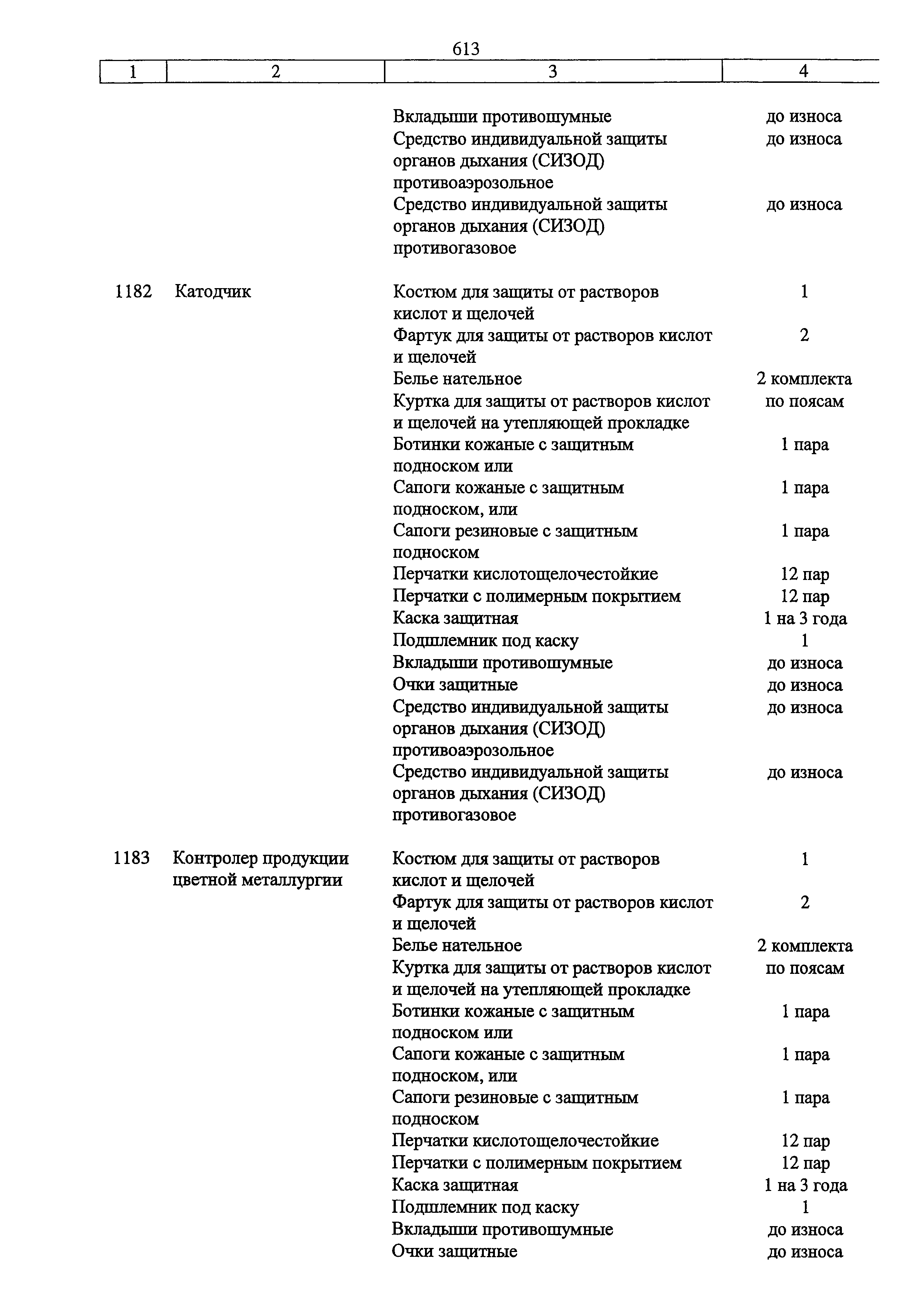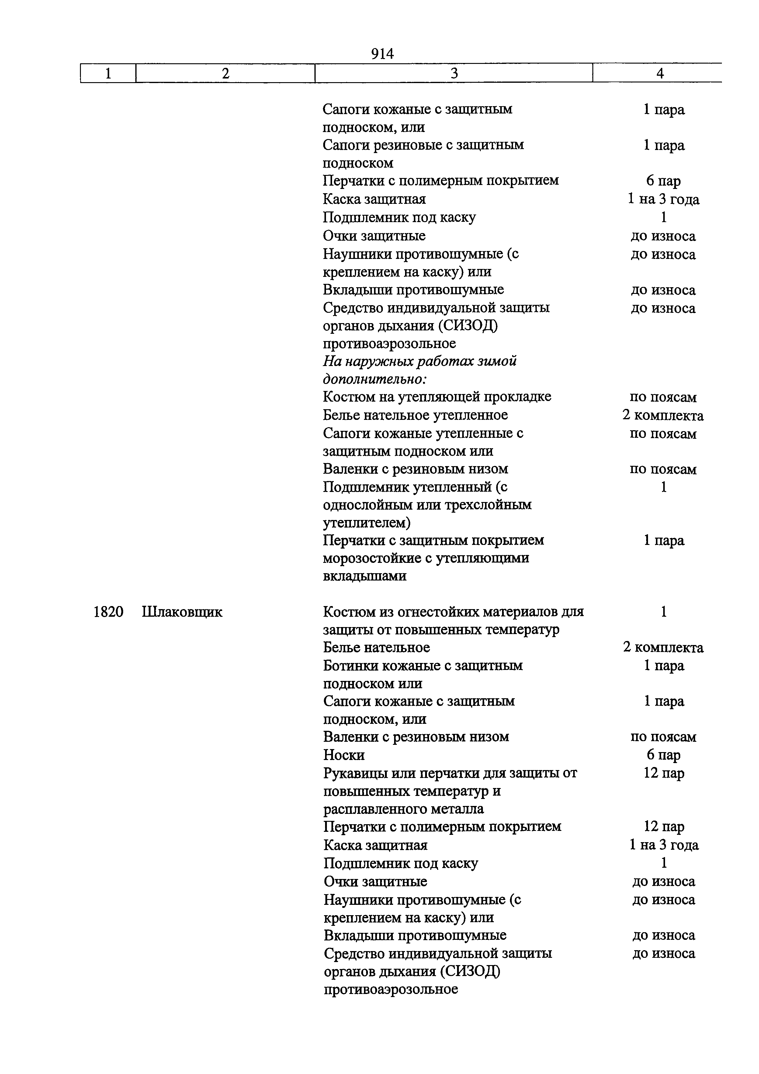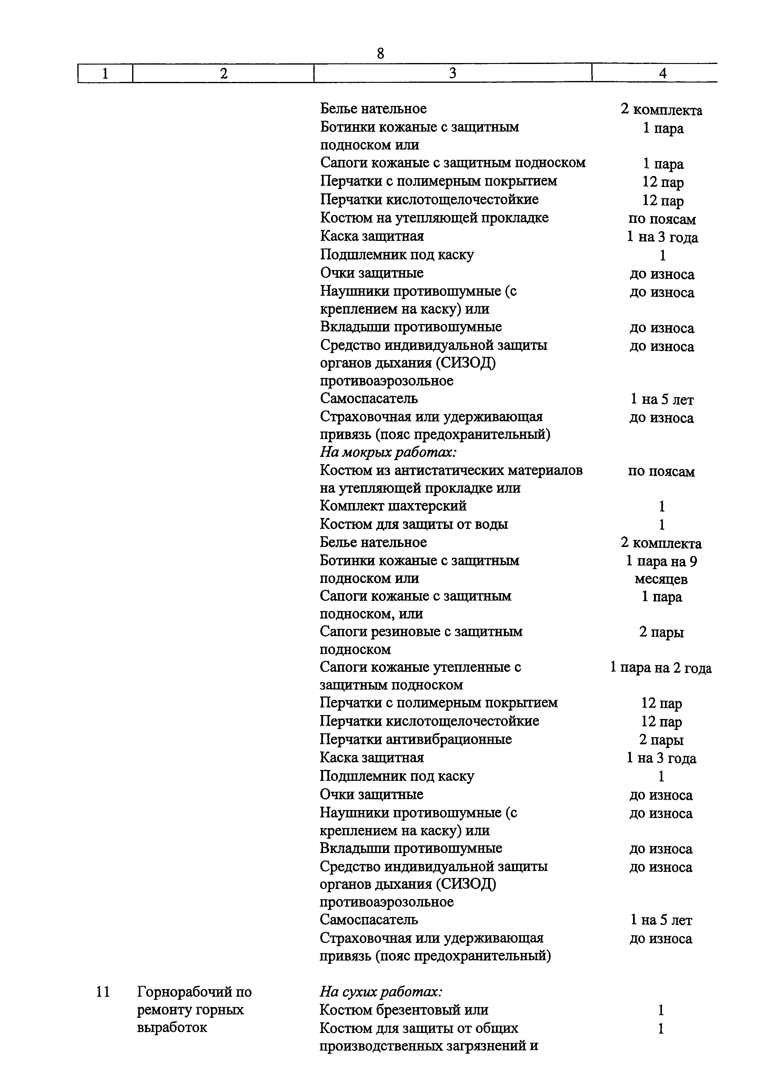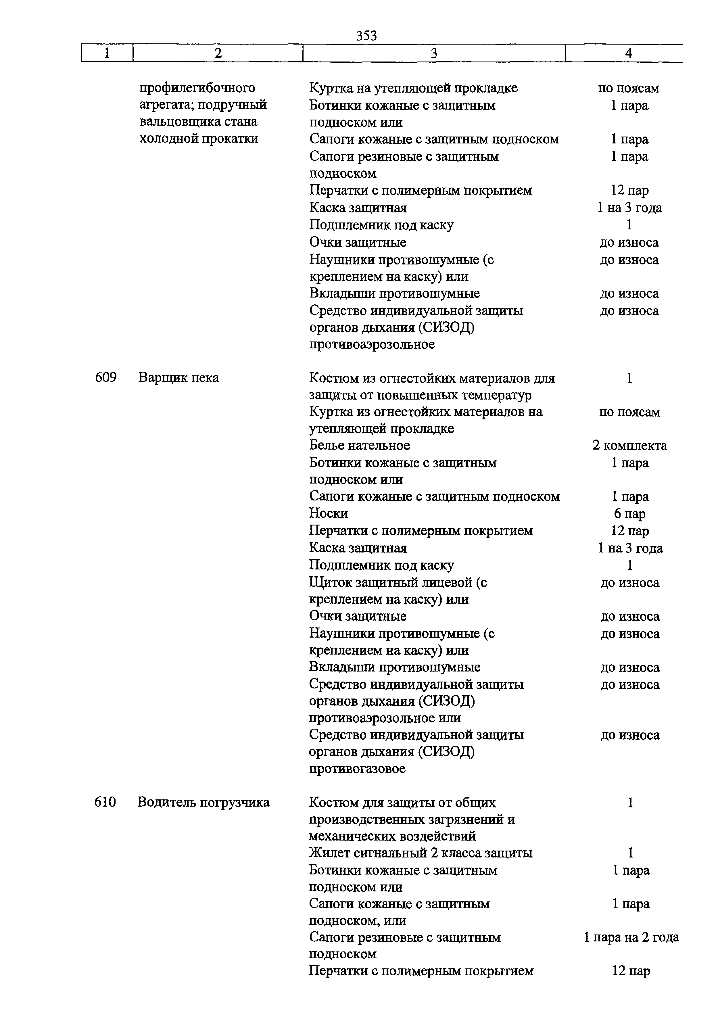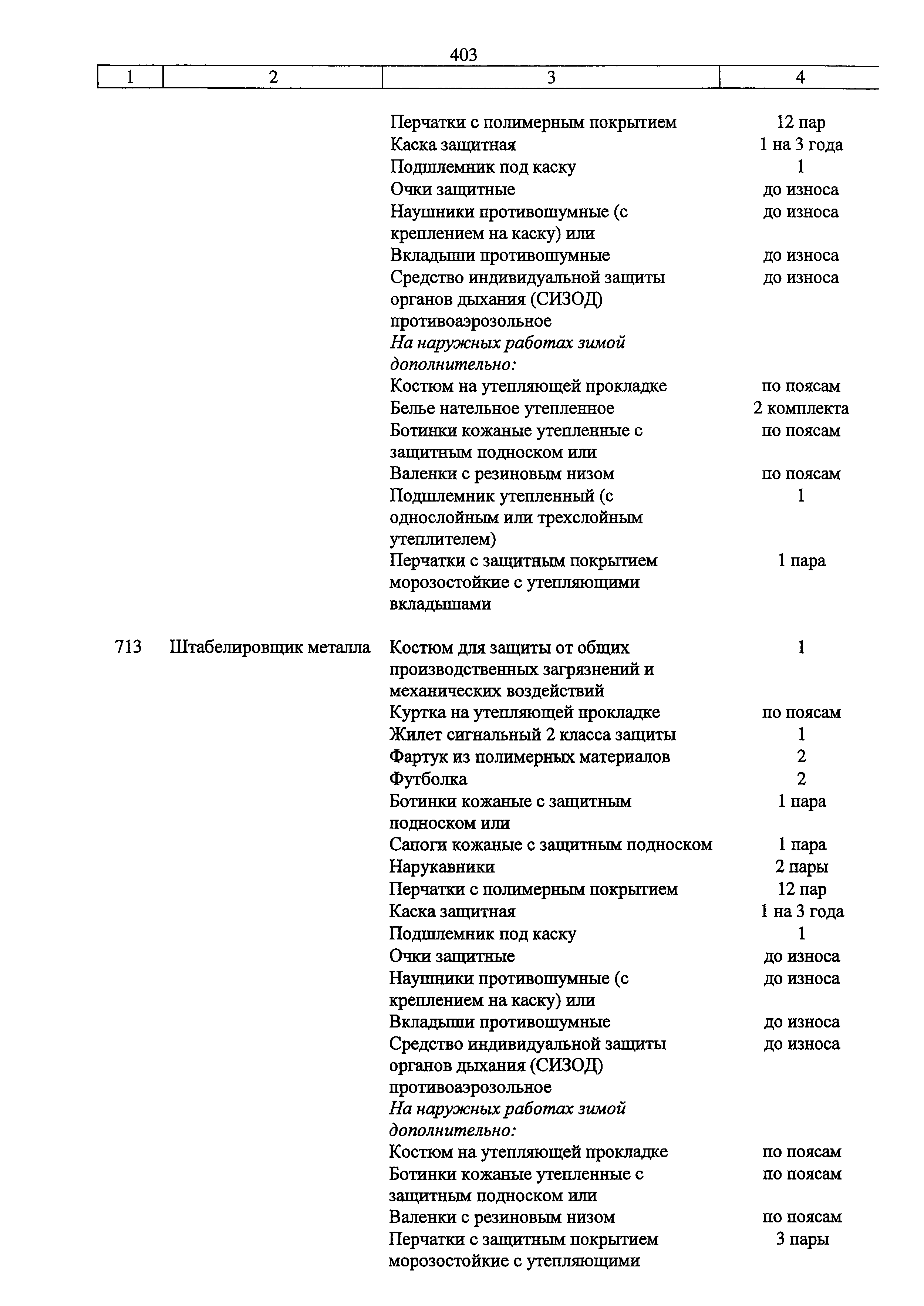 Типовые нормы бесплатной выдачи специальной одежды, специальной обуви и других средств индивидуальной защиты работникам горной и металлургической промышленности и металлургических производств других отраслей промышленности, занятым на работах с вредными и (или) опасными условиями труда, а также на работах, выполняемых в особых температурных условиях или связанных с загрязнением| Статус: | действует | | Название рус.: | Типовые нормы бесплатной выдачи специальной одежды, специальной обуви и других средств индивидуальной защиты работникам горной и металлургической промышленности и металлургических производств других отраслей промышленности, занятым на работах с вредными и (или) опасными условиями труда, а также на работах, выполняемых в особых температурных условиях или связанных с загрязнением | | Дата добавления в базу: | 01.02.2017 | | Дата актуализации: | 01.01.2021 | | Дата введения: | 14.02.2014 | | Область применения: | Нормы утверждаются локальными нормативными актами работодателя на основании результатов аттестации рабочих мест по условиям труда и могут быть включены в коллективный и (или) трудовой договор с указанием типовых норм, по сравнению с которыми улучшается обеспечение работников специальной одеждой, специальной обувью и другими средствами индивидуальной защиты. | | Оглавление: | I Горнодобывающая промышленность 1 Подземные горные работы (шахты) 2 Открытые горные работы и шахтная поверхность 3 Работа на гидравлических установках или с промывочными приборами 4 Дражные работы II Дробление, обогащение, брикетирование, обжиг, агломерация, извлечение металлов и сплавов III Черная металлургия 1 Коксохимическое производство 1.1 Углеподготовительные цеха 1.2 Углеобогатительные цеха 1.3 Производство каменноугольного кокса 1.4 Производство кристаллического нафталина, кумароновой смолы, смолоперерабатывающие цеха 1.5 Производство пиридиновых и фенольно-крезольных продуктов 1.6 Цеха улавливания химических продуктов и газовые цеха 1.7 Цеха ректификации сырого бензола 1.8 Цеха очистки коксового газа от сероводорода 1.9 Производство пекового кокса 1.10 Производство термоантрацита 2 Доменное производство 3 Сталеплавильное производство 3.1 Установки непрерывной разливки стали 4 Производство ферросплавов 4.1 Электролитическое производство 4.2 Производство электролитического хрома 4.3 Производство феррованадия 4.4 Подготовка шихты, обжиг руд и концентратов 4.5 Разливка и разделка ферросплавов 4.6 Обжиг извести 4.7 Общие профессии и должности ферросплавного производства 5 Прокатное производство 6 Производство труб (прокатка, сварка и волочение) 7 Колесопрокатное и бандажное производства 8 Валопрокатное производство 9 Производство рельсовых скреплений 10 Производство баллонов 11 Труболитейное производство 12 Производство метизов 12.1 Производство металлических канатов, сеток, пружин и пружинной ленты, щеток, цепей, колючей проволоки и других метизов 12.2 Волочение проволоки, калибровка и шлифовка металла 12.3 Изготовление волок 12.4 Холодноштамповочные и кузнечно-прессовые работы 12.5 Термическая обработка 12.6 Травление металла, защитные покрытия проволоки и извлечение железного купороса 12.7 Производство металлических электродов и порошковой проволоки 13 Производство огнеупоров 13.1 Огнеупоры 13.2 Карборундовые стержни 13.3 Высокоогнеупорные окислы 14 Ремонт 