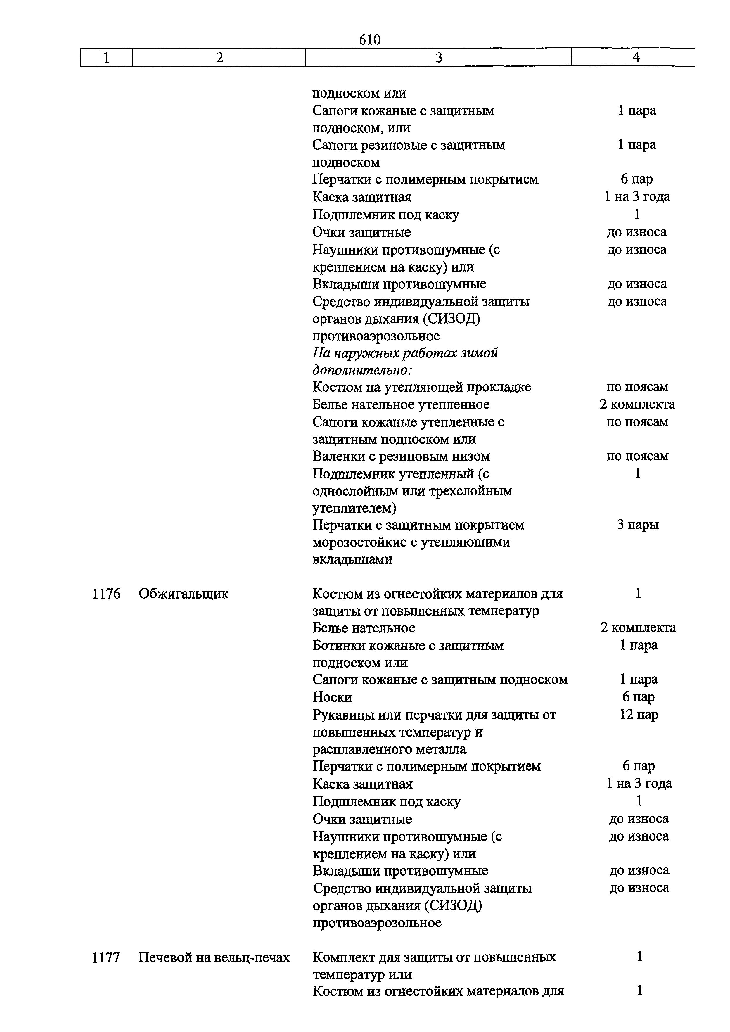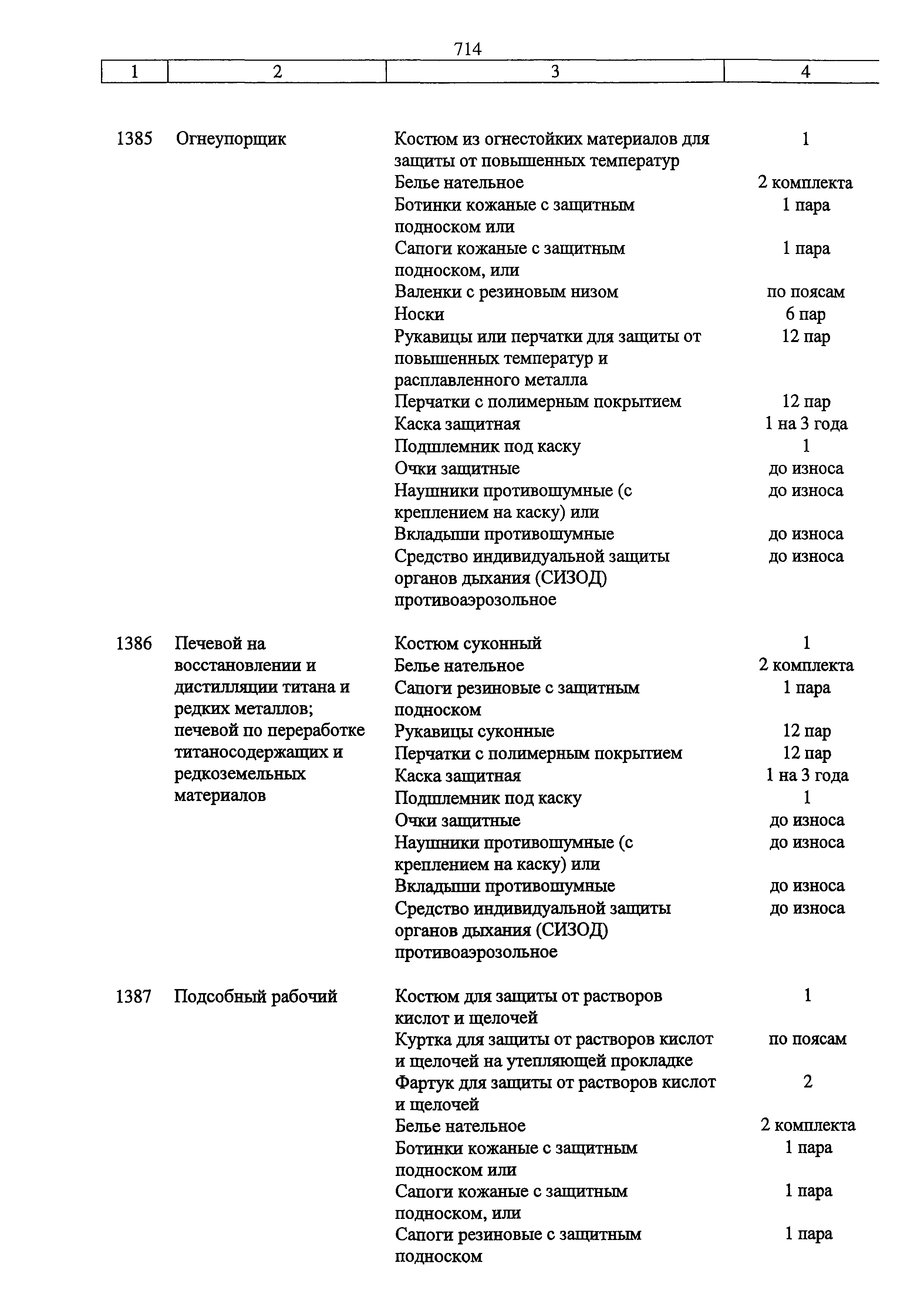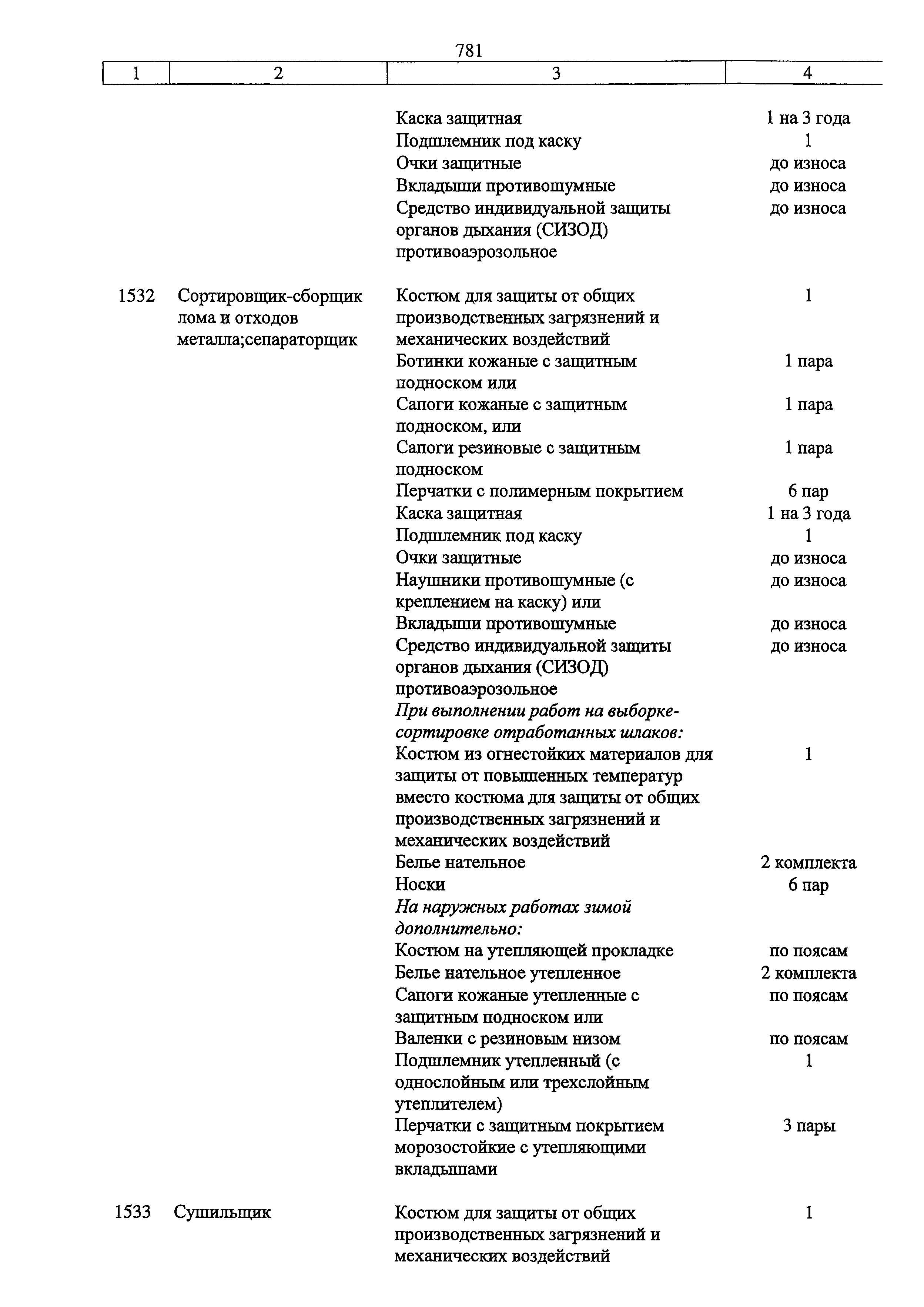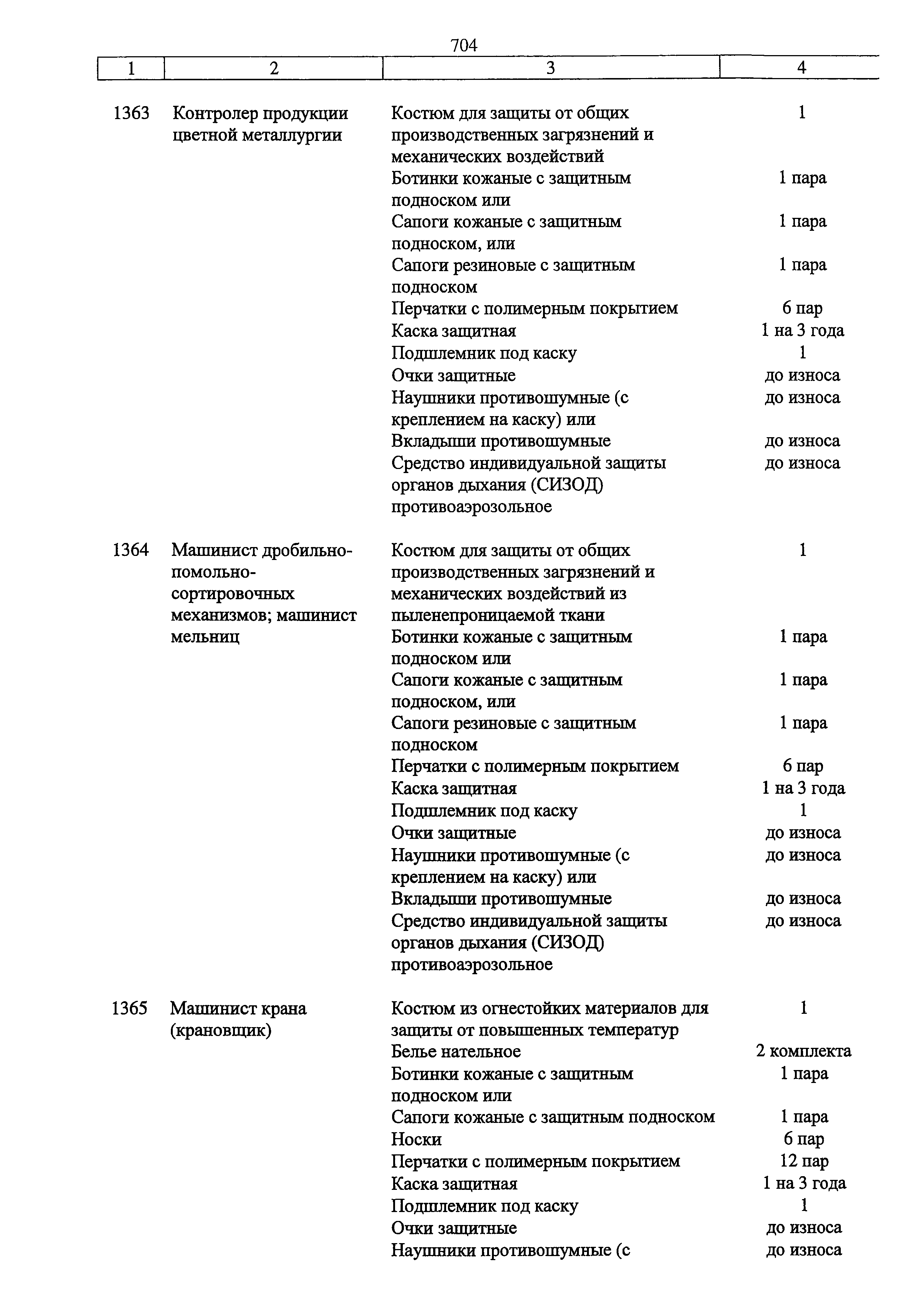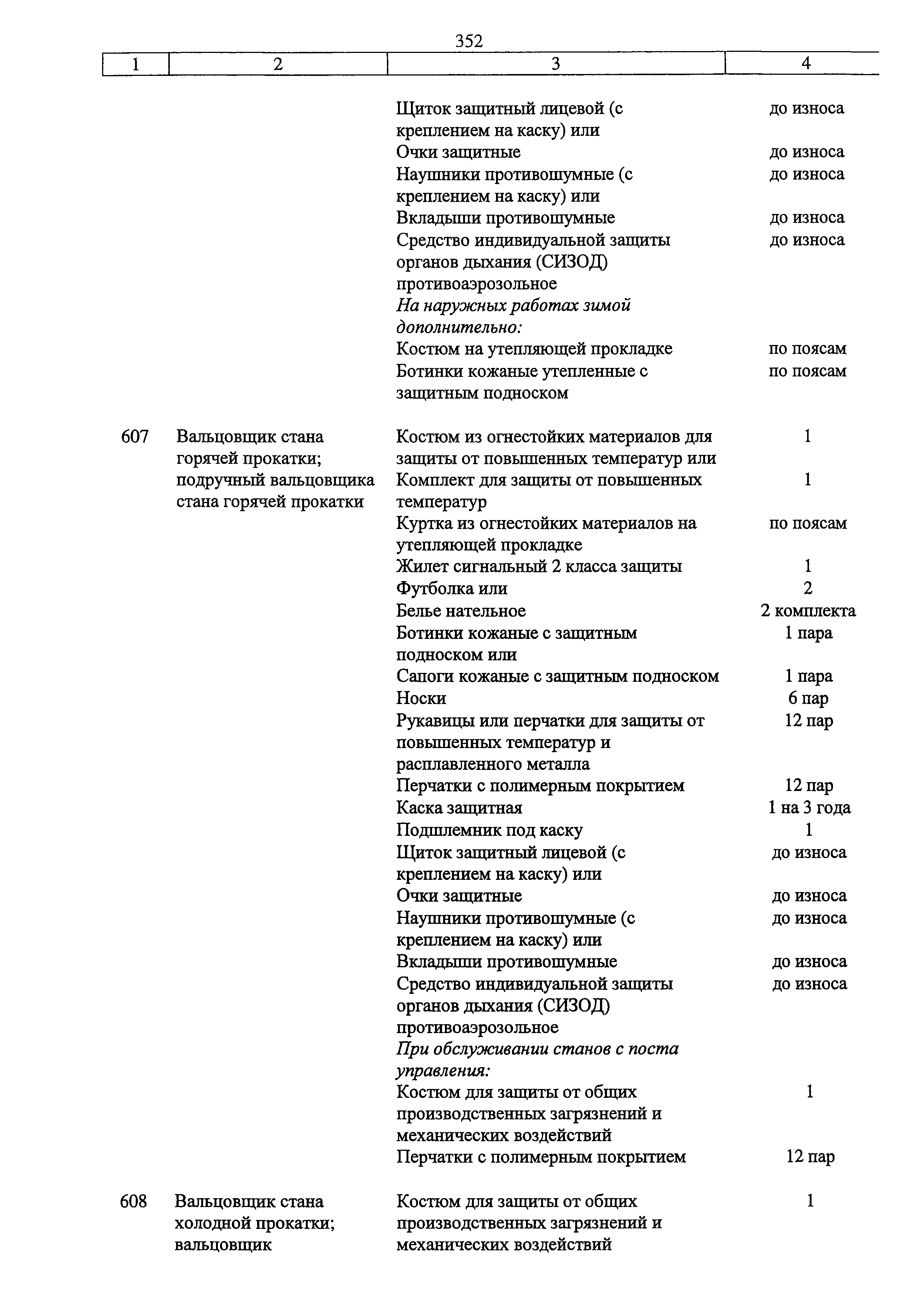 Типовые нормы бесплатной выдачи специальной одежды, специальной обуви и других средств индивидуальной защиты работникам горной и металлургической промышленности и металлургических производств других отраслей промышленности, занятым на работах с вредными и (или) опасными условиями труда, а также на работах, выполняемых в особых температурных условиях или связанных с загрязнением| Статус: | действует | | Название рус.: | Типовые нормы бесплатной выдачи специальной одежды, специальной обуви и других средств индивидуальной защиты работникам горной и металлургической промышленности и металлургических производств других отраслей промышленности, занятым на работах с вредными и (или) опасными условиями труда, а также на работах, выполняемых в особых температурных условиях или связанных с загрязнением | | Дата добавления в базу: | 01.02.2017 | | Дата актуализации: | 01.01.2021 | | Дата введения: | 14.02.2014 | | Область применения: | Нормы утверждаются локальными нормативными актами работодателя на основании результатов аттестации рабочих мест по условиям труда и могут быть включены в коллективный и (или) трудовой договор с указанием типовых норм, по сравнению с которыми улучшается обеспечение работников специальной одеждой, специальной обувью и другими средствами индивидуальной защиты. | | Оглавление: | I Горнодобывающая промышленность 1 Подземные горные работы (шахты) 2 Открытые горные работы и шахтная поверхность 3 Работа на гидравлических установках или с промывочными приборами 4 Дражные работы II Дробление, обогащение, брикетирование, обжиг, агломерация, извлечение металлов и сплавов III Черная металлургия 1 Коксохимическое производство 1.1 Углеподготовительные цеха 1.2 Углеобогатительные цеха 1.3 Производство каменноугольного кокса 1.4 Производство кристаллического нафталина, кумароновой смолы, смолоперерабатывающие цеха 1.5 Производство пиридиновых и фенольно-крезольных продуктов 1.6 Цеха улавливания химических продуктов и газовые цеха 1.7 Цеха ректификации сырого бензола 1.8 Цеха очистки коксового газа от сероводорода 1.9 Производство пекового кокса 1.10 Производство термоантрацита 2 Доменное производство 3 Сталеплавильное производство 3.1 Установки непрерывной разливки стали 4 Производство ферросплавов 4.1 Электролитическое производство 4.2 Производство электролитического хрома 4.3 Производство феррованадия 4.4 Подготовка шихты, обжиг руд и концентратов 4.5 Разливка и разделка ферросплавов 4.6 Обжиг извести 4.7 Общие профессии и должности ферросплавного производства 5 Прокатное производство 6 Производство труб (прокатка, сварка и волочение) 7 Колесопрокатное и бандажное производства 8 Валопрокатное производство 9 Производство рельсовых скреплений 10 Производство баллонов 11 Труболитейное производство 12 Производство метизов 12.1 Производство металлических канатов, сеток, пружин и пружинной ленты, щеток, цепей, колючей проволоки и других метизов 12.2 Волочение проволоки, калибровка и шлифовка металла 12.3 Изготовление волок 12.4 Холодноштамповочные и кузнечно-прессовые работы 12.5 Термическая обработка 12.6 Травление металла, защитные покрытия проволоки и извлечение железного купороса 12.7 Производство металлических электродов и порошковой проволоки 13 Производство огнеупоров 13.1 Огнеупоры 13.2 Карборундовые стержни 13.3 Высокоогнеупорные окислы 14 Ремонт 