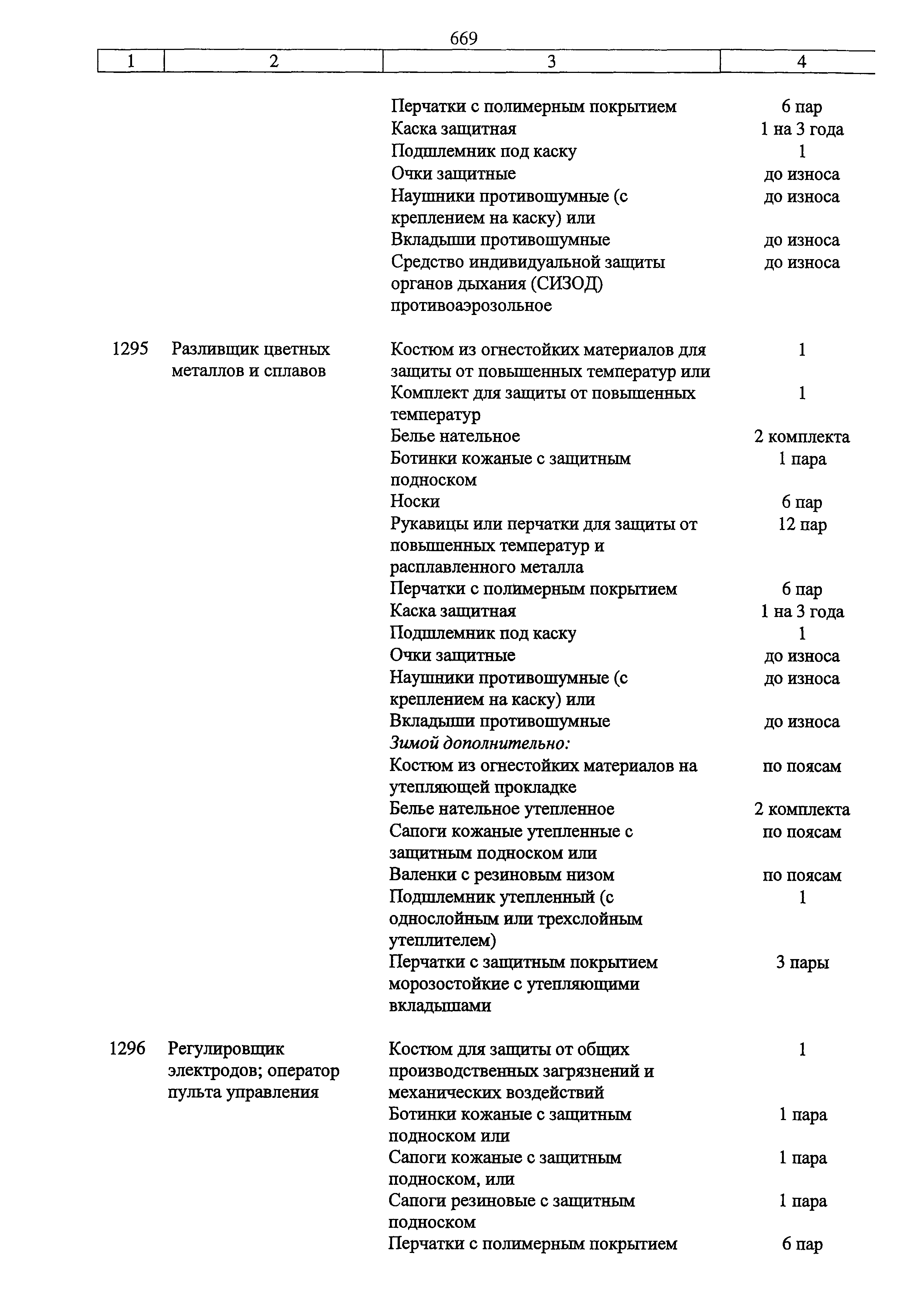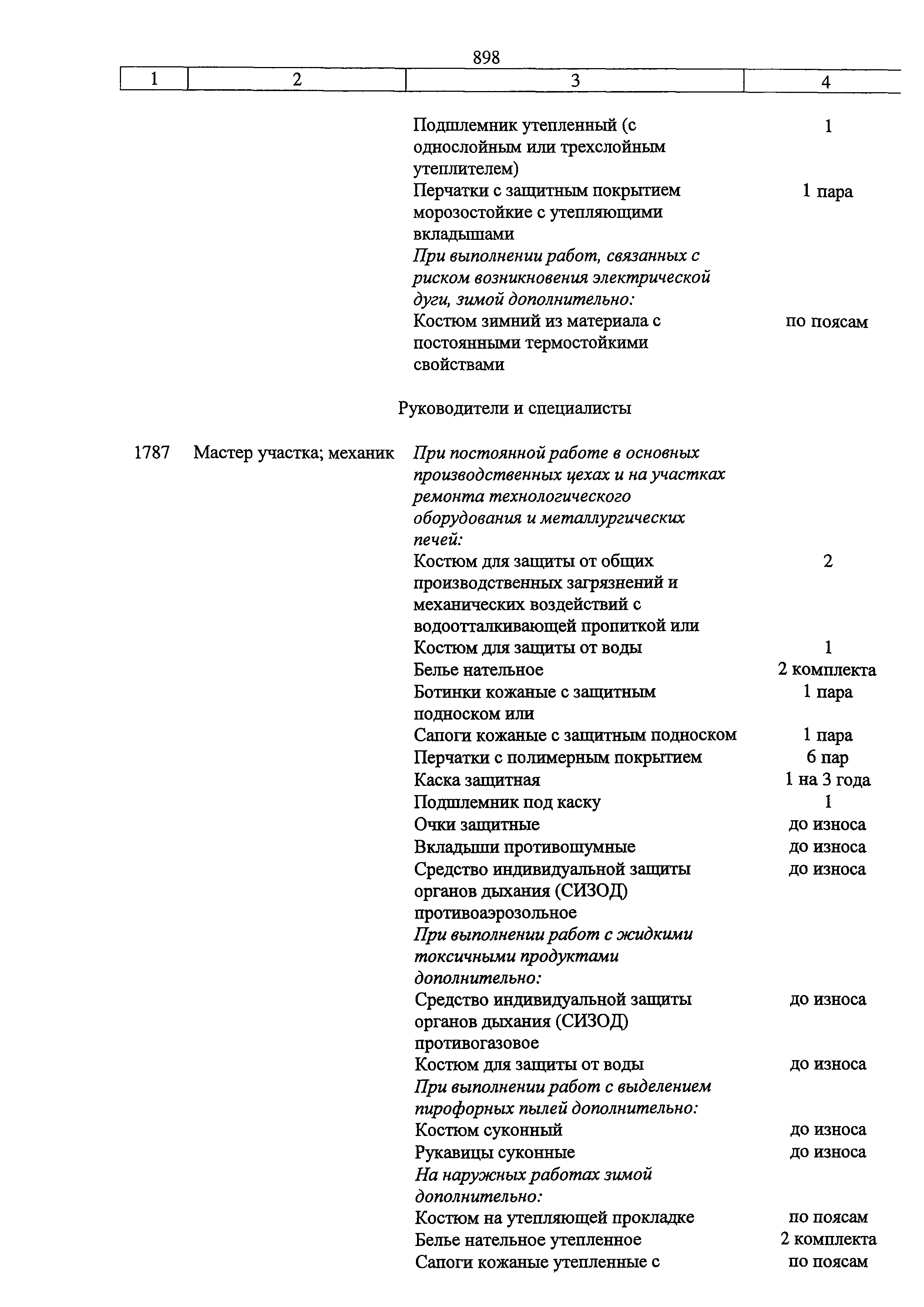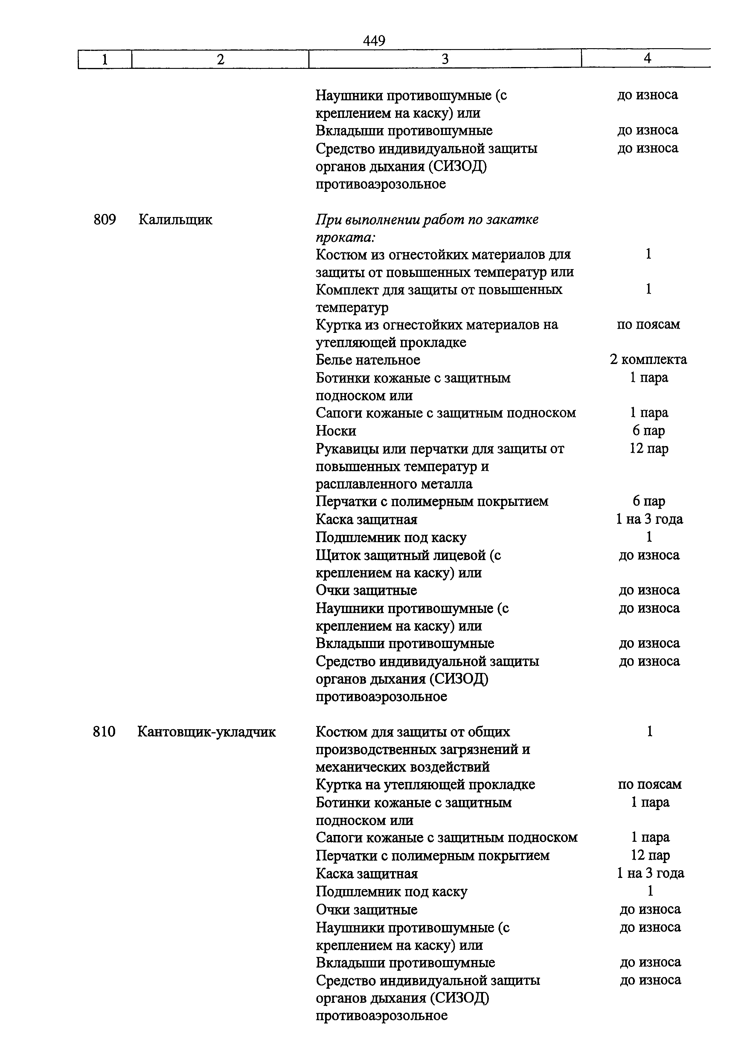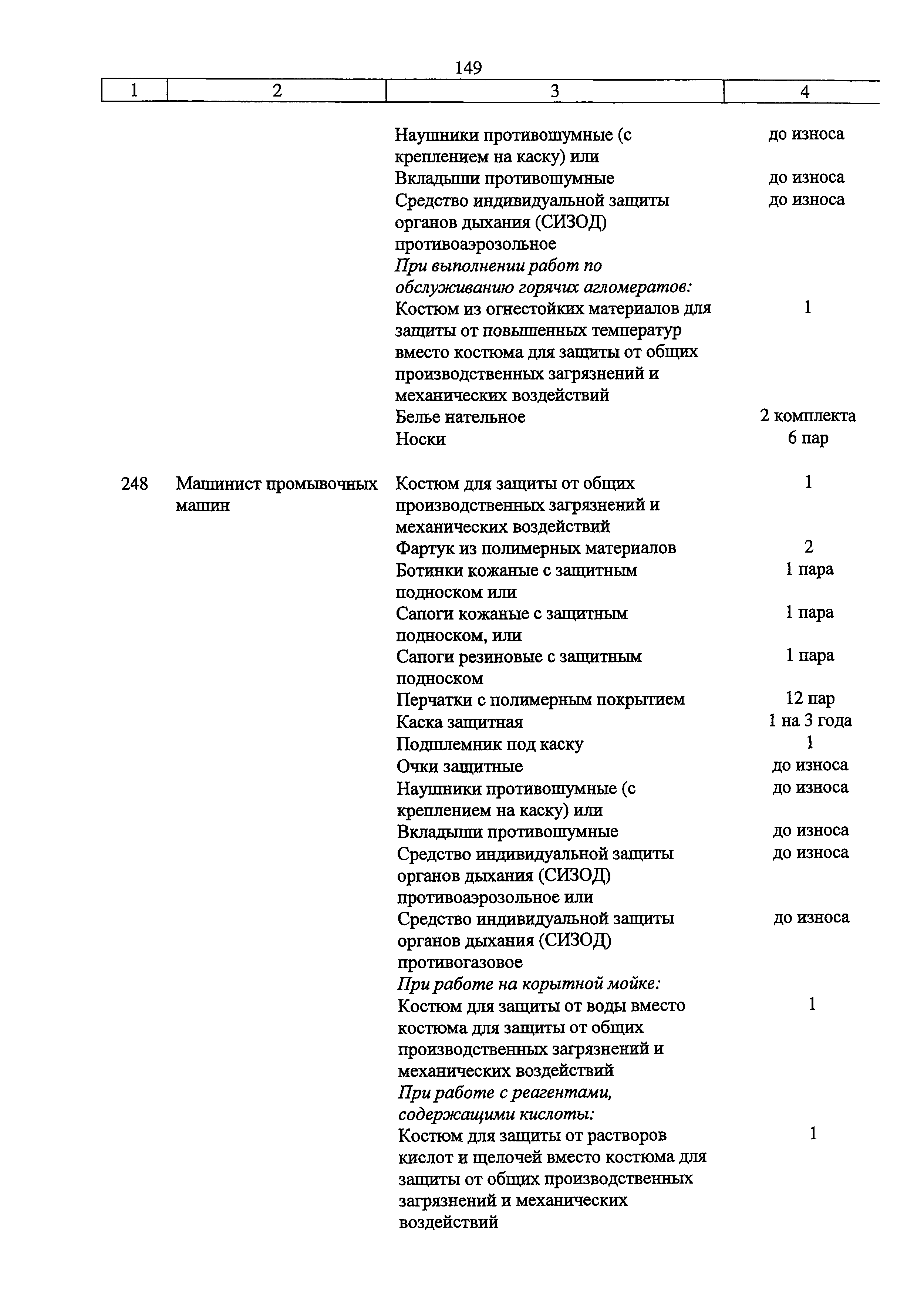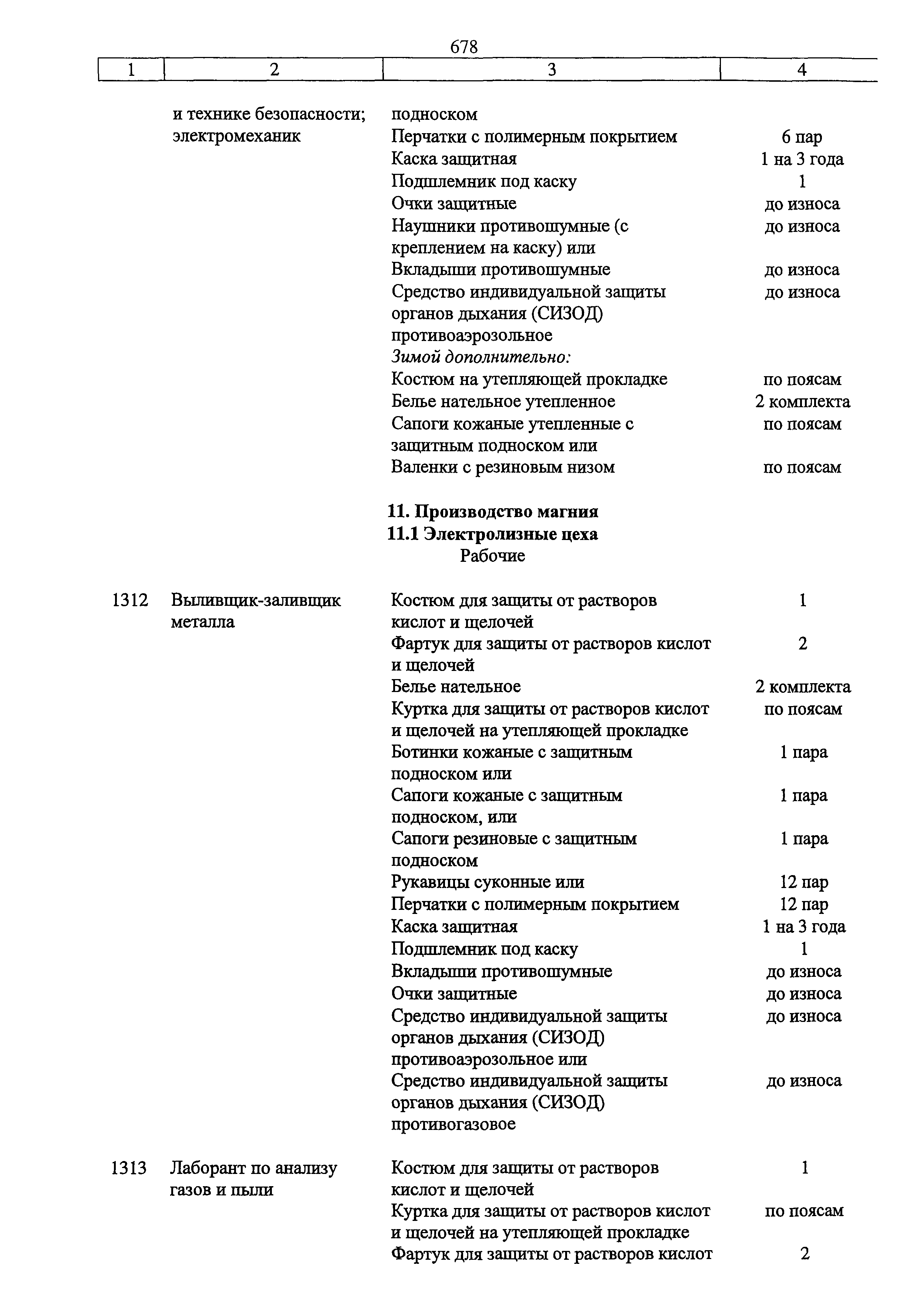 Типовые нормы бесплатной выдачи специальной одежды, специальной обуви и других средств индивидуальной защиты работникам горной и металлургической промышленности и металлургических производств других отраслей промышленности, занятым на работах с вредными и (или) опасными условиями труда, а также на работах, выполняемых в особых температурных условиях или связанных с загрязнением| Статус: | действует | | Название рус.: | Типовые нормы бесплатной выдачи специальной одежды, специальной обуви и других средств индивидуальной защиты работникам горной и металлургической промышленности и металлургических производств других отраслей промышленности, занятым на работах с вредными и (или) опасными условиями труда, а также на работах, выполняемых в особых температурных условиях или связанных с загрязнением | | Дата добавления в базу: | 01.02.2017 | | Дата актуализации: | 01.01.2021 | | Дата введения: | 14.02.2014 | | Область применения: | Нормы утверждаются локальными нормативными актами работодателя на основании результатов аттестации рабочих мест по условиям труда и могут быть включены в коллективный и (или) трудовой договор с указанием типовых норм, по сравнению с которыми улучшается обеспечение работников специальной одеждой, специальной обувью и другими средствами индивидуальной защиты. | | Оглавление: | I Горнодобывающая промышленность 1 Подземные горные работы (шахты) 2 Открытые горные работы и шахтная поверхность 3 Работа на гидравлических установках или с промывочными приборами 4 Дражные работы II Дробление, обогащение, брикетирование, обжиг, агломерация, извлечение металлов и сплавов III Черная металлургия 1 Коксохимическое производство 1.1 Углеподготовительные цеха 1.2 Углеобогатительные цеха 1.3 Производство каменноугольного кокса 1.4 Производство кристаллического нафталина, кумароновой смолы, смолоперерабатывающие цеха 1.5 Производство пиридиновых и фенольно-крезольных продуктов 1.6 Цеха улавливания химических продуктов и газовые цеха 1.7 Цеха ректификации сырого бензола 1.8 Цеха очистки коксового газа от сероводорода 1.9 Производство пекового кокса 1.10 Производство термоантрацита 2 Доменное производство 3 Сталеплавильное производство 3.1 Установки непрерывной разливки стали 4 Производство ферросплавов 4.1 Электролитическое производство 4.2 Производство электролитического хрома 4.3 Производство феррованадия 4.4 Подготовка шихты, обжиг руд и концентратов 4.5 Разливка и разделка ферросплавов 4.6 Обжиг извести 4.7 Общие профессии и должности ферросплавного производства 5 Прокатное производство 6 Производство труб (прокатка, сварка и волочение) 7 Колесопрокатное и бандажное производства 8 Валопрокатное производство 9 Производство рельсовых скреплений 10 Производство баллонов 11 Труболитейное производство 12 Производство метизов 12.1 Производство металлических канатов, сеток, пружин и пружинной ленты, щеток, цепей, колючей проволоки и других метизов 12.2 Волочение проволоки, калибровка и шлифовка металла 12.3 Изготовление волок 12.4 Холодноштамповочные и кузнечно-прессовые работы 12.5 Термическая обработка 12.6 Травление металла, защитные покрытия проволоки и извлечение железного купороса 12.7 Производство металлических электродов и порошковой проволоки 13 Производство огнеупоров 13.1 Огнеупоры 13.2 Карборундовые стержни 13.3 Высокоогнеупорные окислы 14 Ремонт 