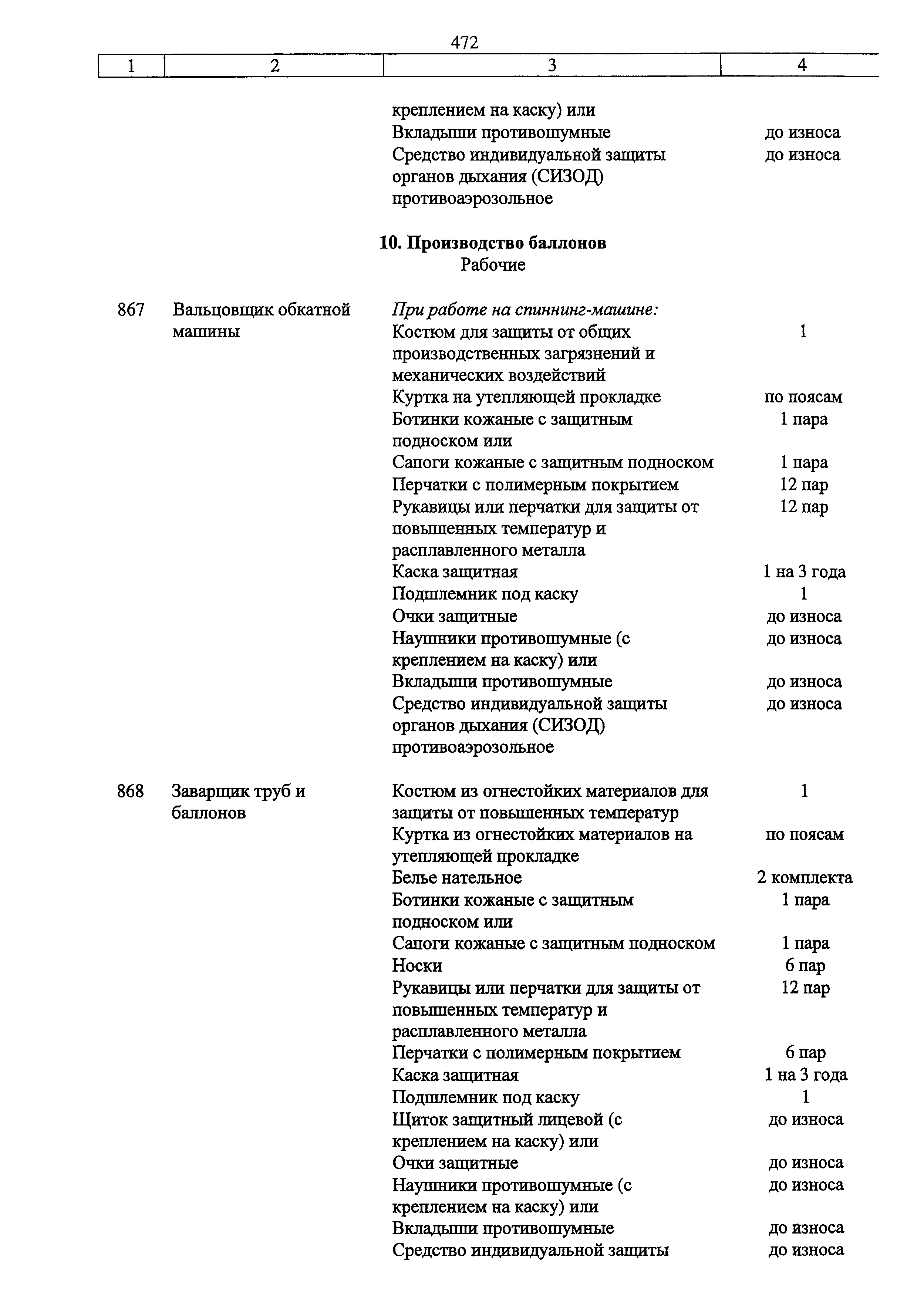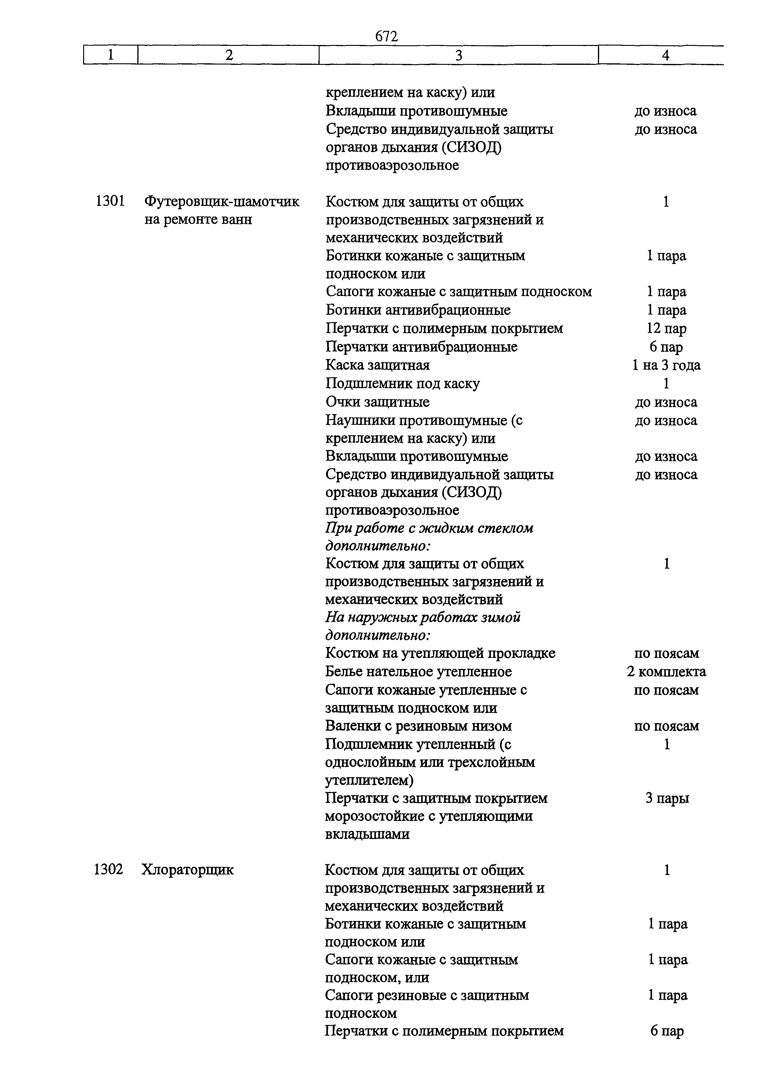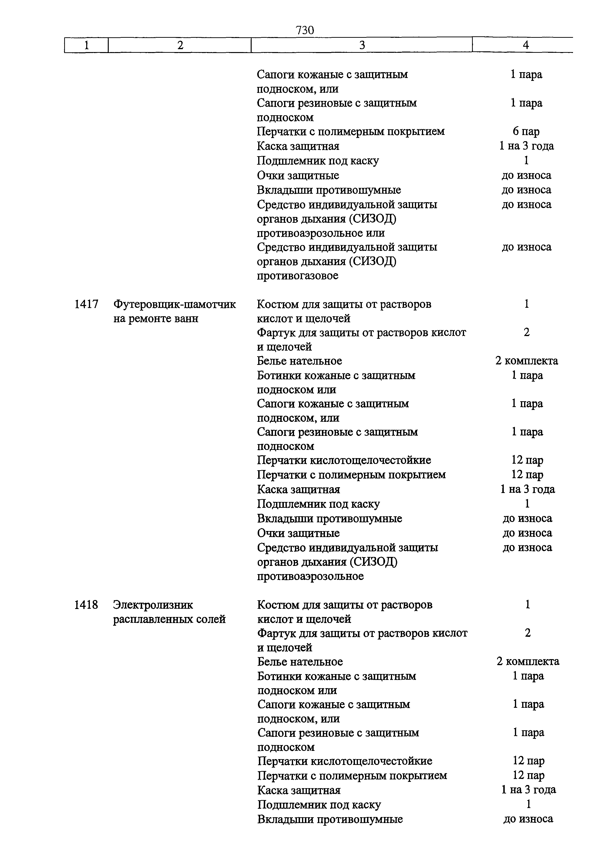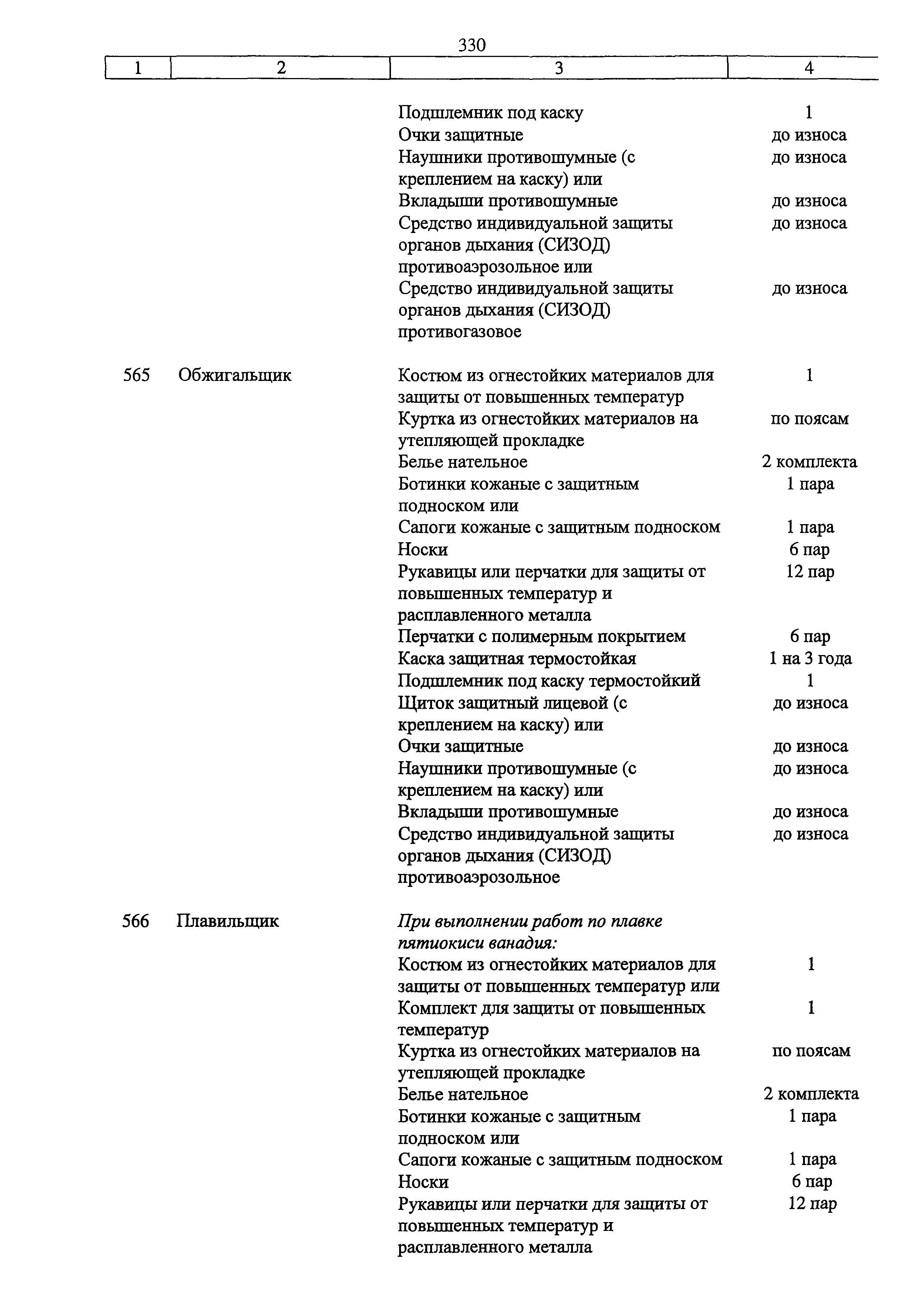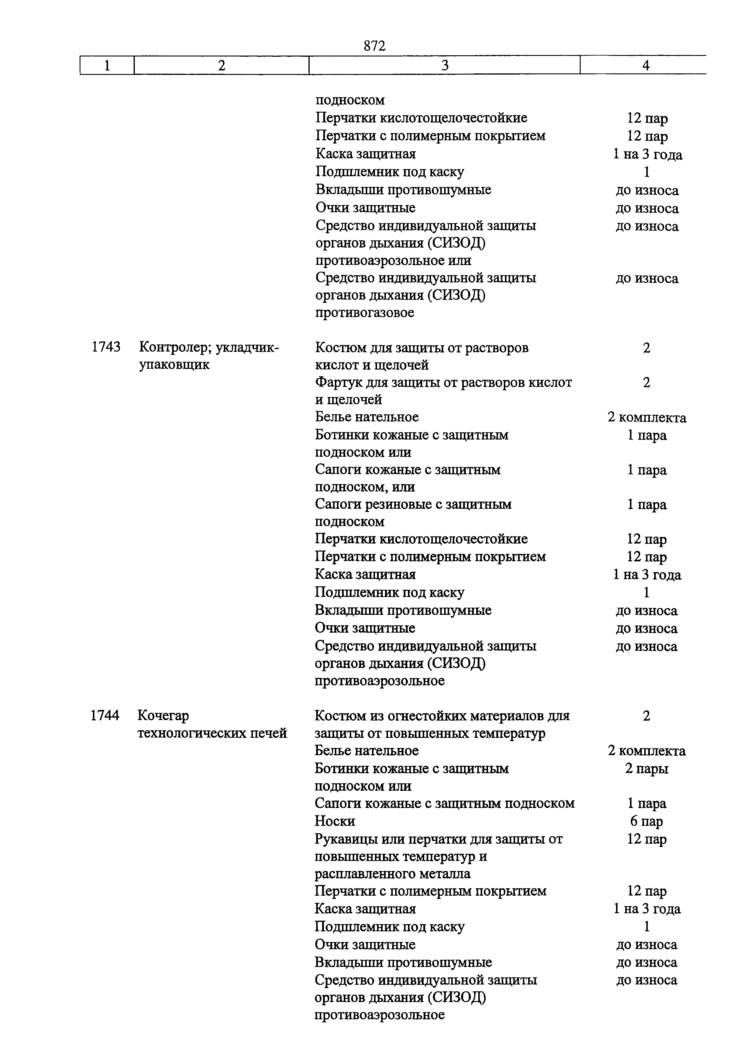 Типовые нормы бесплатной выдачи специальной одежды, специальной обуви и других средств индивидуальной защиты работникам горной и металлургической промышленности и металлургических производств других отраслей промышленности, занятым на работах с вредными и (или) опасными условиями труда, а также на работах, выполняемых в особых температурных условиях или связанных с загрязнением| Статус: | действует | | Название рус.: | Типовые нормы бесплатной выдачи специальной одежды, специальной обуви и других средств индивидуальной защиты работникам горной и металлургической промышленности и металлургических производств других отраслей промышленности, занятым на работах с вредными и (или) опасными условиями труда, а также на работах, выполняемых в особых температурных условиях или связанных с загрязнением | | Дата добавления в базу: | 01.02.2017 | | Дата актуализации: | 01.01.2021 | | Дата введения: | 14.02.2014 | | Область применения: | Нормы утверждаются локальными нормативными актами работодателя на основании результатов аттестации рабочих мест по условиям труда и могут быть включены в коллективный и (или) трудовой договор с указанием типовых норм, по сравнению с которыми улучшается обеспечение работников специальной одеждой, специальной обувью и другими средствами индивидуальной защиты. | | Оглавление: | I Горнодобывающая промышленность 1 Подземные горные работы (шахты) 2 Открытые горные работы и шахтная поверхность 3 Работа на гидравлических установках или с промывочными приборами 4 Дражные работы II Дробление, обогащение, брикетирование, обжиг, агломерация, извлечение металлов и сплавов III Черная металлургия 1 Коксохимическое производство 1.1 Углеподготовительные цеха 1.2 Углеобогатительные цеха 1.3 Производство каменноугольного кокса 1.4 Производство кристаллического нафталина, кумароновой смолы, смолоперерабатывающие цеха 1.5 Производство пиридиновых и фенольно-крезольных продуктов 1.6 Цеха улавливания химических продуктов и газовые цеха 1.7 Цеха ректификации сырого бензола 1.8 Цеха очистки коксового газа от сероводорода 1.9 Производство пекового кокса 1.10 Производство термоантрацита 2 Доменное производство 3 Сталеплавильное производство 3.1 Установки непрерывной разливки стали 4 Производство ферросплавов 4.1 Электролитическое производство 4.2 Производство электролитического хрома 4.3 Производство феррованадия 4.4 Подготовка шихты, обжиг руд и концентратов 4.5 Разливка и разделка ферросплавов 4.6 Обжиг извести 4.7 Общие профессии и должности ферросплавного производства 5 Прокатное производство 6 Производство труб (прокатка, сварка и волочение) 7 Колесопрокатное и бандажное производства 8 Валопрокатное производство 9 Производство рельсовых скреплений 10 Производство баллонов 11 Труболитейное производство 12 Производство метизов 12.1 Производство металлических канатов, сеток, пружин и пружинной ленты, щеток, цепей, колючей проволоки и других метизов 12.2 Волочение проволоки, калибровка и шлифовка металла 12.3 Изготовление волок 12.4 Холодноштамповочные и кузнечно-прессовые работы 12.5 Термическая обработка 12.6 Травление металла, защитные покрытия проволоки и извлечение железного купороса 12.7 Производство металлических электродов и порошковой проволоки 13 Производство огнеупоров 13.1 Огнеупоры 13.2 Карборундовые стержни 13.3 Высокоогнеупорные окислы 14 Ремонт 