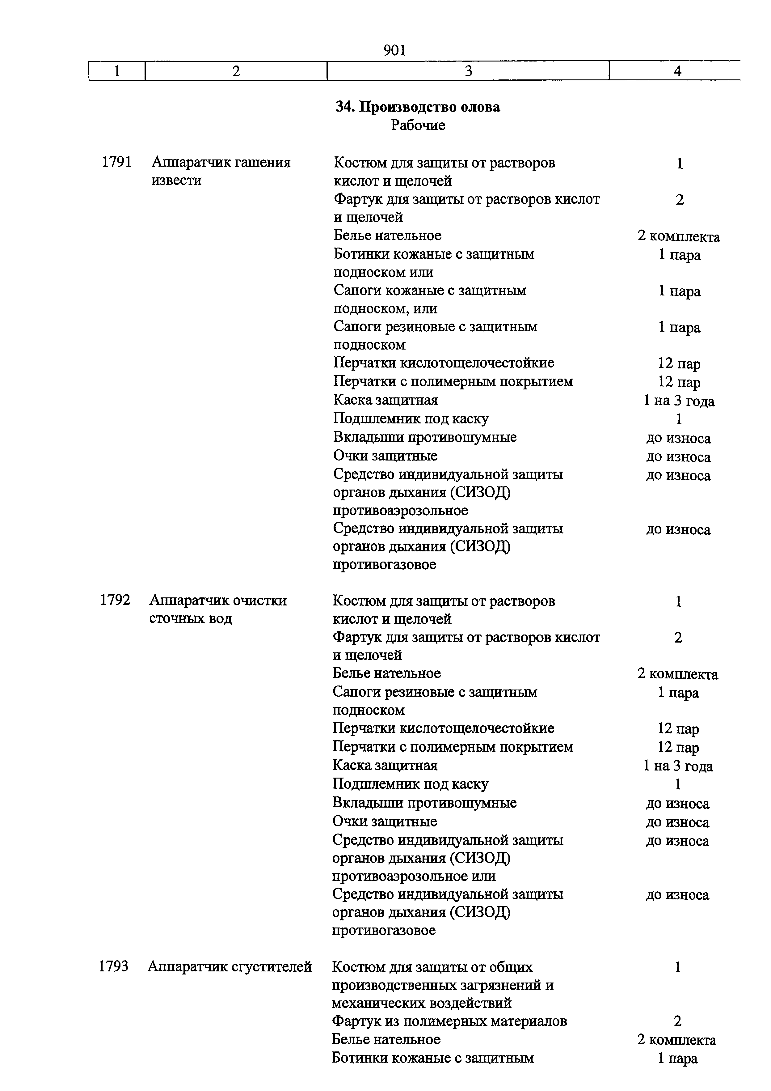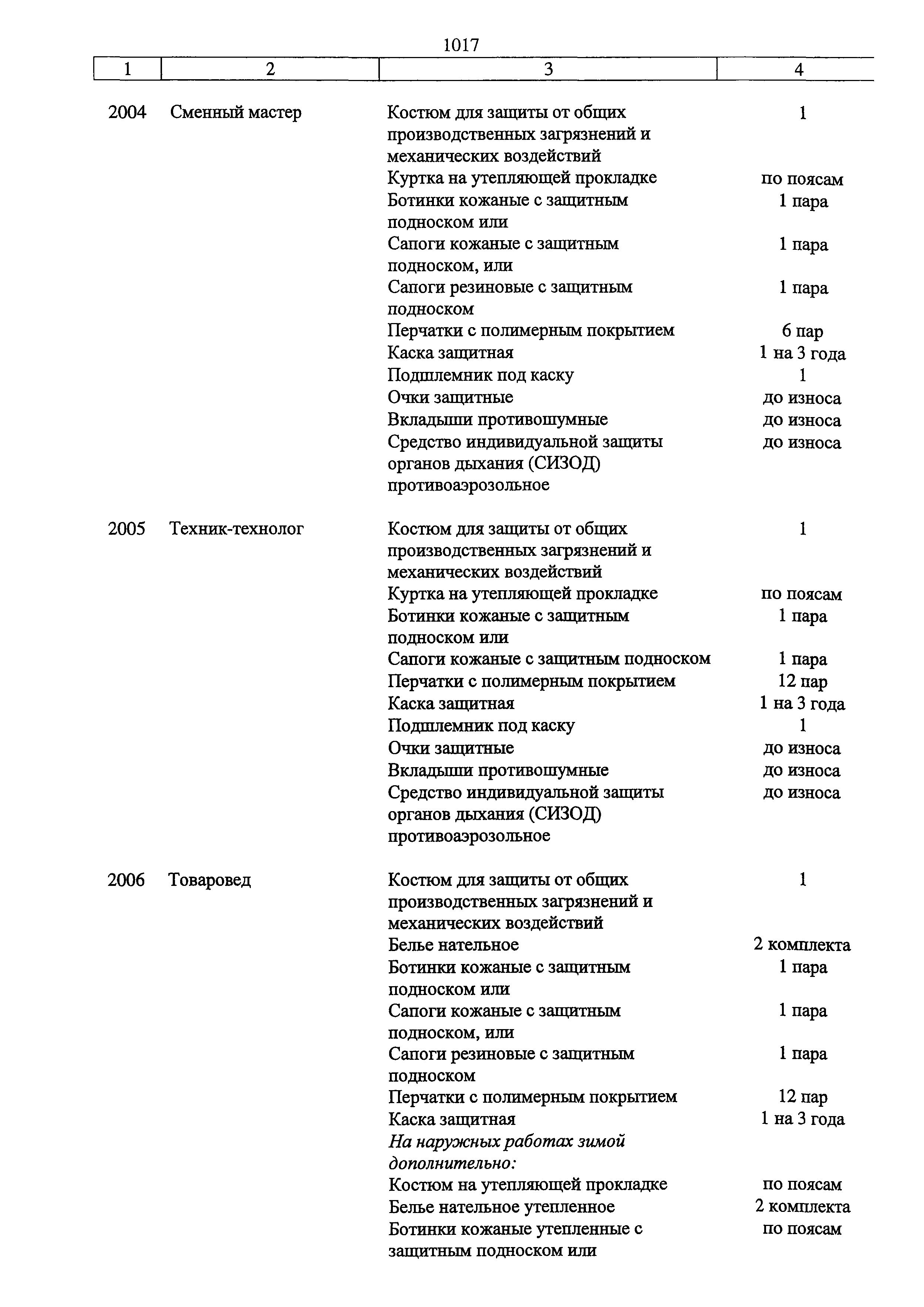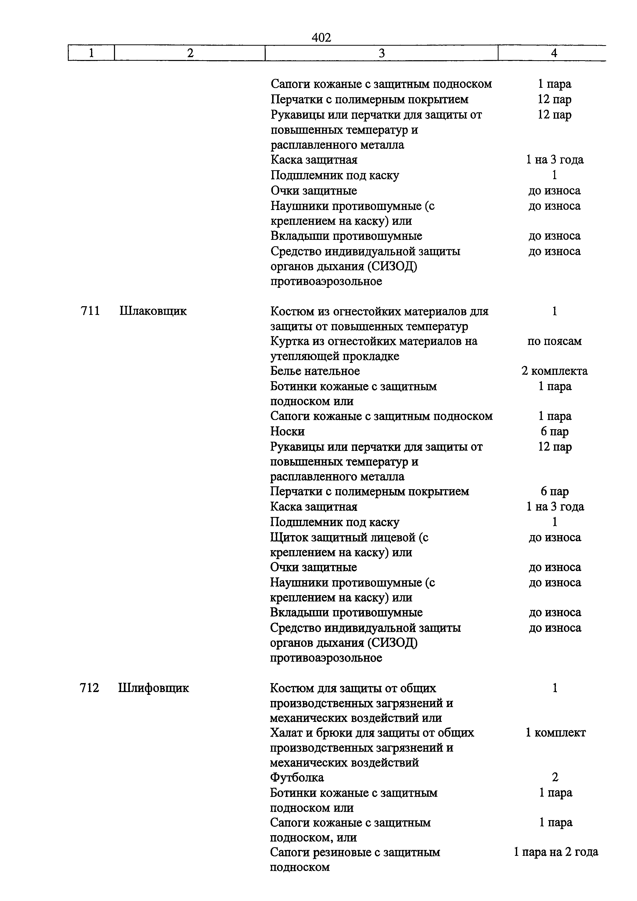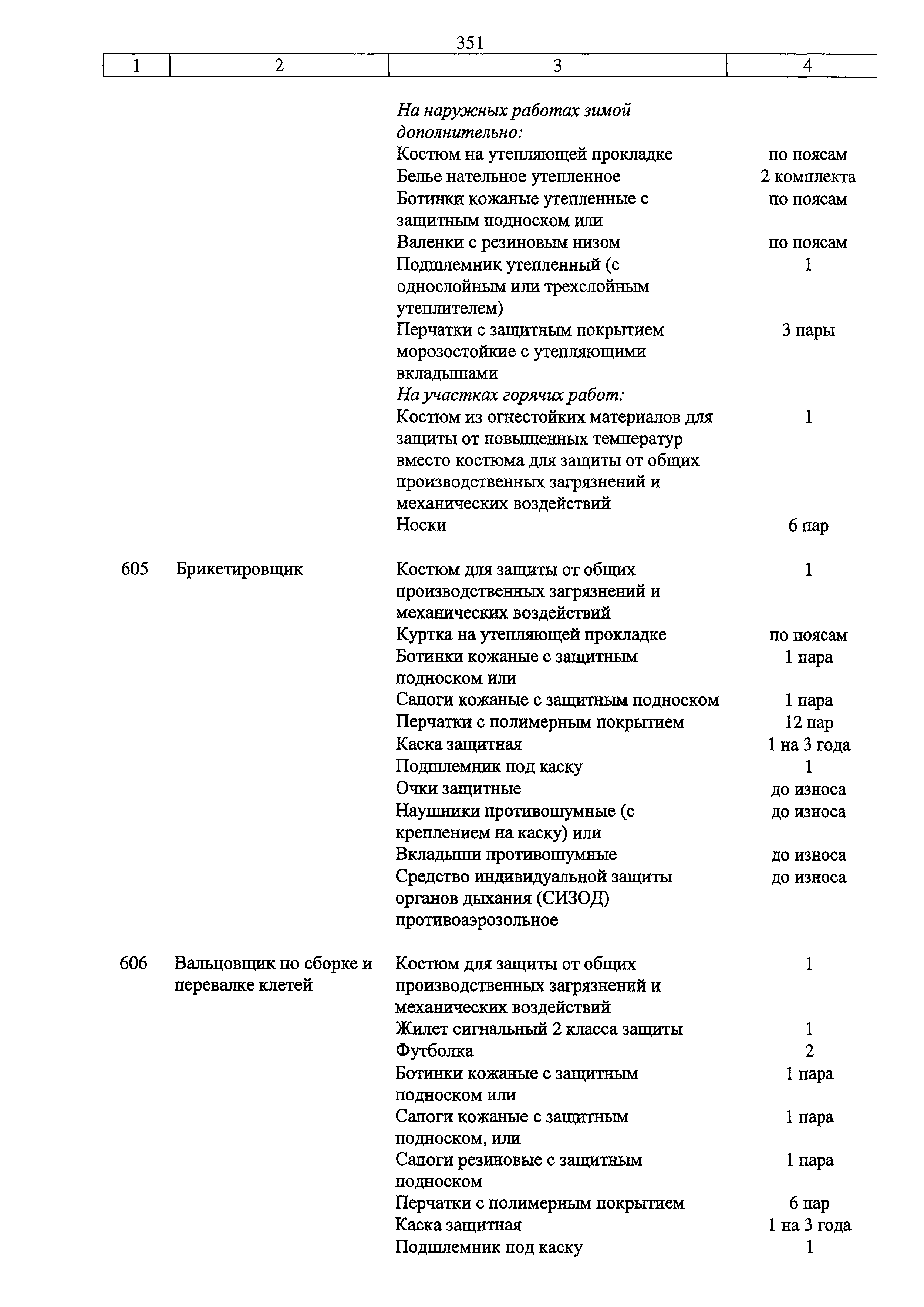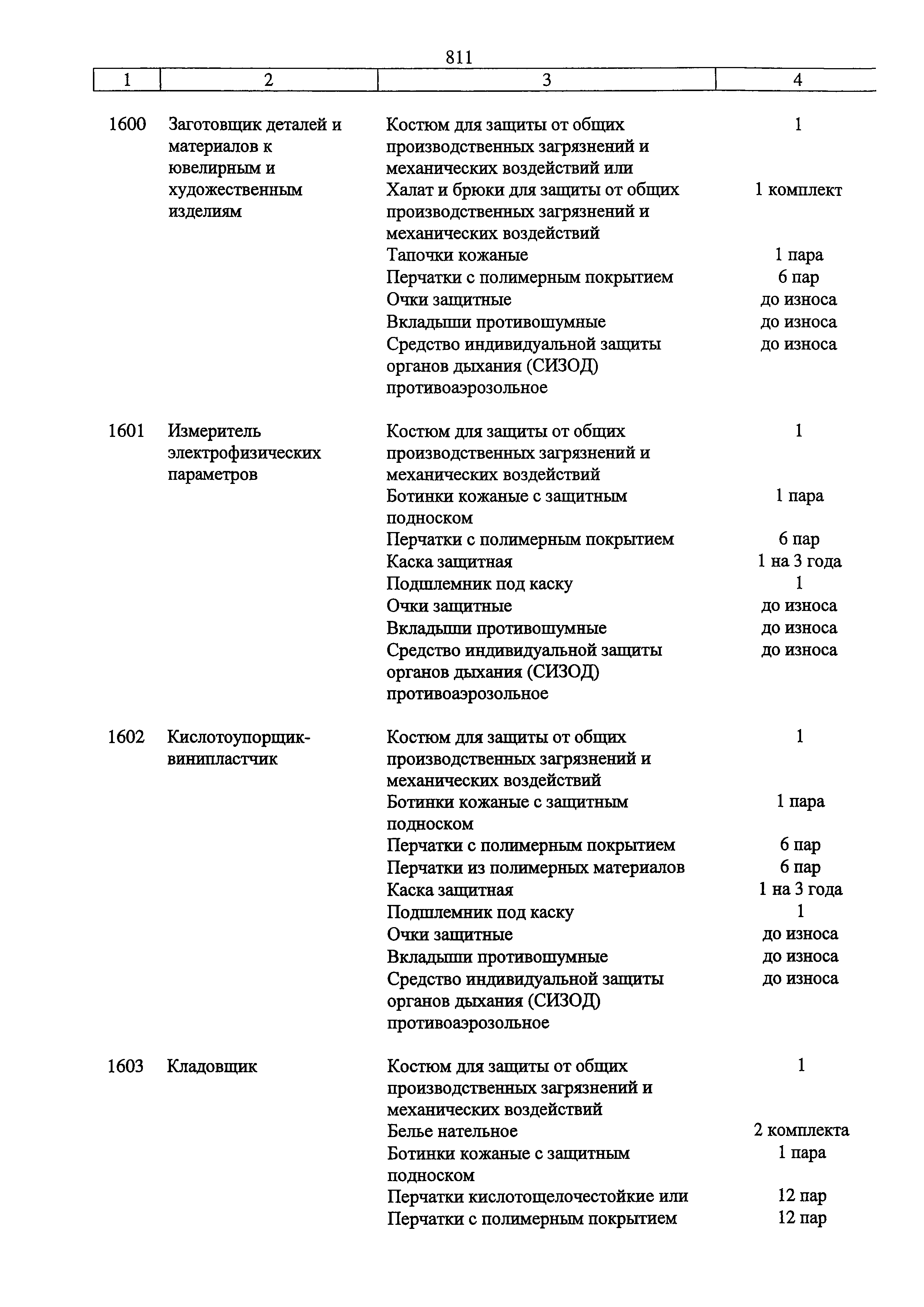 Типовые нормы бесплатной выдачи специальной одежды, специальной обуви и других средств индивидуальной защиты работникам горной и металлургической промышленности и металлургических производств других отраслей промышленности, занятым на работах с вредными и (или) опасными условиями труда, а также на работах, выполняемых в особых температурных условиях или связанных с загрязнением| Статус: | действует | | Название рус.: | Типовые нормы бесплатной выдачи специальной одежды, специальной обуви и других средств индивидуальной защиты работникам горной и металлургической промышленности и металлургических производств других отраслей промышленности, занятым на работах с вредными и (или) опасными условиями труда, а также на работах, выполняемых в особых температурных условиях или связанных с загрязнением | | Дата добавления в базу: | 01.02.2017 | | Дата актуализации: | 01.01.2021 | | Дата введения: | 14.02.2014 | | Область применения: | Нормы утверждаются локальными нормативными актами работодателя на основании результатов аттестации рабочих мест по условиям труда и могут быть включены в коллективный и (или) трудовой договор с указанием типовых норм, по сравнению с которыми улучшается обеспечение работников специальной одеждой, специальной обувью и другими средствами индивидуальной защиты. | | Оглавление: | I Горнодобывающая промышленность 1 Подземные горные работы (шахты) 2 Открытые горные работы и шахтная поверхность 3 Работа на гидравлических установках или с промывочными приборами 4 Дражные работы II Дробление, обогащение, брикетирование, обжиг, агломерация, извлечение металлов и сплавов III Черная металлургия 1 Коксохимическое производство 1.1 Углеподготовительные цеха 1.2 Углеобогатительные цеха 1.3 Производство каменноугольного кокса 1.4 Производство кристаллического нафталина, кумароновой смолы, смолоперерабатывающие цеха 1.5 Производство пиридиновых и фенольно-крезольных продуктов 1.6 Цеха улавливания химических продуктов и газовые цеха 1.7 Цеха ректификации сырого бензола 1.8 Цеха очистки коксового газа от сероводорода 1.9 Производство пекового кокса 1.10 Производство термоантрацита 2 Доменное производство 3 Сталеплавильное производство 3.1 Установки непрерывной разливки стали 4 Производство ферросплавов 4.1 Электролитическое производство 4.2 Производство электролитического хрома 4.3 Производство феррованадия 4.4 Подготовка шихты, обжиг руд и концентратов 4.5 Разливка и разделка ферросплавов 4.6 Обжиг извести 4.7 Общие профессии и должности ферросплавного производства 5 Прокатное производство 6 Производство труб (прокатка, сварка и волочение) 7 Колесопрокатное и бандажное производства 8 Валопрокатное производство 9 Производство рельсовых скреплений 10 Производство баллонов 11 Труболитейное производство 12 Производство метизов 12.1 Производство металлических канатов, сеток, пружин и пружинной ленты, щеток, цепей, колючей проволоки и других метизов 12.2 Волочение проволоки, калибровка и шлифовка металла 12.3 Изготовление волок 12.4 Холодноштамповочные и кузнечно-прессовые работы 12.5 Термическая обработка 12.6 Травление металла, защитные покрытия проволоки и извлечение железного купороса 12.7 Производство металлических электродов и порошковой проволоки 13 Производство огнеупоров 13.1 Огнеупоры 13.2 Карборундовые стержни 13.3 Высокоогнеупорные окислы 14 Ремонт 