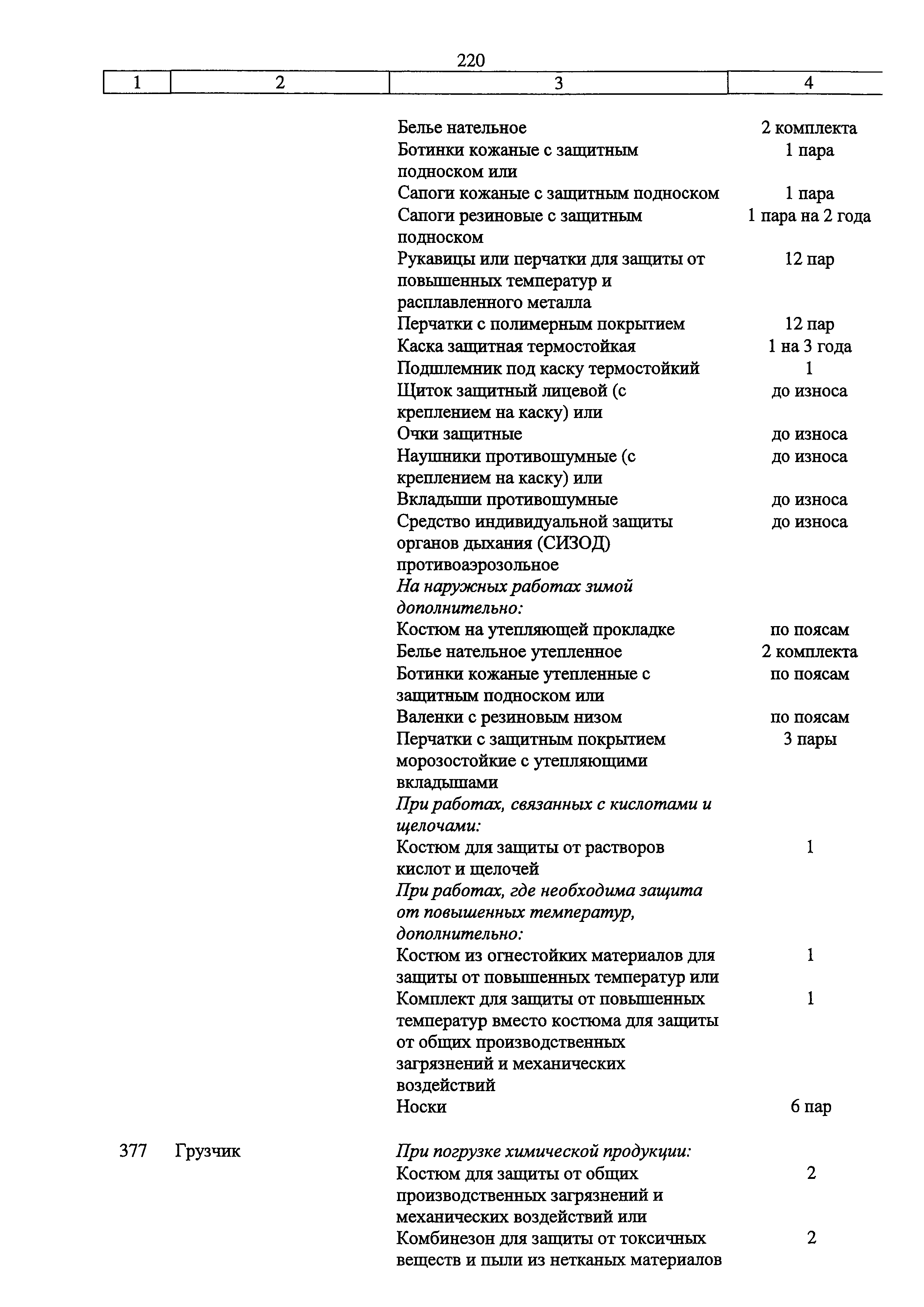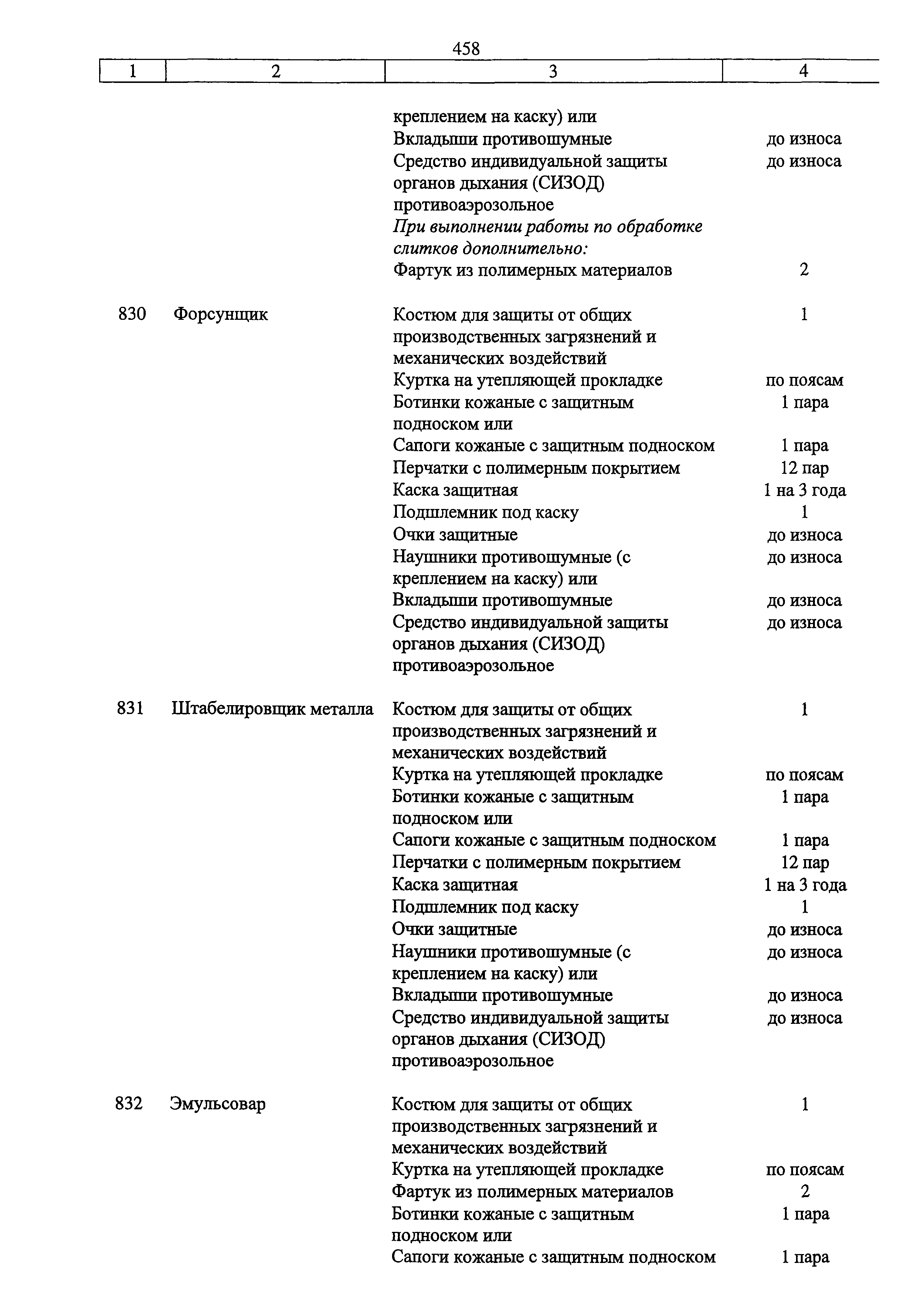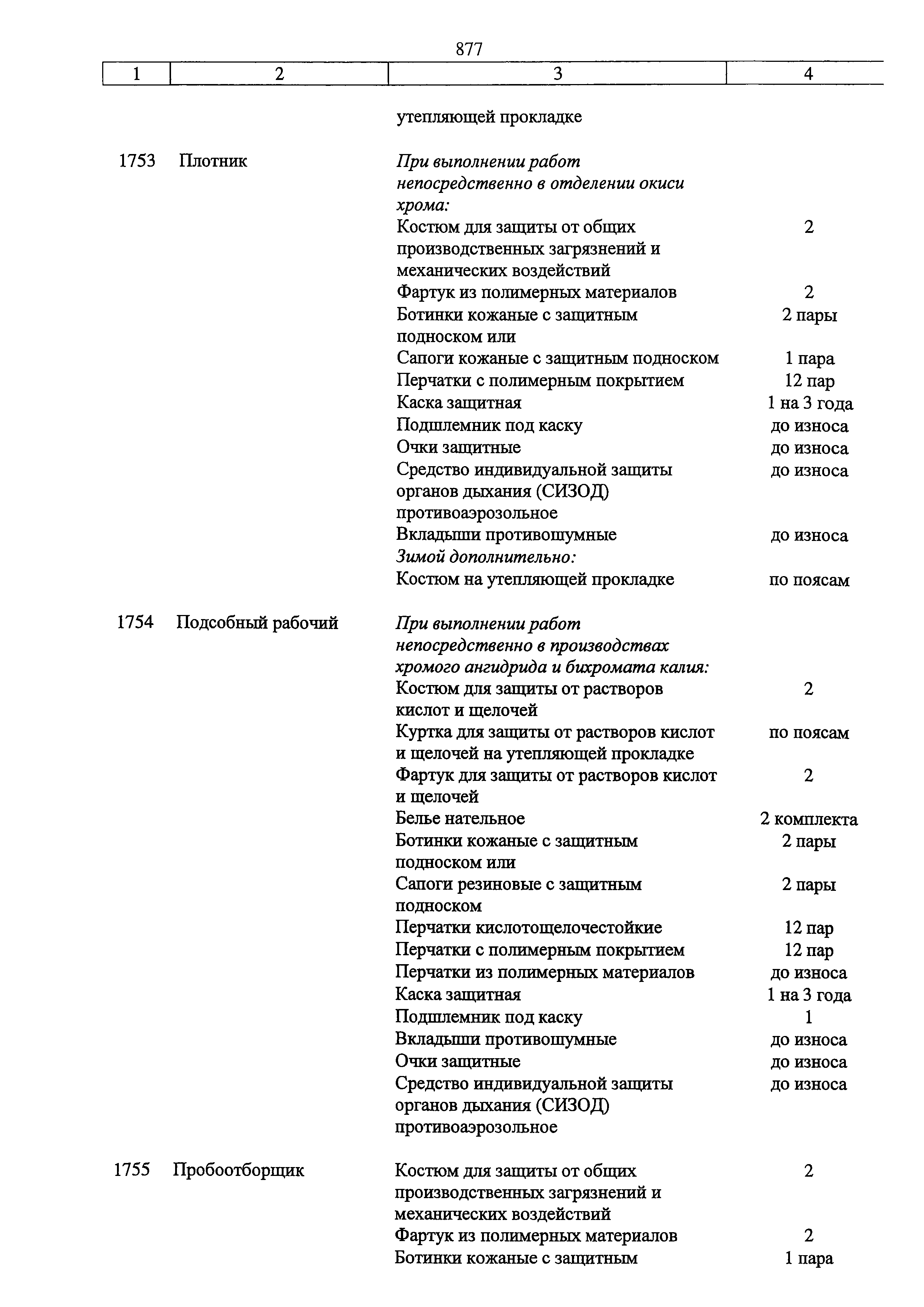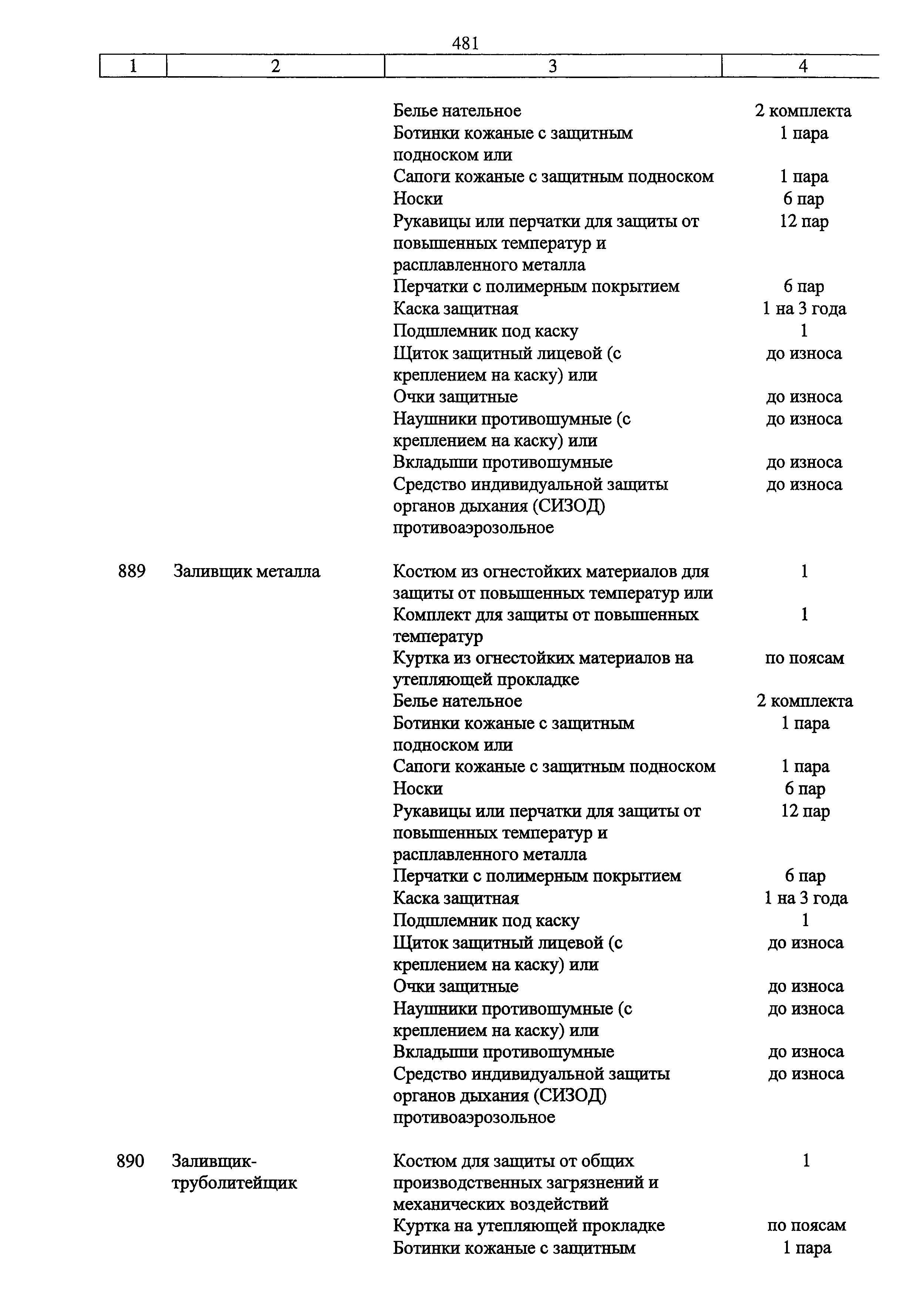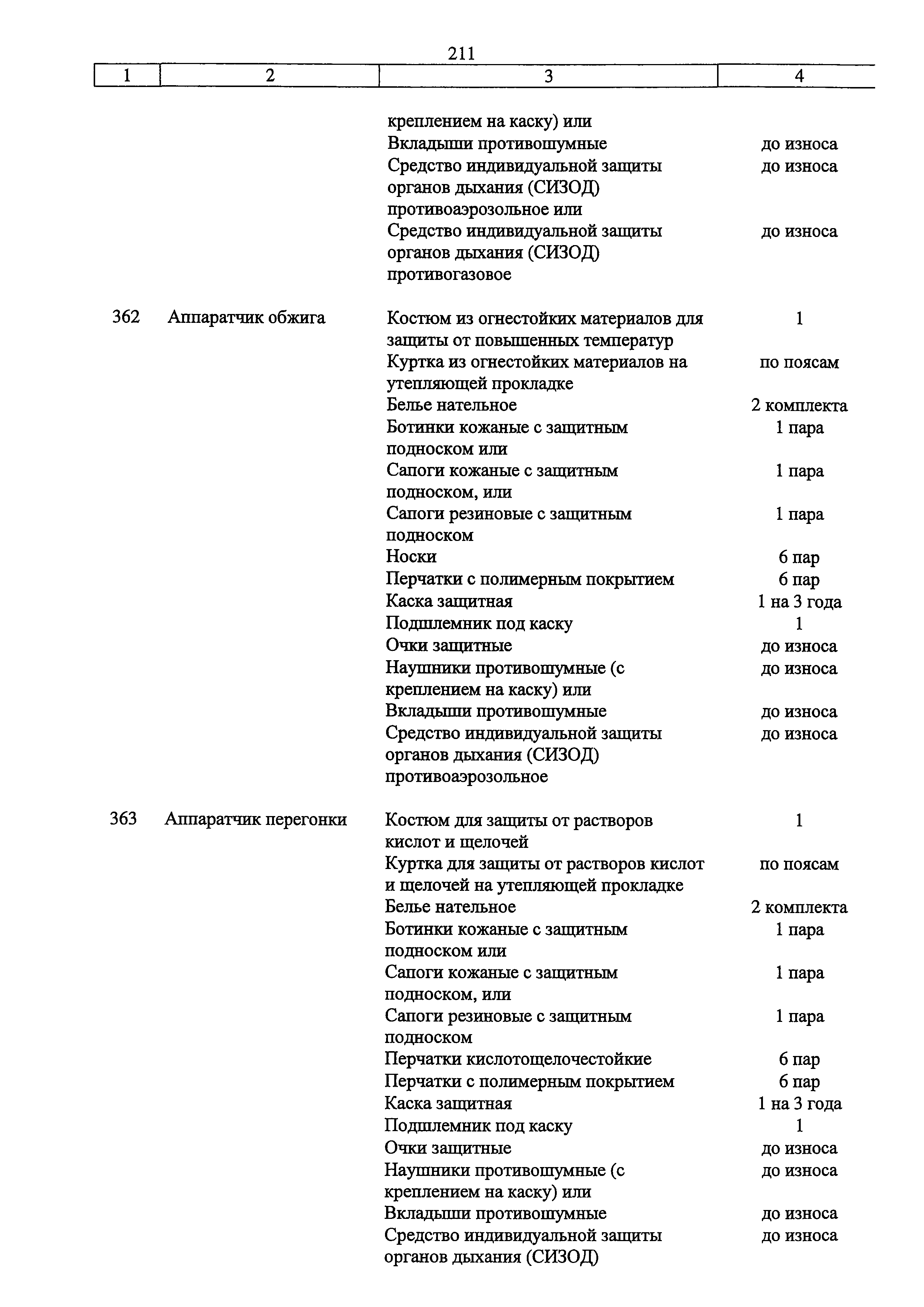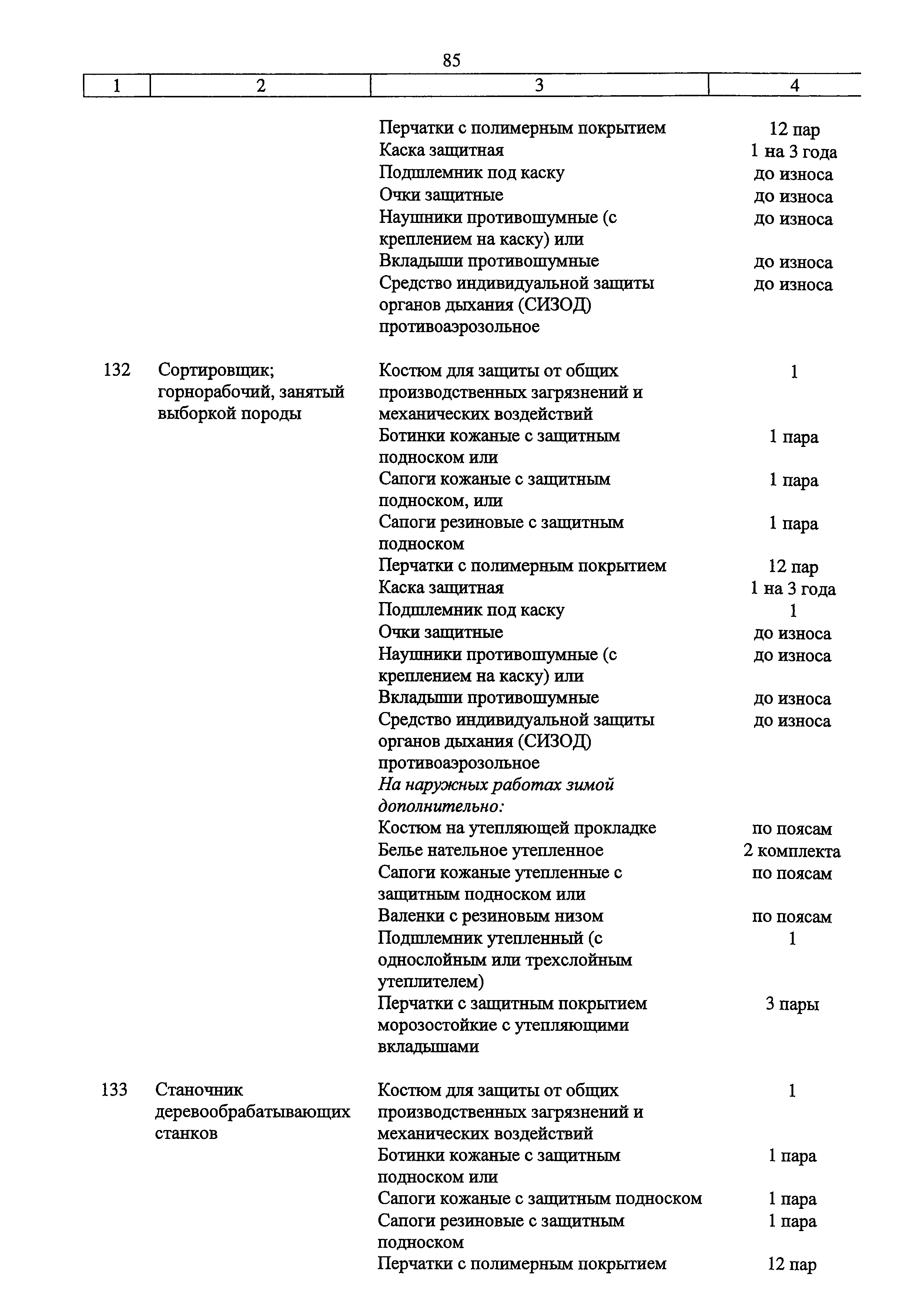 Типовые нормы бесплатной выдачи специальной одежды, специальной обуви и других средств индивидуальной защиты работникам горной и металлургической промышленности и металлургических производств других отраслей промышленности, занятым на работах с вредными и (или) опасными условиями труда, а также на работах, выполняемых в особых температурных условиях или связанных с загрязнением| Статус: | действует | | Название рус.: | Типовые нормы бесплатной выдачи специальной одежды, специальной обуви и других средств индивидуальной защиты работникам горной и металлургической промышленности и металлургических производств других отраслей промышленности, занятым на работах с вредными и (или) опасными условиями труда, а также на работах, выполняемых в особых температурных условиях или связанных с загрязнением | | Дата добавления в базу: | 01.02.2017 | | Дата актуализации: | 01.01.2021 | | Дата введения: | 14.02.2014 | | Область применения: | Нормы утверждаются локальными нормативными актами работодателя на основании результатов аттестации рабочих мест по условиям труда и могут быть включены в коллективный и (или) трудовой договор с указанием типовых норм, по сравнению с которыми улучшается обеспечение работников специальной одеждой, специальной обувью и другими средствами индивидуальной защиты. | | Оглавление: | I Горнодобывающая промышленность 1 Подземные горные работы (шахты) 2 Открытые горные работы и шахтная поверхность 3 Работа на гидравлических установках или с промывочными приборами 4 Дражные работы II Дробление, обогащение, брикетирование, обжиг, агломерация, извлечение металлов и сплавов III Черная металлургия 1 Коксохимическое производство 1.1 Углеподготовительные цеха 1.2 Углеобогатительные цеха 1.3 Производство каменноугольного кокса 1.4 Производство кристаллического нафталина, кумароновой смолы, смолоперерабатывающие цеха 1.5 Производство пиридиновых и фенольно-крезольных продуктов 1.6 Цеха улавливания химических продуктов и газовые цеха 1.7 Цеха ректификации сырого бензола 1.8 Цеха очистки коксового газа от сероводорода 1.9 Производство пекового кокса 1.10 Производство термоантрацита 2 Доменное производство 3 Сталеплавильное производство 3.1 Установки непрерывной разливки стали 4 Производство ферросплавов 4.1 Электролитическое производство 4.2 Производство электролитического хрома 4.3 Производство феррованадия 4.4 Подготовка шихты, обжиг руд и концентратов 4.5 Разливка и разделка ферросплавов 4.6 Обжиг извести 4.7 Общие профессии и должности ферросплавного производства 5 Прокатное производство 6 Производство труб (прокатка, сварка и волочение) 7 Колесопрокатное и бандажное производства 8 Валопрокатное производство 9 Производство рельсовых скреплений 10 Производство баллонов 11 Труболитейное производство 12 Производство метизов 12.1 Производство металлических канатов, сеток, пружин и пружинной ленты, щеток, цепей, колючей проволоки и других метизов 12.2 Волочение проволоки, калибровка и шлифовка металла 12.3 Изготовление волок 12.4 Холодноштамповочные и кузнечно-прессовые работы 12.5 Термическая обработка 12.6 Травление металла, защитные покрытия проволоки и извлечение железного купороса 12.7 Производство металлических электродов и порошковой проволоки 13 Производство огнеупоров 13.1 Огнеупоры 13.2 Карборундовые стержни 13.3 Высокоогнеупорные окислы 14 Ремонт 