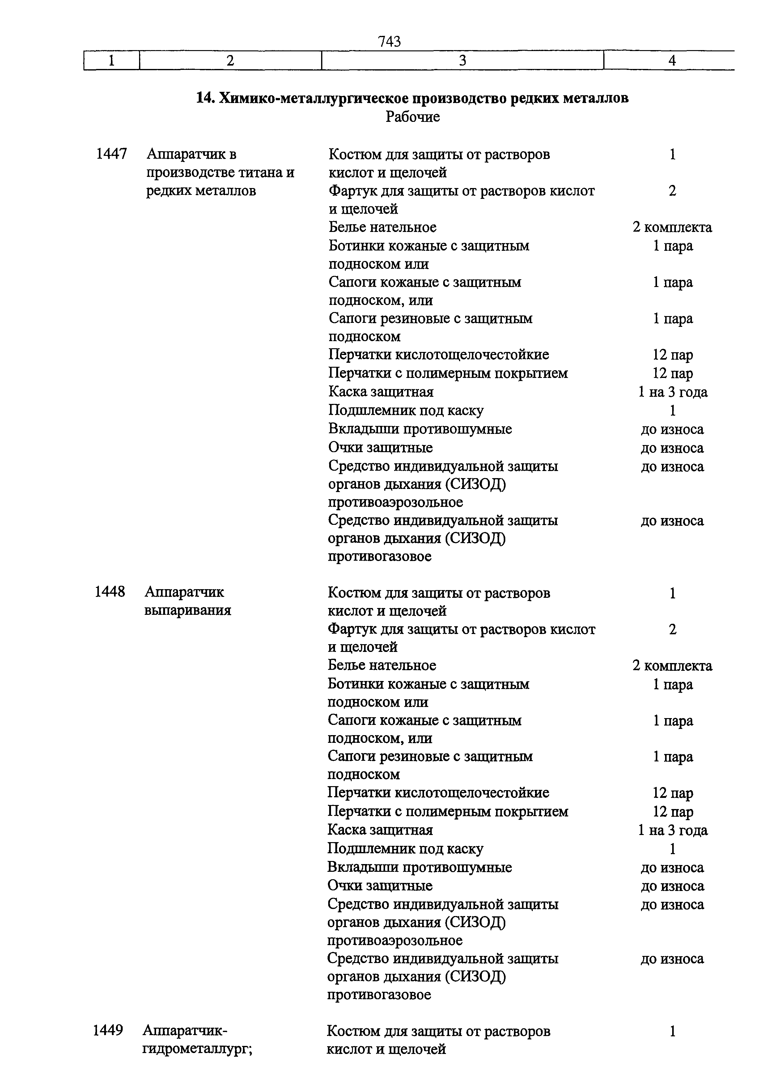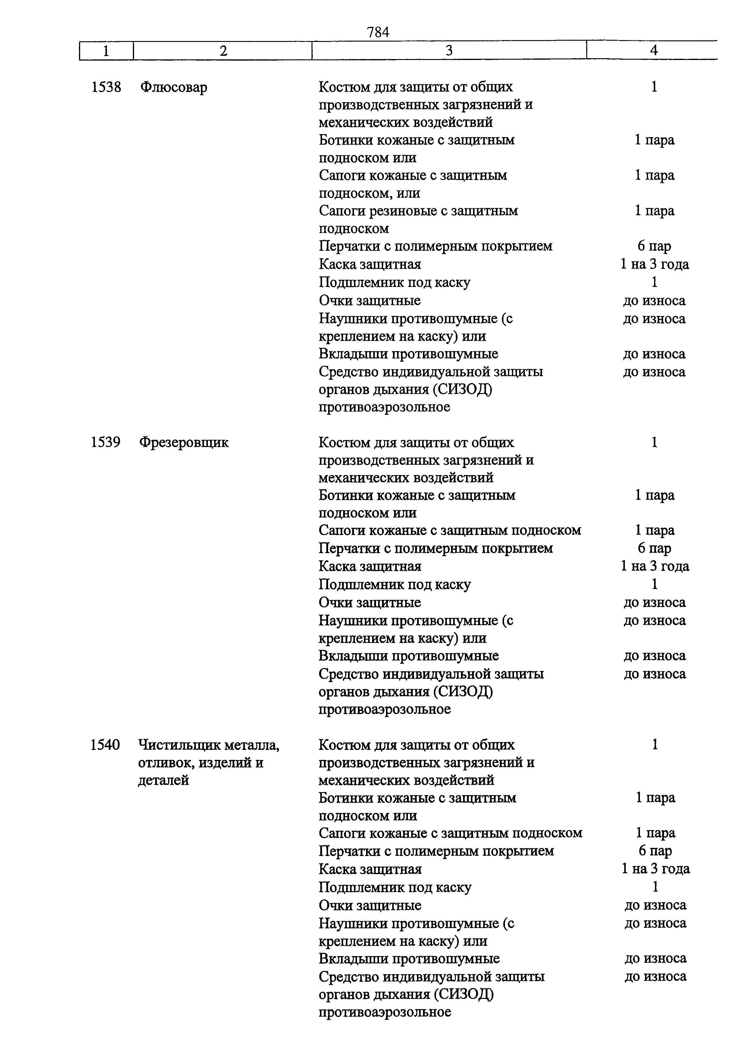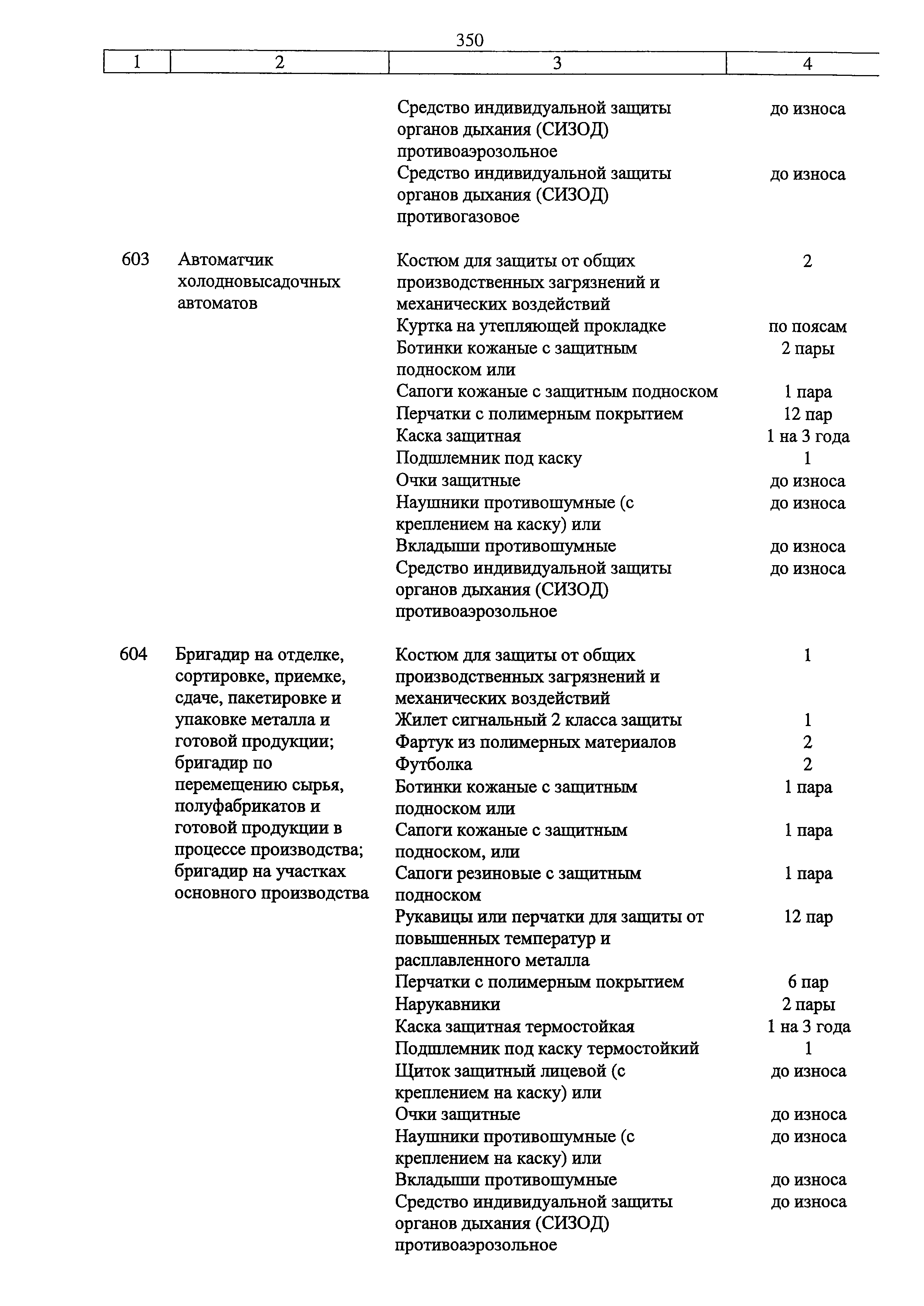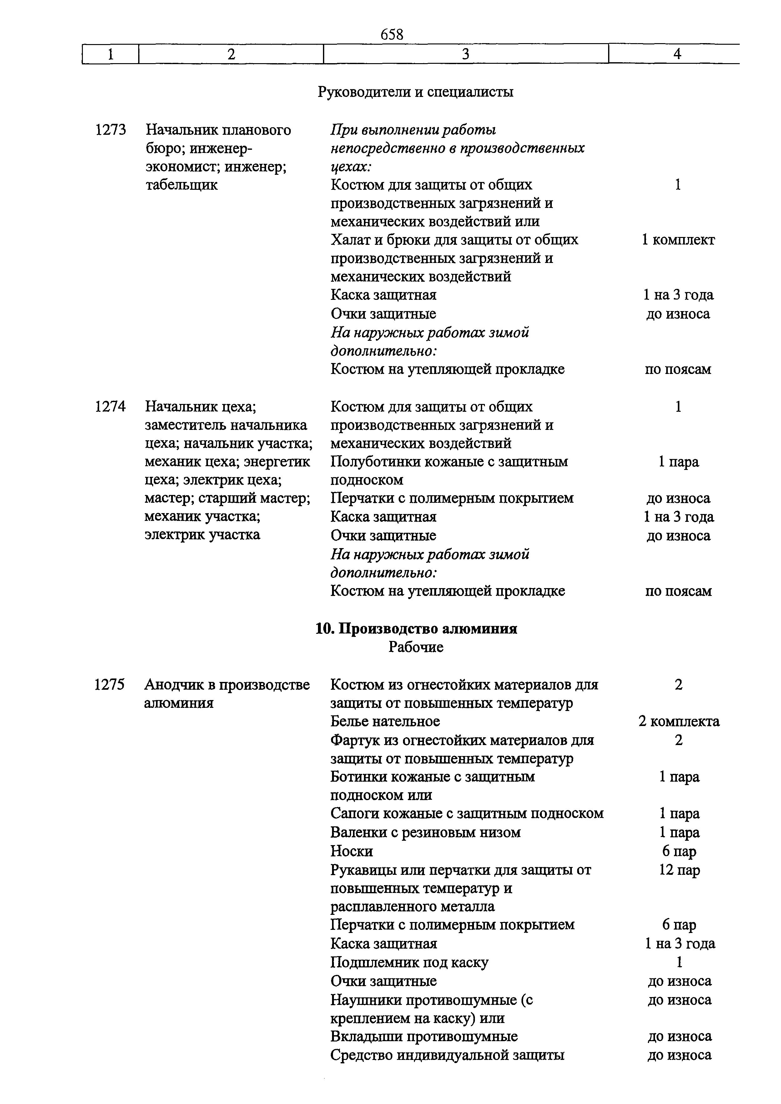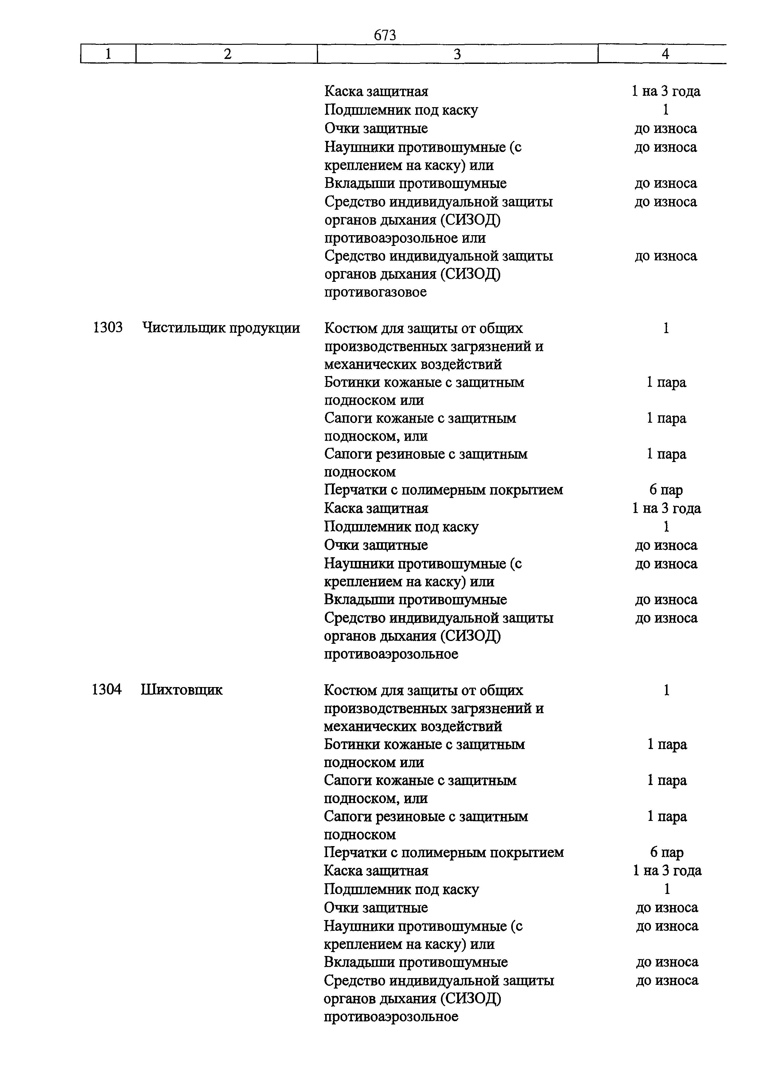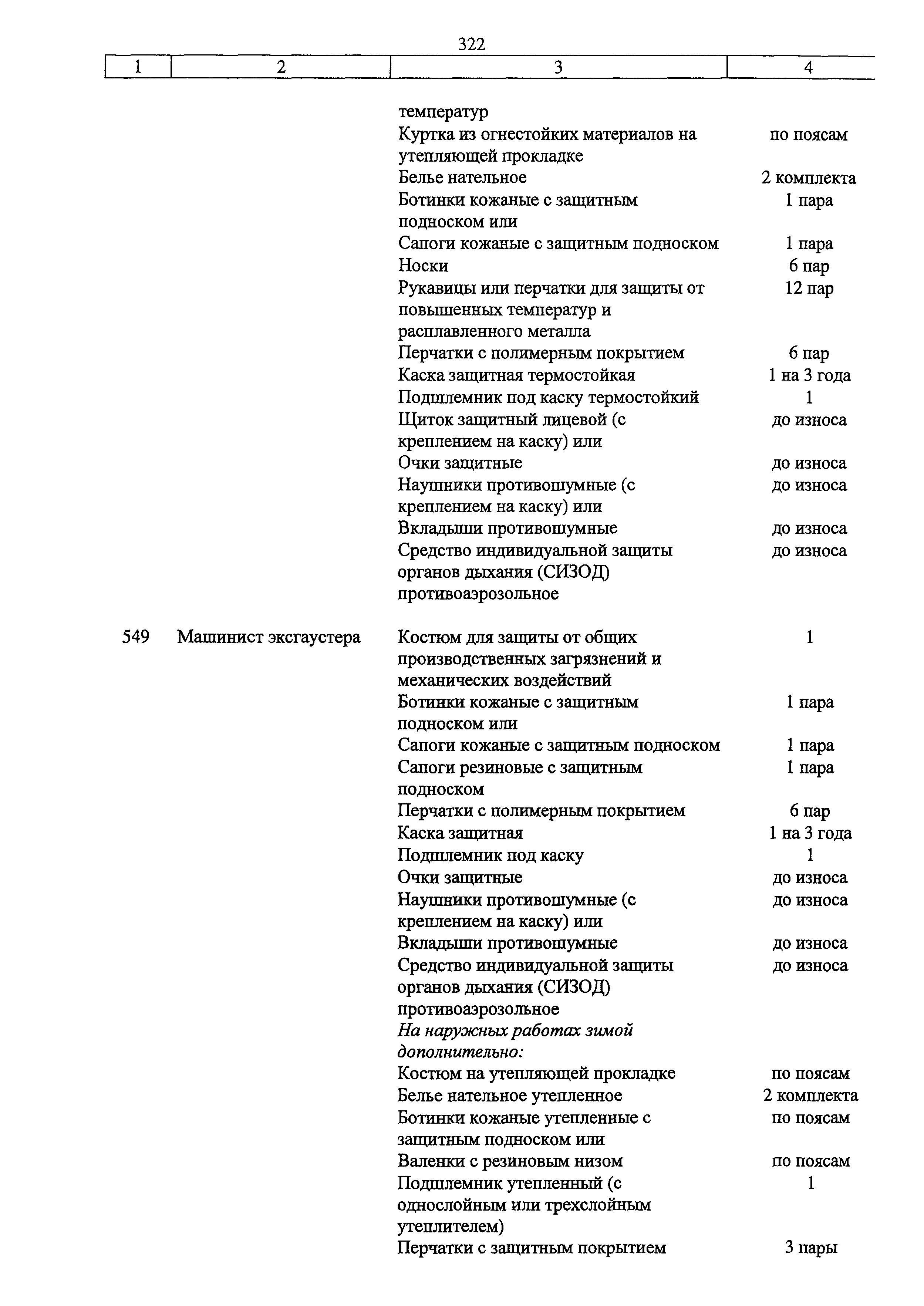 Типовые нормы бесплатной выдачи специальной одежды, специальной обуви и других средств индивидуальной защиты работникам горной и металлургической промышленности и металлургических производств других отраслей промышленности, занятым на работах с вредными и (или) опасными условиями труда, а также на работах, выполняемых в особых температурных условиях или связанных с загрязнением| Статус: | действует | | Название рус.: | Типовые нормы бесплатной выдачи специальной одежды, специальной обуви и других средств индивидуальной защиты работникам горной и металлургической промышленности и металлургических производств других отраслей промышленности, занятым на работах с вредными и (или) опасными условиями труда, а также на работах, выполняемых в особых температурных условиях или связанных с загрязнением | | Дата добавления в базу: | 01.02.2017 | | Дата актуализации: | 01.01.2021 | | Дата введения: | 14.02.2014 | | Область применения: | Нормы утверждаются локальными нормативными актами работодателя на основании результатов аттестации рабочих мест по условиям труда и могут быть включены в коллективный и (или) трудовой договор с указанием типовых норм, по сравнению с которыми улучшается обеспечение работников специальной одеждой, специальной обувью и другими средствами индивидуальной защиты. | | Оглавление: | I Горнодобывающая промышленность 1 Подземные горные работы (шахты) 2 Открытые горные работы и шахтная поверхность 3 Работа на гидравлических установках или с промывочными приборами 4 Дражные работы II Дробление, обогащение, брикетирование, обжиг, агломерация, извлечение металлов и сплавов III Черная металлургия 1 Коксохимическое производство 1.1 Углеподготовительные цеха 1.2 Углеобогатительные цеха 1.3 Производство каменноугольного кокса 1.4 Производство кристаллического нафталина, кумароновой смолы, смолоперерабатывающие цеха 1.5 Производство пиридиновых и фенольно-крезольных продуктов 1.6 Цеха улавливания химических продуктов и газовые цеха 1.7 Цеха ректификации сырого бензола 1.8 Цеха очистки коксового газа от сероводорода 1.9 Производство пекового кокса 1.10 Производство термоантрацита 2 Доменное производство 3 Сталеплавильное производство 3.1 Установки непрерывной разливки стали 4 Производство ферросплавов 4.1 Электролитическое производство 4.2 Производство электролитического хрома 4.3 Производство феррованадия 4.4 Подготовка шихты, обжиг руд и концентратов 4.5 Разливка и разделка ферросплавов 4.6 Обжиг извести 4.7 Общие профессии и должности ферросплавного производства 5 Прокатное производство 6 Производство труб (прокатка, сварка и волочение) 7 Колесопрокатное и бандажное производства 8 Валопрокатное производство 9 Производство рельсовых скреплений 10 Производство баллонов 11 Труболитейное производство 12 Производство метизов 12.1 Производство металлических канатов, сеток, пружин и пружинной ленты, щеток, цепей, колючей проволоки и других метизов 12.2 Волочение проволоки, калибровка и шлифовка металла 12.3 Изготовление волок 12.4 Холодноштамповочные и кузнечно-прессовые работы 12.5 Термическая обработка 12.6 Травление металла, защитные покрытия проволоки и извлечение железного купороса 12.7 Производство металлических электродов и порошковой проволоки 13 Производство огнеупоров 13.1 Огнеупоры 13.2 Карборундовые стержни 13.3 Высокоогнеупорные окислы 14 Ремонт 