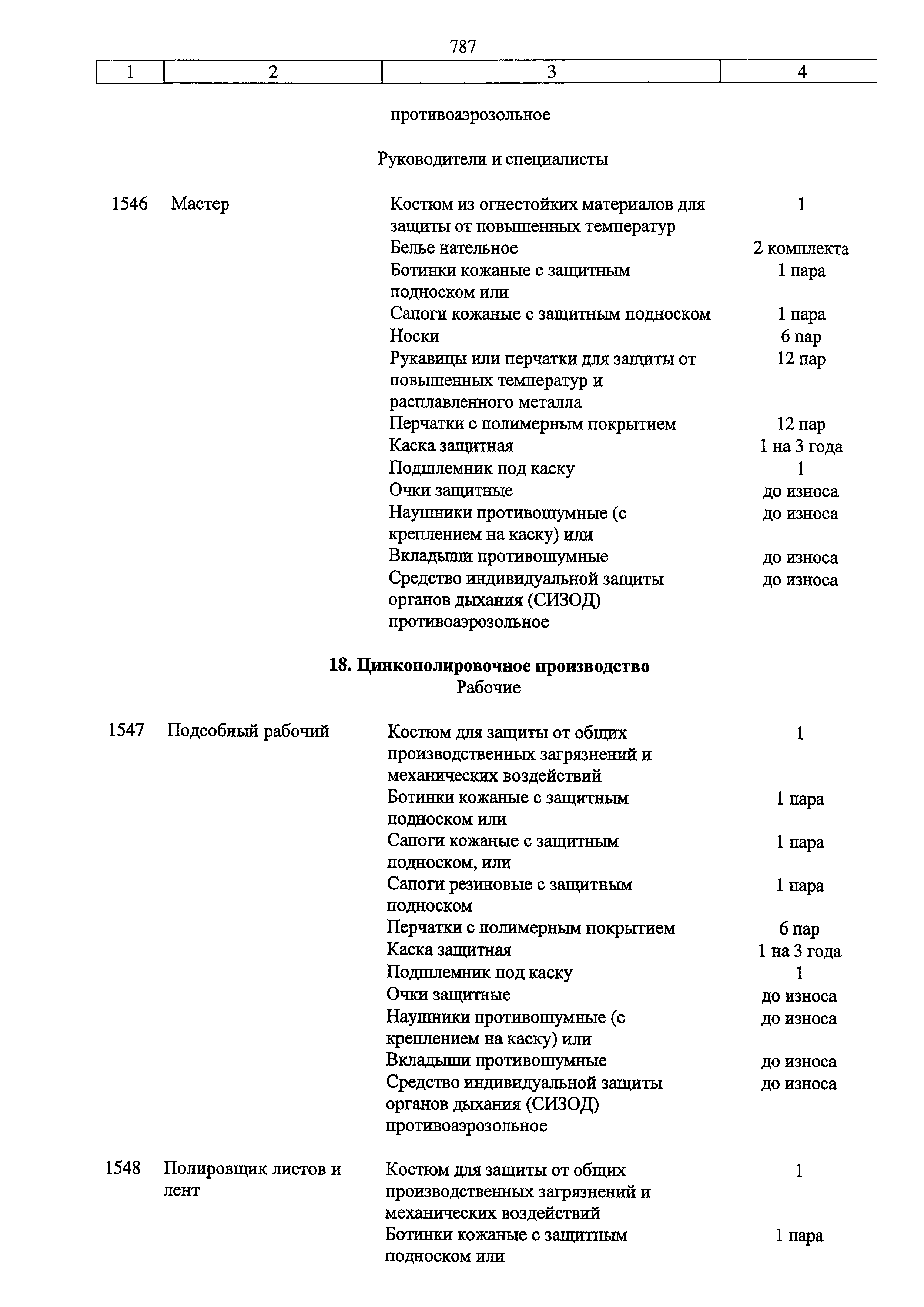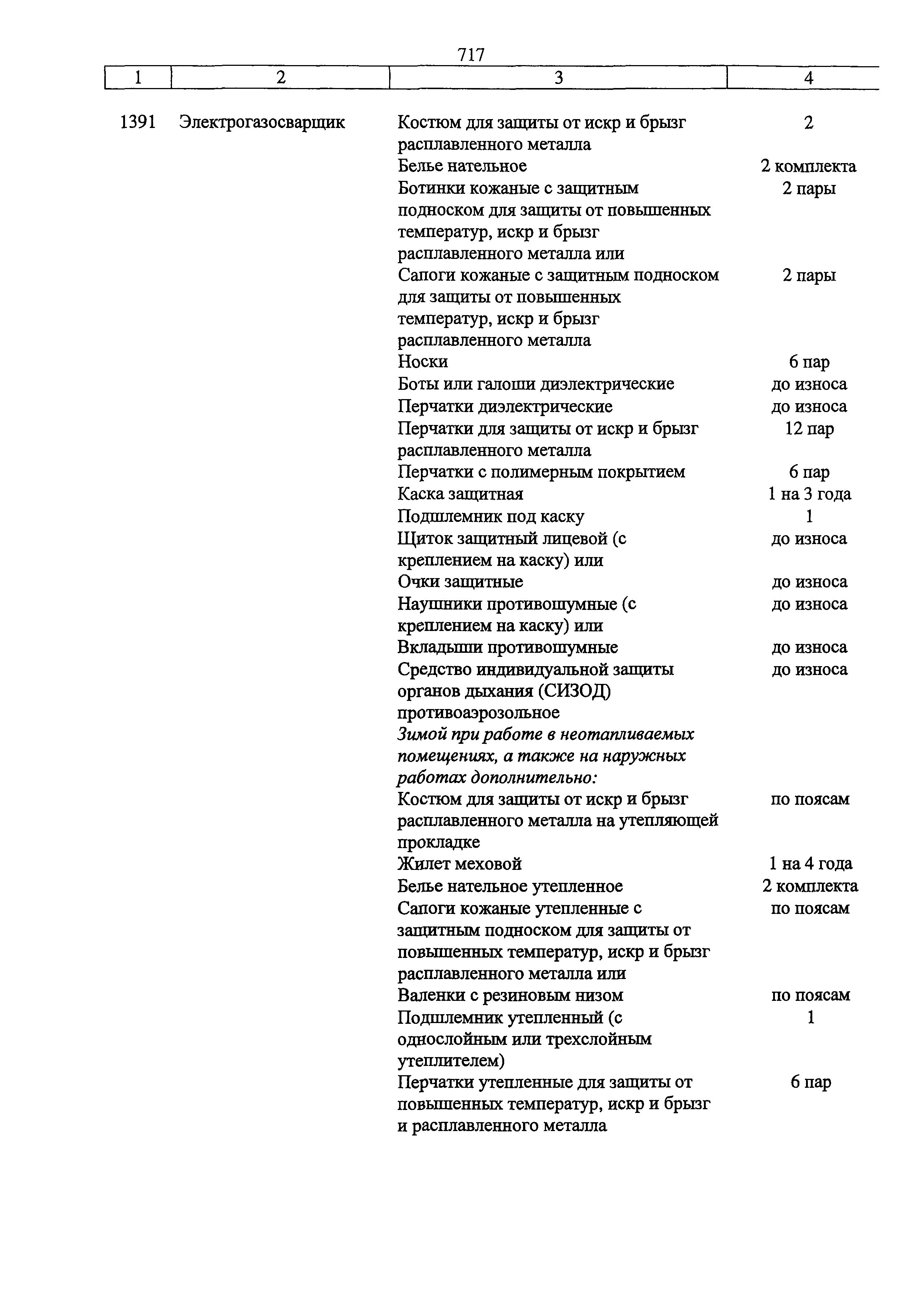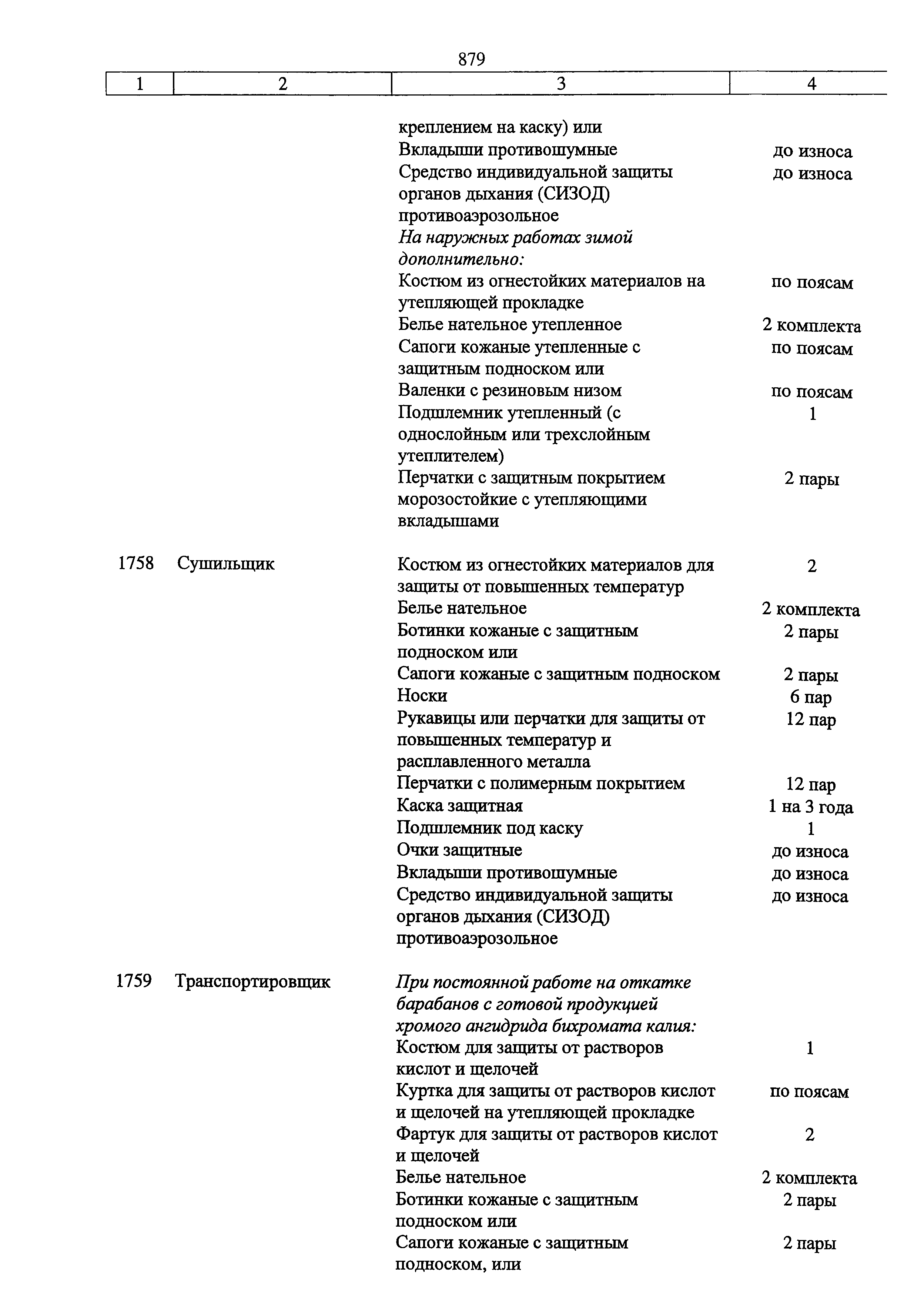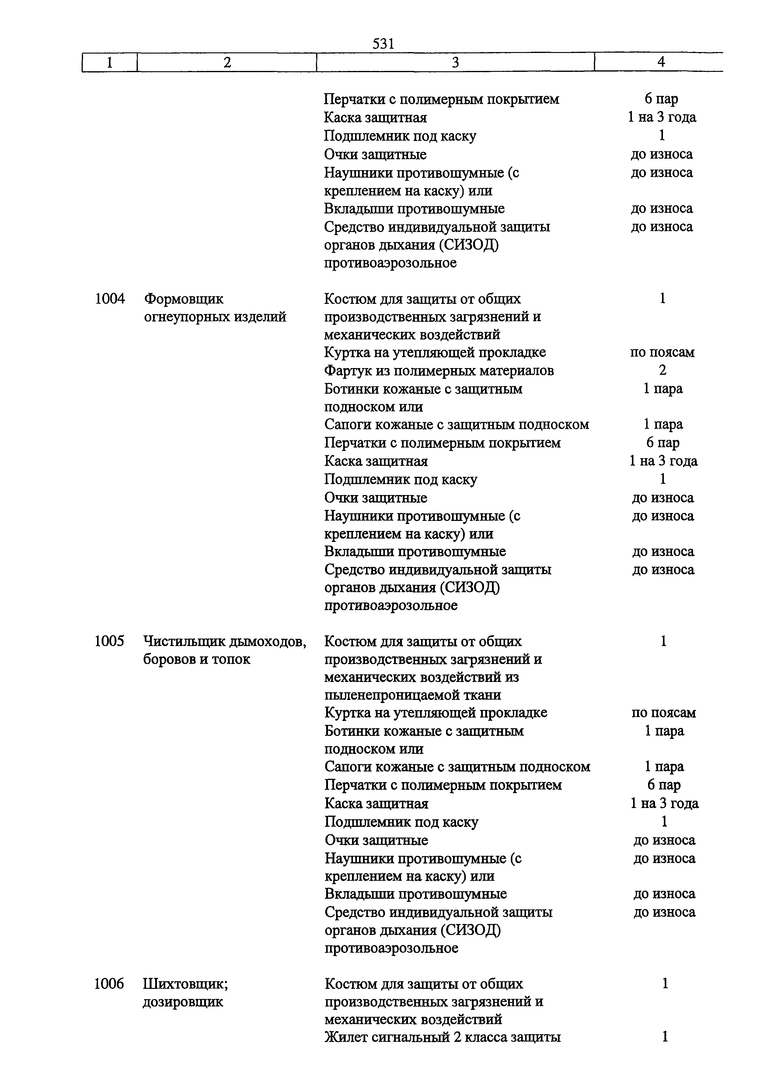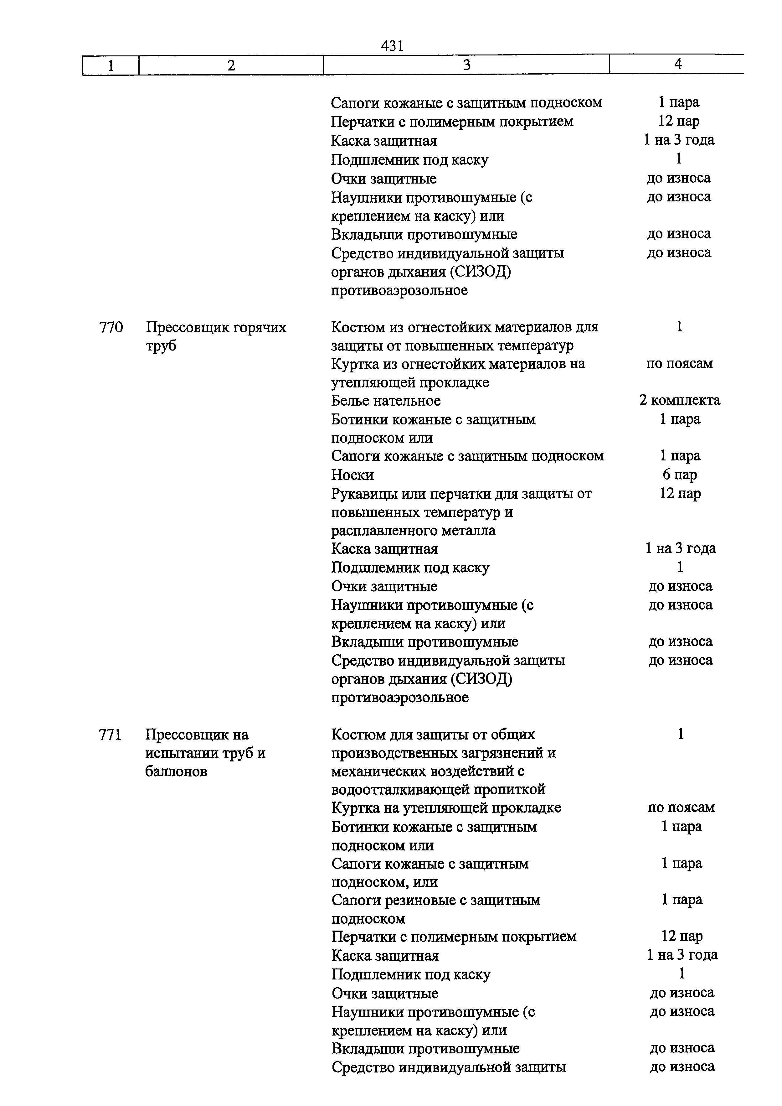 Типовые нормы бесплатной выдачи специальной одежды, специальной обуви и других средств индивидуальной защиты работникам горной и металлургической промышленности и металлургических производств других отраслей промышленности, занятым на работах с вредными и (или) опасными условиями труда, а также на работах, выполняемых в особых температурных условиях или связанных с загрязнением| Статус: | действует | | Название рус.: | Типовые нормы бесплатной выдачи специальной одежды, специальной обуви и других средств индивидуальной защиты работникам горной и металлургической промышленности и металлургических производств других отраслей промышленности, занятым на работах с вредными и (или) опасными условиями труда, а также на работах, выполняемых в особых температурных условиях или связанных с загрязнением | | Дата добавления в базу: | 01.02.2017 | | Дата актуализации: | 01.01.2021 | | Дата введения: | 14.02.2014 | | Область применения: | Нормы утверждаются локальными нормативными актами работодателя на основании результатов аттестации рабочих мест по условиям труда и могут быть включены в коллективный и (или) трудовой договор с указанием типовых норм, по сравнению с которыми улучшается обеспечение работников специальной одеждой, специальной обувью и другими средствами индивидуальной защиты. | | Оглавление: | I Горнодобывающая промышленность 1 Подземные горные работы (шахты) 2 Открытые горные работы и шахтная поверхность 3 Работа на гидравлических установках или с промывочными приборами 4 Дражные работы II Дробление, обогащение, брикетирование, обжиг, агломерация, извлечение металлов и сплавов III Черная металлургия 1 Коксохимическое производство 1.1 Углеподготовительные цеха 1.2 Углеобогатительные цеха 1.3 Производство каменноугольного кокса 1.4 Производство кристаллического нафталина, кумароновой смолы, смолоперерабатывающие цеха 1.5 Производство пиридиновых и фенольно-крезольных продуктов 1.6 Цеха улавливания химических продуктов и газовые цеха 1.7 Цеха ректификации сырого бензола 1.8 Цеха очистки коксового газа от сероводорода 1.9 Производство пекового кокса 1.10 Производство термоантрацита 2 Доменное производство 3 Сталеплавильное производство 3.1 Установки непрерывной разливки стали 4 Производство ферросплавов 4.1 Электролитическое производство 4.2 Производство электролитического хрома 4.3 Производство феррованадия 4.4 Подготовка шихты, обжиг руд и концентратов 4.5 Разливка и разделка ферросплавов 4.6 Обжиг извести 4.7 Общие профессии и должности ферросплавного производства 5 Прокатное производство 6 Производство труб (прокатка, сварка и волочение) 7 Колесопрокатное и бандажное производства 8 Валопрокатное производство 9 Производство рельсовых скреплений 10 Производство баллонов 11 Труболитейное производство 12 Производство метизов 12.1 Производство металлических канатов, сеток, пружин и пружинной ленты, щеток, цепей, колючей проволоки и других метизов 12.2 Волочение проволоки, калибровка и шлифовка металла 12.3 Изготовление волок 12.4 Холодноштамповочные и кузнечно-прессовые работы 12.5 Термическая обработка 12.6 Травление металла, защитные покрытия проволоки и извлечение железного купороса 12.7 Производство металлических электродов и порошковой проволоки 13 Производство огнеупоров 13.1 Огнеупоры 13.2 Карборундовые стержни 13.3 Высокоогнеупорные окислы 14 Ремонт 