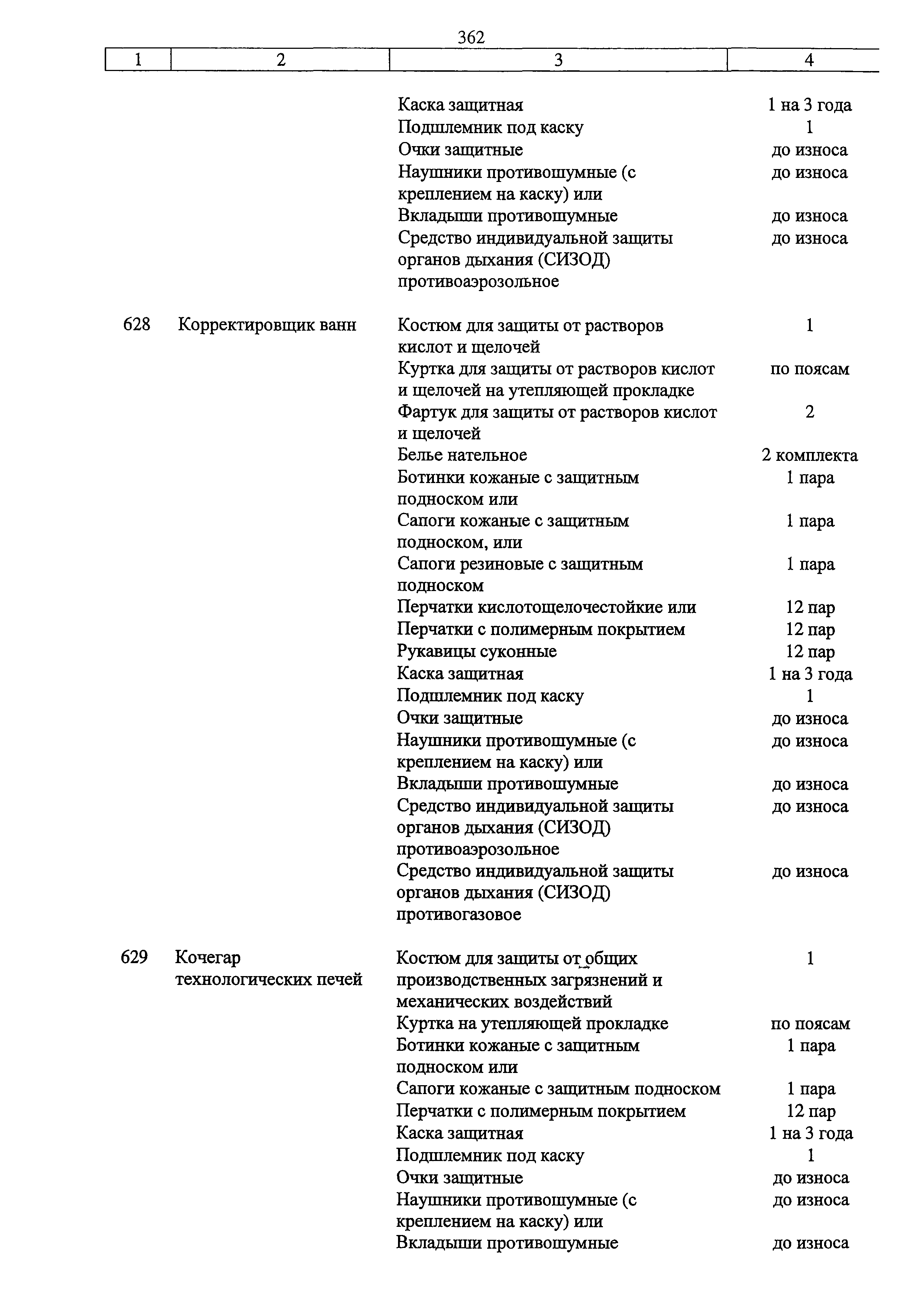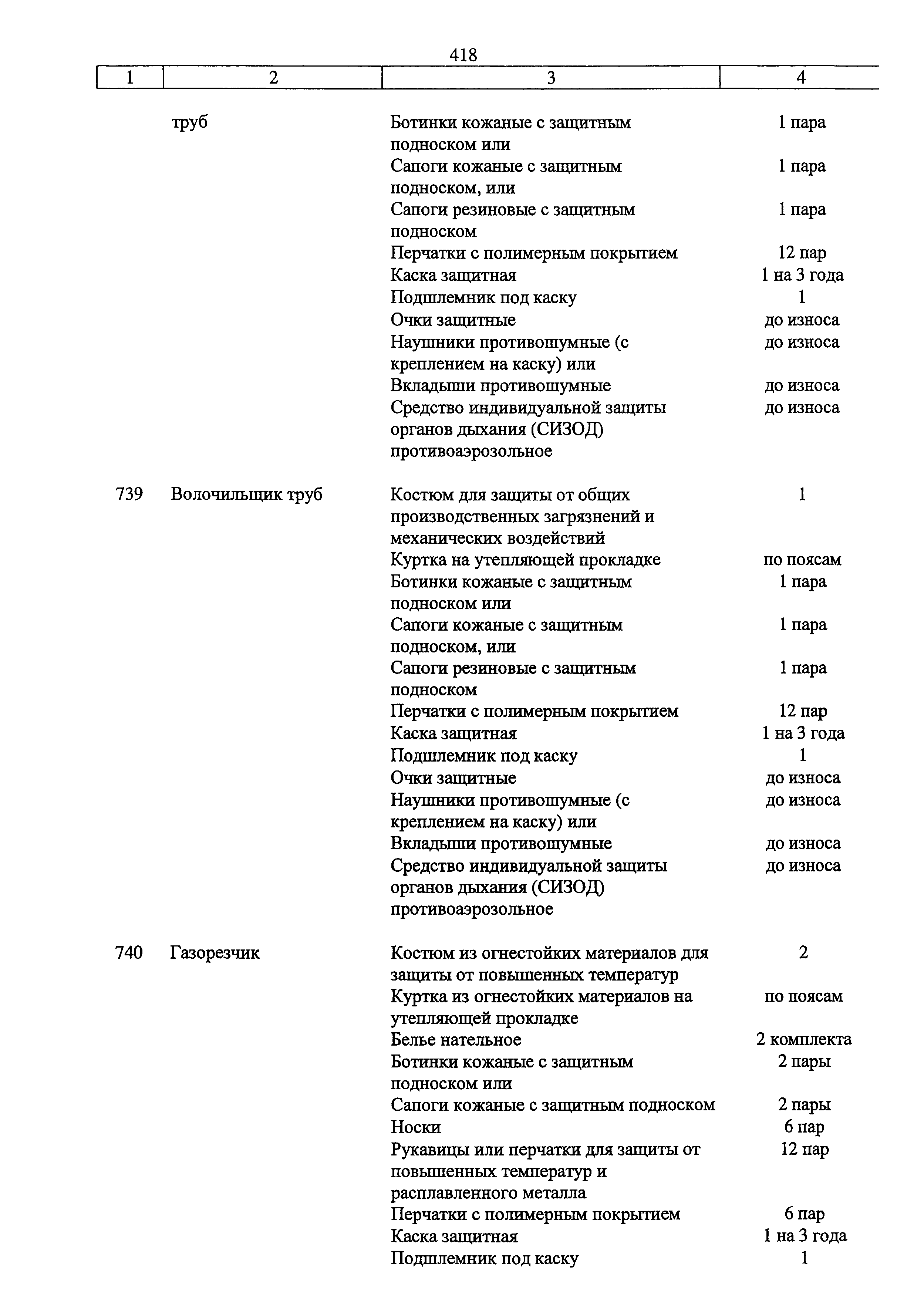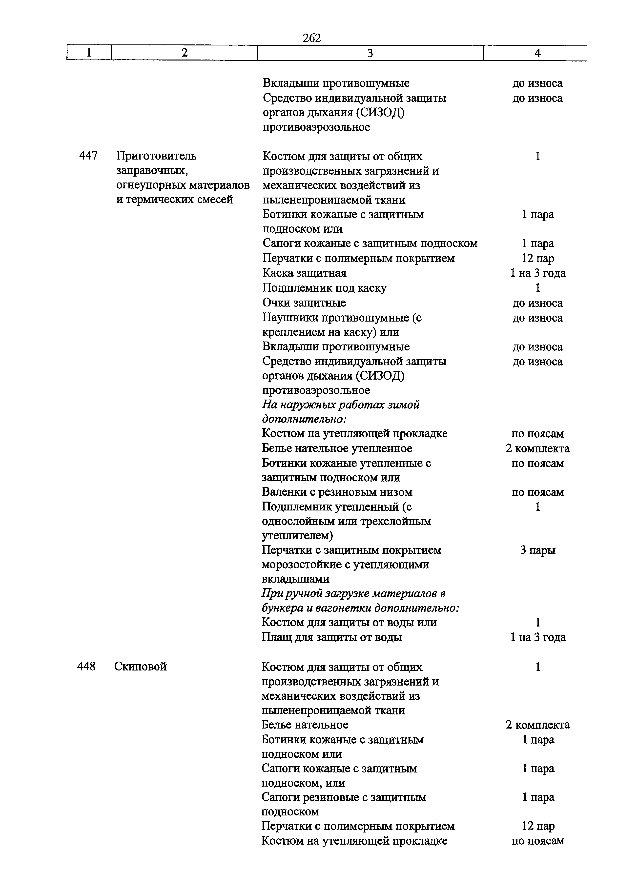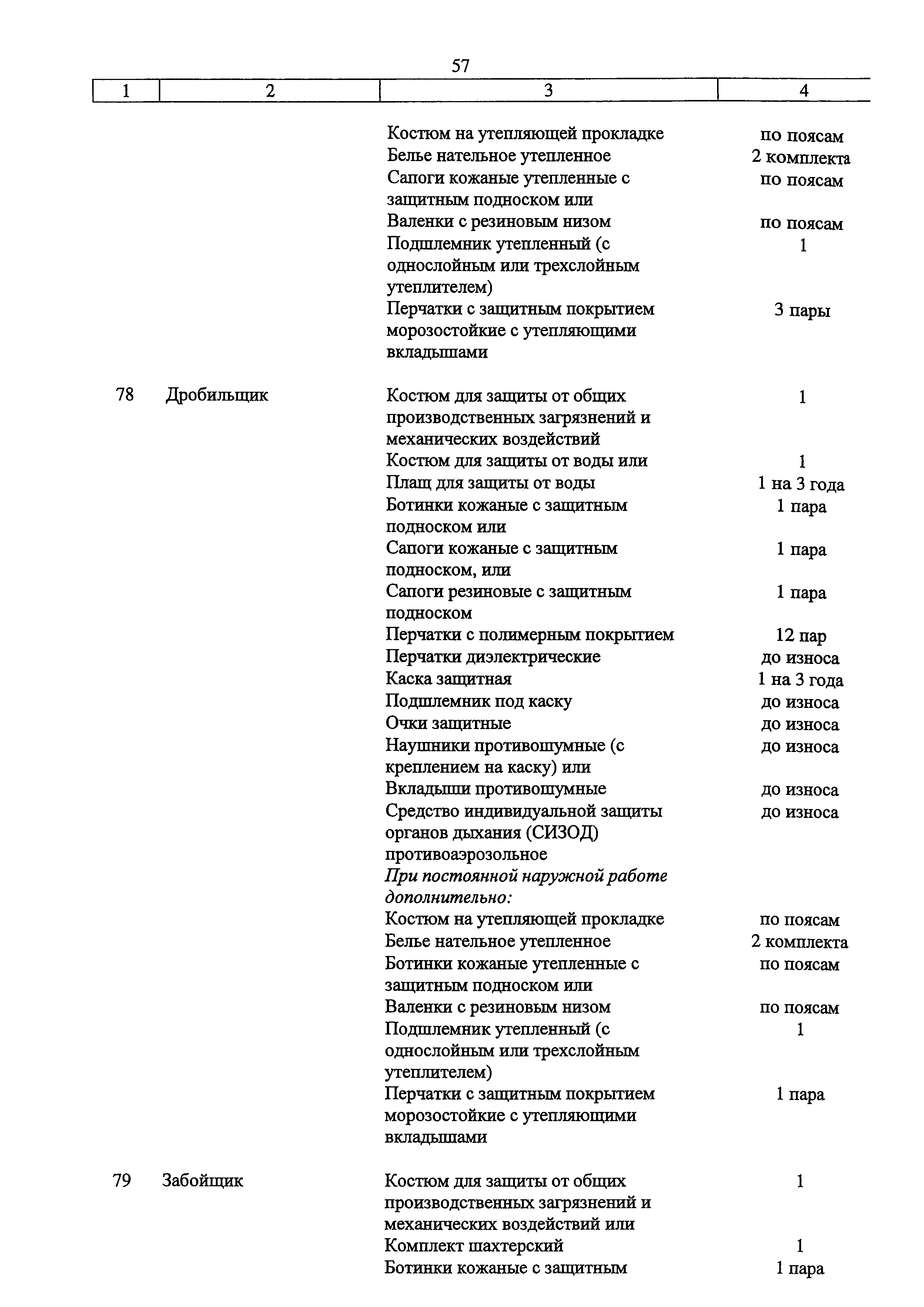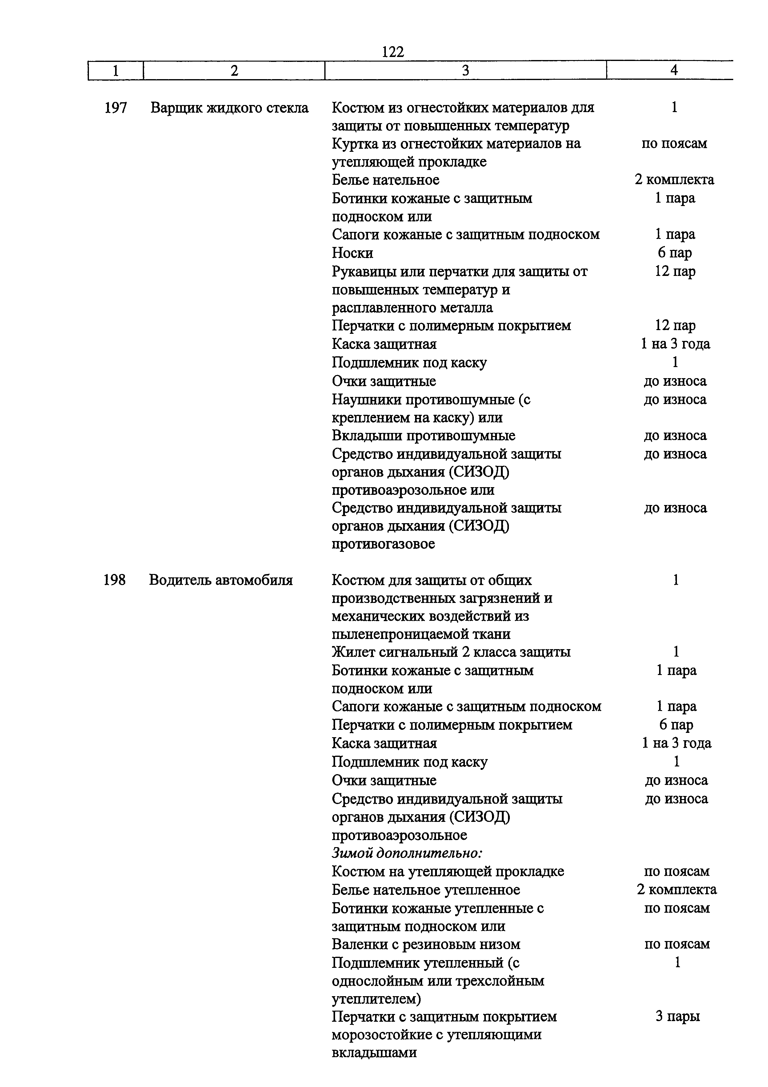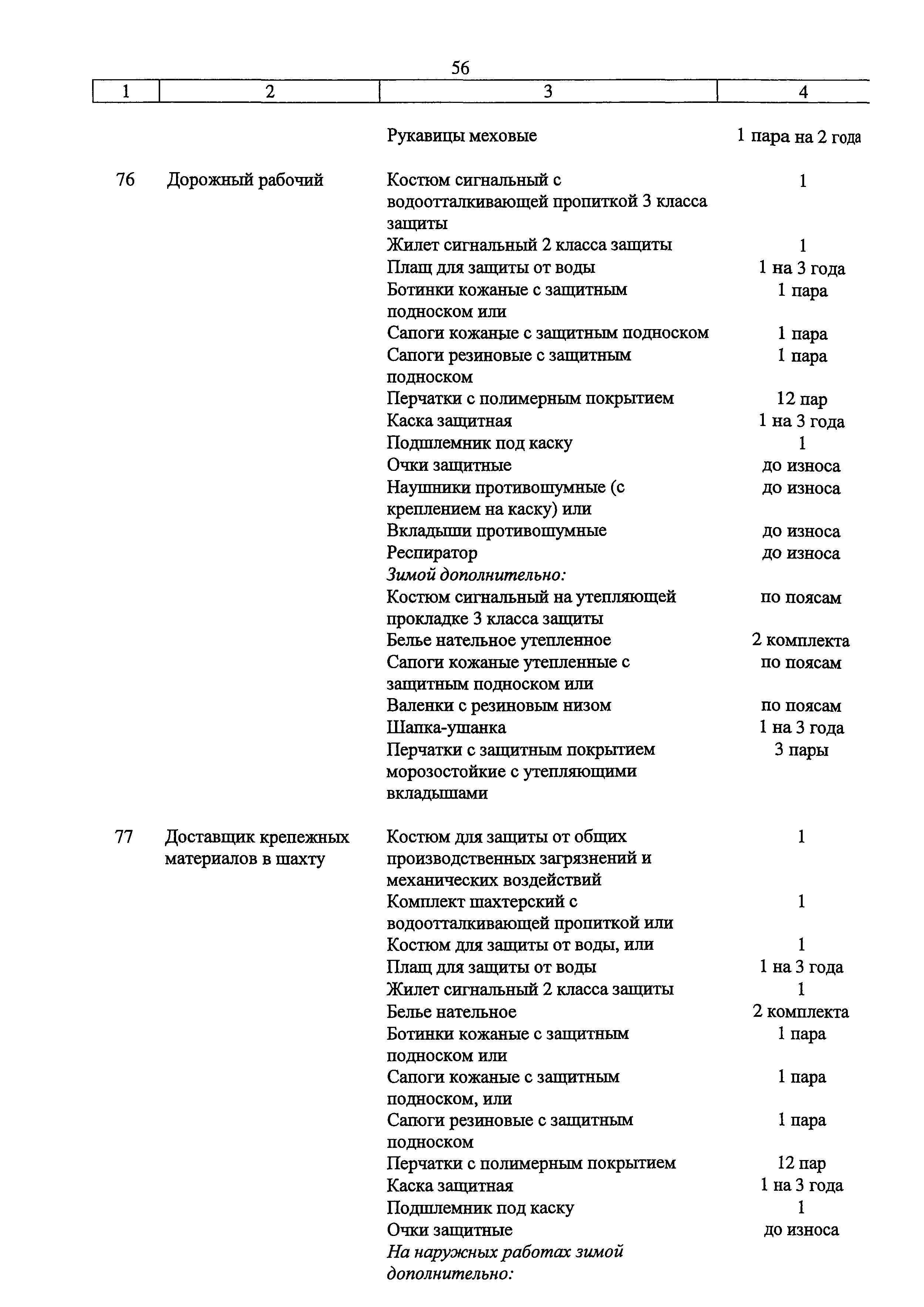 Типовые нормы бесплатной выдачи специальной одежды, специальной обуви и других средств индивидуальной защиты работникам горной и металлургической промышленности и металлургических производств других отраслей промышленности, занятым на работах с вредными и (или) опасными условиями труда, а также на работах, выполняемых в особых температурных условиях или связанных с загрязнением| Статус: | действует | | Название рус.: | Типовые нормы бесплатной выдачи специальной одежды, специальной обуви и других средств индивидуальной защиты работникам горной и металлургической промышленности и металлургических производств других отраслей промышленности, занятым на работах с вредными и (или) опасными условиями труда, а также на работах, выполняемых в особых температурных условиях или связанных с загрязнением | | Дата добавления в базу: | 01.02.2017 | | Дата актуализации: | 01.01.2021 | | Дата введения: | 14.02.2014 | | Область применения: | Нормы утверждаются локальными нормативными актами работодателя на основании результатов аттестации рабочих мест по условиям труда и могут быть включены в коллективный и (или) трудовой договор с указанием типовых норм, по сравнению с которыми улучшается обеспечение работников специальной одеждой, специальной обувью и другими средствами индивидуальной защиты. | | Оглавление: | I Горнодобывающая промышленность 1 Подземные горные работы (шахты) 2 Открытые горные работы и шахтная поверхность 3 Работа на гидравлических установках или с промывочными приборами 4 Дражные работы II Дробление, обогащение, брикетирование, обжиг, агломерация, извлечение металлов и сплавов III Черная металлургия 1 Коксохимическое производство 1.1 Углеподготовительные цеха 1.2 Углеобогатительные цеха 1.3 Производство каменноугольного кокса 1.4 Производство кристаллического нафталина, кумароновой смолы, смолоперерабатывающие цеха 1.5 Производство пиридиновых и фенольно-крезольных продуктов 1.6 Цеха улавливания химических продуктов и газовые цеха 1.7 Цеха ректификации сырого бензола 1.8 Цеха очистки коксового газа от сероводорода 1.9 Производство пекового кокса 1.10 Производство термоантрацита 2 Доменное производство 3 Сталеплавильное производство 3.1 Установки непрерывной разливки стали 4 Производство ферросплавов 4.1 Электролитическое производство 4.2 Производство электролитического хрома 4.3 Производство феррованадия 4.4 Подготовка шихты, обжиг руд и концентратов 4.5 Разливка и разделка ферросплавов 4.6 Обжиг извести 4.7 Общие профессии и должности ферросплавного производства 5 Прокатное производство 6 Производство труб (прокатка, сварка и волочение) 7 Колесопрокатное и бандажное производства 8 Валопрокатное производство 9 Производство рельсовых скреплений 10 Производство баллонов 11 Труболитейное производство 12 Производство метизов 12.1 Производство металлических канатов, сеток, пружин и пружинной ленты, щеток, цепей, колючей проволоки и других метизов 12.2 Волочение проволоки, калибровка и шлифовка металла 12.3 Изготовление волок 12.4 Холодноштамповочные и кузнечно-прессовые работы 12.5 Термическая обработка 12.6 Травление металла, защитные покрытия проволоки и извлечение железного купороса 12.7 Производство металлических электродов и порошковой проволоки 13 Производство огнеупоров 13.1 Огнеупоры 13.2 Карборундовые стержни 13.3 Высокоогнеупорные окислы 14 Ремонт 