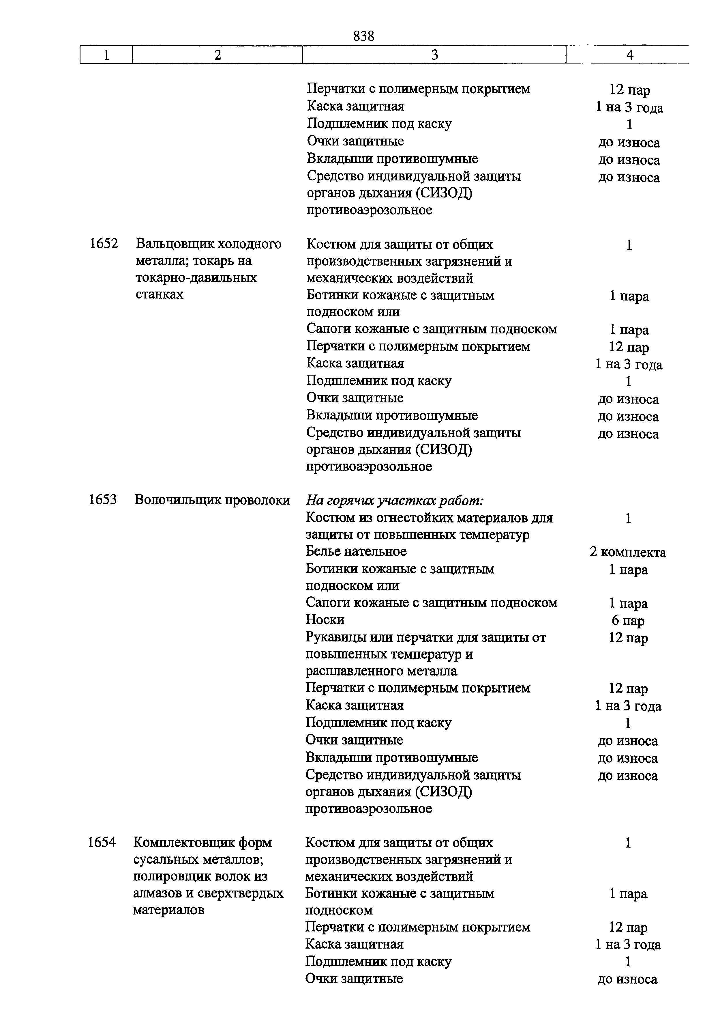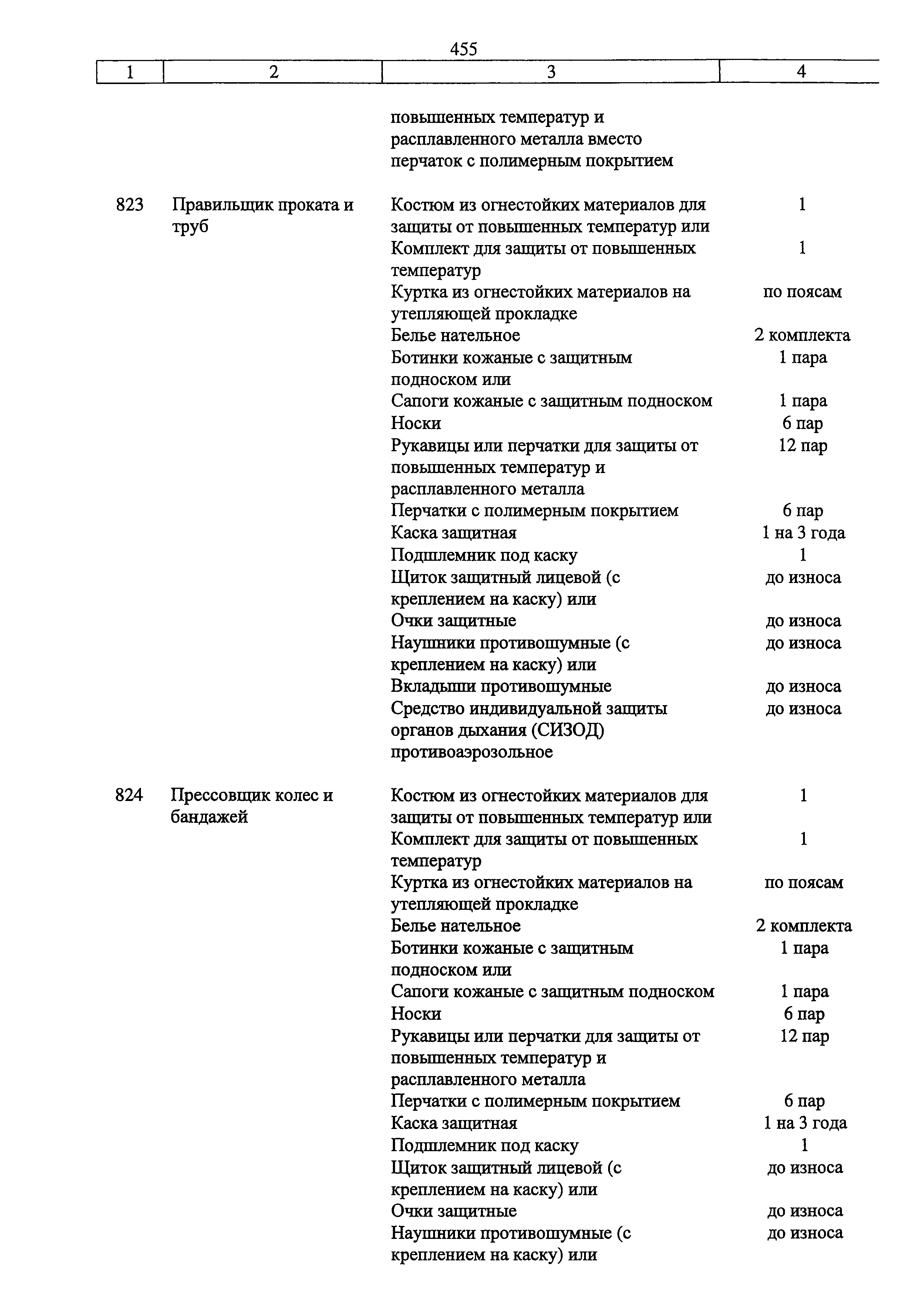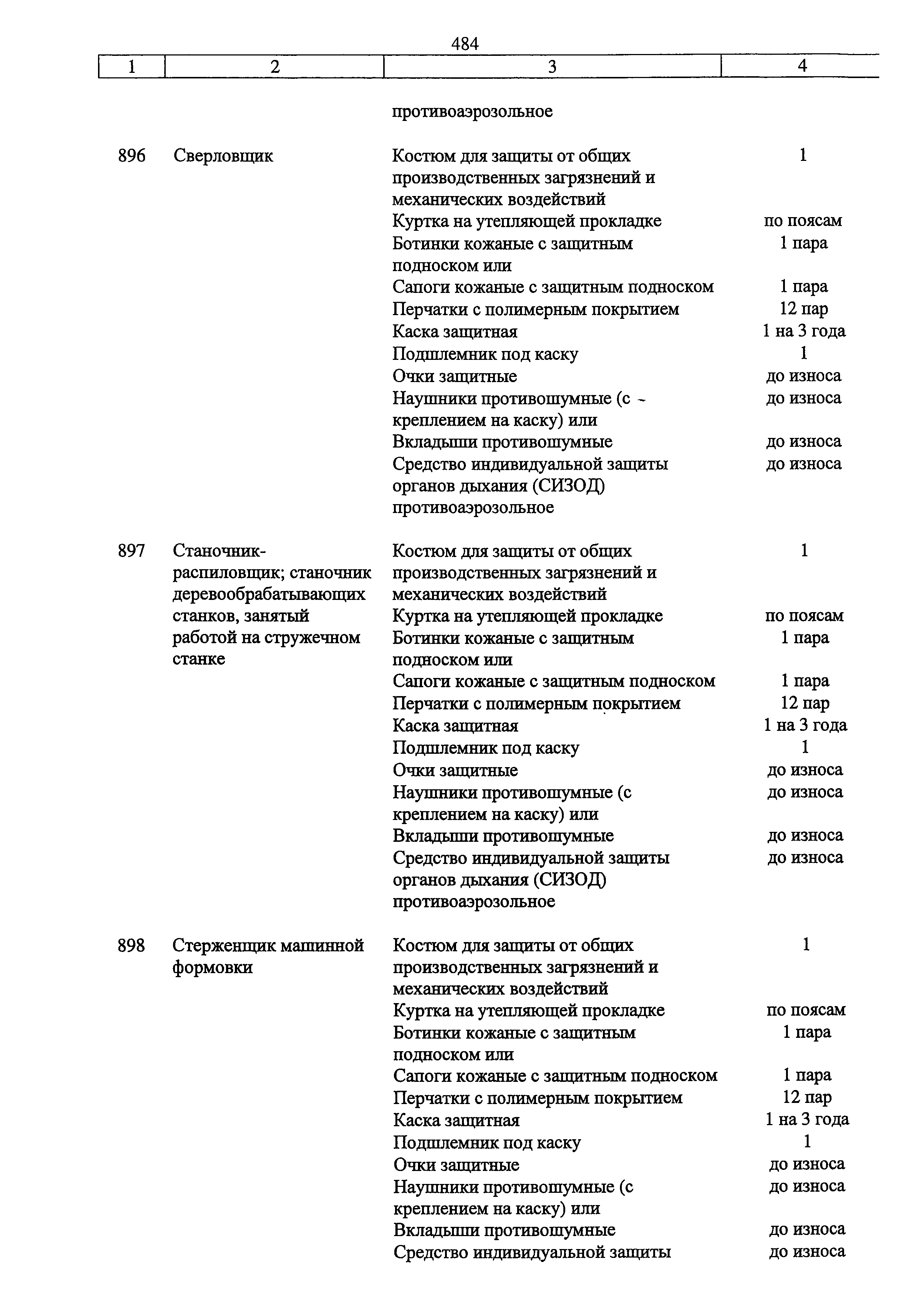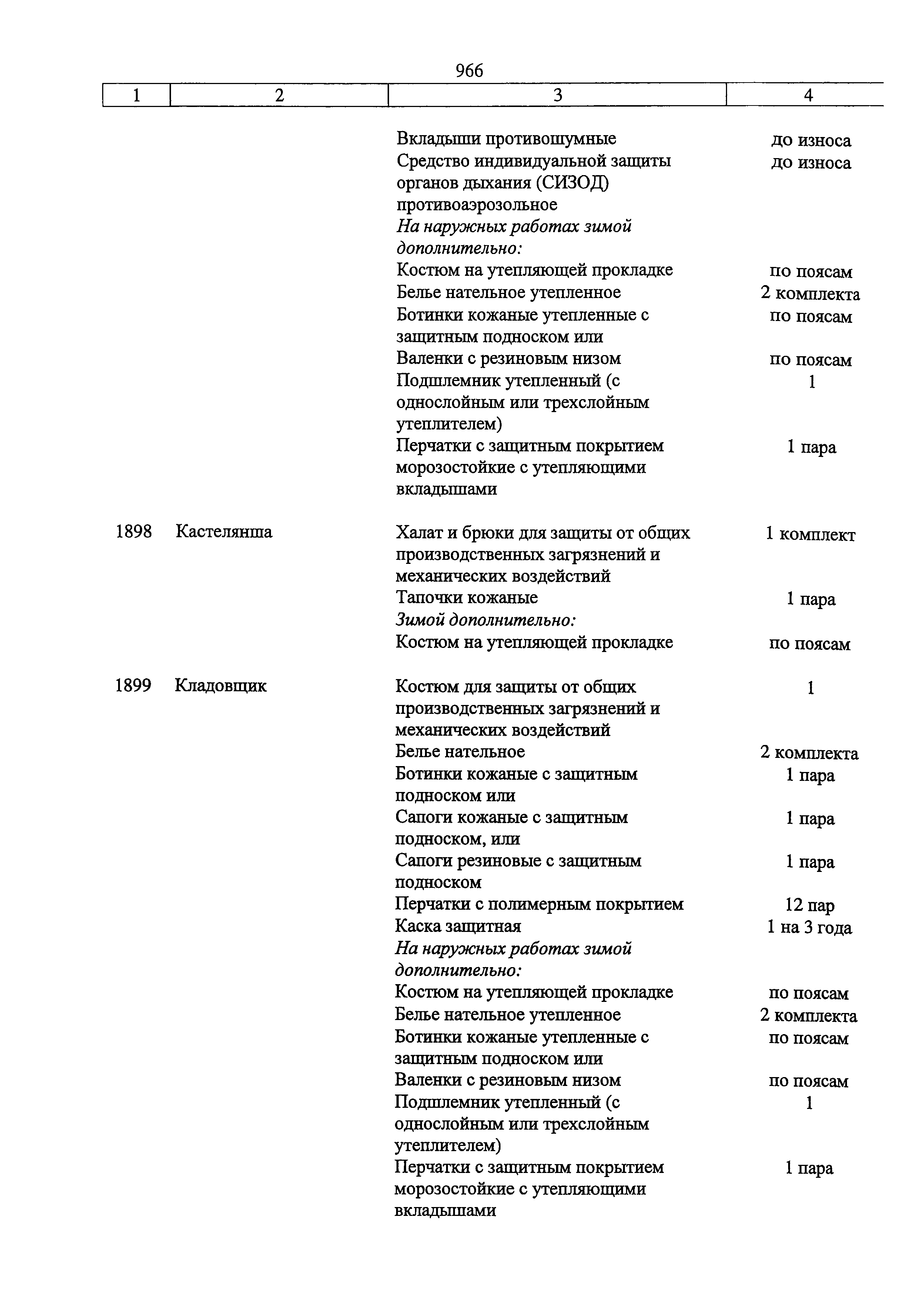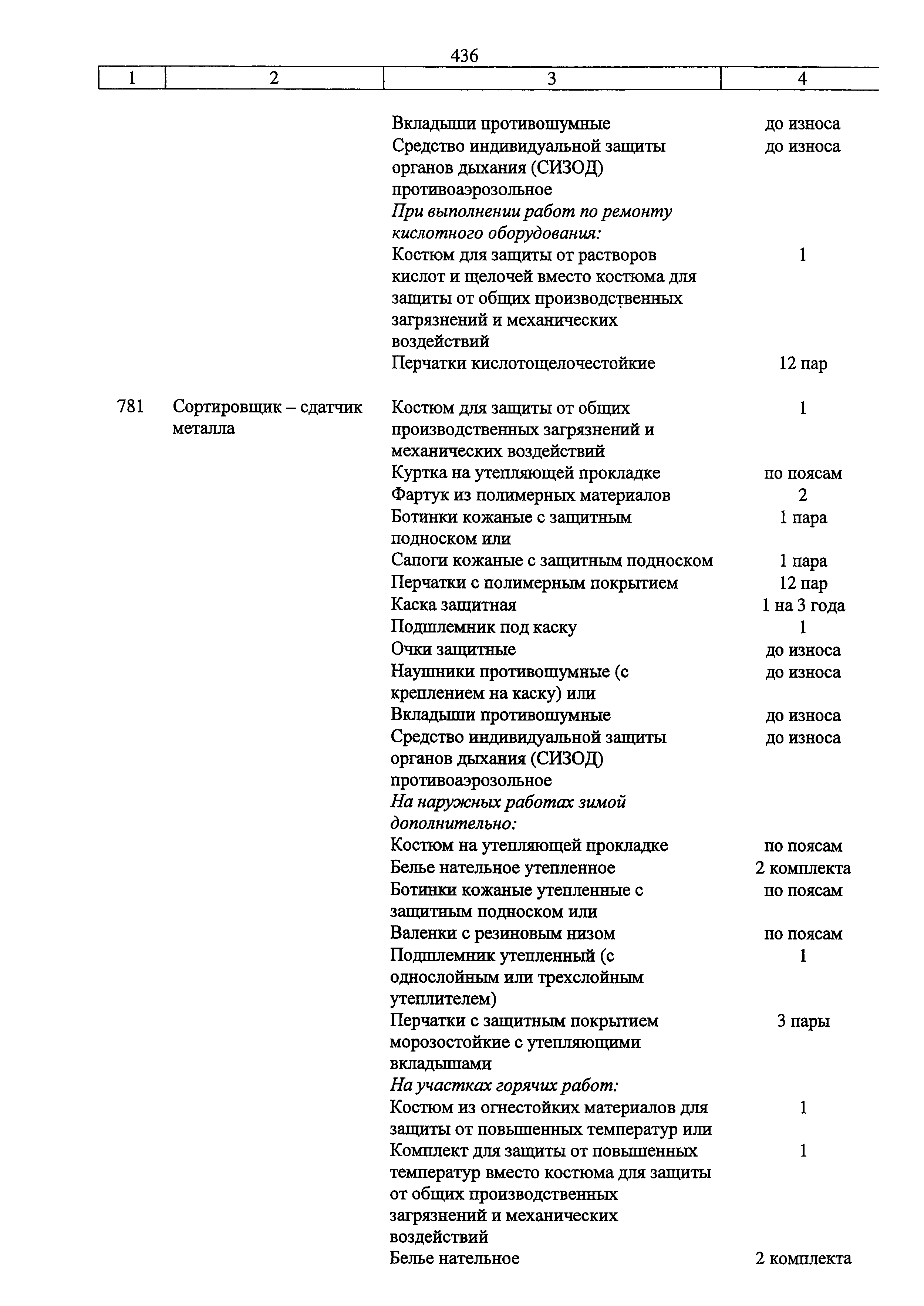 Типовые нормы бесплатной выдачи специальной одежды, специальной обуви и других средств индивидуальной защиты работникам горной и металлургической промышленности и металлургических производств других отраслей промышленности, занятым на работах с вредными и (или) опасными условиями труда, а также на работах, выполняемых в особых температурных условиях или связанных с загрязнением| Статус: | действует | | Название рус.: | Типовые нормы бесплатной выдачи специальной одежды, специальной обуви и других средств индивидуальной защиты работникам горной и металлургической промышленности и металлургических производств других отраслей промышленности, занятым на работах с вредными и (или) опасными условиями труда, а также на работах, выполняемых в особых температурных условиях или связанных с загрязнением | | Дата добавления в базу: | 01.02.2017 | | Дата актуализации: | 01.01.2021 | | Дата введения: | 14.02.2014 | | Область применения: | Нормы утверждаются локальными нормативными актами работодателя на основании результатов аттестации рабочих мест по условиям труда и могут быть включены в коллективный и (или) трудовой договор с указанием типовых норм, по сравнению с которыми улучшается обеспечение работников специальной одеждой, специальной обувью и другими средствами индивидуальной защиты. | | Оглавление: | I Горнодобывающая промышленность 1 Подземные горные работы (шахты) 2 Открытые горные работы и шахтная поверхность 3 Работа на гидравлических установках или с промывочными приборами 4 Дражные работы II Дробление, обогащение, брикетирование, обжиг, агломерация, извлечение металлов и сплавов III Черная металлургия 1 Коксохимическое производство 1.1 Углеподготовительные цеха 1.2 Углеобогатительные цеха 1.3 Производство каменноугольного кокса 1.4 Производство кристаллического нафталина, кумароновой смолы, смолоперерабатывающие цеха 1.5 Производство пиридиновых и фенольно-крезольных продуктов 1.6 Цеха улавливания химических продуктов и газовые цеха 1.7 Цеха ректификации сырого бензола 1.8 Цеха очистки коксового газа от сероводорода 1.9 Производство пекового кокса 1.10 Производство термоантрацита 2 Доменное производство 3 Сталеплавильное производство 3.1 Установки непрерывной разливки стали 4 Производство ферросплавов 4.1 Электролитическое производство 4.2 Производство электролитического хрома 4.3 Производство феррованадия 4.4 Подготовка шихты, обжиг руд и концентратов 4.5 Разливка и разделка ферросплавов 4.6 Обжиг извести 4.7 Общие профессии и должности ферросплавного производства 5 Прокатное производство 6 Производство труб (прокатка, сварка и волочение) 7 Колесопрокатное и бандажное производства 8 Валопрокатное производство 9 Производство рельсовых скреплений 10 Производство баллонов 11 Труболитейное производство 12 Производство метизов 12.1 Производство металлических канатов, сеток, пружин и пружинной ленты, щеток, цепей, колючей проволоки и других метизов 12.2 Волочение проволоки, калибровка и шлифовка металла 12.3 Изготовление волок 12.4 Холодноштамповочные и кузнечно-прессовые работы 12.5 Термическая обработка 12.6 Травление металла, защитные покрытия проволоки и извлечение железного купороса 12.7 Производство металлических электродов и порошковой проволоки 13 Производство огнеупоров 13.1 Огнеупоры 13.2 Карборундовые стержни 13.3 Высокоогнеупорные окислы 14 Ремонт 