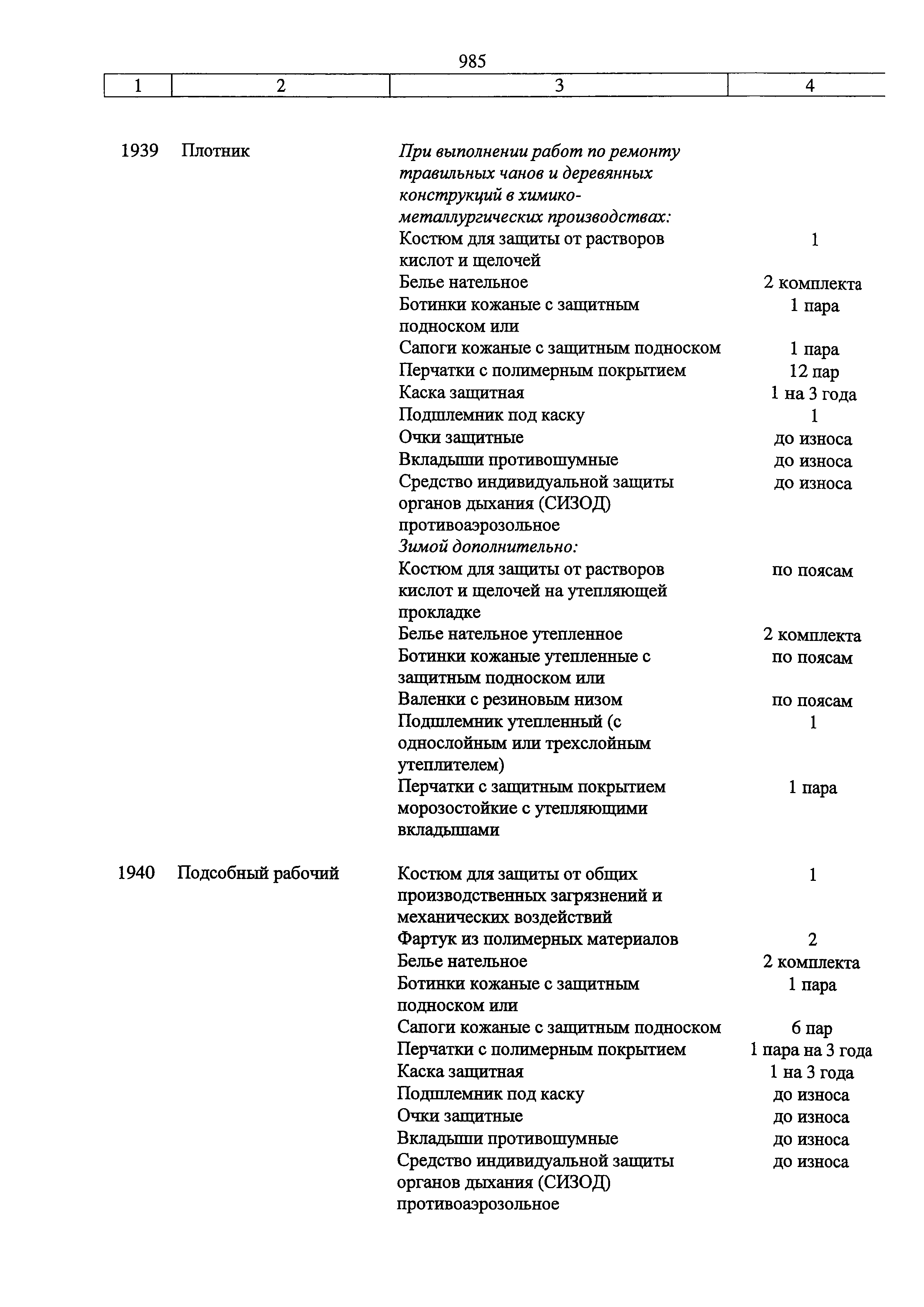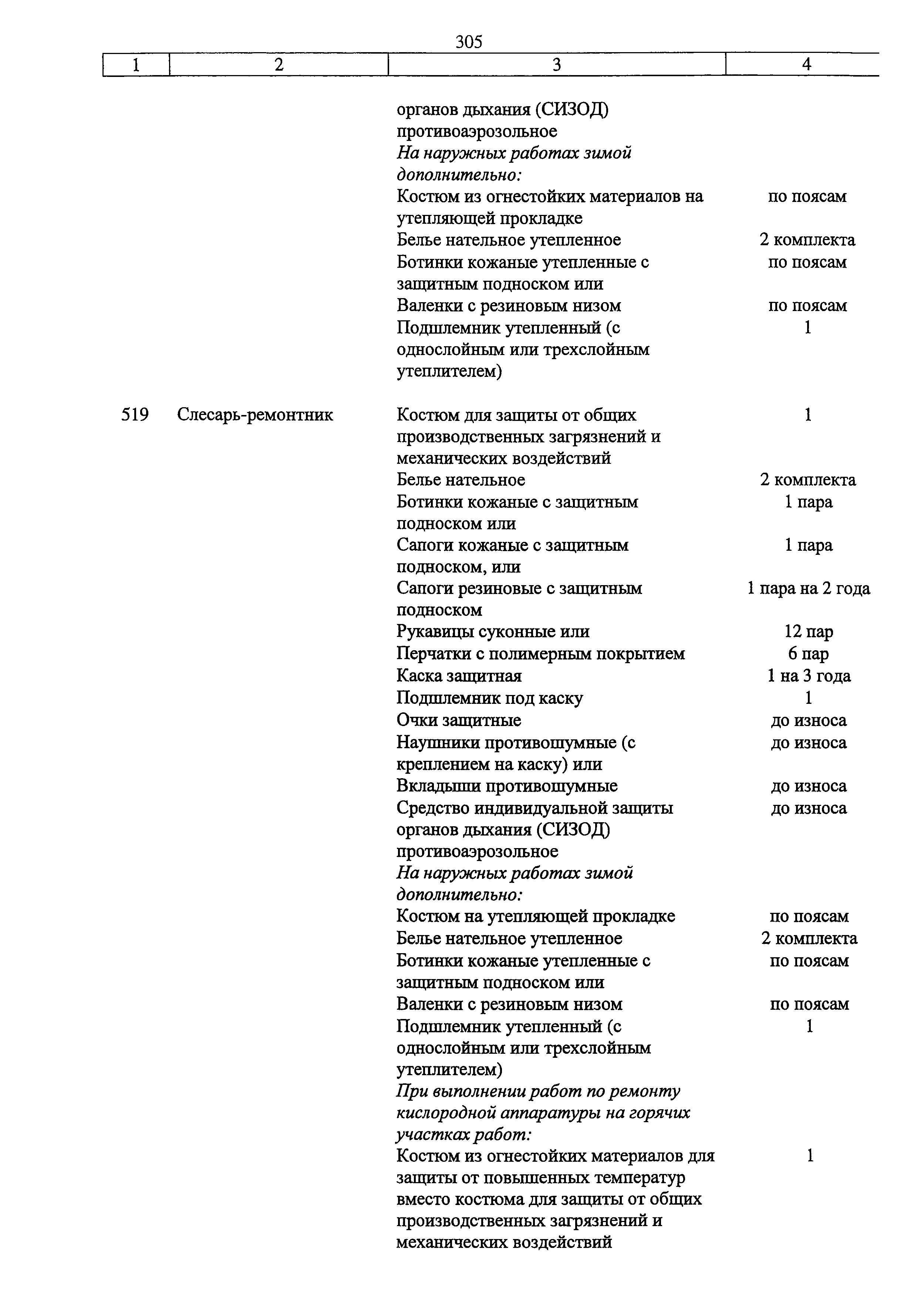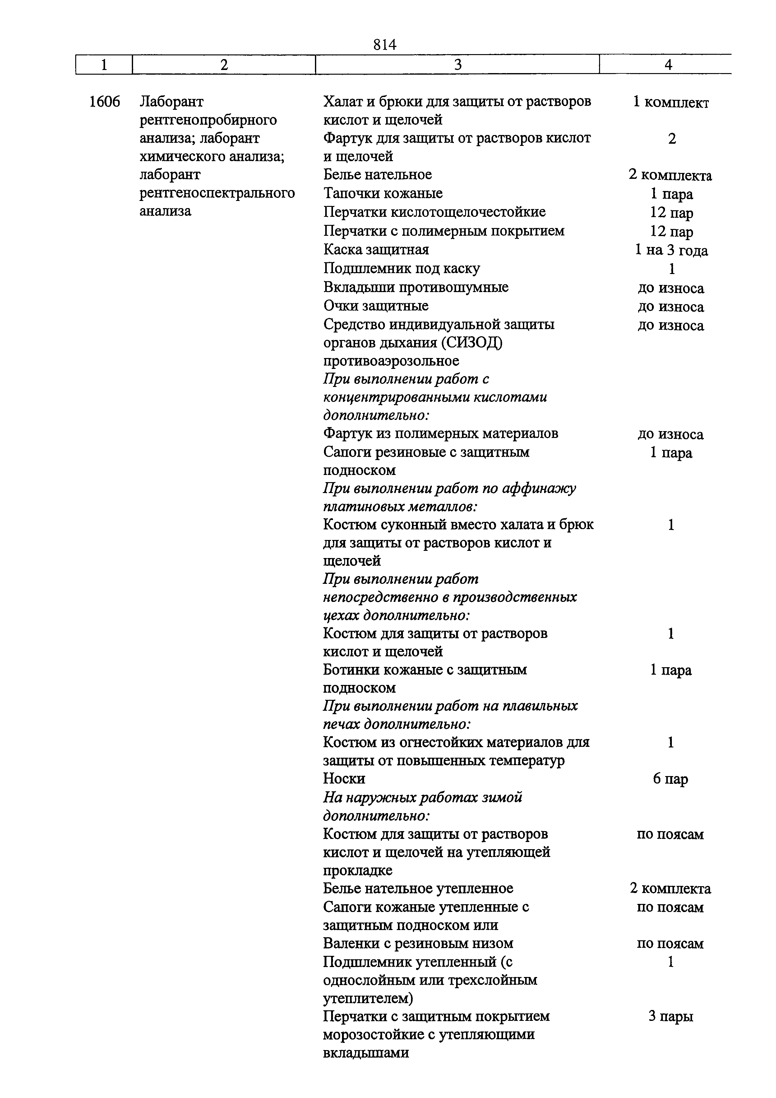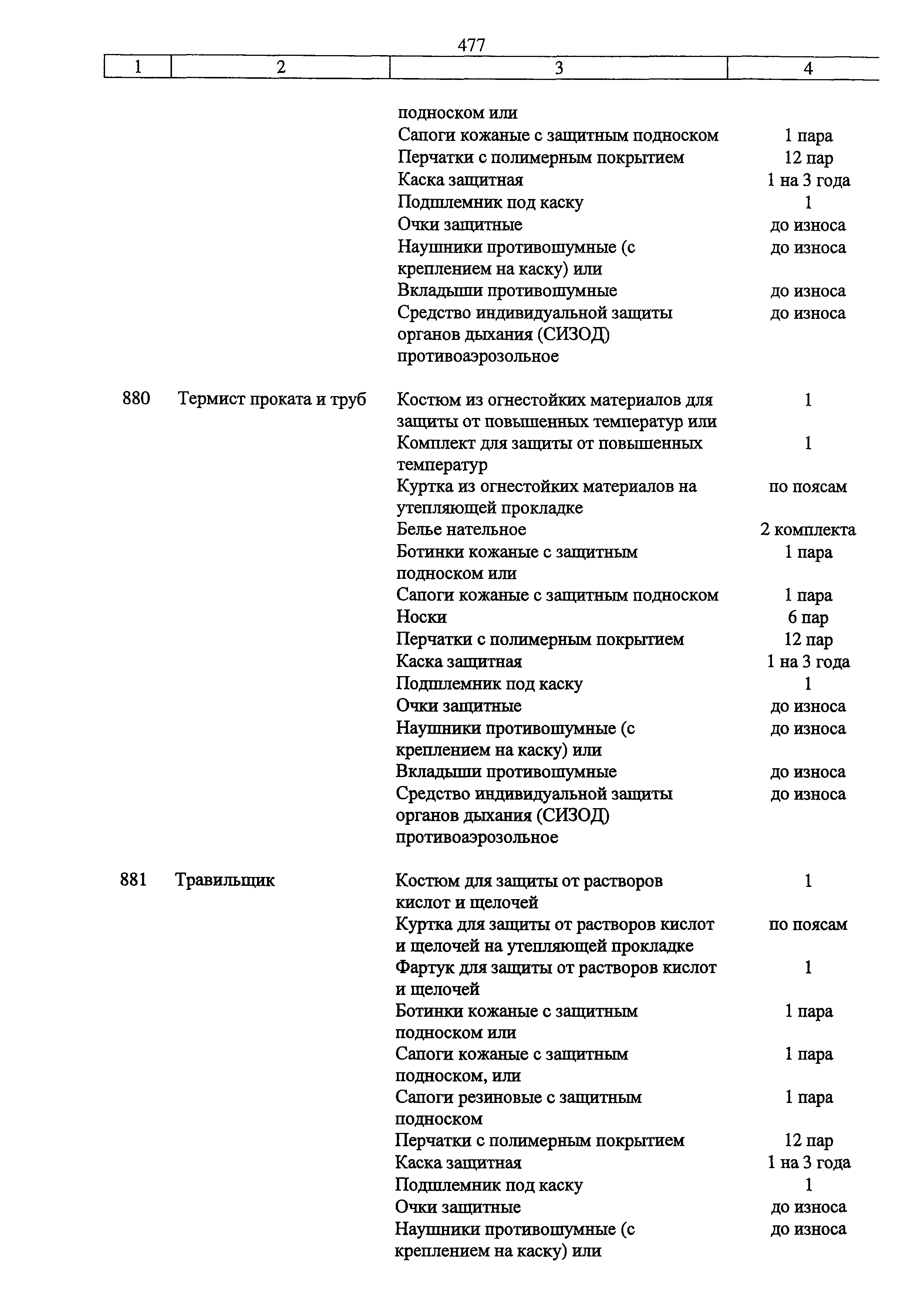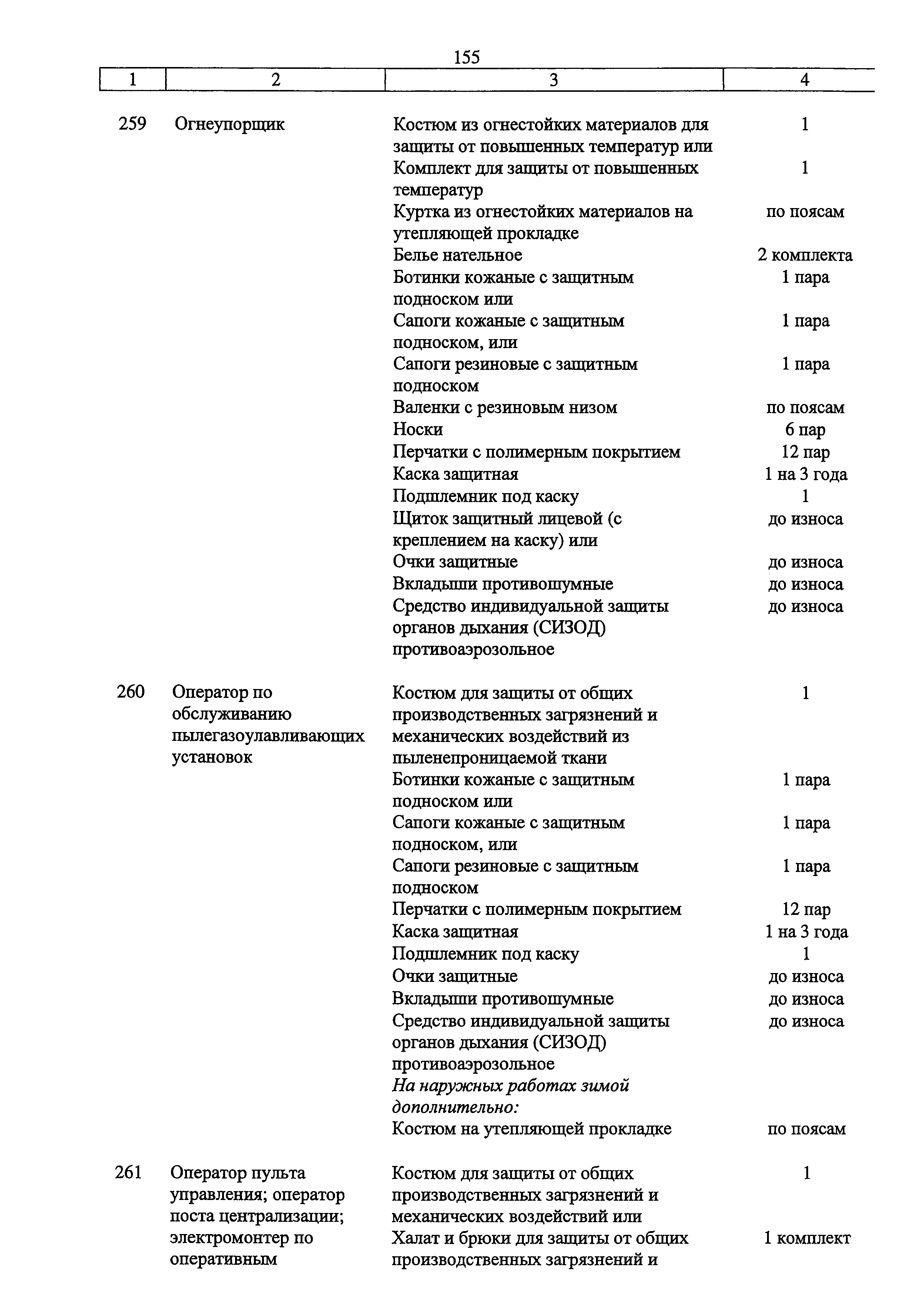 Типовые нормы бесплатной выдачи специальной одежды, специальной обуви и других средств индивидуальной защиты работникам горной и металлургической промышленности и металлургических производств других отраслей промышленности, занятым на работах с вредными и (или) опасными условиями труда, а также на работах, выполняемых в особых температурных условиях или связанных с загрязнением| Статус: | действует | | Название рус.: | Типовые нормы бесплатной выдачи специальной одежды, специальной обуви и других средств индивидуальной защиты работникам горной и металлургической промышленности и металлургических производств других отраслей промышленности, занятым на работах с вредными и (или) опасными условиями труда, а также на работах, выполняемых в особых температурных условиях или связанных с загрязнением | | Дата добавления в базу: | 01.02.2017 | | Дата актуализации: | 01.01.2021 | | Дата введения: | 14.02.2014 | | Область применения: | Нормы утверждаются локальными нормативными актами работодателя на основании результатов аттестации рабочих мест по условиям труда и могут быть включены в коллективный и (или) трудовой договор с указанием типовых норм, по сравнению с которыми улучшается обеспечение работников специальной одеждой, специальной обувью и другими средствами индивидуальной защиты. | | Оглавление: | I Горнодобывающая промышленность 1 Подземные горные работы (шахты) 2 Открытые горные работы и шахтная поверхность 3 Работа на гидравлических установках или с промывочными приборами 4 Дражные работы II Дробление, обогащение, брикетирование, обжиг, агломерация, извлечение металлов и сплавов III Черная металлургия 1 Коксохимическое производство 1.1 Углеподготовительные цеха 1.2 Углеобогатительные цеха 1.3 Производство каменноугольного кокса 1.4 Производство кристаллического нафталина, кумароновой смолы, смолоперерабатывающие цеха 1.5 Производство пиридиновых и фенольно-крезольных продуктов 1.6 Цеха улавливания химических продуктов и газовые цеха 1.7 Цеха ректификации сырого бензола 1.8 Цеха очистки коксового газа от сероводорода 1.9 Производство пекового кокса 1.10 Производство термоантрацита 2 Доменное производство 3 Сталеплавильное производство 3.1 Установки непрерывной разливки стали 4 Производство ферросплавов 4.1 Электролитическое производство 4.2 Производство электролитического хрома 4.3 Производство феррованадия 4.4 Подготовка шихты, обжиг руд и концентратов 4.5 Разливка и разделка ферросплавов 4.6 Обжиг извести 4.7 Общие профессии и должности ферросплавного производства 5 Прокатное производство 6 Производство труб (прокатка, сварка и волочение) 7 Колесопрокатное и бандажное производства 8 Валопрокатное производство 9 Производство рельсовых скреплений 10 Производство баллонов 11 Труболитейное производство 12 Производство метизов 12.1 Производство металлических канатов, сеток, пружин и пружинной ленты, щеток, цепей, колючей проволоки и других метизов 12.2 Волочение проволоки, калибровка и шлифовка металла 12.3 Изготовление волок 12.4 Холодноштамповочные и кузнечно-прессовые работы 12.5 Термическая обработка 12.6 Травление металла, защитные покрытия проволоки и извлечение железного купороса 12.7 Производство металлических электродов и порошковой проволоки 13 Производство огнеупоров 13.1 Огнеупоры 13.2 Карборундовые стержни 13.3 Высокоогнеупорные окислы 14 Ремонт 