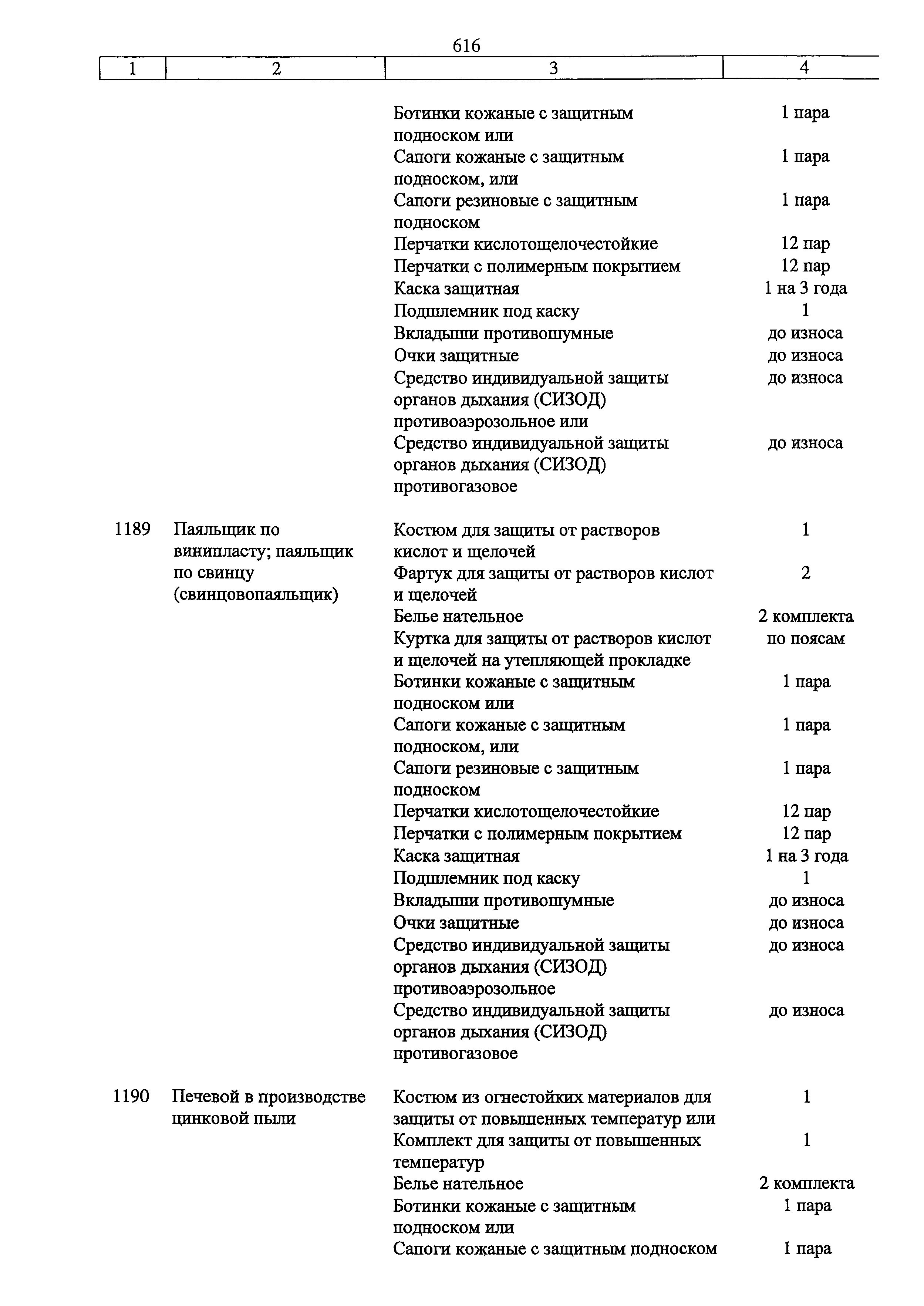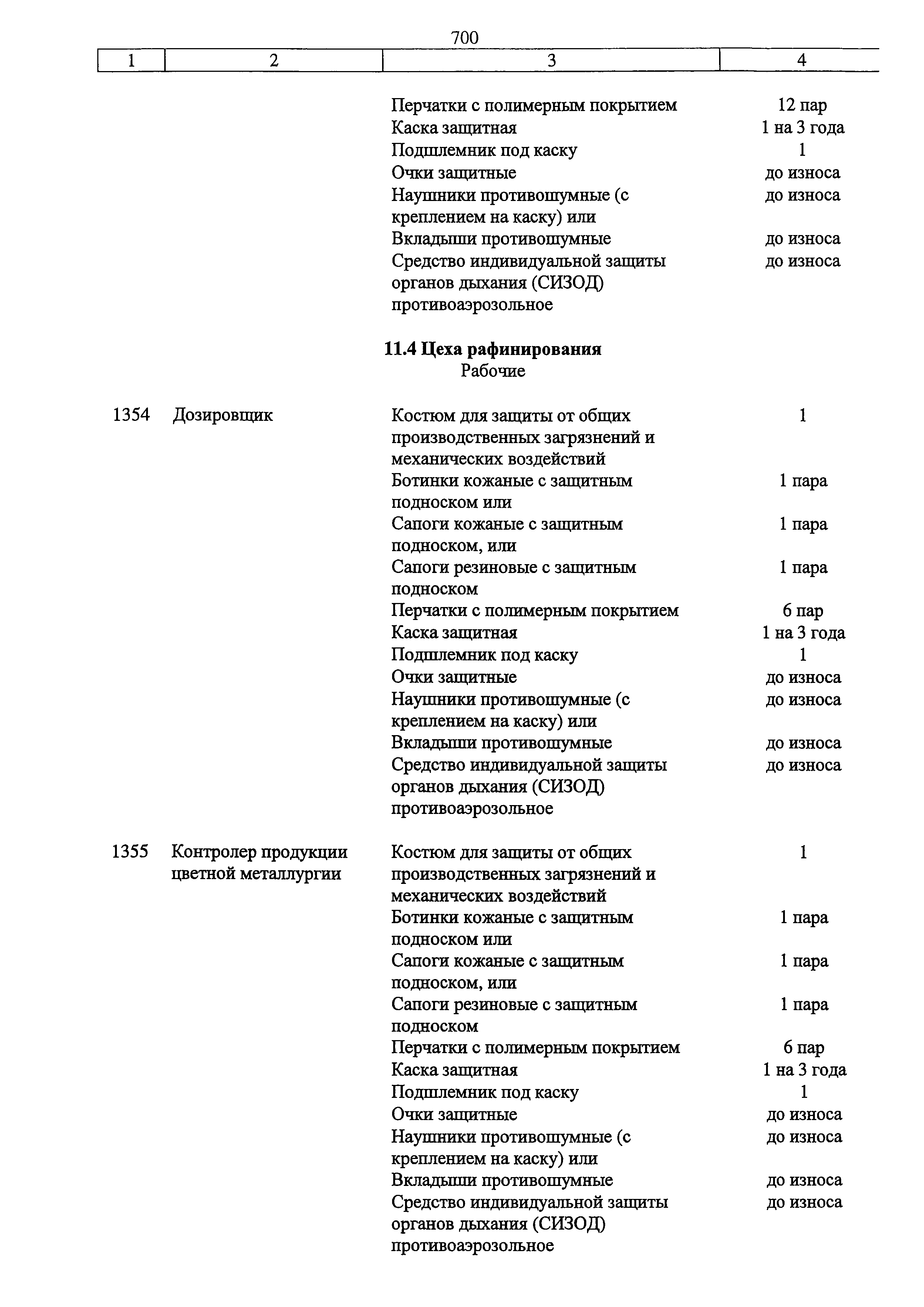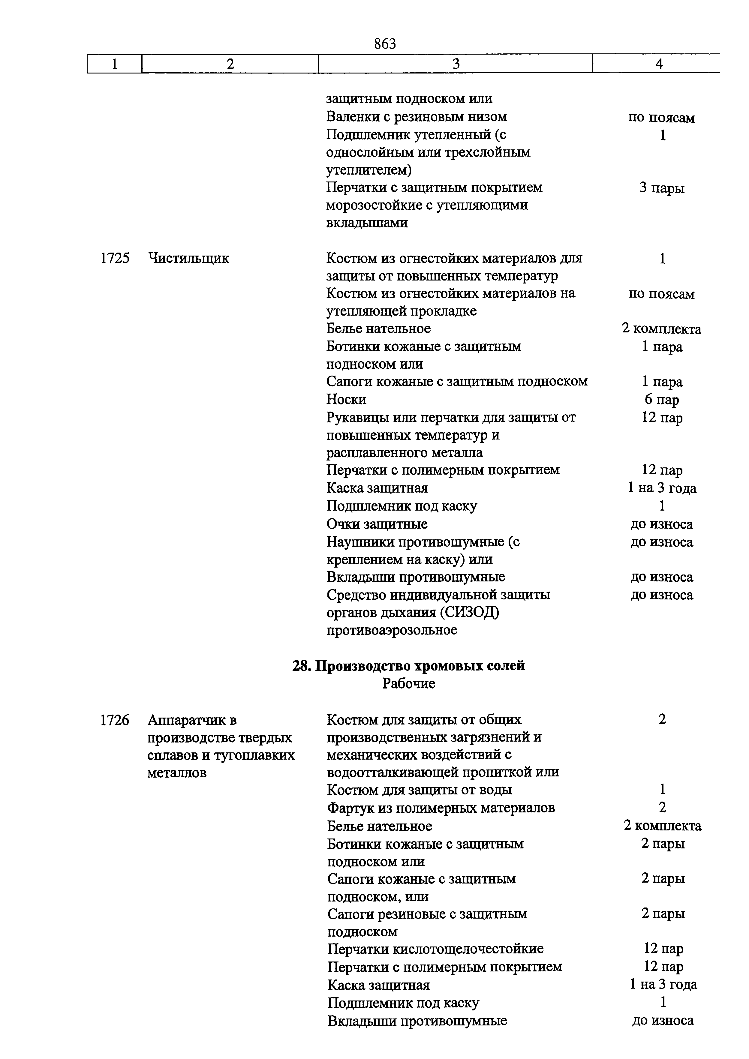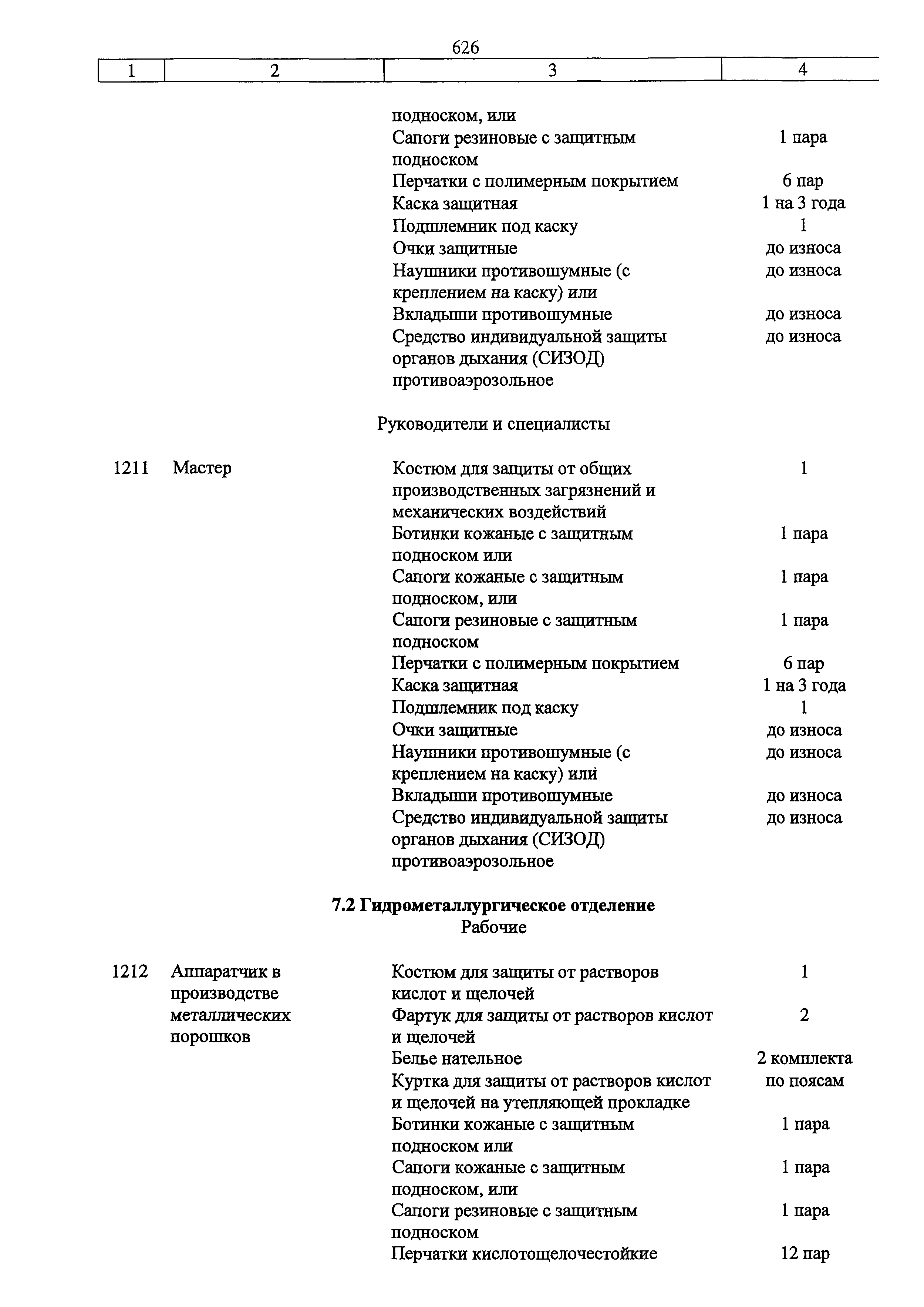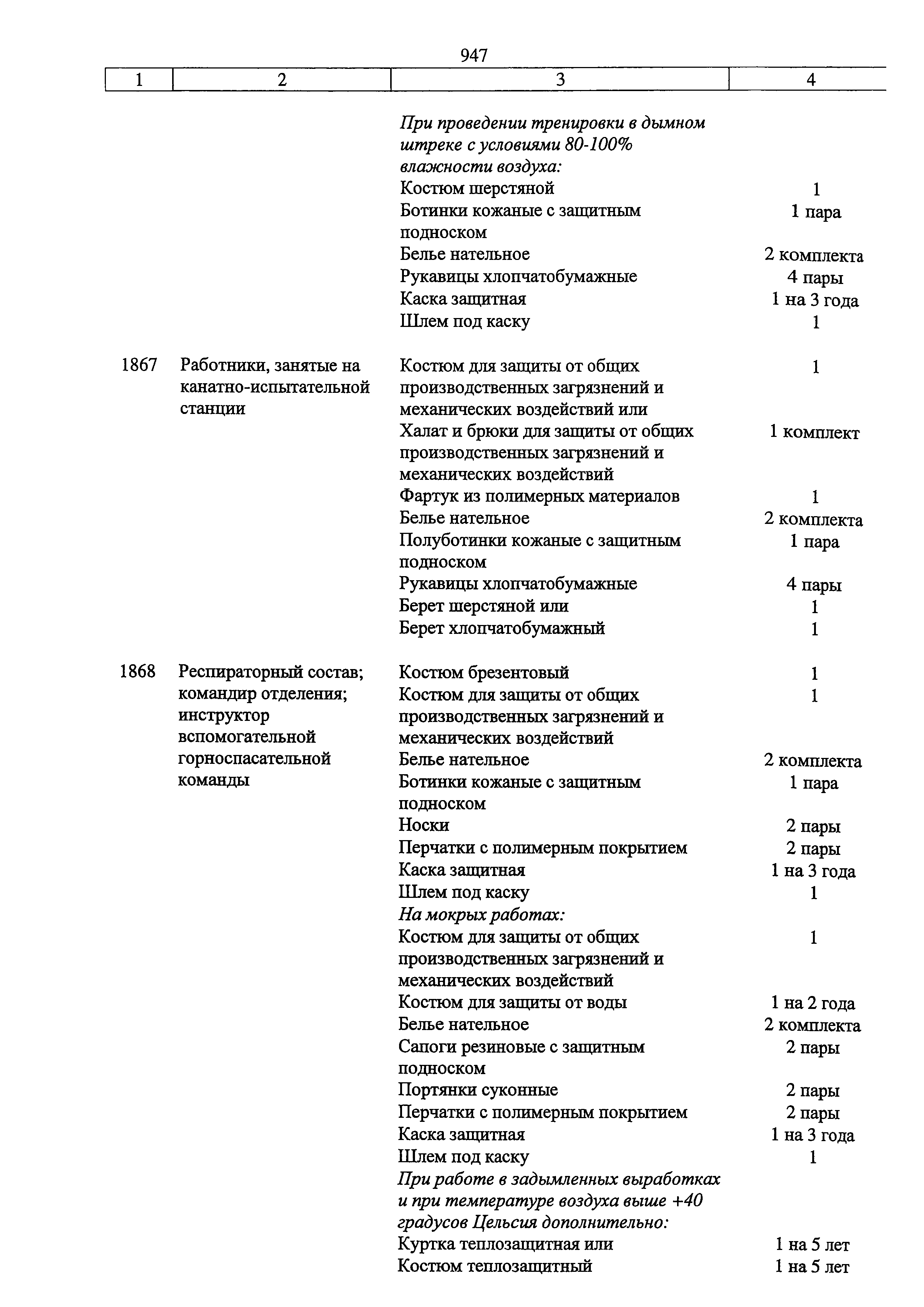 Типовые нормы бесплатной выдачи специальной одежды, специальной обуви и других средств индивидуальной защиты работникам горной и металлургической промышленности и металлургических производств других отраслей промышленности, занятым на работах с вредными и (или) опасными условиями труда, а также на работах, выполняемых в особых температурных условиях или связанных с загрязнением| Статус: | действует | | Название рус.: | Типовые нормы бесплатной выдачи специальной одежды, специальной обуви и других средств индивидуальной защиты работникам горной и металлургической промышленности и металлургических производств других отраслей промышленности, занятым на работах с вредными и (или) опасными условиями труда, а также на работах, выполняемых в особых температурных условиях или связанных с загрязнением | | Дата добавления в базу: | 01.02.2017 | | Дата актуализации: | 01.01.2021 | | Дата введения: | 14.02.2014 | | Область применения: | Нормы утверждаются локальными нормативными актами работодателя на основании результатов аттестации рабочих мест по условиям труда и могут быть включены в коллективный и (или) трудовой договор с указанием типовых норм, по сравнению с которыми улучшается обеспечение работников специальной одеждой, специальной обувью и другими средствами индивидуальной защиты. | | Оглавление: | I Горнодобывающая промышленность 1 Подземные горные работы (шахты) 2 Открытые горные работы и шахтная поверхность 3 Работа на гидравлических установках или с промывочными приборами 4 Дражные работы II Дробление, обогащение, брикетирование, обжиг, агломерация, извлечение металлов и сплавов III Черная металлургия 1 Коксохимическое производство 1.1 Углеподготовительные цеха 1.2 Углеобогатительные цеха 1.3 Производство каменноугольного кокса 1.4 Производство кристаллического нафталина, кумароновой смолы, смолоперерабатывающие цеха 1.5 Производство пиридиновых и фенольно-крезольных продуктов 1.6 Цеха улавливания химических продуктов и газовые цеха 1.7 Цеха ректификации сырого бензола 1.8 Цеха очистки коксового газа от сероводорода 1.9 Производство пекового кокса 1.10 Производство термоантрацита 2 Доменное производство 3 Сталеплавильное производство 3.1 Установки непрерывной разливки стали 4 Производство ферросплавов 4.1 Электролитическое производство 4.2 Производство электролитического хрома 4.3 Производство феррованадия 4.4 Подготовка шихты, обжиг руд и концентратов 4.5 Разливка и разделка ферросплавов 4.6 Обжиг извести 4.7 Общие профессии и должности ферросплавного производства 5 Прокатное производство 6 Производство труб (прокатка, сварка и волочение) 7 Колесопрокатное и бандажное производства 8 Валопрокатное производство 9 Производство рельсовых скреплений 10 Производство баллонов 11 Труболитейное производство 12 Производство метизов 12.1 Производство металлических канатов, сеток, пружин и пружинной ленты, щеток, цепей, колючей проволоки и других метизов 12.2 Волочение проволоки, калибровка и шлифовка металла 12.3 Изготовление волок 12.4 Холодноштамповочные и кузнечно-прессовые работы 12.5 Термическая обработка 12.6 Травление металла, защитные покрытия проволоки и извлечение железного купороса 12.7 Производство металлических электродов и порошковой проволоки 13 Производство огнеупоров 13.1 Огнеупоры 13.2 Карборундовые стержни 13.3 Высокоогнеупорные окислы 14 Ремонт 