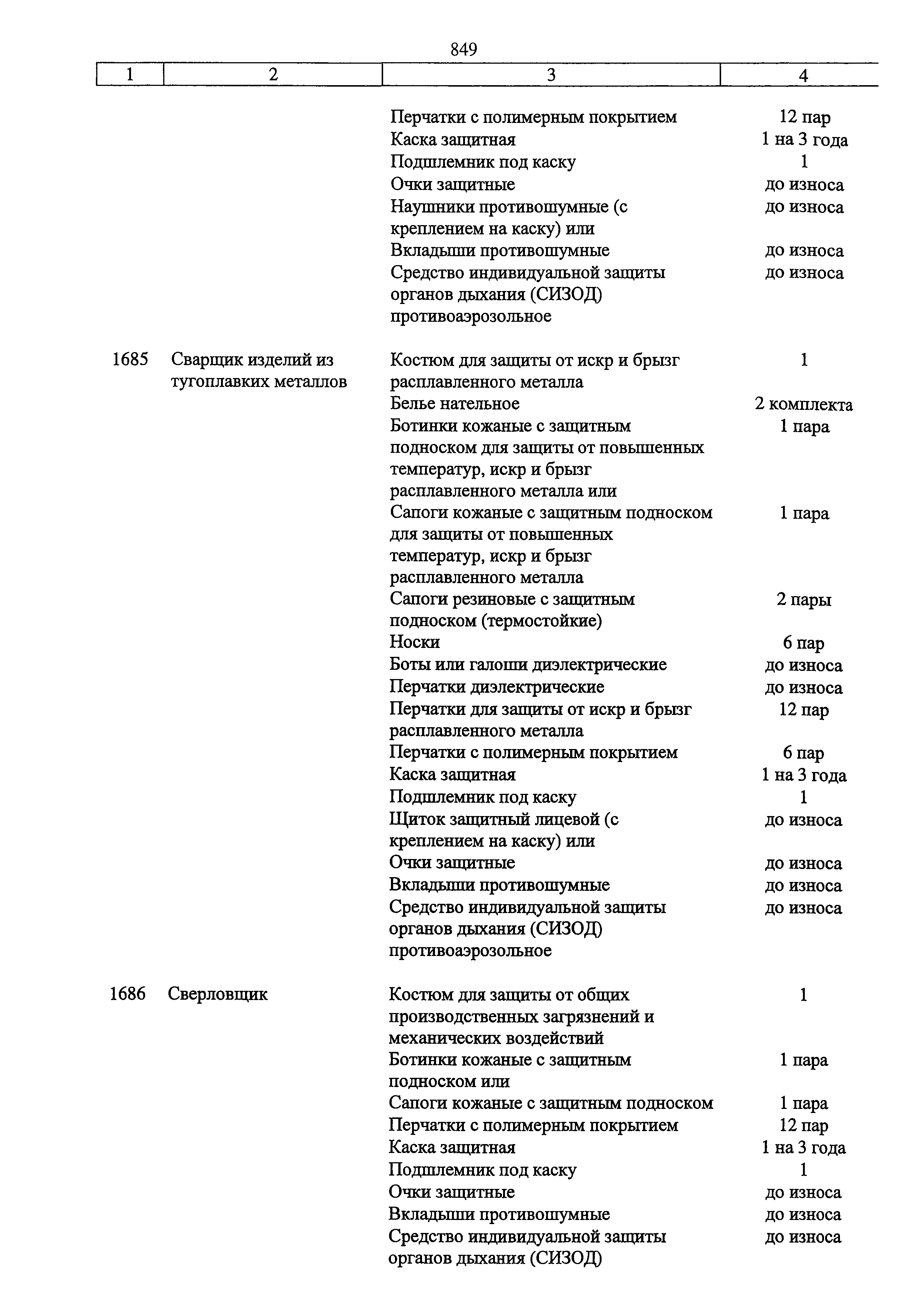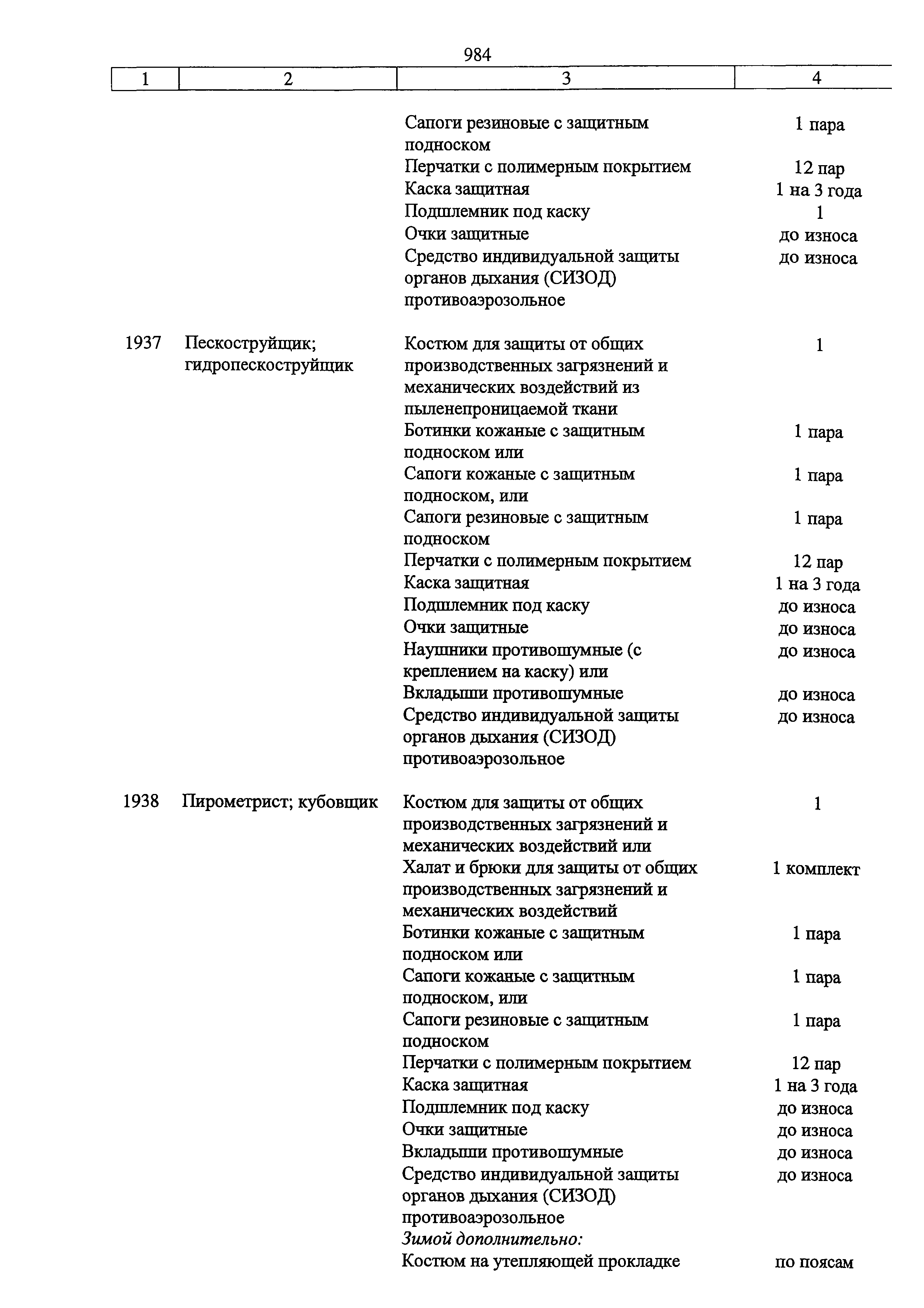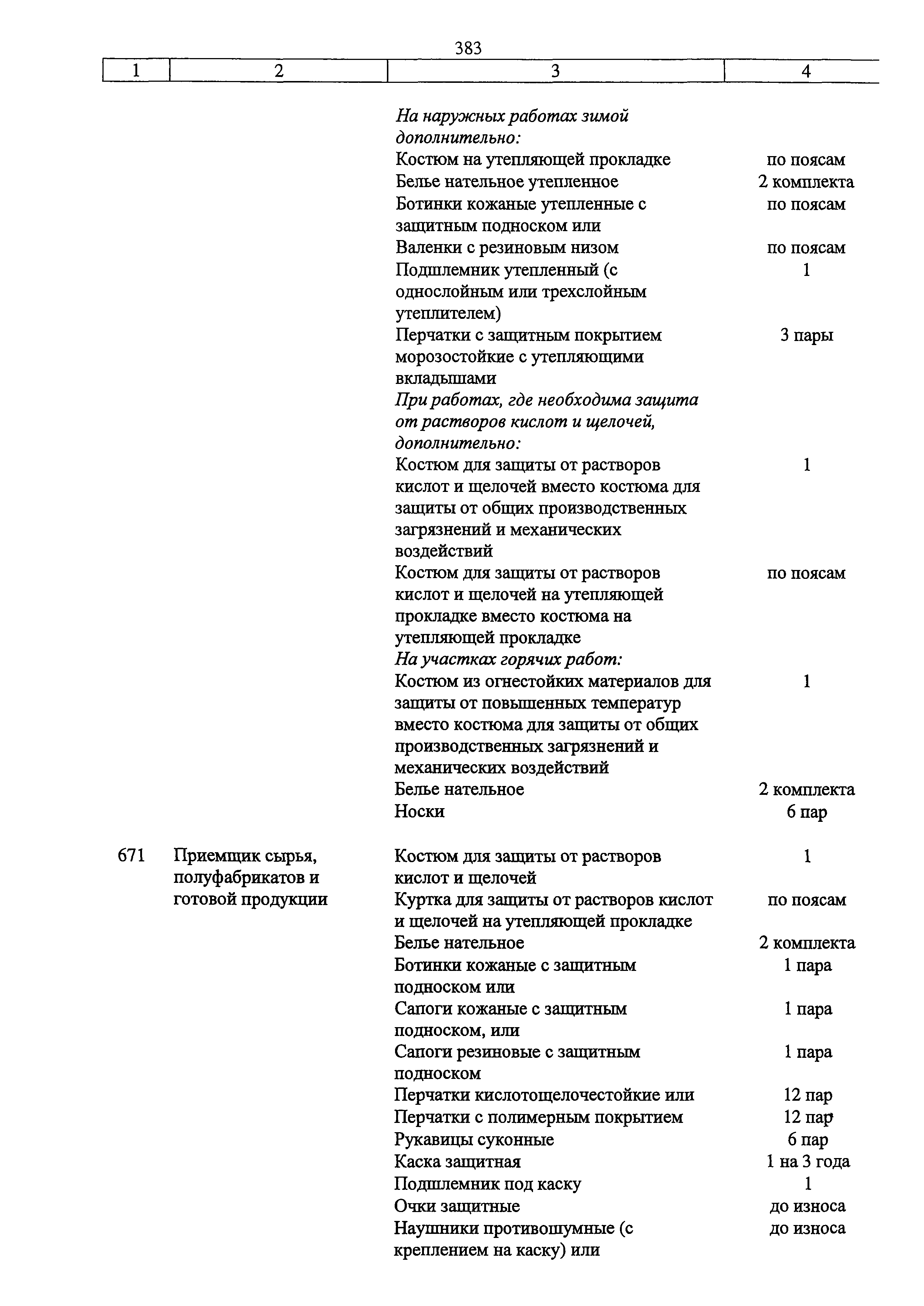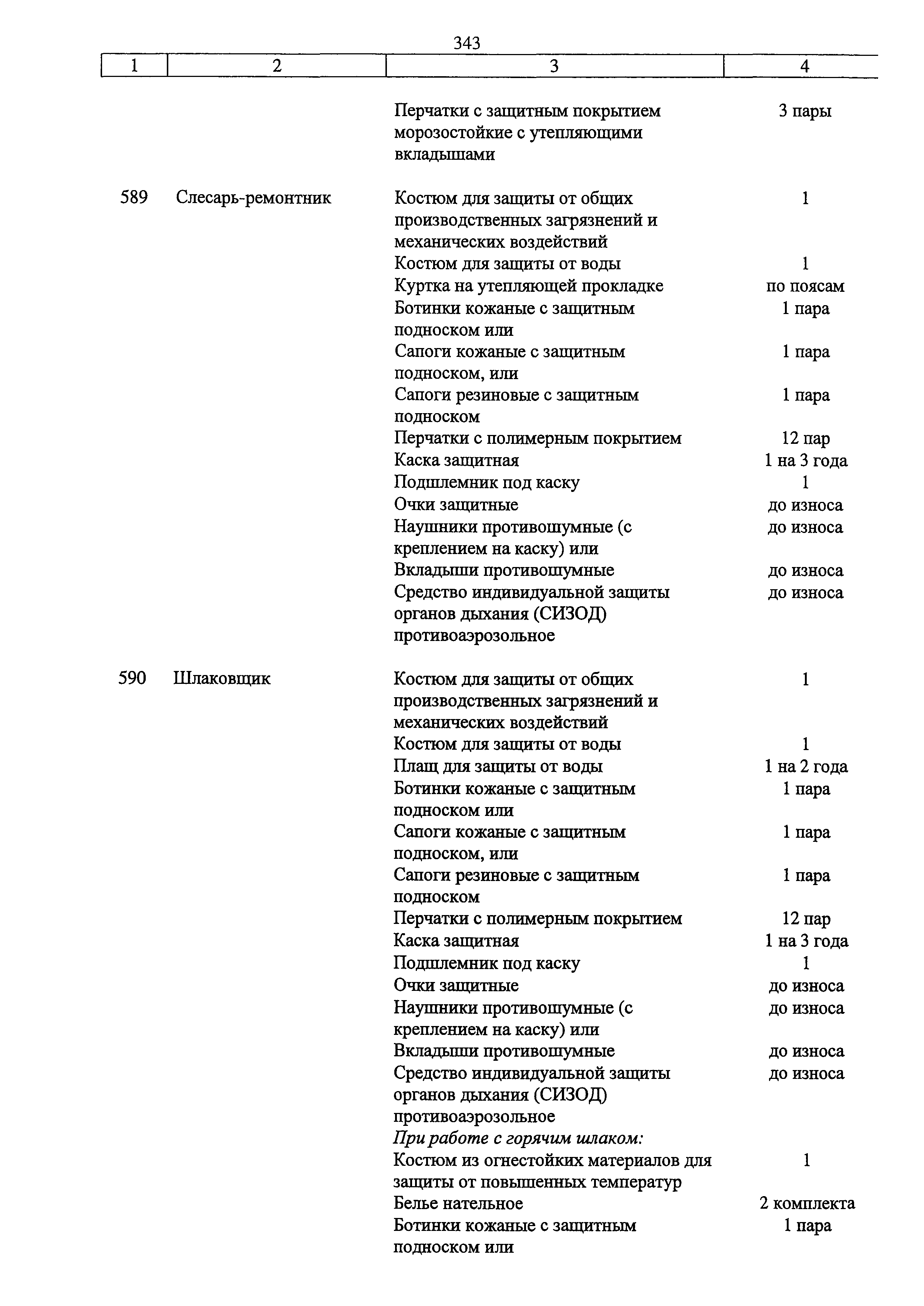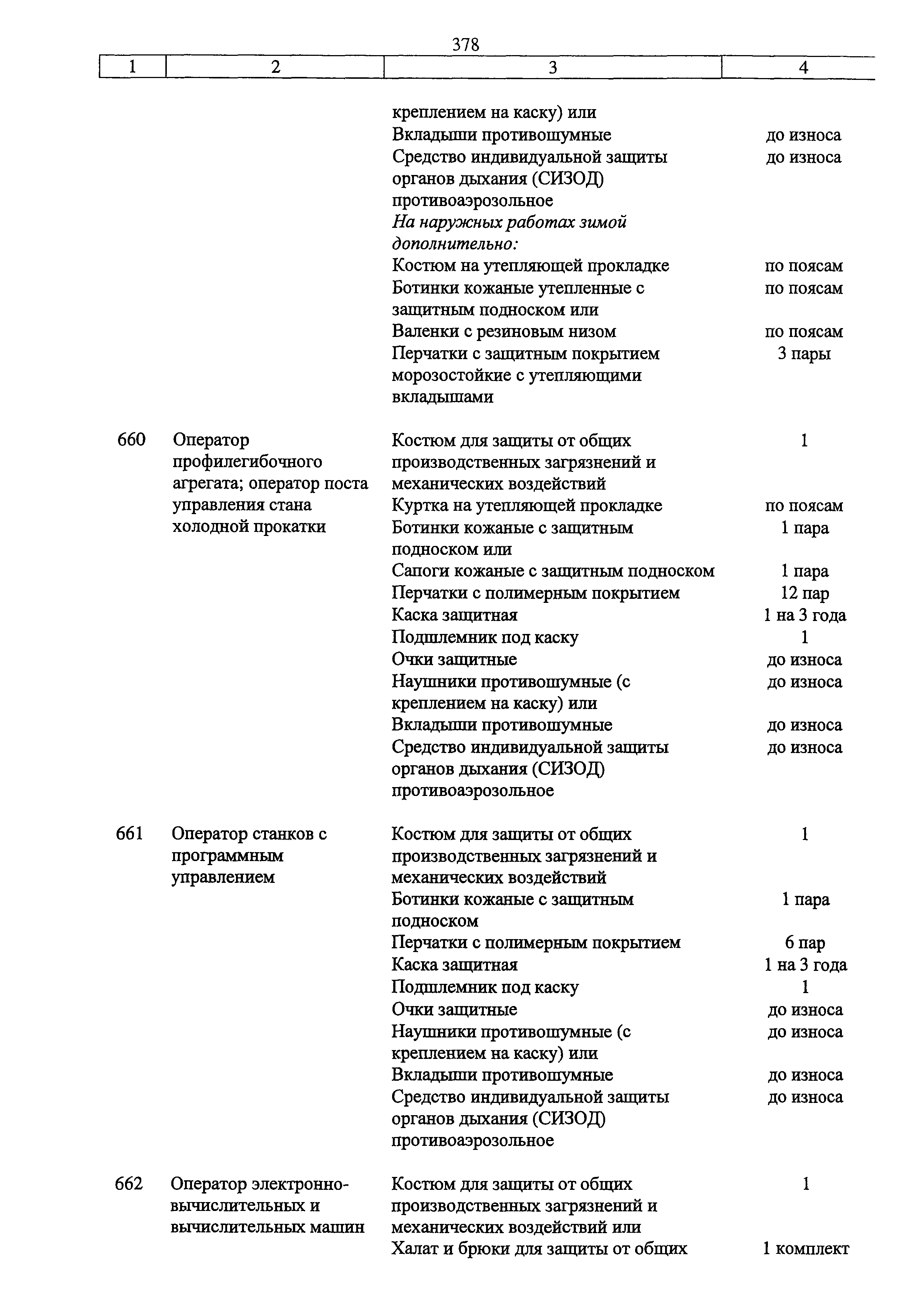 Типовые нормы бесплатной выдачи специальной одежды, специальной обуви и других средств индивидуальной защиты работникам горной и металлургической промышленности и металлургических производств других отраслей промышленности, занятым на работах с вредными и (или) опасными условиями труда, а также на работах, выполняемых в особых температурных условиях или связанных с загрязнением| Статус: | действует | | Название рус.: | Типовые нормы бесплатной выдачи специальной одежды, специальной обуви и других средств индивидуальной защиты работникам горной и металлургической промышленности и металлургических производств других отраслей промышленности, занятым на работах с вредными и (или) опасными условиями труда, а также на работах, выполняемых в особых температурных условиях или связанных с загрязнением | | Дата добавления в базу: | 01.02.2017 | | Дата актуализации: | 01.01.2021 | | Дата введения: | 14.02.2014 | | Область применения: | Нормы утверждаются локальными нормативными актами работодателя на основании результатов аттестации рабочих мест по условиям труда и могут быть включены в коллективный и (или) трудовой договор с указанием типовых норм, по сравнению с которыми улучшается обеспечение работников специальной одеждой, специальной обувью и другими средствами индивидуальной защиты. | | Оглавление: | I Горнодобывающая промышленность 1 Подземные горные работы (шахты) 2 Открытые горные работы и шахтная поверхность 3 Работа на гидравлических установках или с промывочными приборами 4 Дражные работы II Дробление, обогащение, брикетирование, обжиг, агломерация, извлечение металлов и сплавов III Черная металлургия 1 Коксохимическое производство 1.1 Углеподготовительные цеха 1.2 Углеобогатительные цеха 1.3 Производство каменноугольного кокса 1.4 Производство кристаллического нафталина, кумароновой смолы, смолоперерабатывающие цеха 1.5 Производство пиридиновых и фенольно-крезольных продуктов 1.6 Цеха улавливания химических продуктов и газовые цеха 1.7 Цеха ректификации сырого бензола 1.8 Цеха очистки коксового газа от сероводорода 1.9 Производство пекового кокса 1.10 Производство термоантрацита 2 Доменное производство 3 Сталеплавильное производство 3.1 Установки непрерывной разливки стали 4 Производство ферросплавов 4.1 Электролитическое производство 4.2 Производство электролитического хрома 4.3 Производство феррованадия 4.4 Подготовка шихты, обжиг руд и концентратов 4.5 Разливка и разделка ферросплавов 4.6 Обжиг извести 4.7 Общие профессии и должности ферросплавного производства 5 Прокатное производство 6 Производство труб (прокатка, сварка и волочение) 7 Колесопрокатное и бандажное производства 8 Валопрокатное производство 9 Производство рельсовых скреплений 10 Производство баллонов 11 Труболитейное производство 12 Производство метизов 12.1 Производство металлических канатов, сеток, пружин и пружинной ленты, щеток, цепей, колючей проволоки и других метизов 12.2 Волочение проволоки, калибровка и шлифовка металла 12.3 Изготовление волок 12.4 Холодноштамповочные и кузнечно-прессовые работы 12.5 Термическая обработка 12.6 Травление металла, защитные покрытия проволоки и извлечение железного купороса 12.7 Производство металлических электродов и порошковой проволоки 13 Производство огнеупоров 13.1 Огнеупоры 13.2 Карборундовые стержни 13.3 Высокоогнеупорные окислы 14 Ремонт 