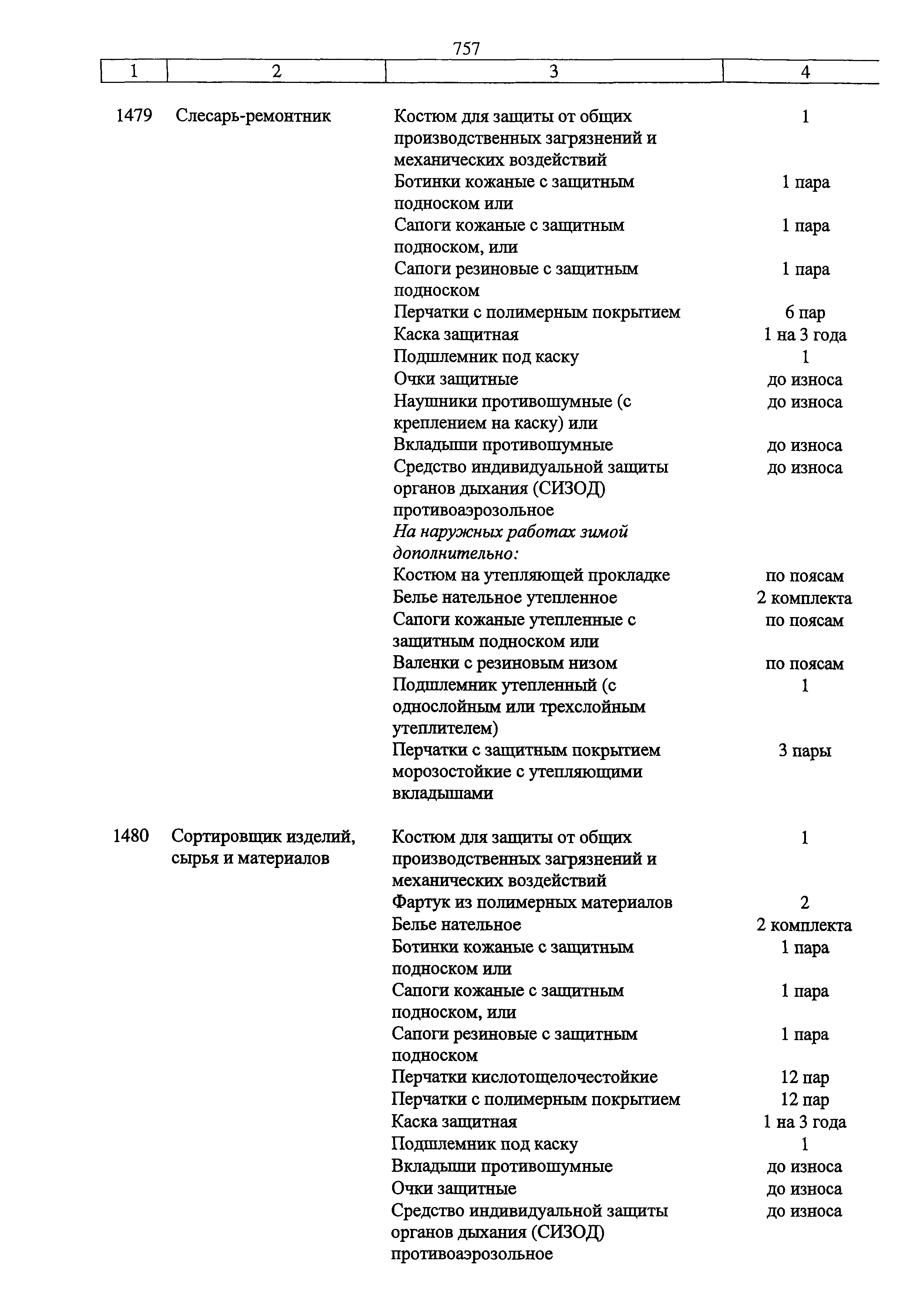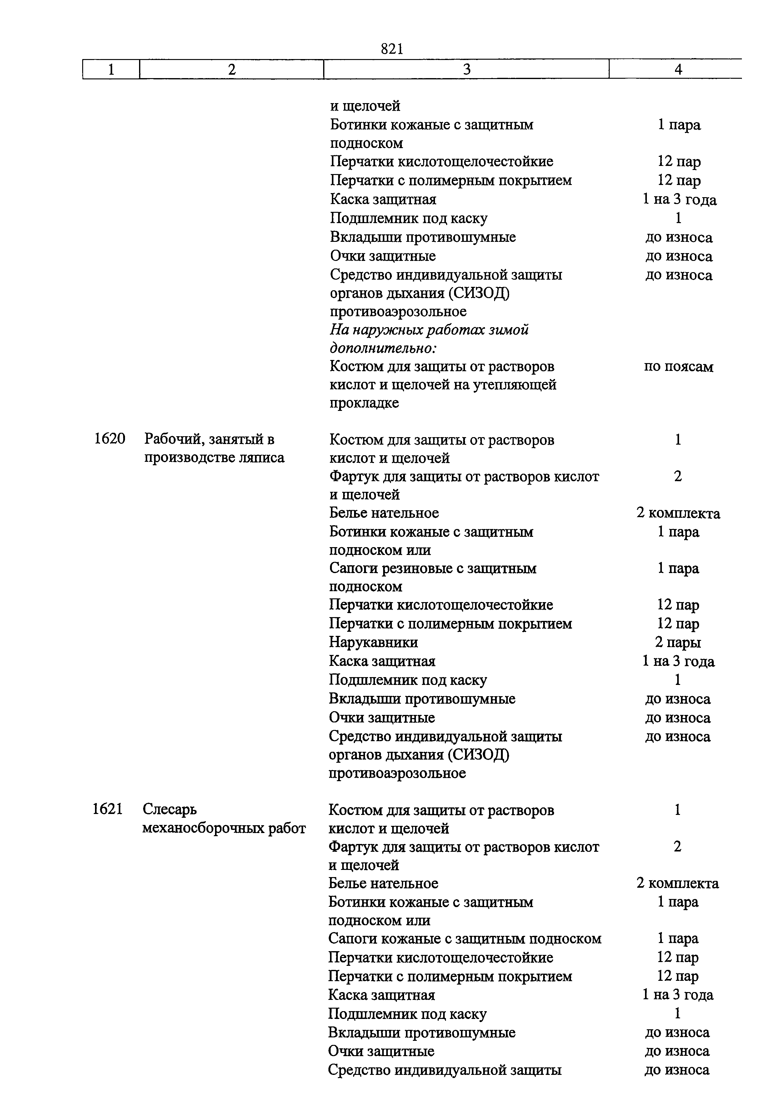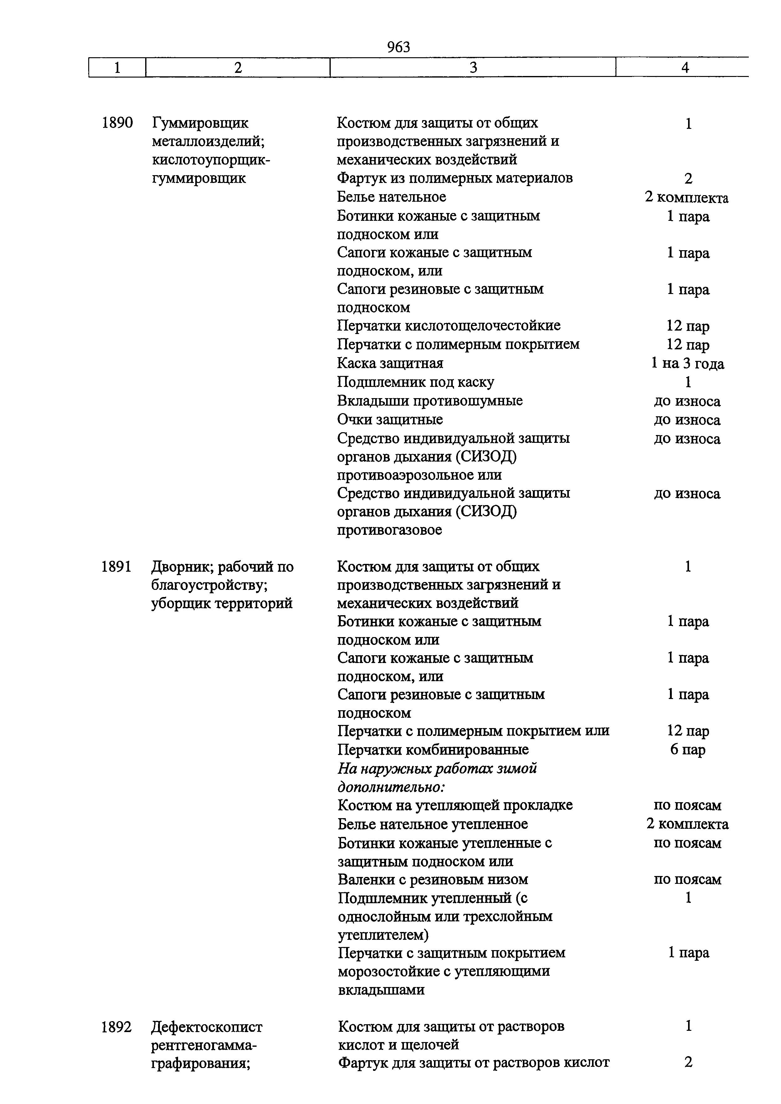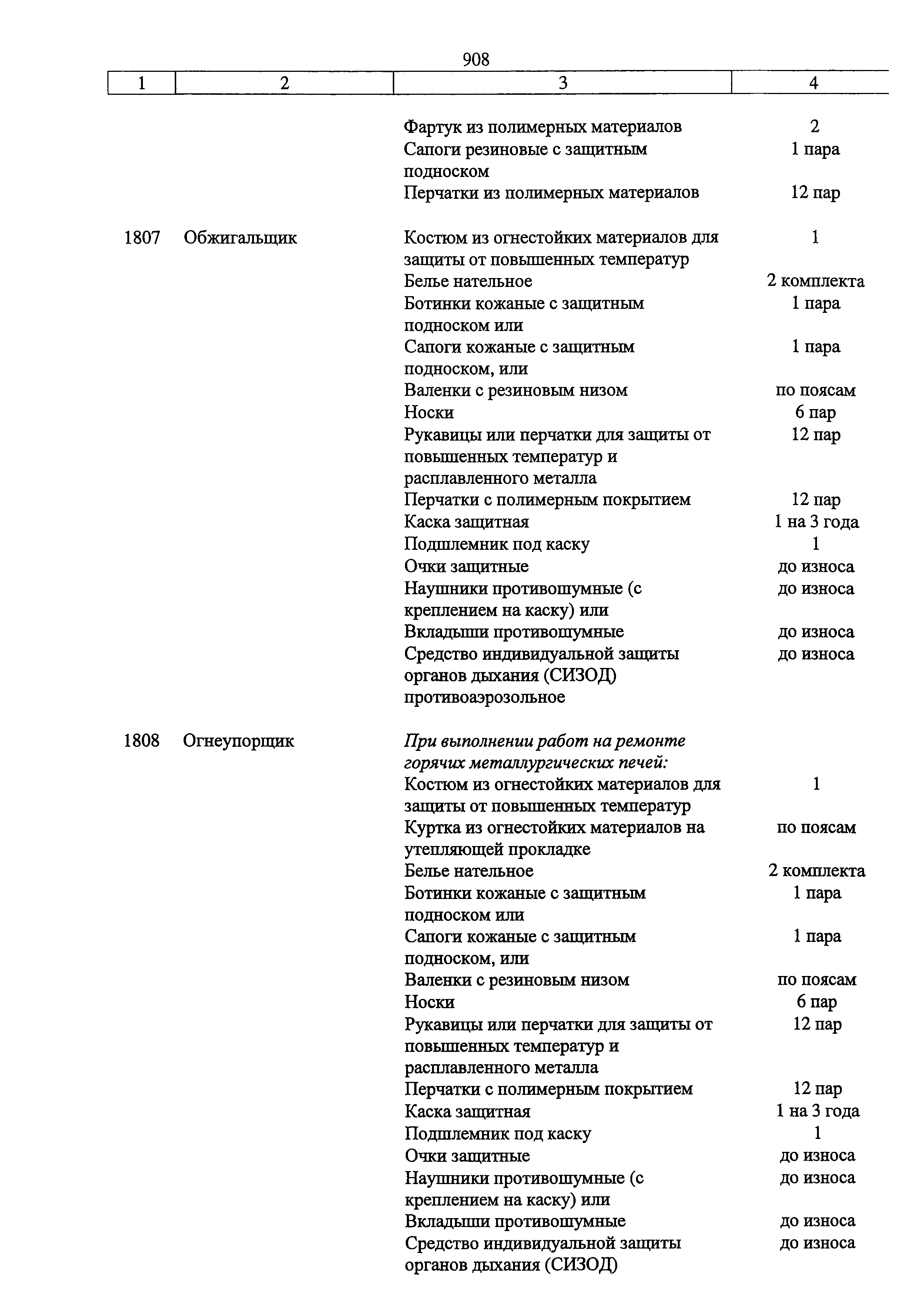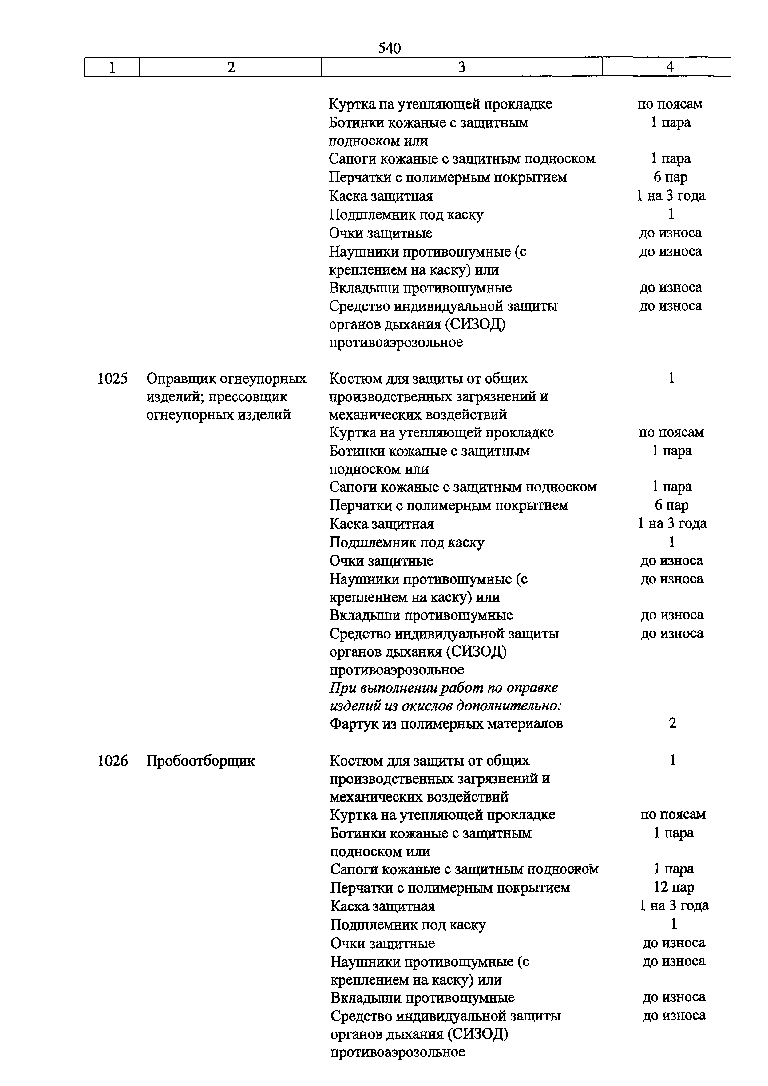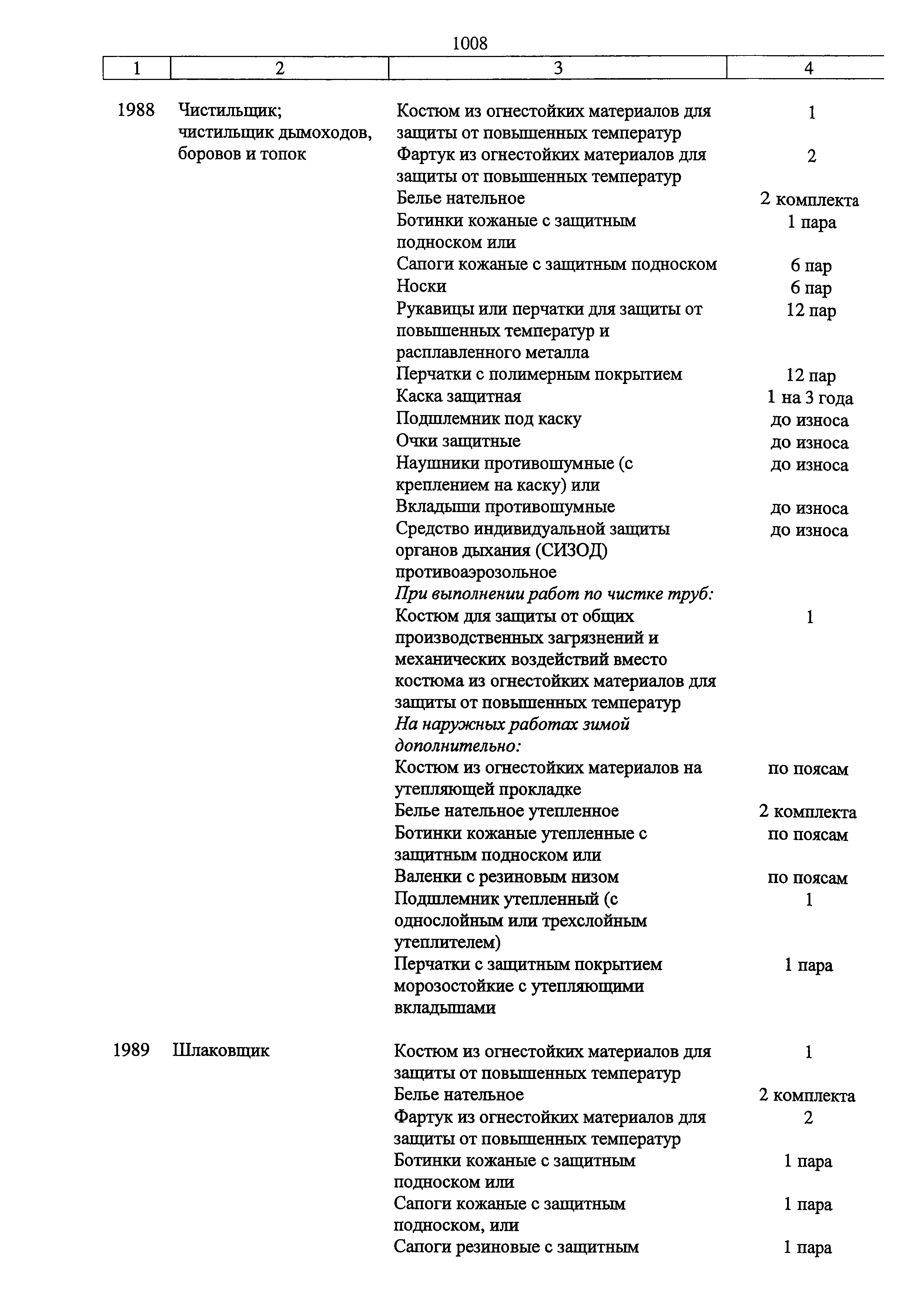 Типовые нормы бесплатной выдачи специальной одежды, специальной обуви и других средств индивидуальной защиты работникам горной и металлургической промышленности и металлургических производств других отраслей промышленности, занятым на работах с вредными и (или) опасными условиями труда, а также на работах, выполняемых в особых температурных условиях или связанных с загрязнением| Статус: | действует | | Название рус.: | Типовые нормы бесплатной выдачи специальной одежды, специальной обуви и других средств индивидуальной защиты работникам горной и металлургической промышленности и металлургических производств других отраслей промышленности, занятым на работах с вредными и (или) опасными условиями труда, а также на работах, выполняемых в особых температурных условиях или связанных с загрязнением | | Дата добавления в базу: | 01.02.2017 | | Дата актуализации: | 01.01.2021 | | Дата введения: | 14.02.2014 | | Область применения: | Нормы утверждаются локальными нормативными актами работодателя на основании результатов аттестации рабочих мест по условиям труда и могут быть включены в коллективный и (или) трудовой договор с указанием типовых норм, по сравнению с которыми улучшается обеспечение работников специальной одеждой, специальной обувью и другими средствами индивидуальной защиты. | | Оглавление: | I Горнодобывающая промышленность 1 Подземные горные работы (шахты) 2 Открытые горные работы и шахтная поверхность 3 Работа на гидравлических установках или с промывочными приборами 4 Дражные работы II Дробление, обогащение, брикетирование, обжиг, агломерация, извлечение металлов и сплавов III Черная металлургия 1 Коксохимическое производство 1.1 Углеподготовительные цеха 1.2 Углеобогатительные цеха 1.3 Производство каменноугольного кокса 1.4 Производство кристаллического нафталина, кумароновой смолы, смолоперерабатывающие цеха 1.5 Производство пиридиновых и фенольно-крезольных продуктов 1.6 Цеха улавливания химических продуктов и газовые цеха 1.7 Цеха ректификации сырого бензола 1.8 Цеха очистки коксового газа от сероводорода 1.9 Производство пекового кокса 1.10 Производство термоантрацита 2 Доменное производство 3 Сталеплавильное производство 3.1 Установки непрерывной разливки стали 4 Производство ферросплавов 4.1 Электролитическое производство 4.2 Производство электролитического хрома 4.3 Производство феррованадия 4.4 Подготовка шихты, обжиг руд и концентратов 4.5 Разливка и разделка ферросплавов 4.6 Обжиг извести 4.7 Общие профессии и должности ферросплавного производства 5 Прокатное производство 6 Производство труб (прокатка, сварка и волочение) 7 Колесопрокатное и бандажное производства 8 Валопрокатное производство 9 Производство рельсовых скреплений 10 Производство баллонов 11 Труболитейное производство 12 Производство метизов 12.1 Производство металлических канатов, сеток, пружин и пружинной ленты, щеток, цепей, колючей проволоки и других метизов 12.2 Волочение проволоки, калибровка и шлифовка металла 12.3 Изготовление волок 12.4 Холодноштамповочные и кузнечно-прессовые работы 12.5 Термическая обработка 12.6 Травление металла, защитные покрытия проволоки и извлечение железного купороса 12.7 Производство металлических электродов и порошковой проволоки 13 Производство огнеупоров 13.1 Огнеупоры 13.2 Карборундовые стержни 13.3 Высокоогнеупорные окислы 14 Ремонт 