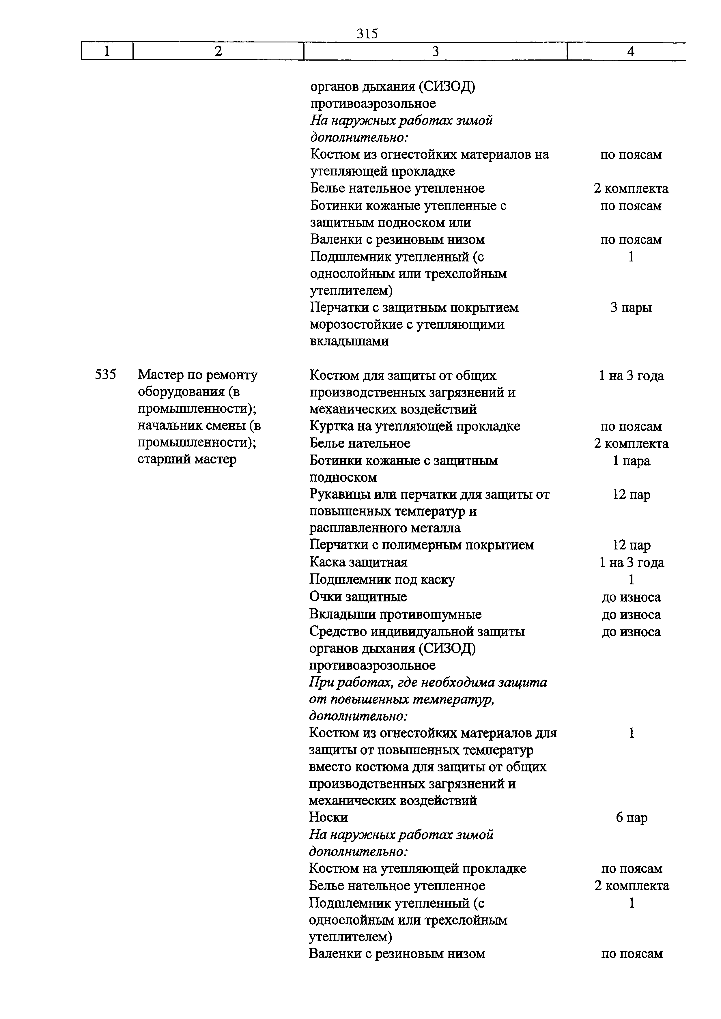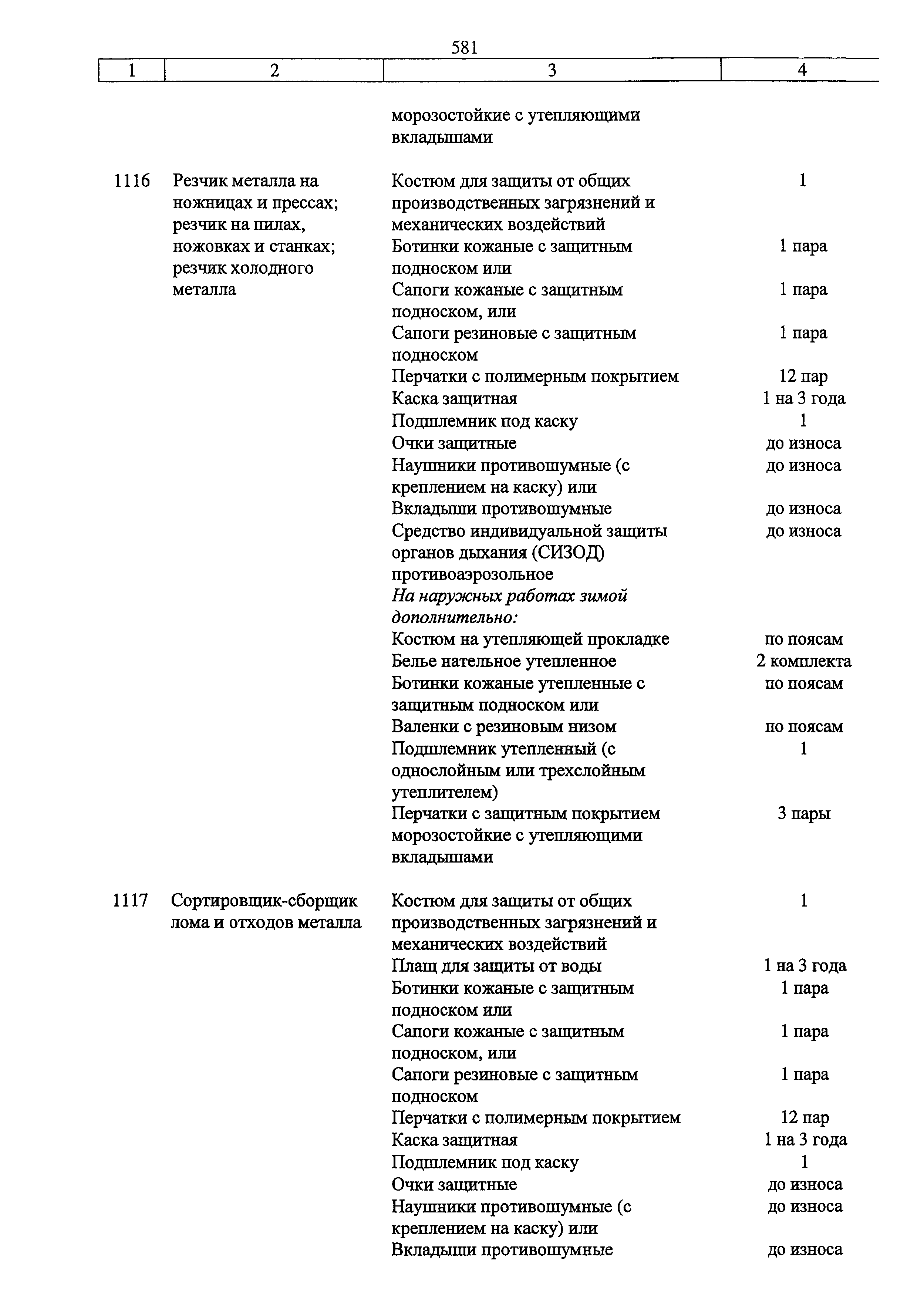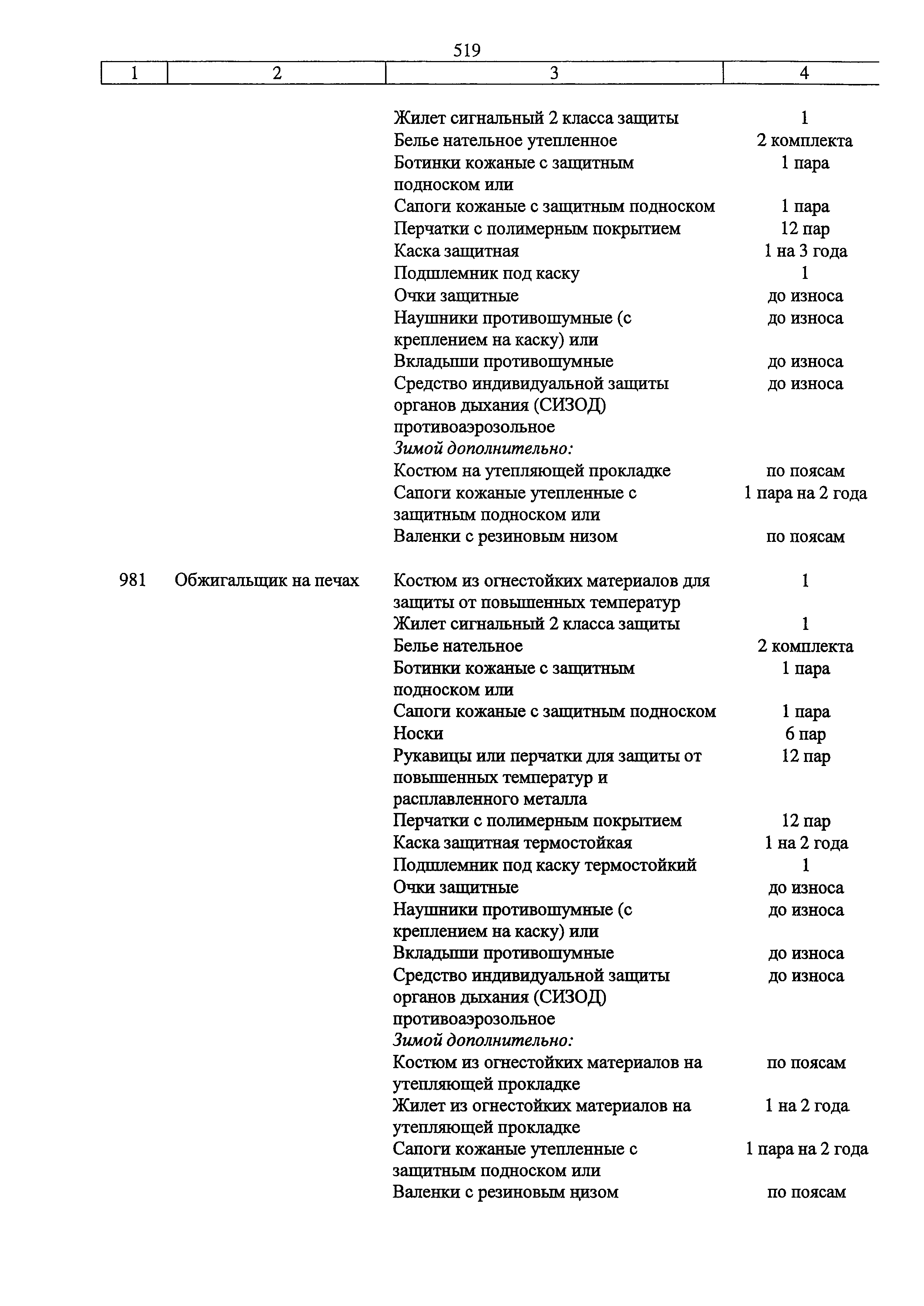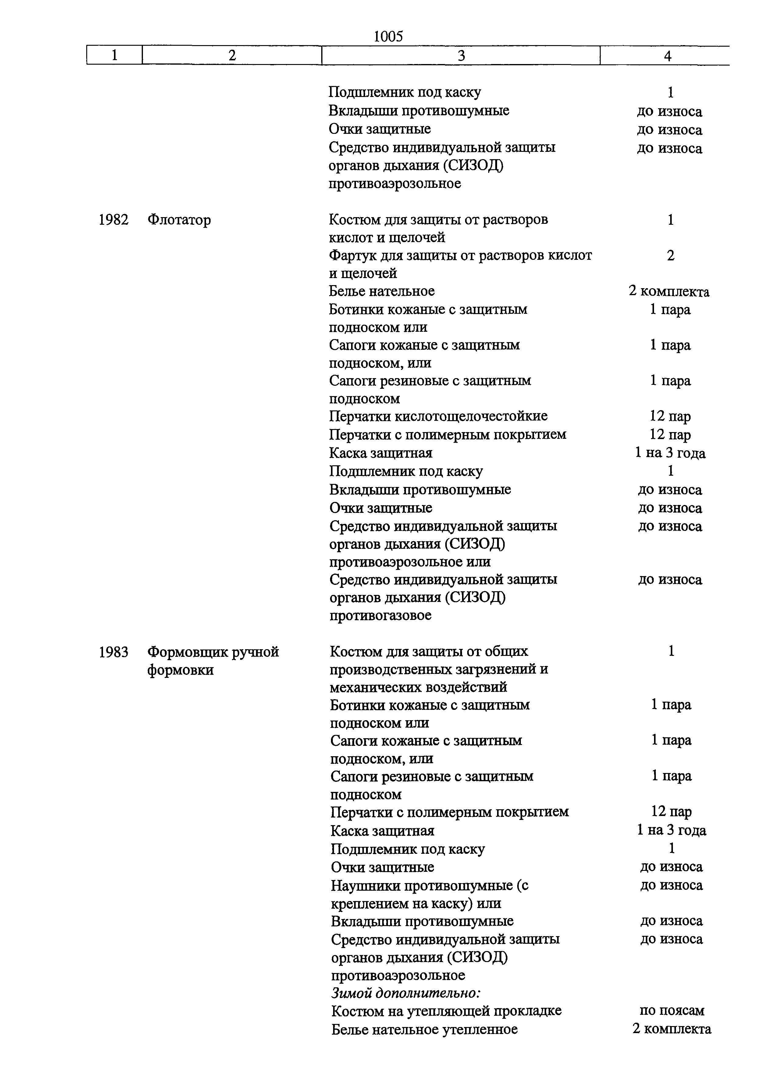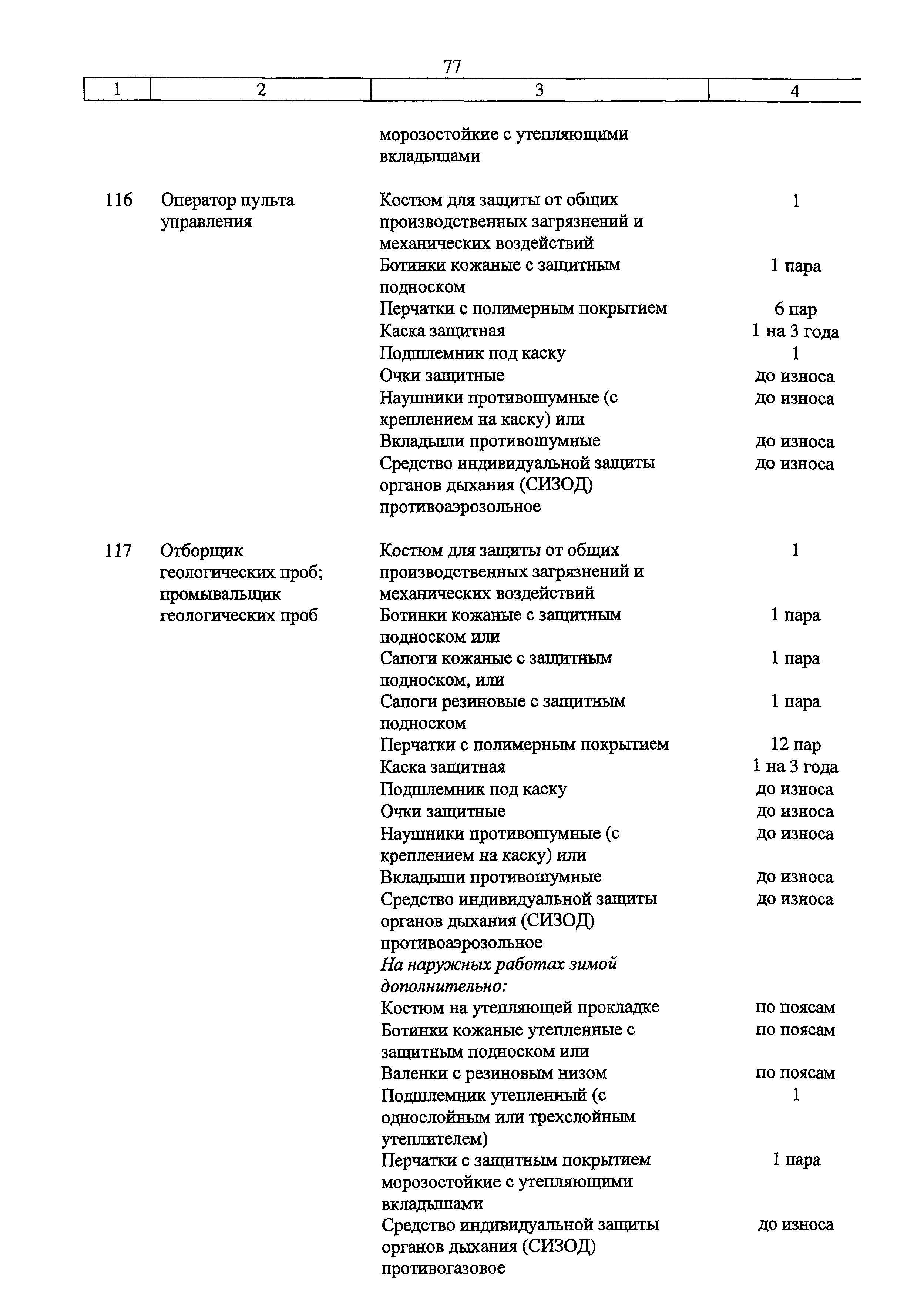 Типовые нормы бесплатной выдачи специальной одежды, специальной обуви и других средств индивидуальной защиты работникам горной и металлургической промышленности и металлургических производств других отраслей промышленности, занятым на работах с вредными и (или) опасными условиями труда, а также на работах, выполняемых в особых температурных условиях или связанных с загрязнением| Статус: | действует | | Название рус.: | Типовые нормы бесплатной выдачи специальной одежды, специальной обуви и других средств индивидуальной защиты работникам горной и металлургической промышленности и металлургических производств других отраслей промышленности, занятым на работах с вредными и (или) опасными условиями труда, а также на работах, выполняемых в особых температурных условиях или связанных с загрязнением | | Дата добавления в базу: | 01.02.2017 | | Дата актуализации: | 01.01.2021 | | Дата введения: | 14.02.2014 | | Область применения: | Нормы утверждаются локальными нормативными актами работодателя на основании результатов аттестации рабочих мест по условиям труда и могут быть включены в коллективный и (или) трудовой договор с указанием типовых норм, по сравнению с которыми улучшается обеспечение работников специальной одеждой, специальной обувью и другими средствами индивидуальной защиты. | | Оглавление: | I Горнодобывающая промышленность 1 Подземные горные работы (шахты) 2 Открытые горные работы и шахтная поверхность 3 Работа на гидравлических установках или с промывочными приборами 4 Дражные работы II Дробление, обогащение, брикетирование, обжиг, агломерация, извлечение металлов и сплавов III Черная металлургия 1 Коксохимическое производство 1.1 Углеподготовительные цеха 1.2 Углеобогатительные цеха 1.3 Производство каменноугольного кокса 1.4 Производство кристаллического нафталина, кумароновой смолы, смолоперерабатывающие цеха 1.5 Производство пиридиновых и фенольно-крезольных продуктов 1.6 Цеха улавливания химических продуктов и газовые цеха 1.7 Цеха ректификации сырого бензола 1.8 Цеха очистки коксового газа от сероводорода 1.9 Производство пекового кокса 1.10 Производство термоантрацита 2 Доменное производство 3 Сталеплавильное производство 3.1 Установки непрерывной разливки стали 4 Производство ферросплавов 4.1 Электролитическое производство 4.2 Производство электролитического хрома 4.3 Производство феррованадия 4.4 Подготовка шихты, обжиг руд и концентратов 4.5 Разливка и разделка ферросплавов 4.6 Обжиг извести 4.7 Общие профессии и должности ферросплавного производства 5 Прокатное производство 6 Производство труб (прокатка, сварка и волочение) 7 Колесопрокатное и бандажное производства 8 Валопрокатное производство 9 Производство рельсовых скреплений 10 Производство баллонов 11 Труболитейное производство 12 Производство метизов 12.1 Производство металлических канатов, сеток, пружин и пружинной ленты, щеток, цепей, колючей проволоки и других метизов 12.2 Волочение проволоки, калибровка и шлифовка металла 12.3 Изготовление волок 12.4 Холодноштамповочные и кузнечно-прессовые работы 12.5 Термическая обработка 12.6 Травление металла, защитные покрытия проволоки и извлечение железного купороса 12.7 Производство металлических электродов и порошковой проволоки 13 Производство огнеупоров 13.1 Огнеупоры 13.2 Карборундовые стержни 13.3 Высокоогнеупорные окислы 14 Ремонт 