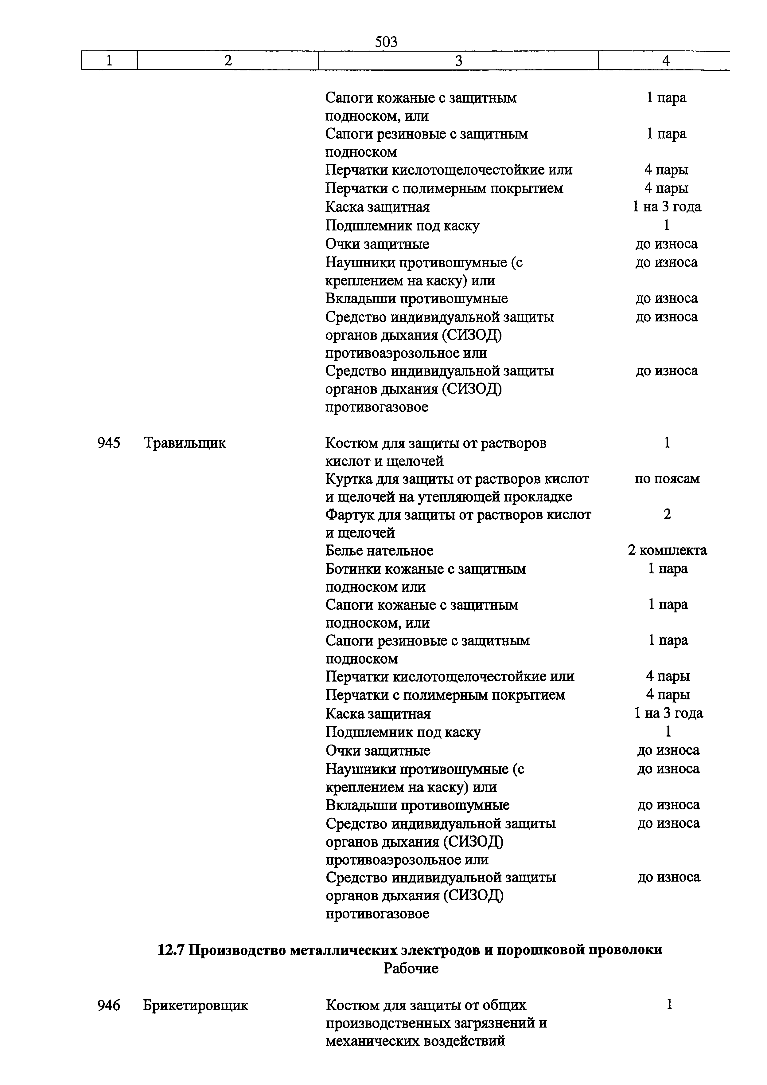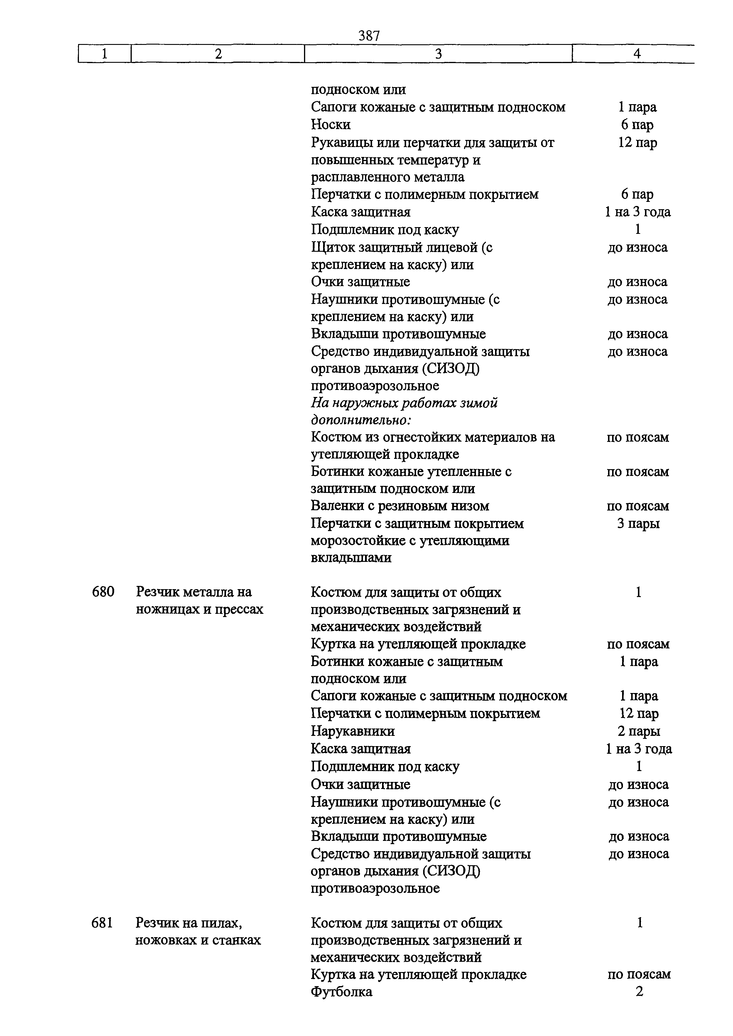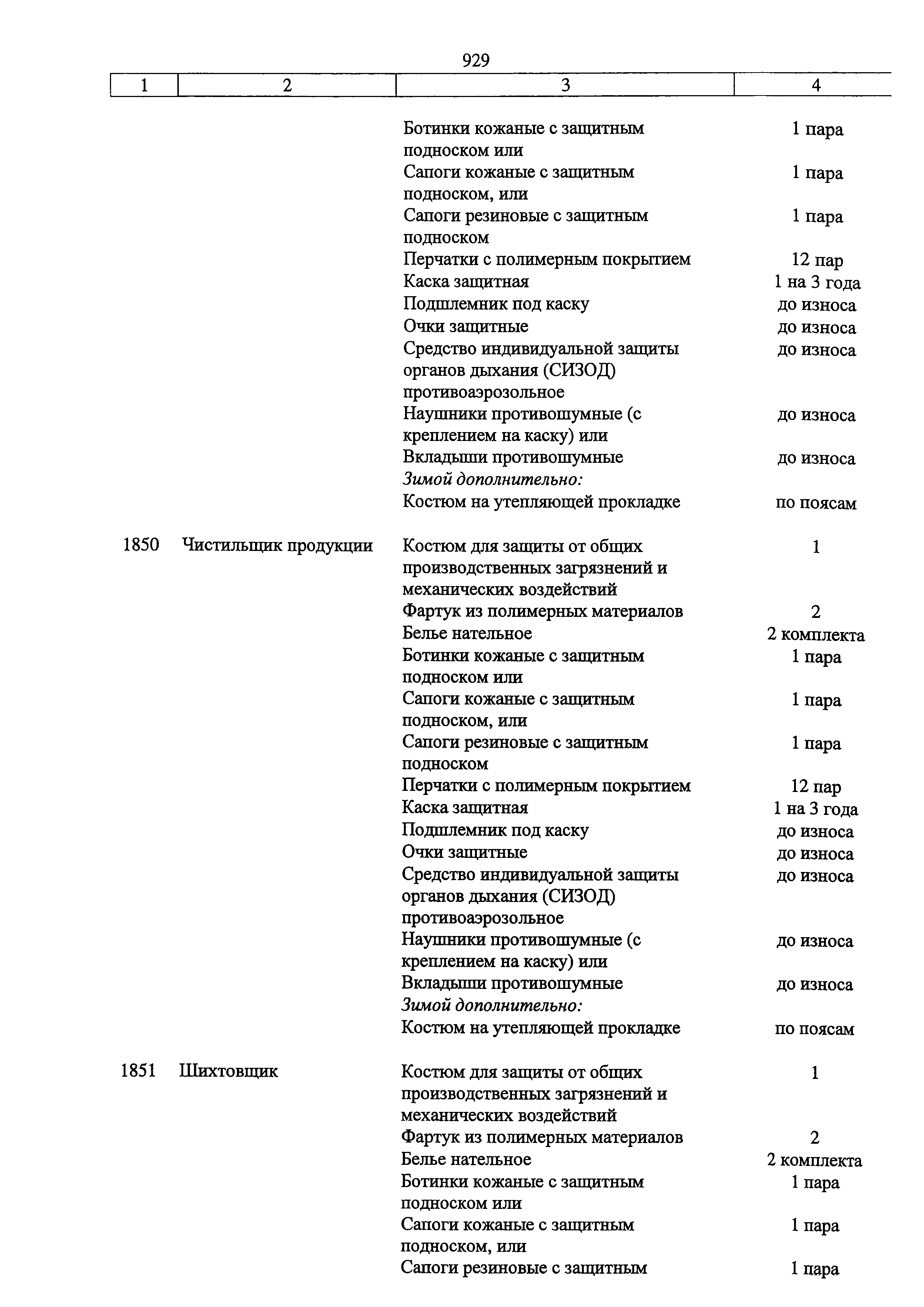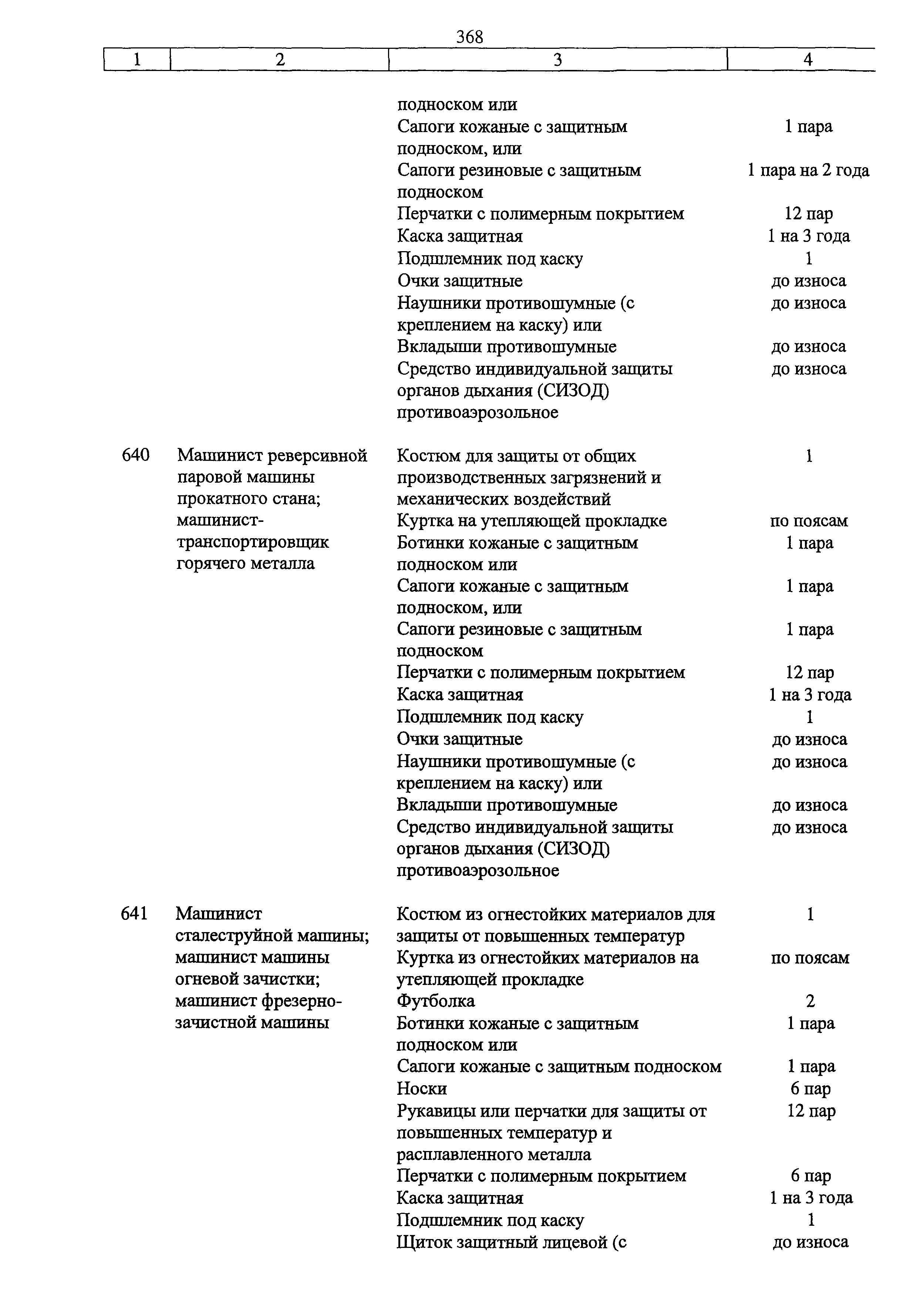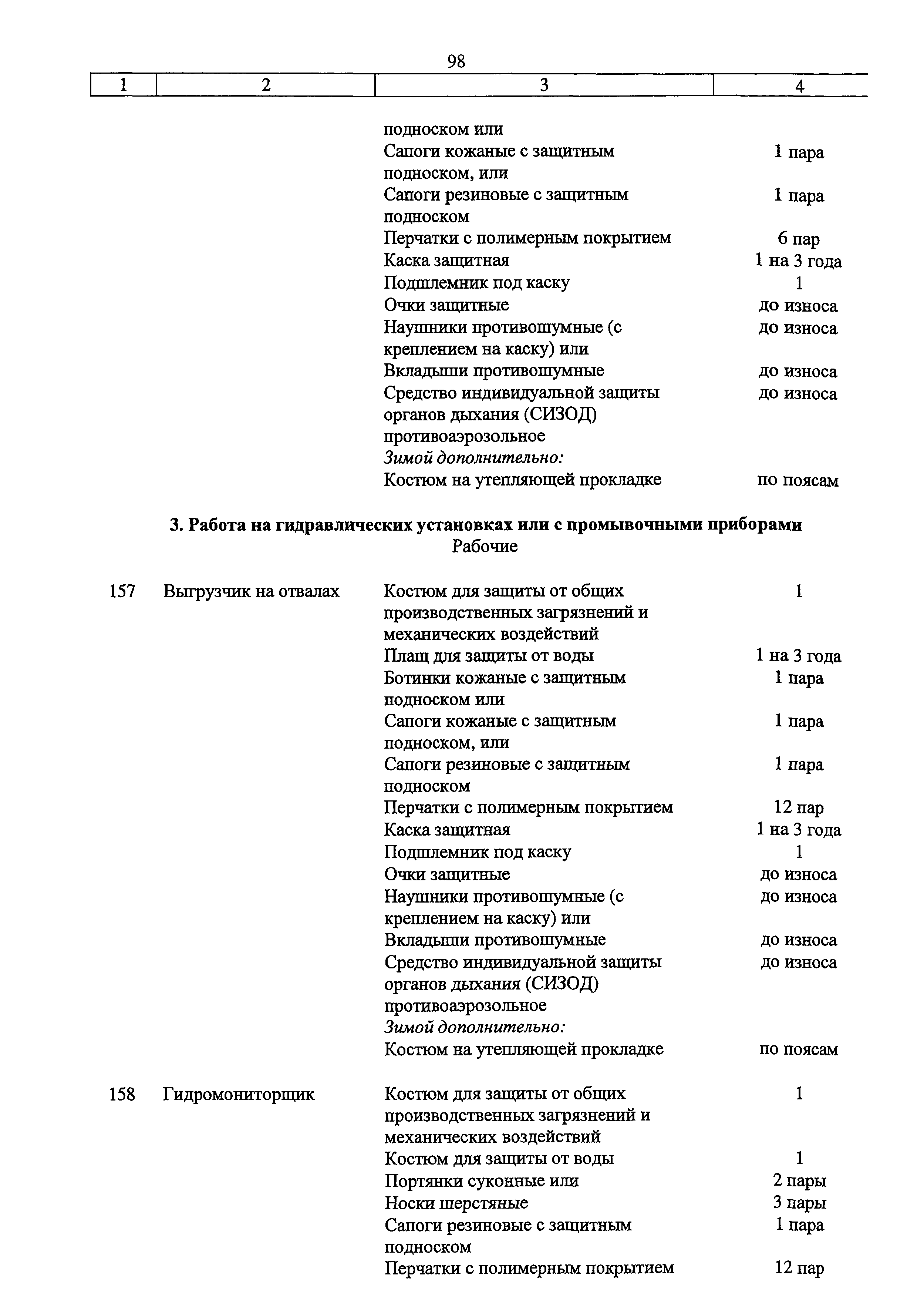 Типовые нормы бесплатной выдачи специальной одежды, специальной обуви и других средств индивидуальной защиты работникам горной и металлургической промышленности и металлургических производств других отраслей промышленности, занятым на работах с вредными и (или) опасными условиями труда, а также на работах, выполняемых в особых температурных условиях или связанных с загрязнением| Статус: | действует | | Название рус.: | Типовые нормы бесплатной выдачи специальной одежды, специальной обуви и других средств индивидуальной защиты работникам горной и металлургической промышленности и металлургических производств других отраслей промышленности, занятым на работах с вредными и (или) опасными условиями труда, а также на работах, выполняемых в особых температурных условиях или связанных с загрязнением | | Дата добавления в базу: | 01.02.2017 | | Дата актуализации: | 01.01.2021 | | Дата введения: | 14.02.2014 | | Область применения: | Нормы утверждаются локальными нормативными актами работодателя на основании результатов аттестации рабочих мест по условиям труда и могут быть включены в коллективный и (или) трудовой договор с указанием типовых норм, по сравнению с которыми улучшается обеспечение работников специальной одеждой, специальной обувью и другими средствами индивидуальной защиты. | | Оглавление: | I Горнодобывающая промышленность 1 Подземные горные работы (шахты) 2 Открытые горные работы и шахтная поверхность 3 Работа на гидравлических установках или с промывочными приборами 4 Дражные работы II Дробление, обогащение, брикетирование, обжиг, агломерация, извлечение металлов и сплавов III Черная металлургия 1 Коксохимическое производство 1.1 Углеподготовительные цеха 1.2 Углеобогатительные цеха 1.3 Производство каменноугольного кокса 1.4 Производство кристаллического нафталина, кумароновой смолы, смолоперерабатывающие цеха 1.5 Производство пиридиновых и фенольно-крезольных продуктов 1.6 Цеха улавливания химических продуктов и газовые цеха 1.7 Цеха ректификации сырого бензола 1.8 Цеха очистки коксового газа от сероводорода 1.9 Производство пекового кокса 1.10 Производство термоантрацита 2 Доменное производство 3 Сталеплавильное производство 3.1 Установки непрерывной разливки стали 4 Производство ферросплавов 4.1 Электролитическое производство 4.2 Производство электролитического хрома 4.3 Производство феррованадия 4.4 Подготовка шихты, обжиг руд и концентратов 4.5 Разливка и разделка ферросплавов 4.6 Обжиг извести 4.7 Общие профессии и должности ферросплавного производства 5 Прокатное производство 6 Производство труб (прокатка, сварка и волочение) 7 Колесопрокатное и бандажное производства 8 Валопрокатное производство 9 Производство рельсовых скреплений 10 Производство баллонов 11 Труболитейное производство 12 Производство метизов 12.1 Производство металлических канатов, сеток, пружин и пружинной ленты, щеток, цепей, колючей проволоки и других метизов 12.2 Волочение проволоки, калибровка и шлифовка металла 12.3 Изготовление волок 12.4 Холодноштамповочные и кузнечно-прессовые работы 12.5 Термическая обработка 12.6 Травление металла, защитные покрытия проволоки и извлечение железного купороса 12.7 Производство металлических электродов и порошковой проволоки 13 Производство огнеупоров 13.1 Огнеупоры 13.2 Карборундовые стержни 13.3 Высокоогнеупорные окислы 14 Ремонт 