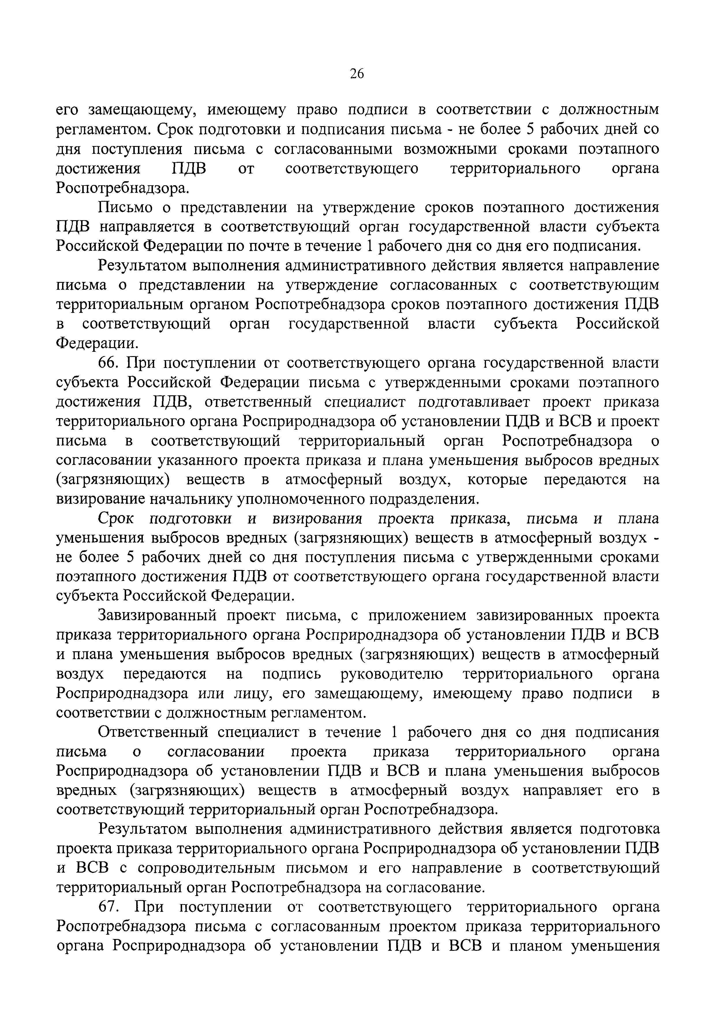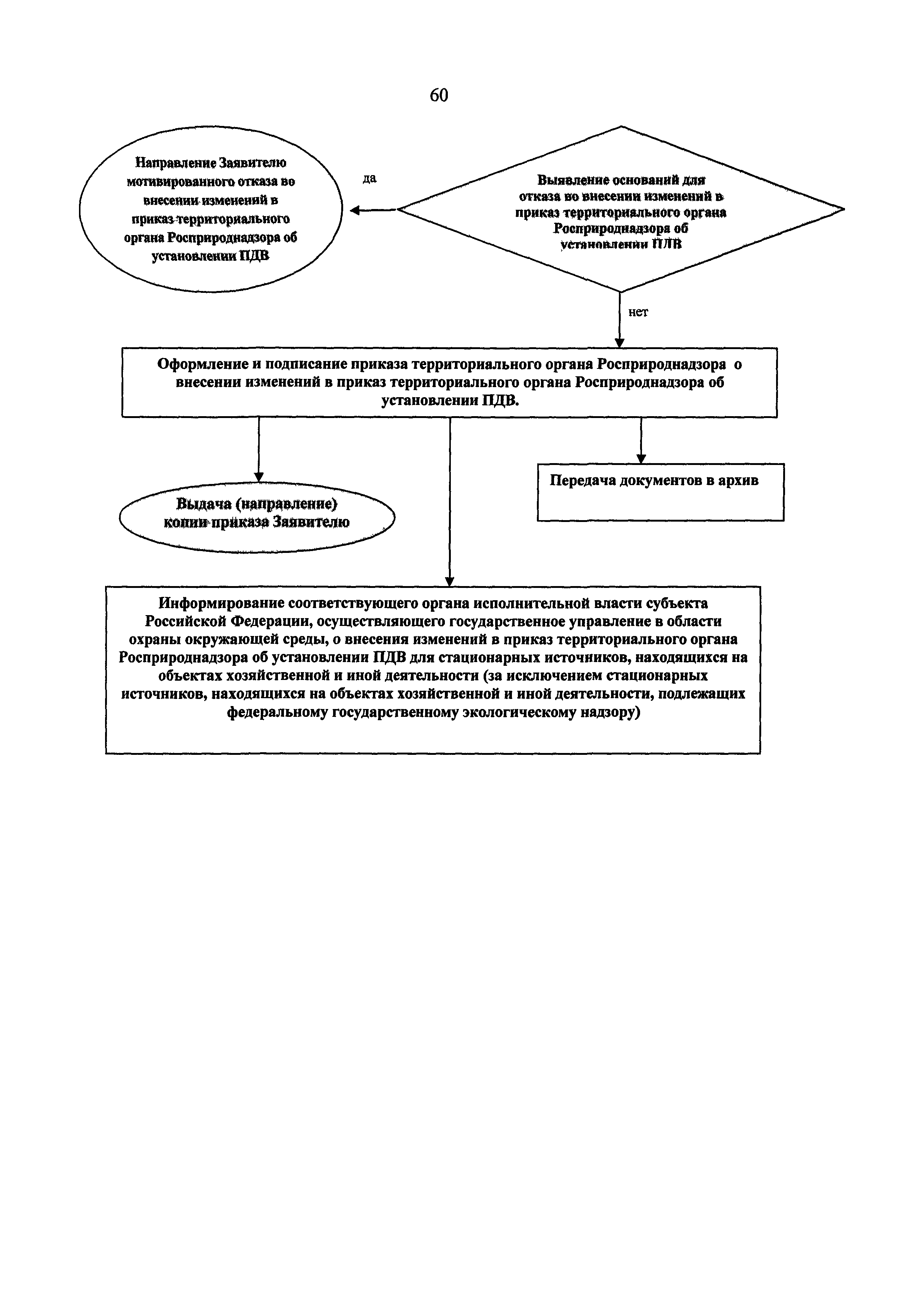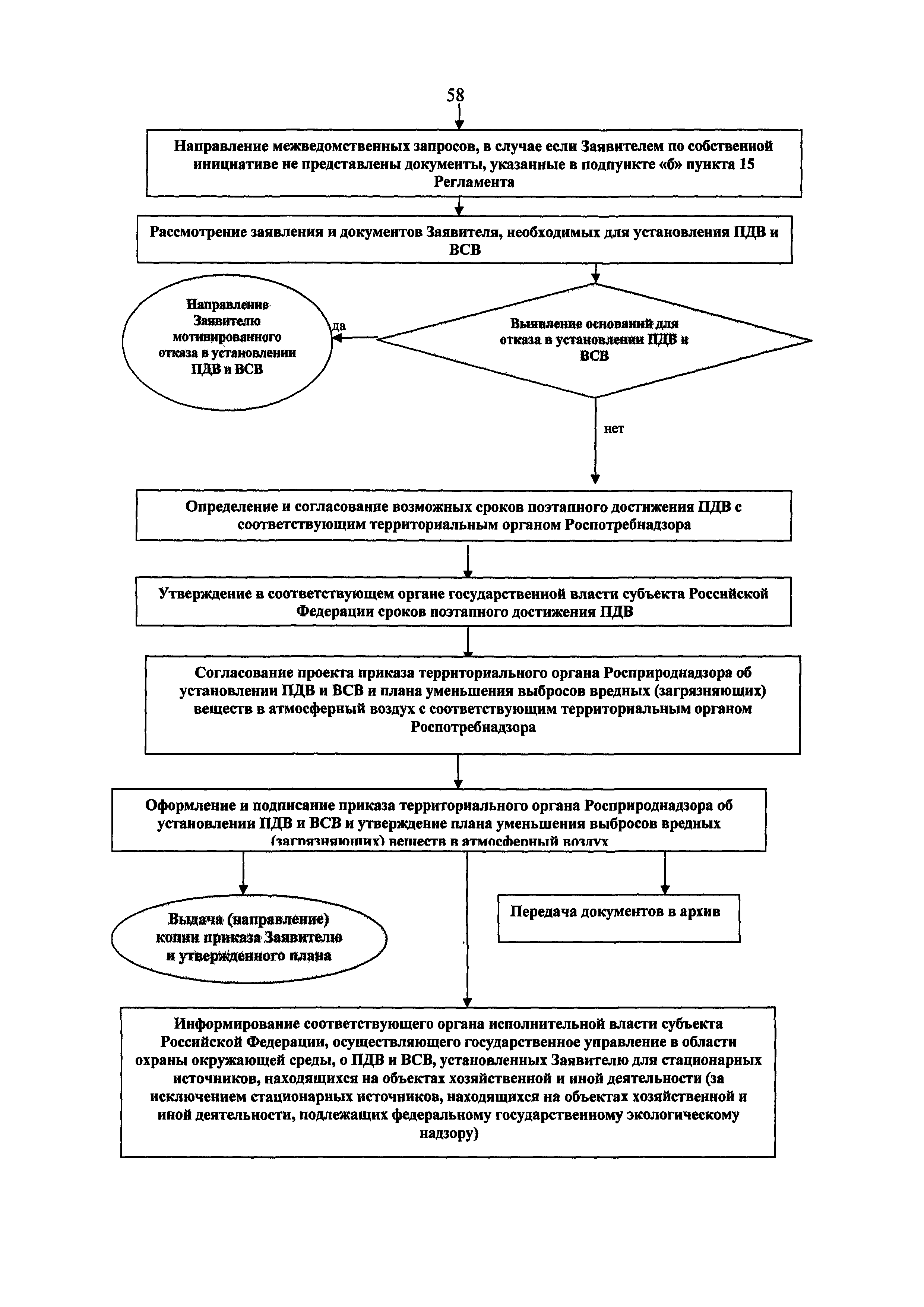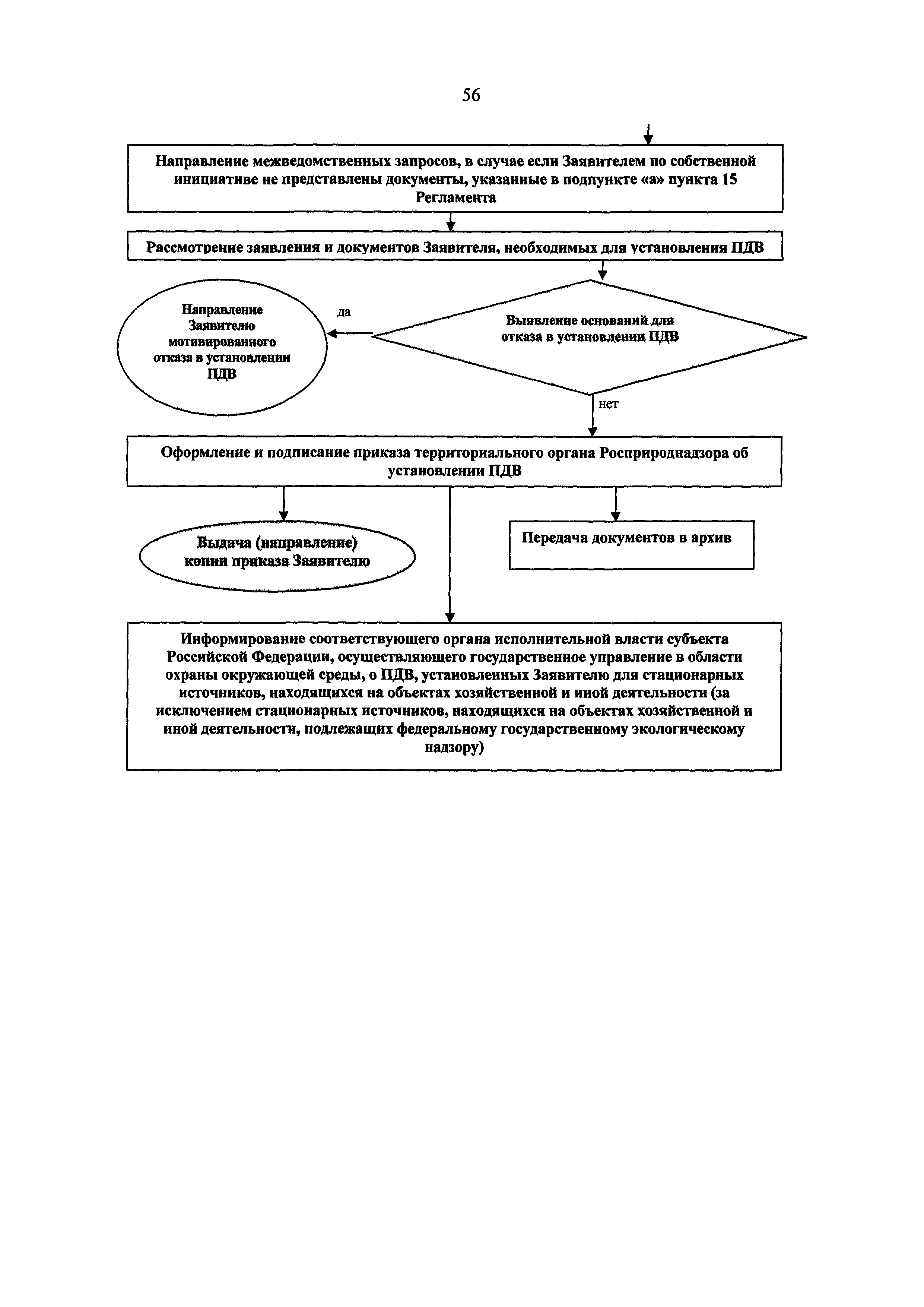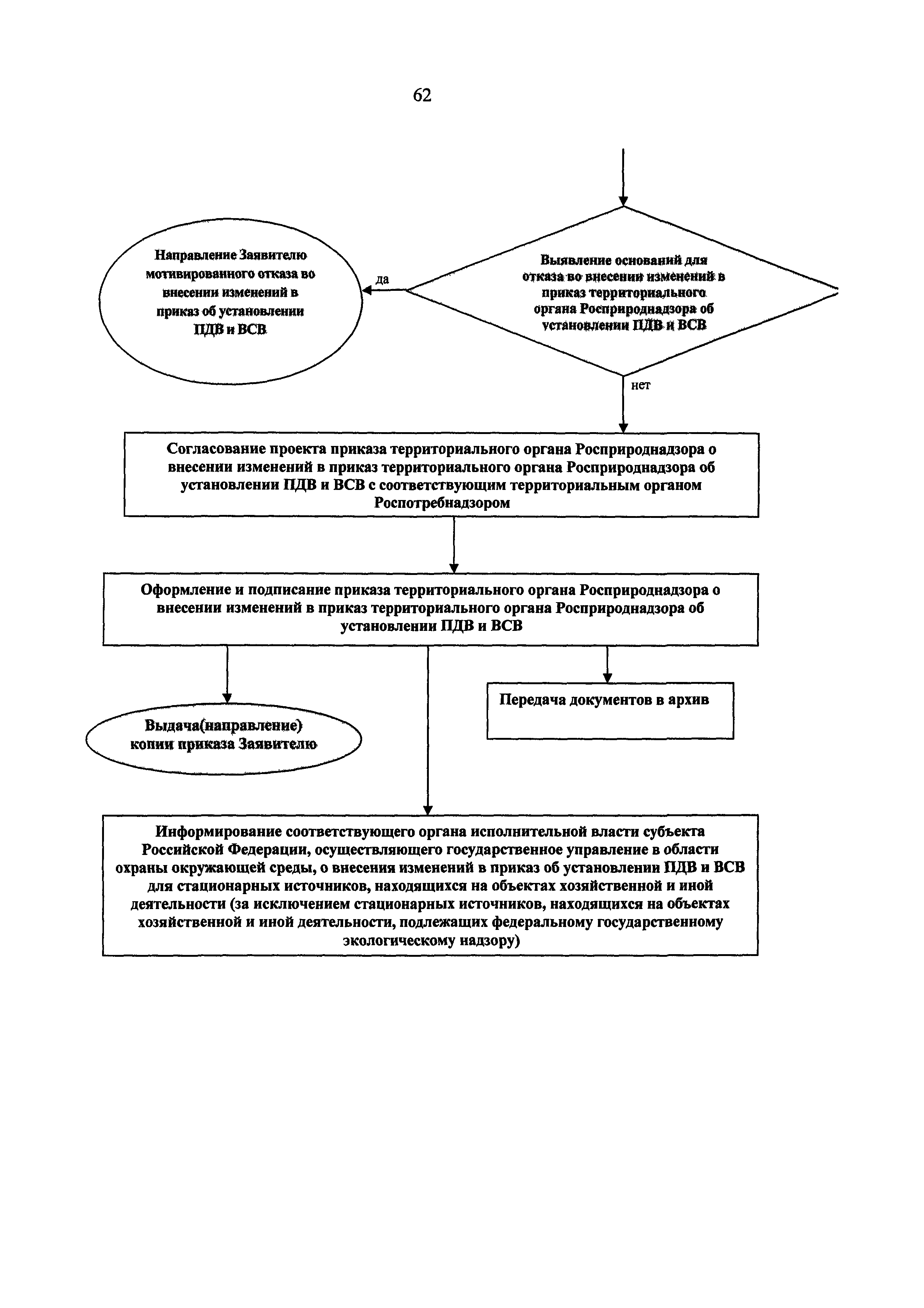 | Оглавление: | I. Общие положения II. Стандарт предоставления государственной услуги III. Состав, последовательность и сроки выполнения административных процедур, требования к порядку их выполнения IV. Формы контроля за предоставлением государственной услуги V. Досудебный (внесудебный) порядок обжалования решений и действий (бездействия) территориальных органов Росприроднадзора и их должностных лиц, предоставляющих государственную услугу Приложение № 1 Приложение № 2. Заявление об установлении предельно допустимых выбросов Приложение № 3. Заявление об установлении предельно допустимых выбросов и временно согласованных выбросов Приложение № 4. Заявление о внесении изменений в приказ территориального органа Росприроднадзора об установлении предельно допустимых выбросов Приложение № 5. Заявление о внесении изменений в приказ территориального органа Росприроднадзора об установлении предельно допустимых выбросов и временно согласованных выбросов Приложение № 6. Блок-схема предоставления государственной услуги установления ПДВ Приложение № 7. Блок-схема предоставления государственной услуги установления ПДВ и ВСВ Приложение № 8. Блок-схема исполнения административной процедуры по внесению изменений в приказ территориального органа Росприроднадзора об установлении ПДВ Приложение № 8. Блок-схема исполнения административной процедуры по внесению изменений в приказ территориального органа Росприроднадзора об установлении ПДВ и ВСВ |