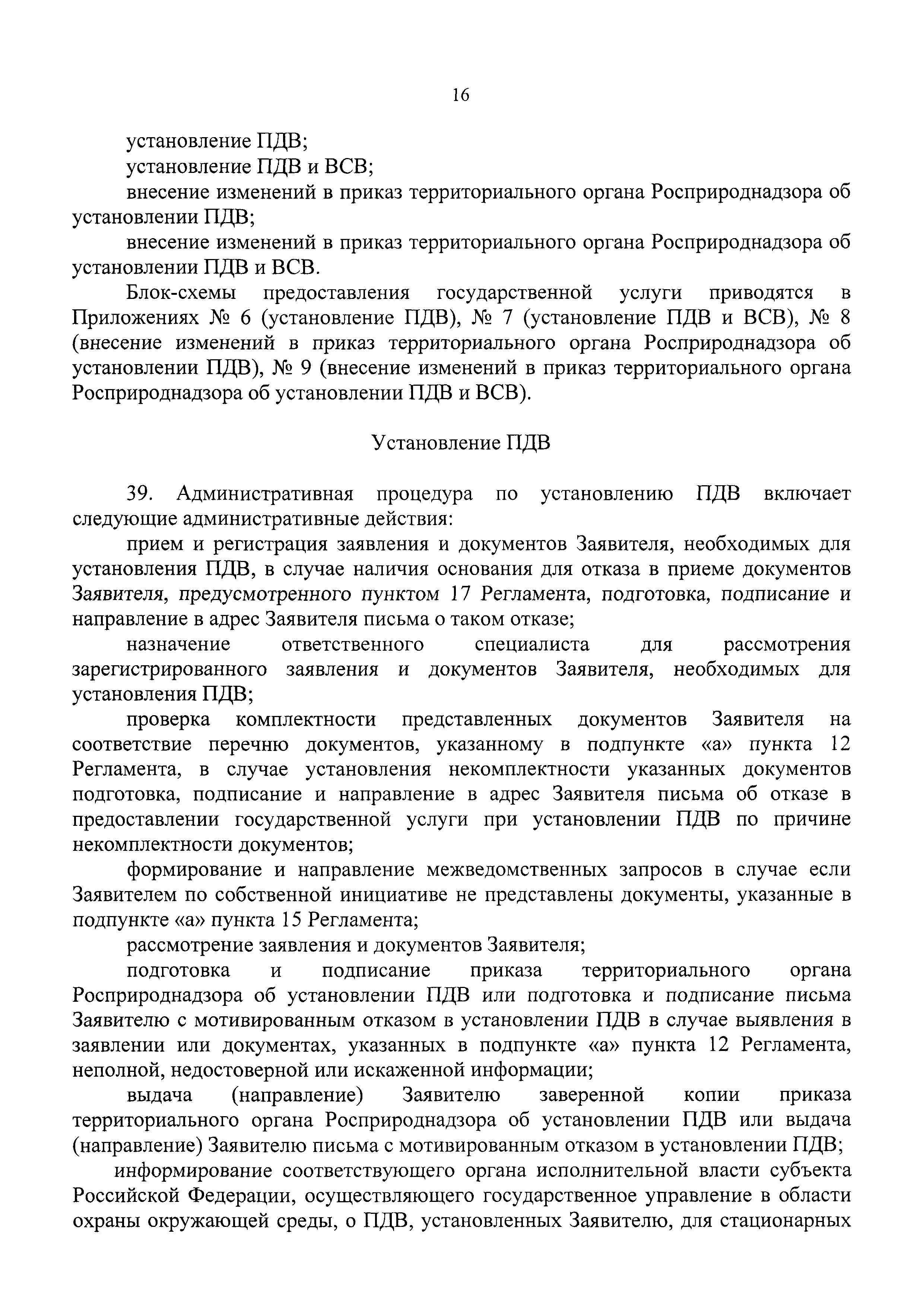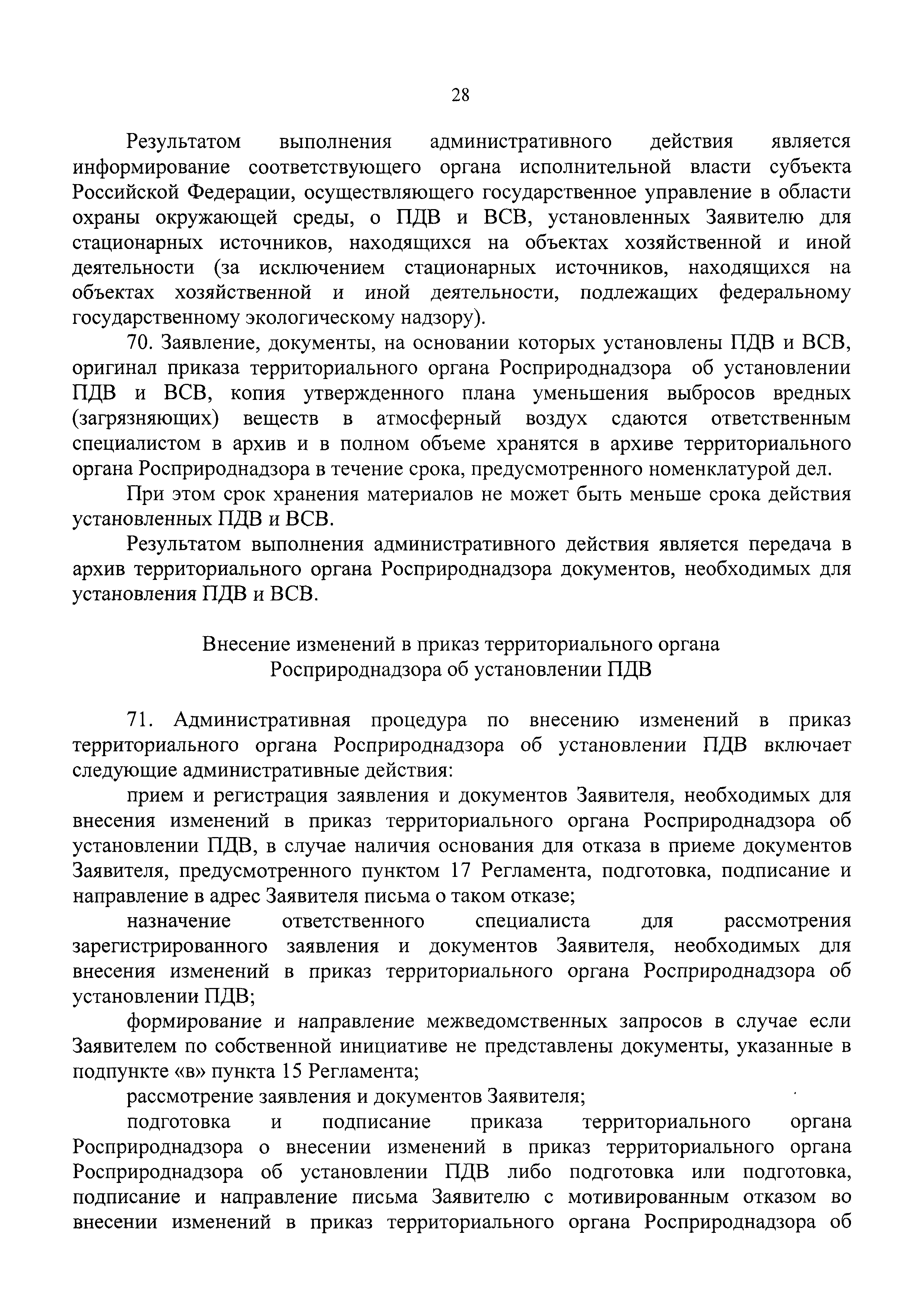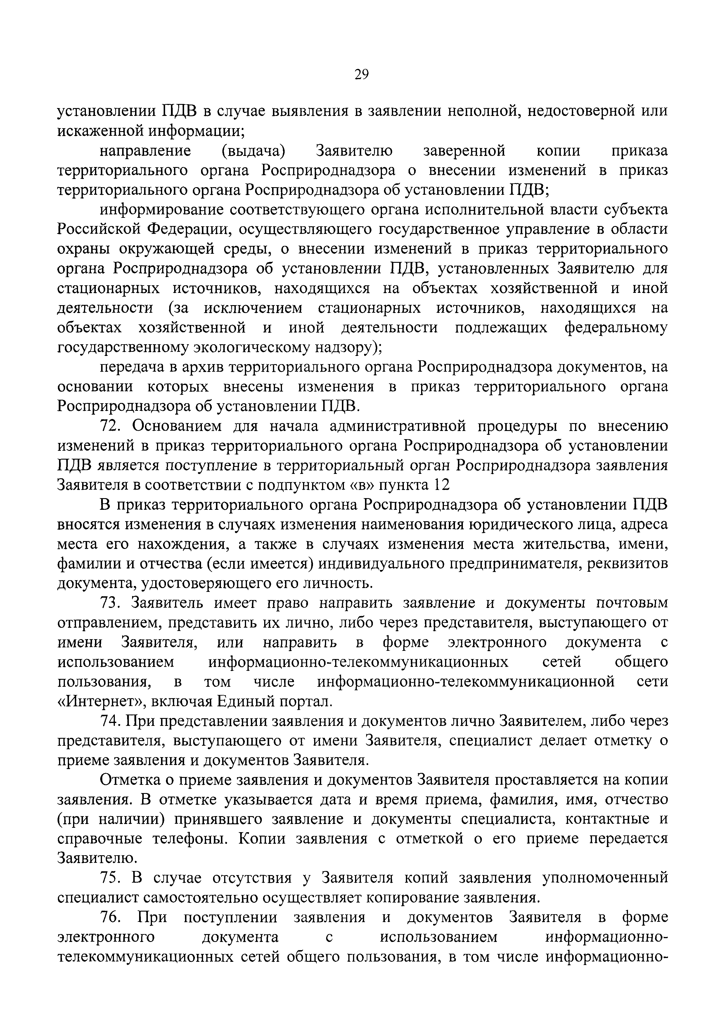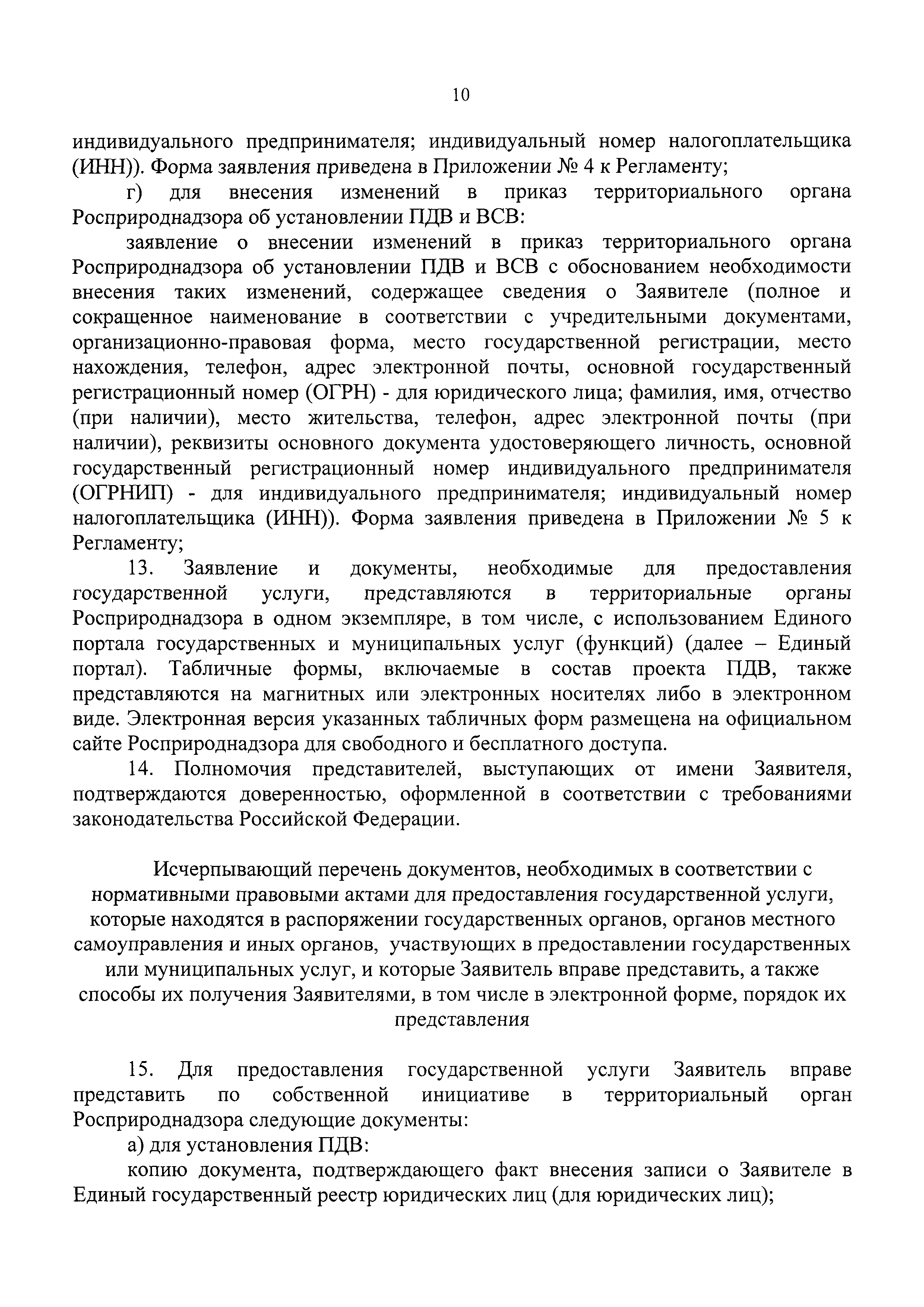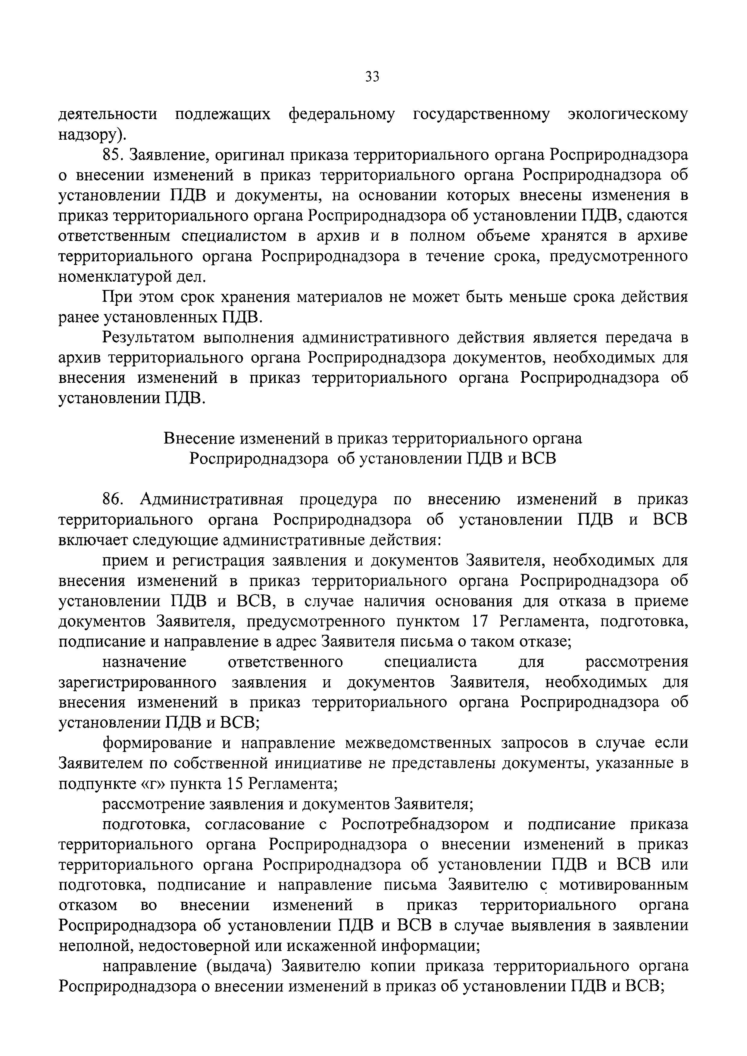 | Оглавление: | I. Общие положения II. Стандарт предоставления государственной услуги III. Состав, последовательность и сроки выполнения административных процедур, требования к порядку их выполнения IV. Формы контроля за предоставлением государственной услуги V. Досудебный (внесудебный) порядок обжалования решений и действий (бездействия) территориальных органов Росприроднадзора и их должностных лиц, предоставляющих государственную услугу Приложение № 1 Приложение № 2. Заявление об установлении предельно допустимых выбросов Приложение № 3. Заявление об установлении предельно допустимых выбросов и временно согласованных выбросов Приложение № 4. Заявление о внесении изменений в приказ территориального органа Росприроднадзора об установлении предельно допустимых выбросов Приложение № 5. Заявление о внесении изменений в приказ территориального органа Росприроднадзора об установлении предельно допустимых выбросов и временно согласованных выбросов Приложение № 6. Блок-схема предоставления государственной услуги установления ПДВ Приложение № 7. Блок-схема предоставления государственной услуги установления ПДВ и ВСВ Приложение № 8. Блок-схема исполнения административной процедуры по внесению изменений в приказ территориального органа Росприроднадзора об установлении ПДВ Приложение № 8. Блок-схема исполнения административной процедуры по внесению изменений в приказ территориального органа Росприроднадзора об установлении ПДВ и ВСВ |