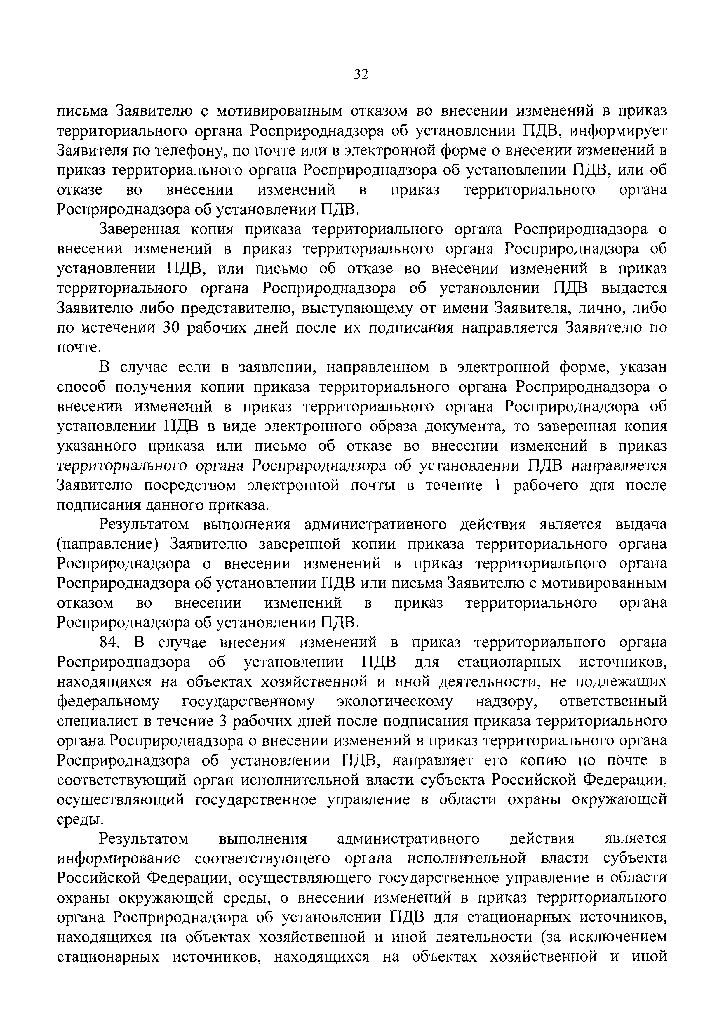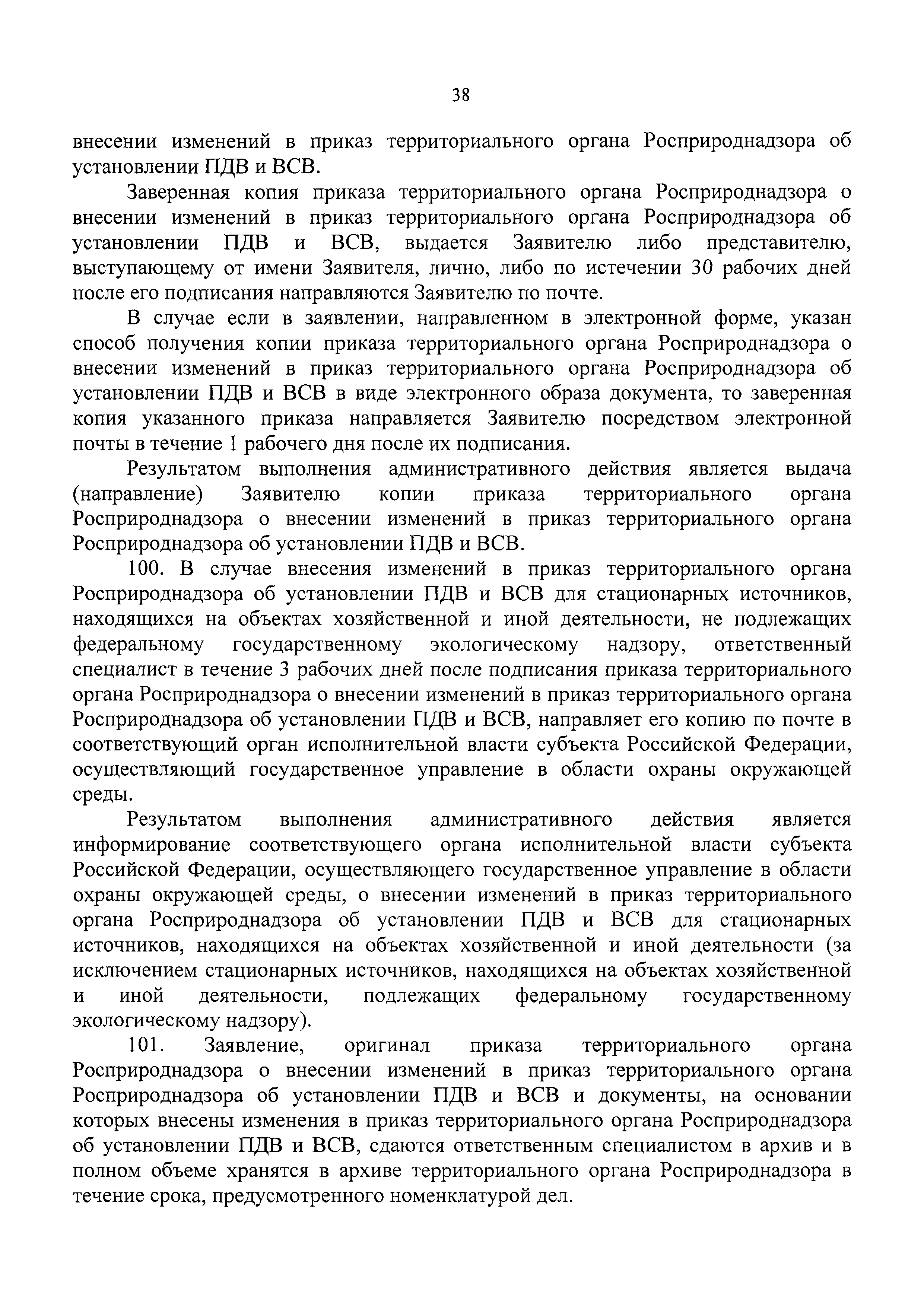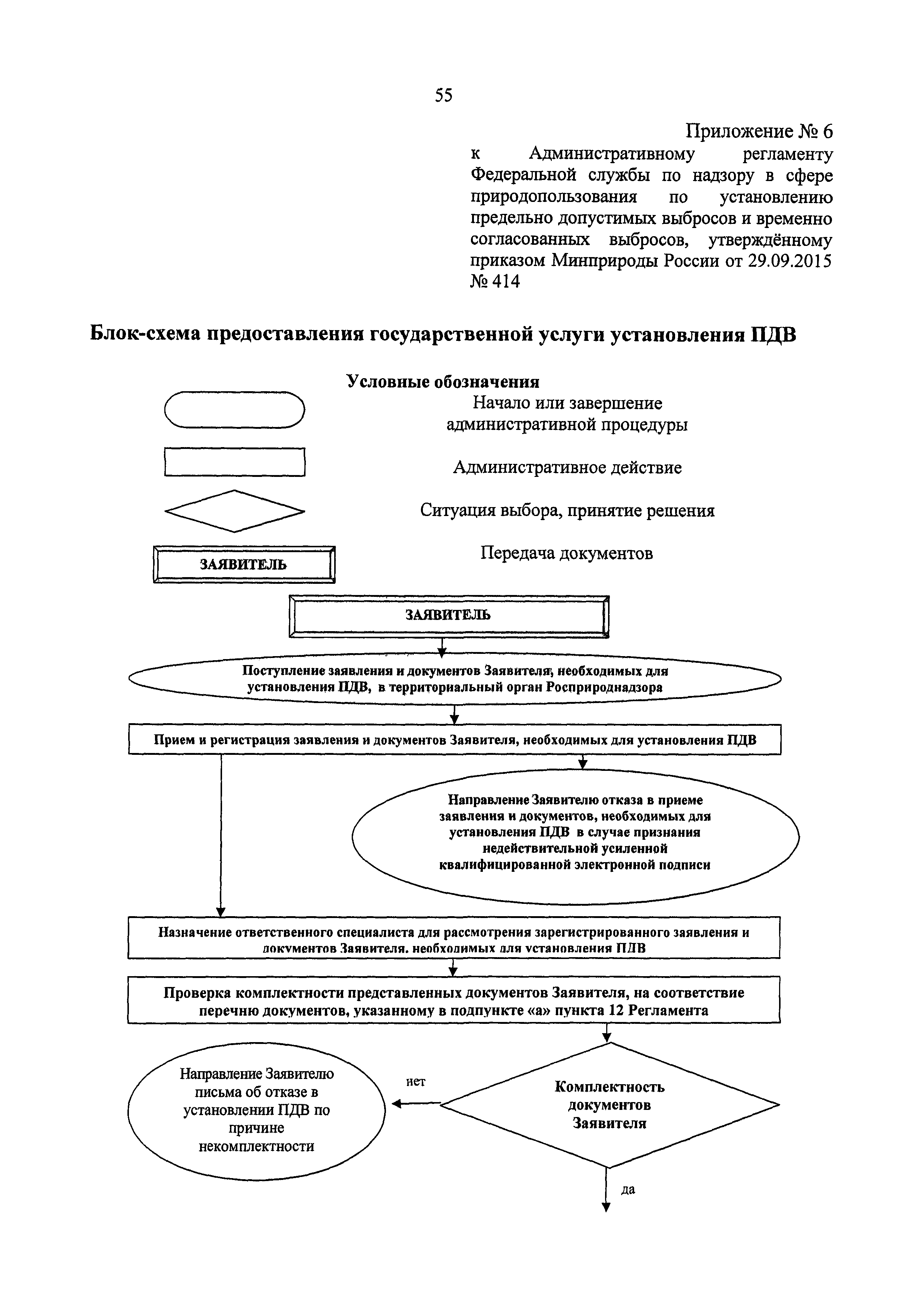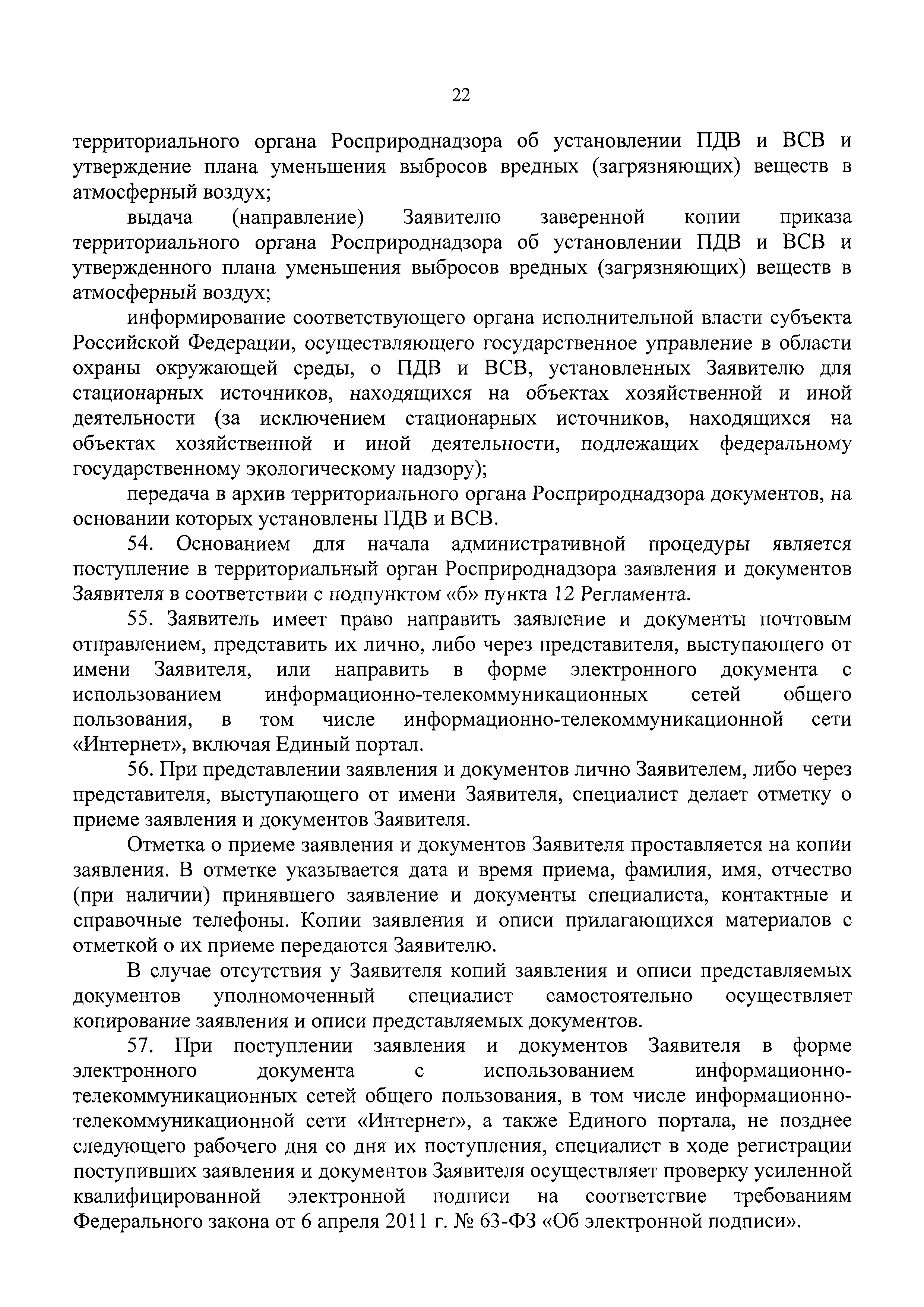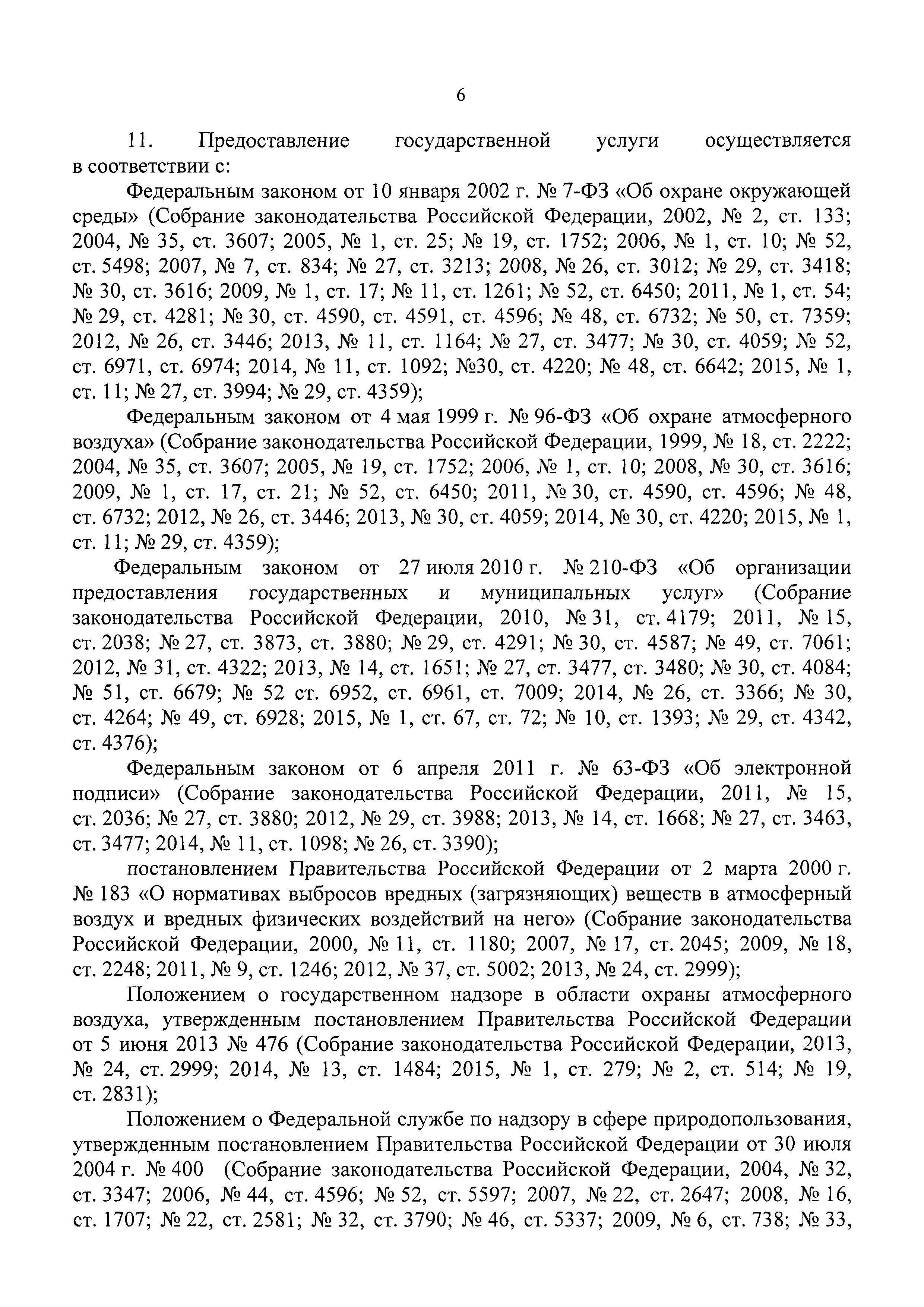 | Оглавление: | I. Общие положения II. Стандарт предоставления государственной услуги III. Состав, последовательность и сроки выполнения административных процедур, требования к порядку их выполнения IV. Формы контроля за предоставлением государственной услуги V. Досудебный (внесудебный) порядок обжалования решений и действий (бездействия) территориальных органов Росприроднадзора и их должностных лиц, предоставляющих государственную услугу Приложение № 1 Приложение № 2. Заявление об установлении предельно допустимых выбросов Приложение № 3. Заявление об установлении предельно допустимых выбросов и временно согласованных выбросов Приложение № 4. Заявление о внесении изменений в приказ территориального органа Росприроднадзора об установлении предельно допустимых выбросов Приложение № 5. Заявление о внесении изменений в приказ территориального органа Росприроднадзора об установлении предельно допустимых выбросов и временно согласованных выбросов Приложение № 6. Блок-схема предоставления государственной услуги установления ПДВ Приложение № 7. Блок-схема предоставления государственной услуги установления ПДВ и ВСВ Приложение № 8. Блок-схема исполнения административной процедуры по внесению изменений в приказ территориального органа Росприроднадзора об установлении ПДВ Приложение № 8. Блок-схема исполнения административной процедуры по внесению изменений в приказ территориального органа Росприроднадзора об установлении ПДВ и ВСВ |