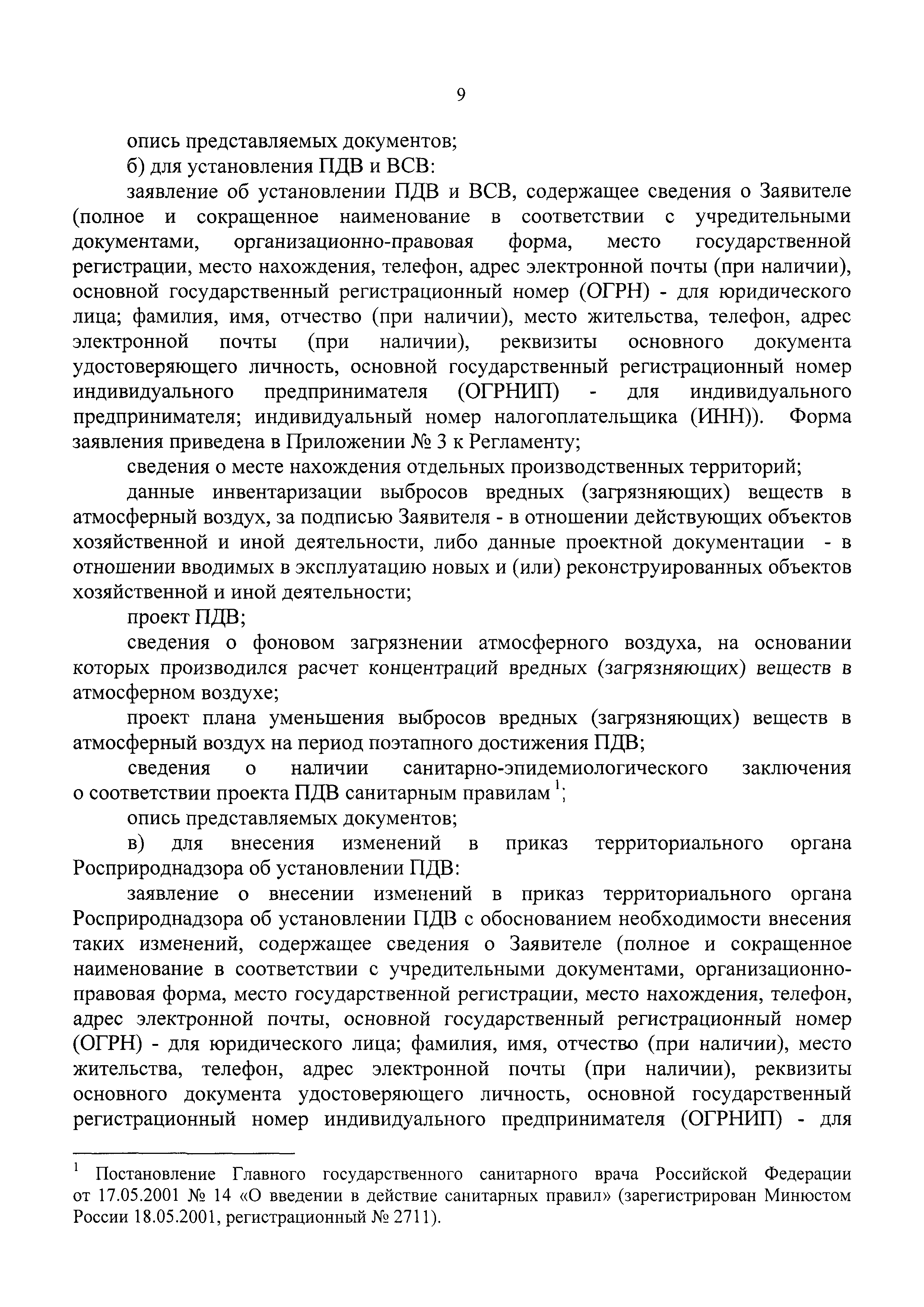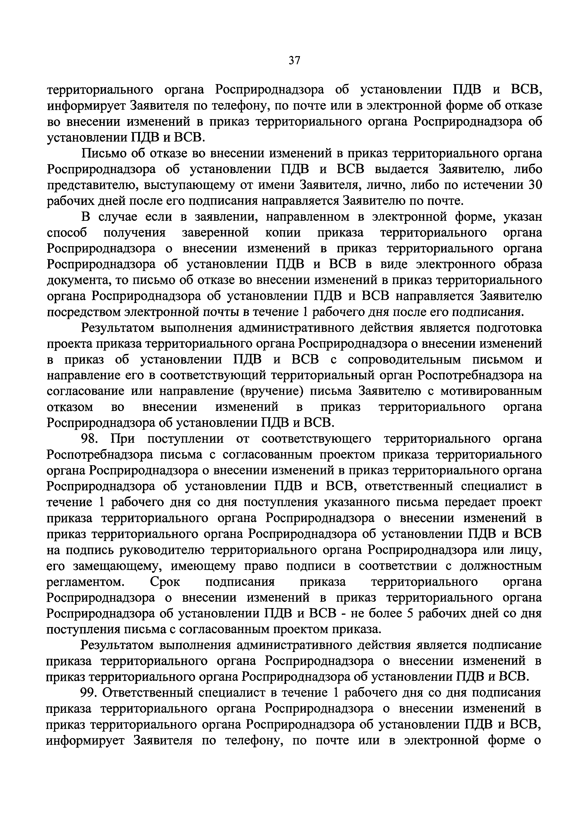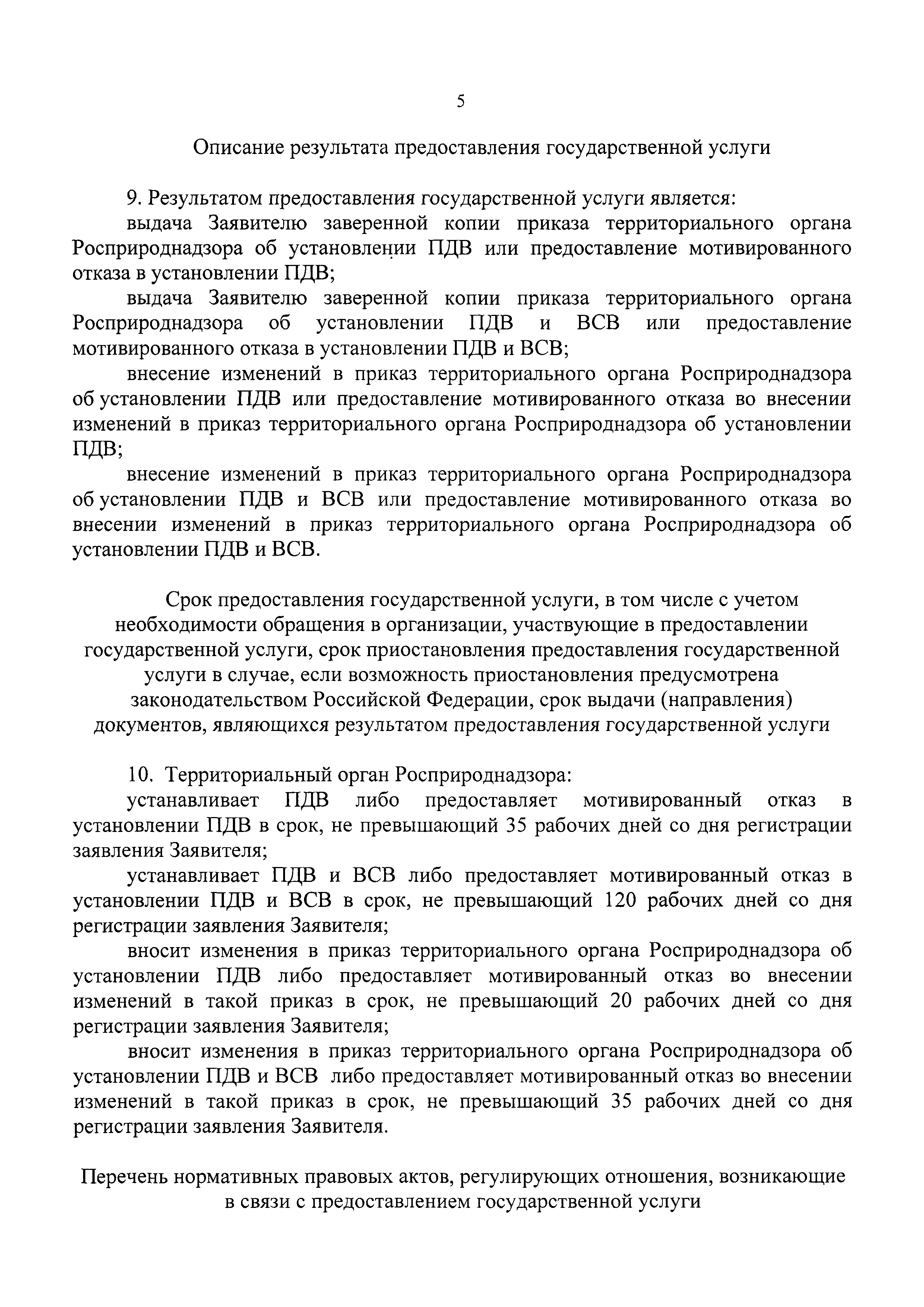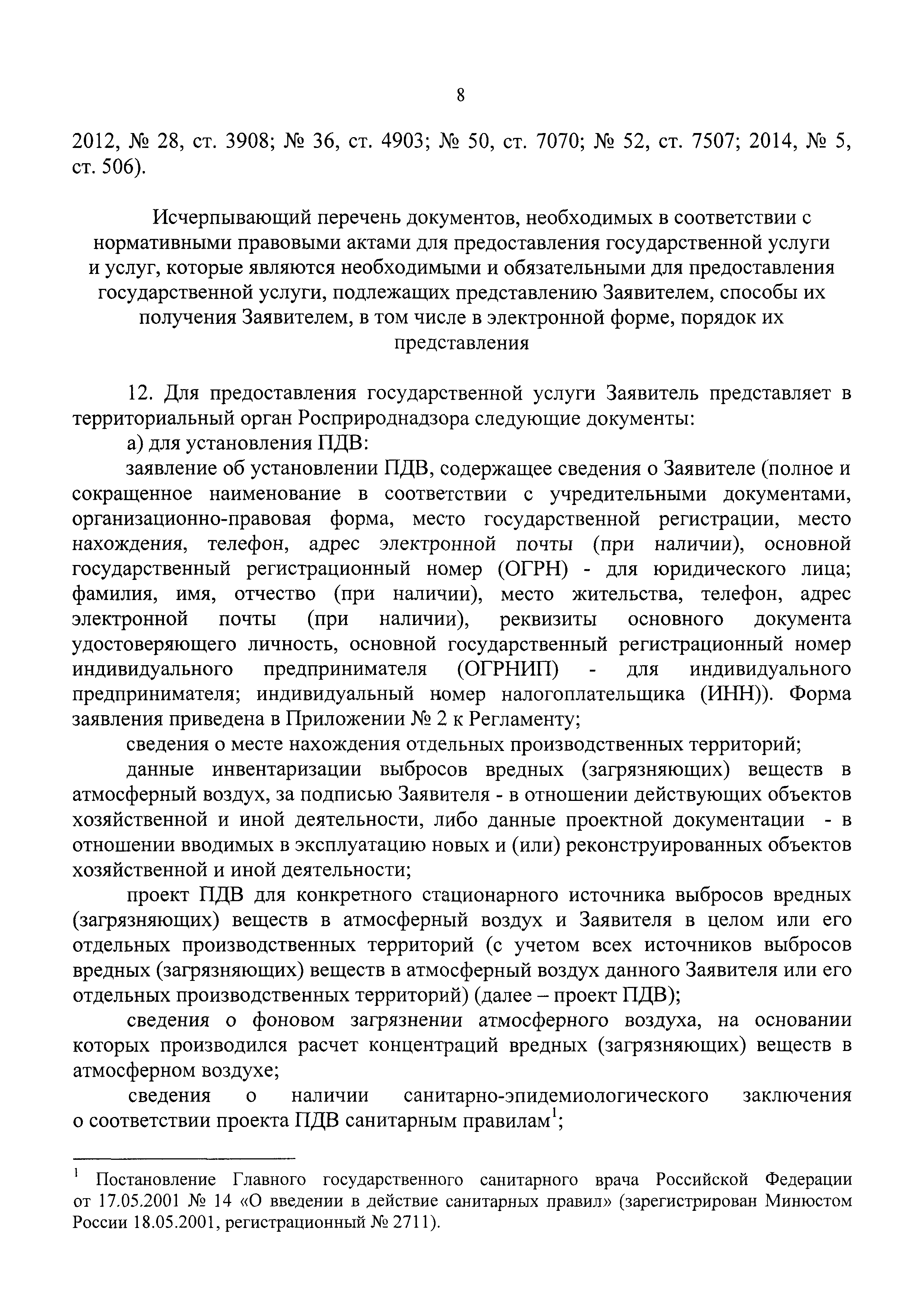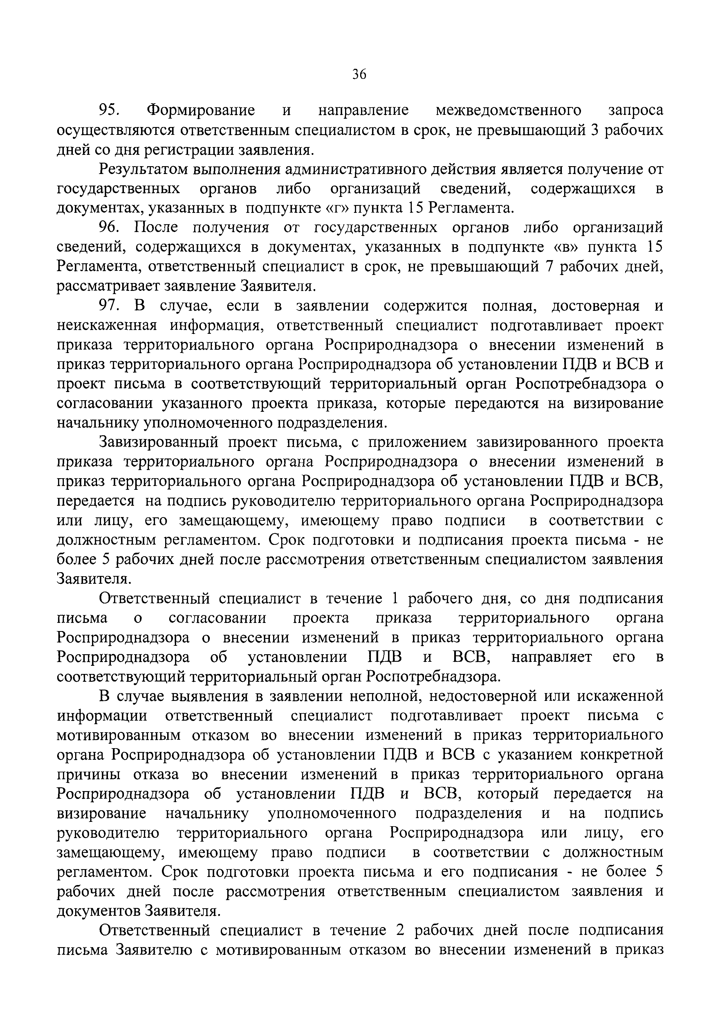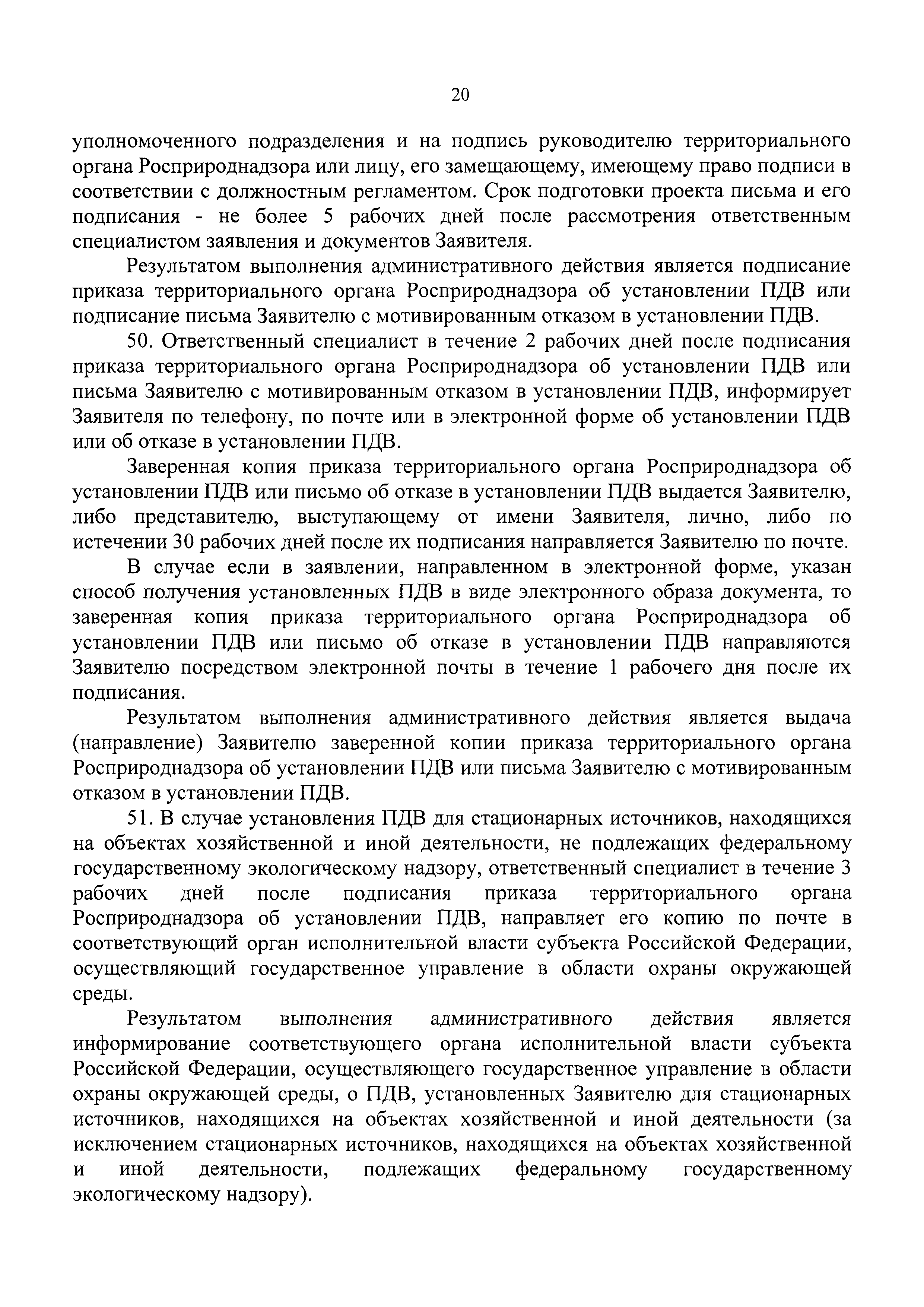 | Оглавление: | I. Общие положения II. Стандарт предоставления государственной услуги III. Состав, последовательность и сроки выполнения административных процедур, требования к порядку их выполнения IV. Формы контроля за предоставлением государственной услуги V. Досудебный (внесудебный) порядок обжалования решений и действий (бездействия) территориальных органов Росприроднадзора и их должностных лиц, предоставляющих государственную услугу Приложение № 1 Приложение № 2. Заявление об установлении предельно допустимых выбросов Приложение № 3. Заявление об установлении предельно допустимых выбросов и временно согласованных выбросов Приложение № 4. Заявление о внесении изменений в приказ территориального органа Росприроднадзора об установлении предельно допустимых выбросов Приложение № 5. Заявление о внесении изменений в приказ территориального органа Росприроднадзора об установлении предельно допустимых выбросов и временно согласованных выбросов Приложение № 6. Блок-схема предоставления государственной услуги установления ПДВ Приложение № 7. Блок-схема предоставления государственной услуги установления ПДВ и ВСВ Приложение № 8. Блок-схема исполнения административной процедуры по внесению изменений в приказ территориального органа Росприроднадзора об установлении ПДВ Приложение № 8. Блок-схема исполнения административной процедуры по внесению изменений в приказ территориального органа Росприроднадзора об установлении ПДВ и ВСВ |