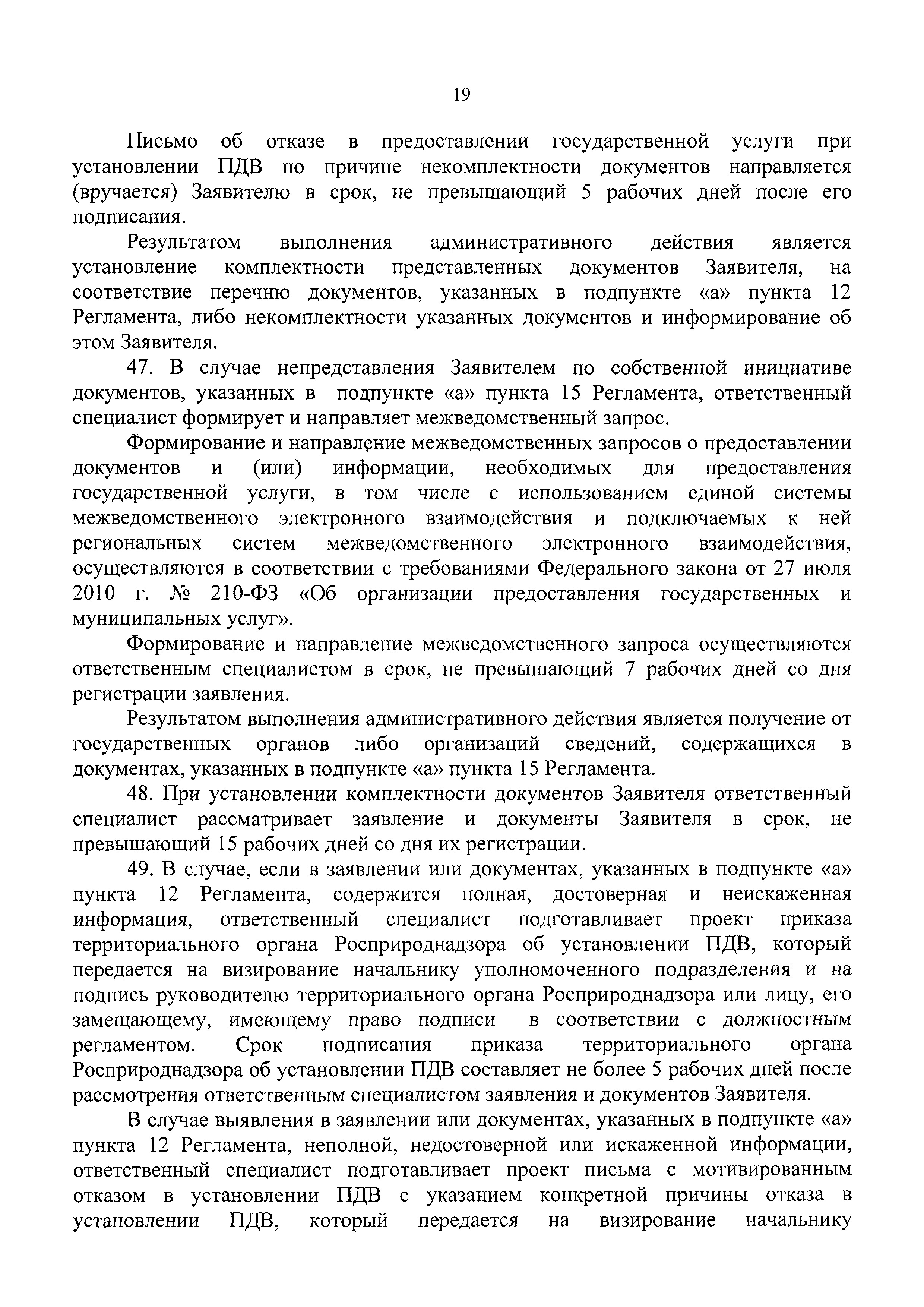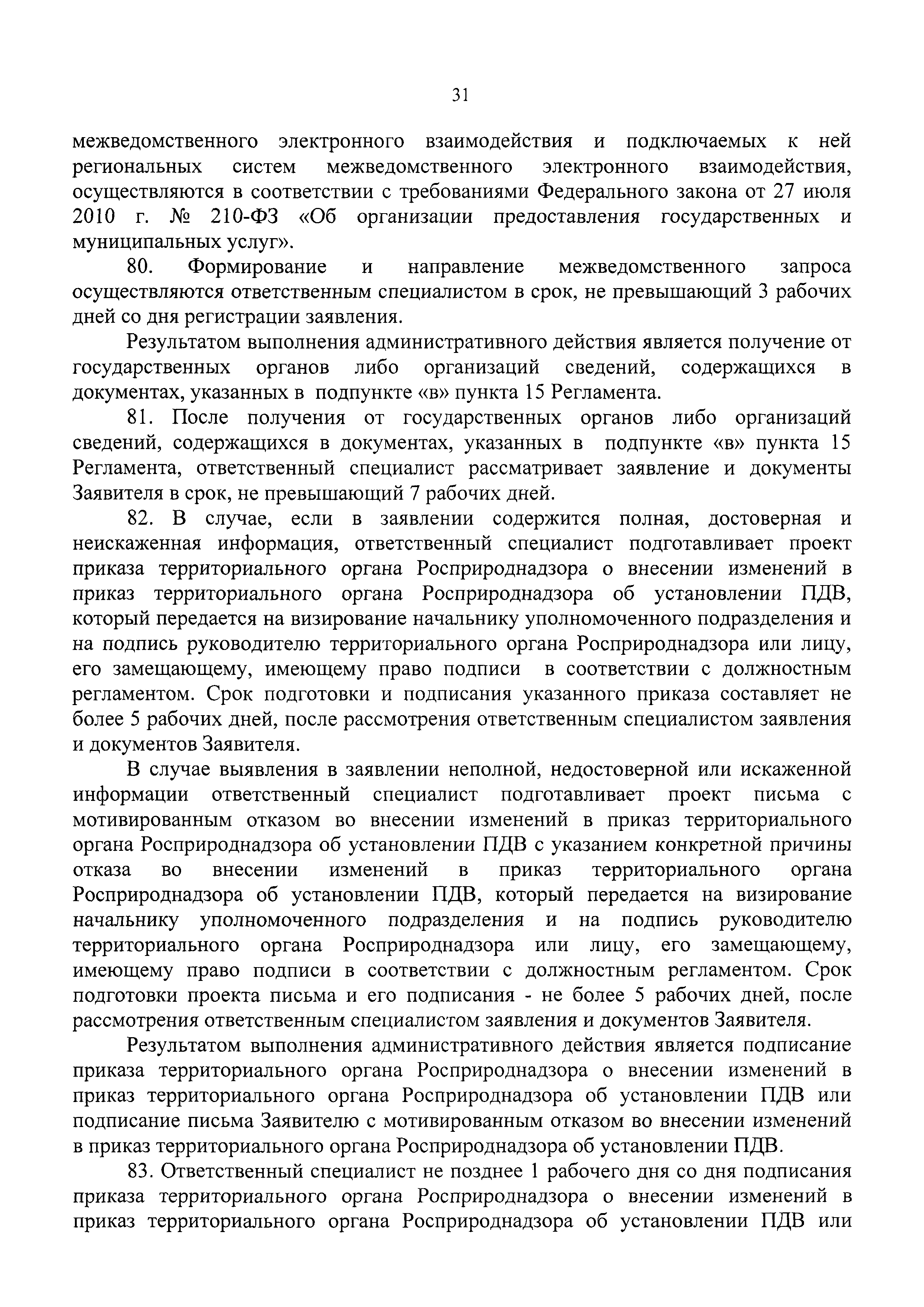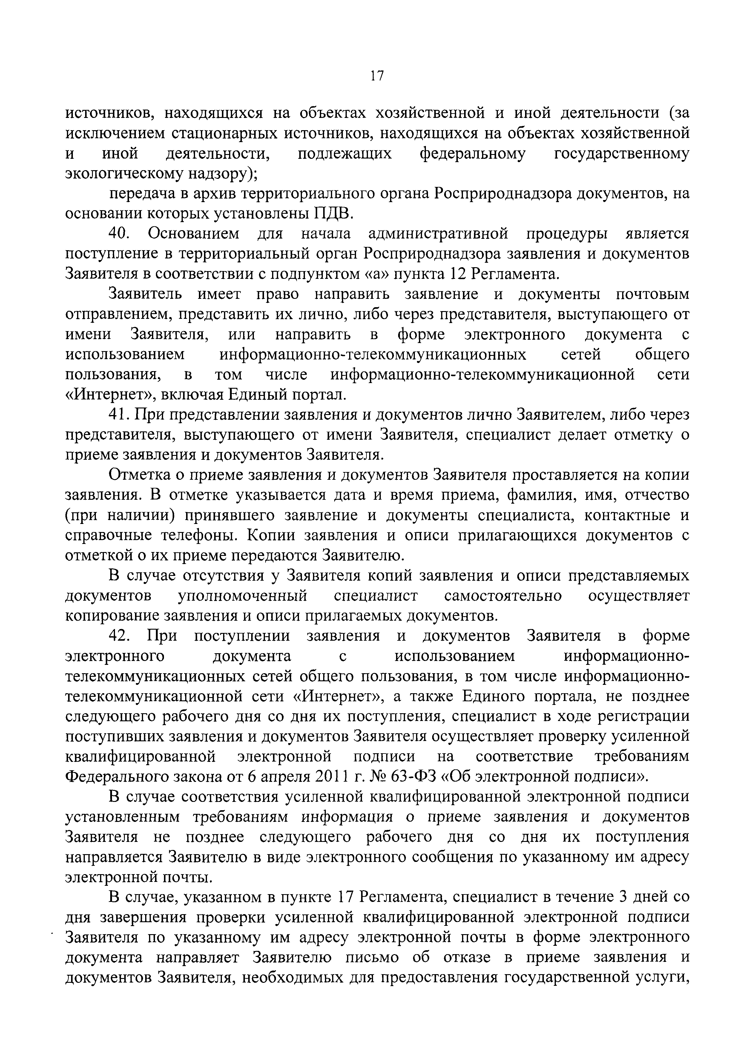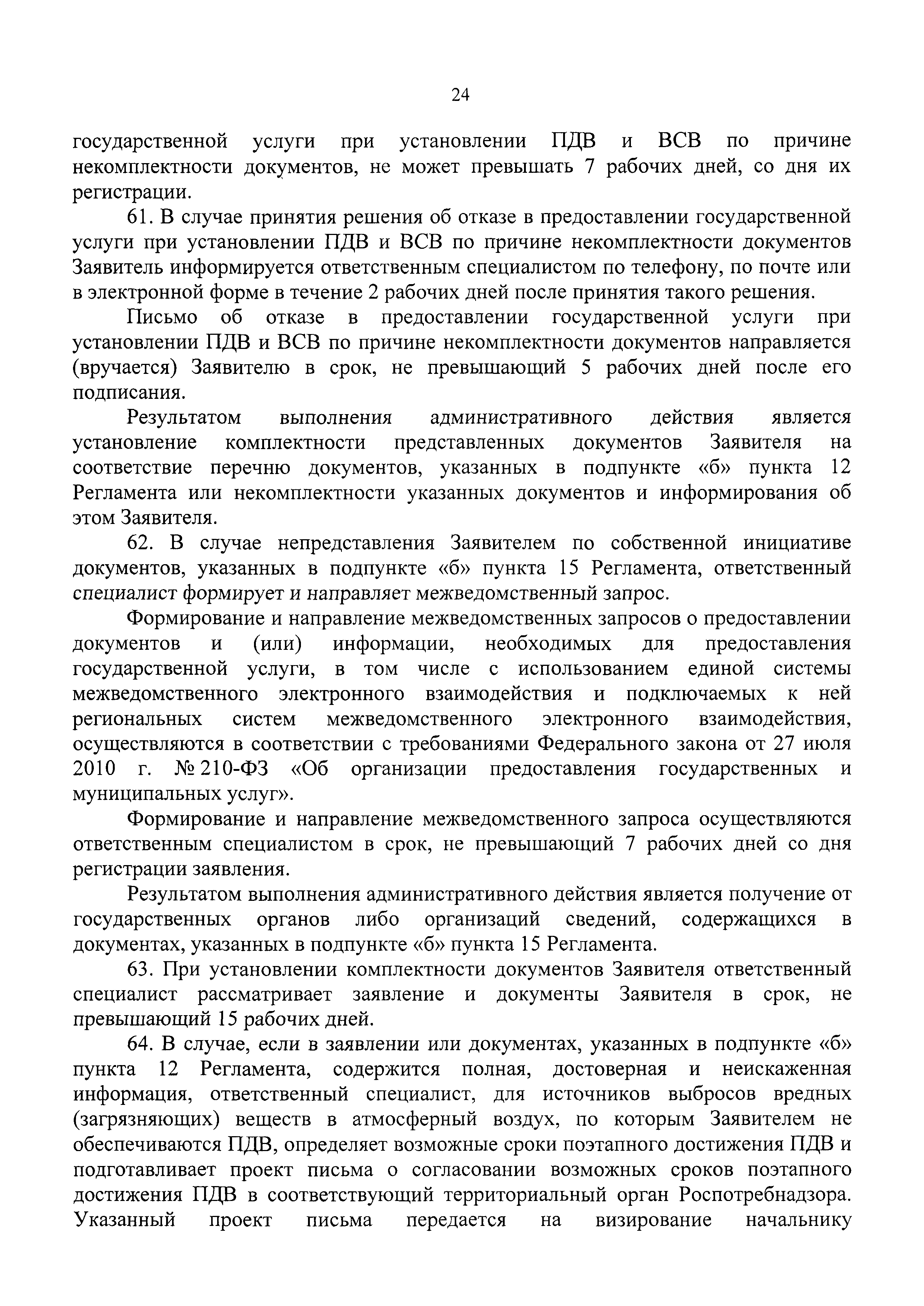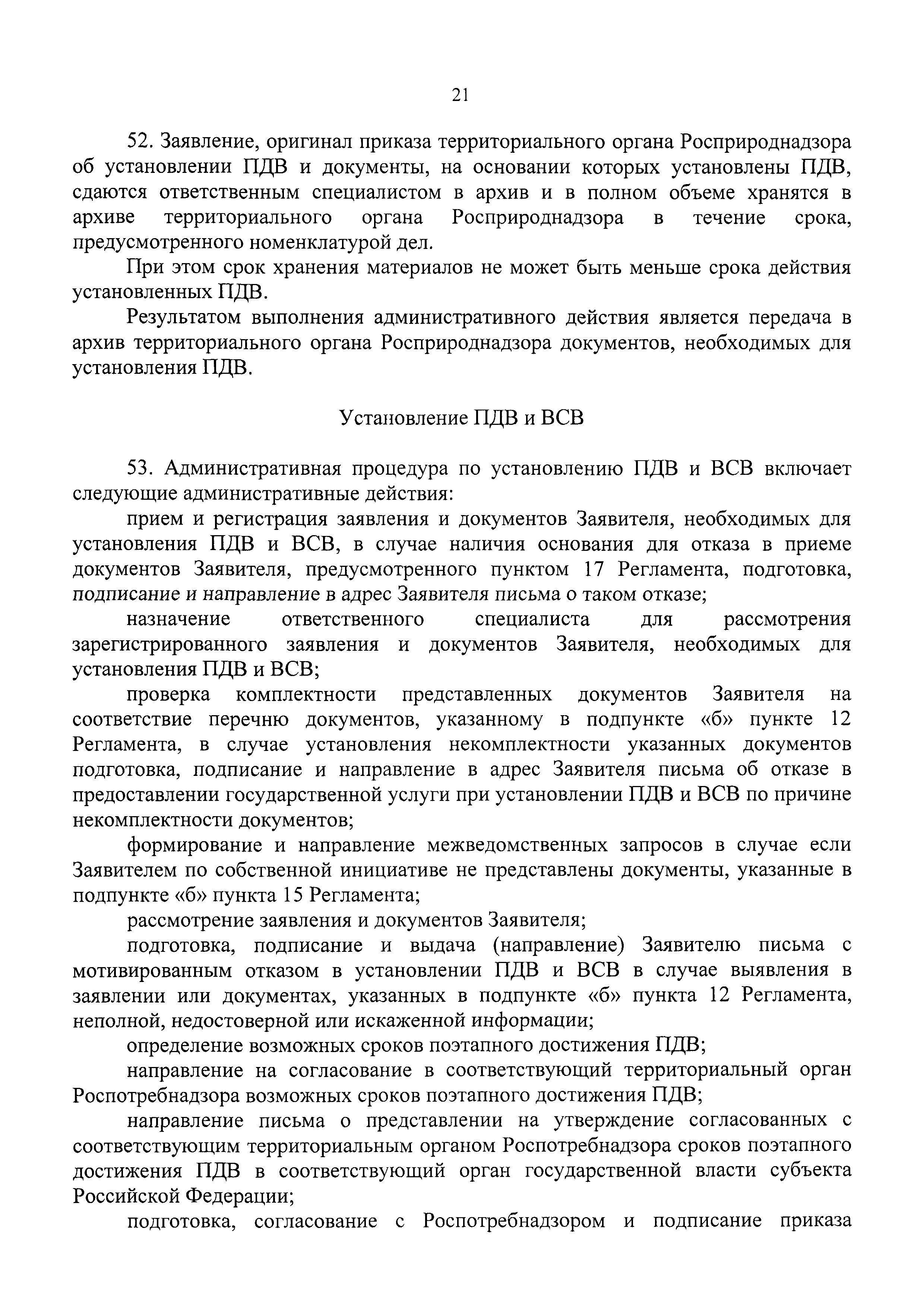 | Оглавление: | I. Общие положения II. Стандарт предоставления государственной услуги III. Состав, последовательность и сроки выполнения административных процедур, требования к порядку их выполнения IV. Формы контроля за предоставлением государственной услуги V. Досудебный (внесудебный) порядок обжалования решений и действий (бездействия) территориальных органов Росприроднадзора и их должностных лиц, предоставляющих государственную услугу Приложение № 1 Приложение № 2. Заявление об установлении предельно допустимых выбросов Приложение № 3. Заявление об установлении предельно допустимых выбросов и временно согласованных выбросов Приложение № 4. Заявление о внесении изменений в приказ территориального органа Росприроднадзора об установлении предельно допустимых выбросов Приложение № 5. Заявление о внесении изменений в приказ территориального органа Росприроднадзора об установлении предельно допустимых выбросов и временно согласованных выбросов Приложение № 6. Блок-схема предоставления государственной услуги установления ПДВ Приложение № 7. Блок-схема предоставления государственной услуги установления ПДВ и ВСВ Приложение № 8. Блок-схема исполнения административной процедуры по внесению изменений в приказ территориального органа Росприроднадзора об установлении ПДВ Приложение № 8. Блок-схема исполнения административной процедуры по внесению изменений в приказ территориального органа Росприроднадзора об установлении ПДВ и ВСВ |