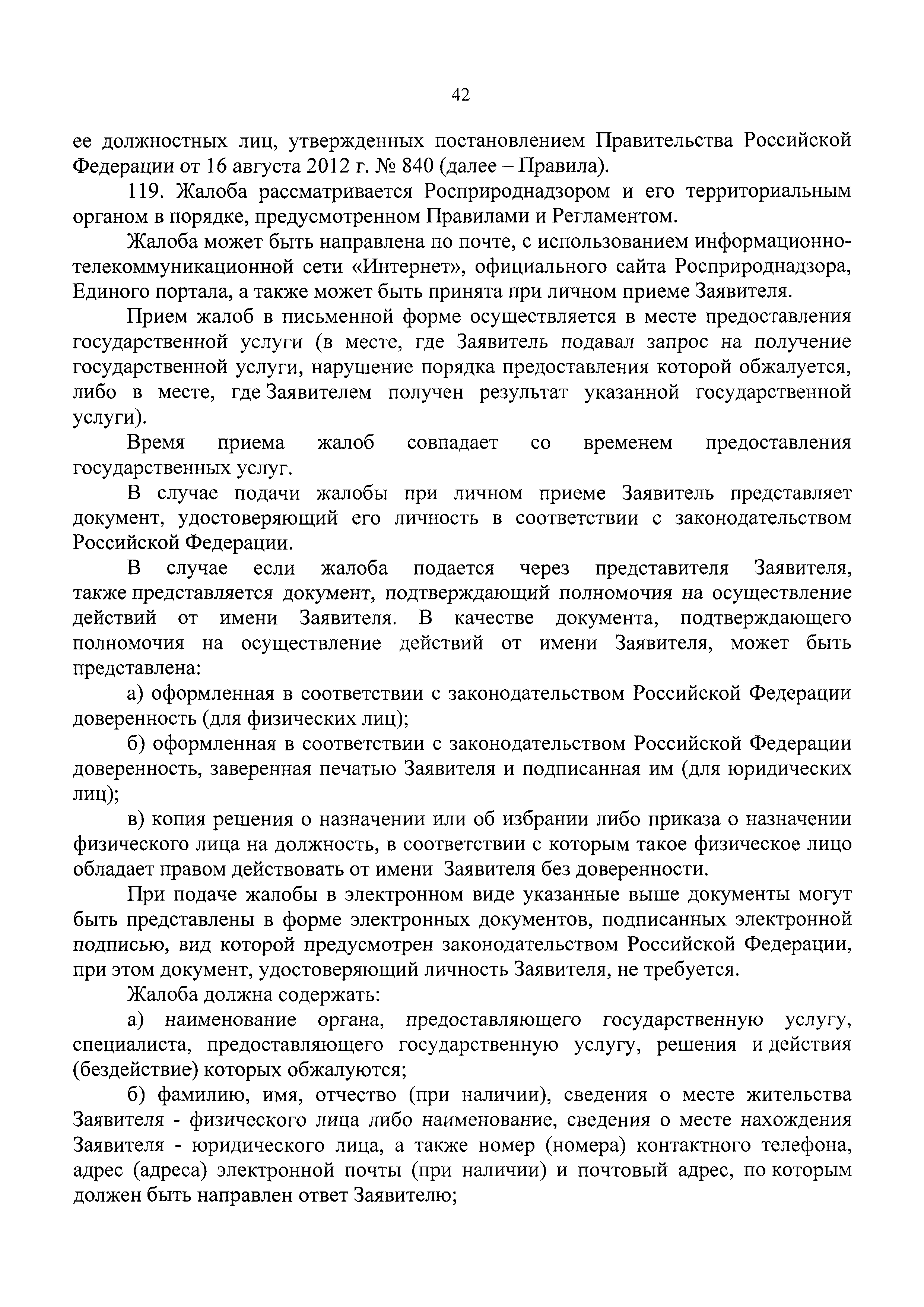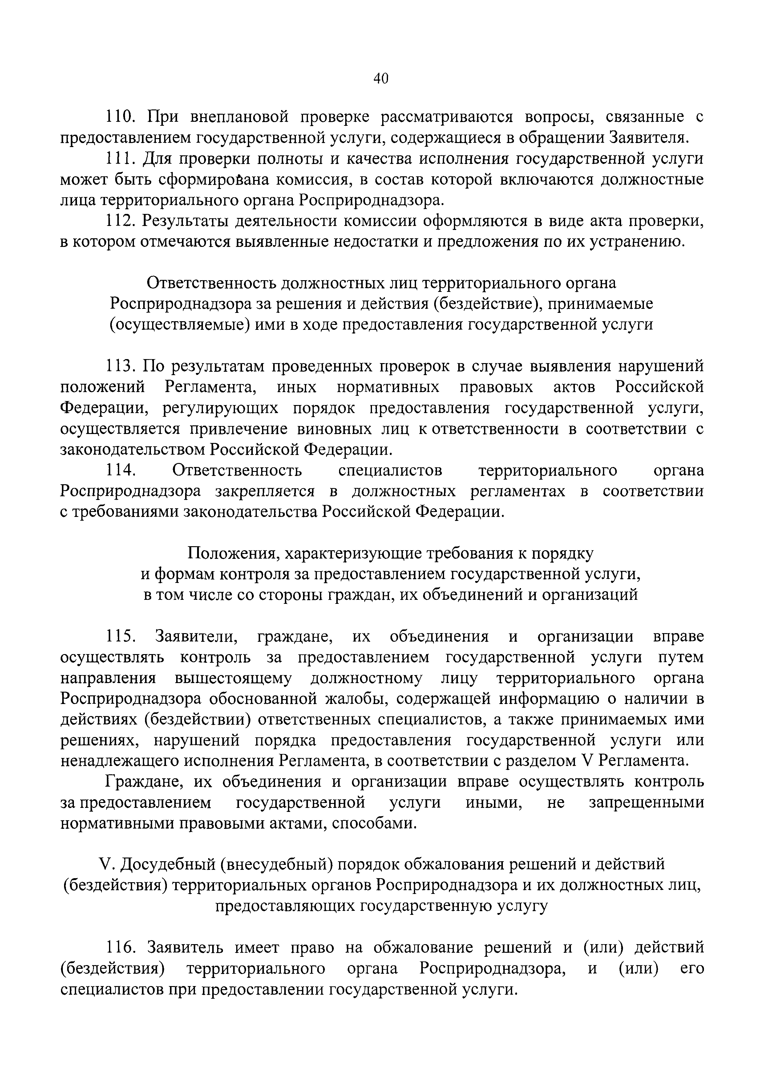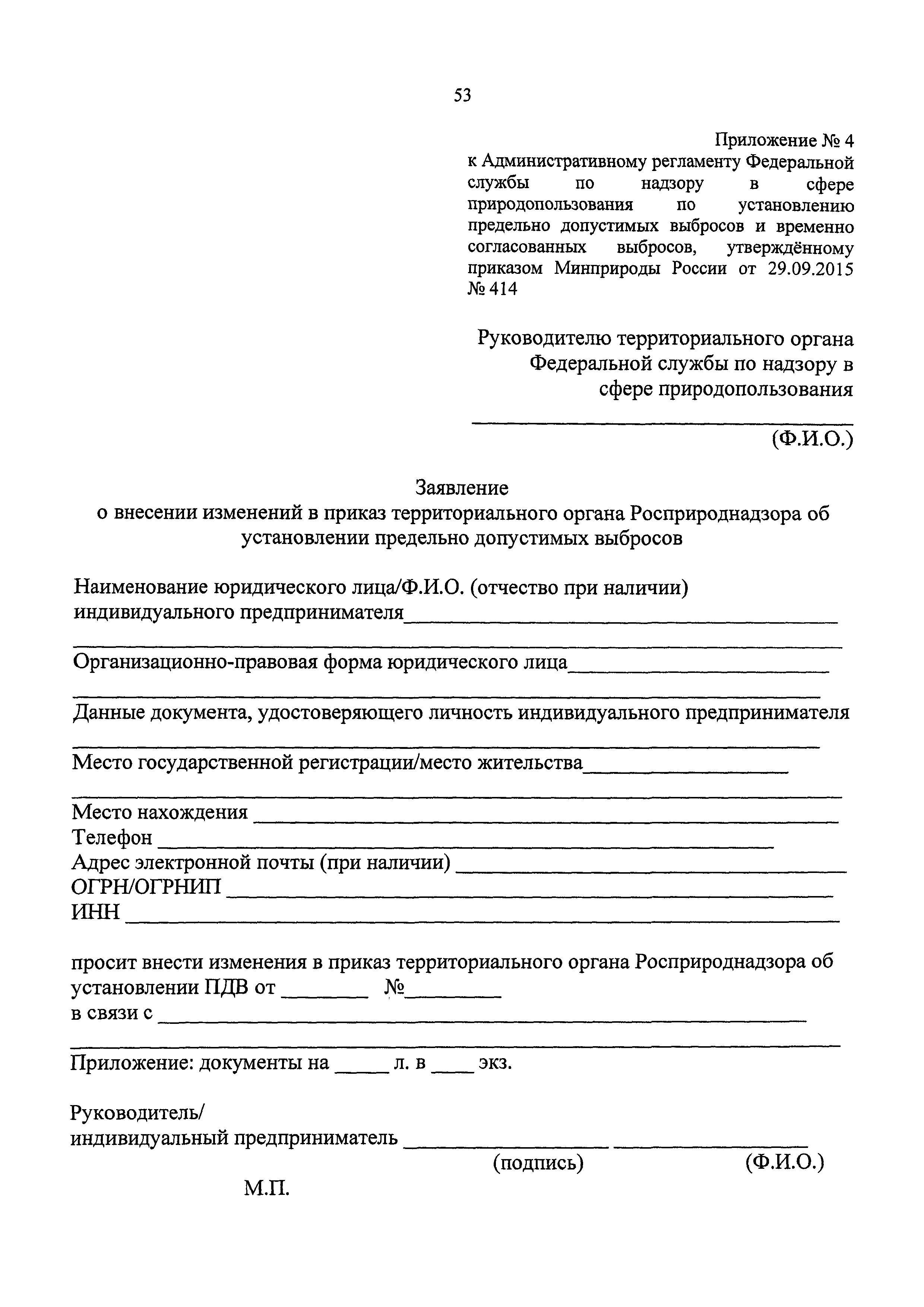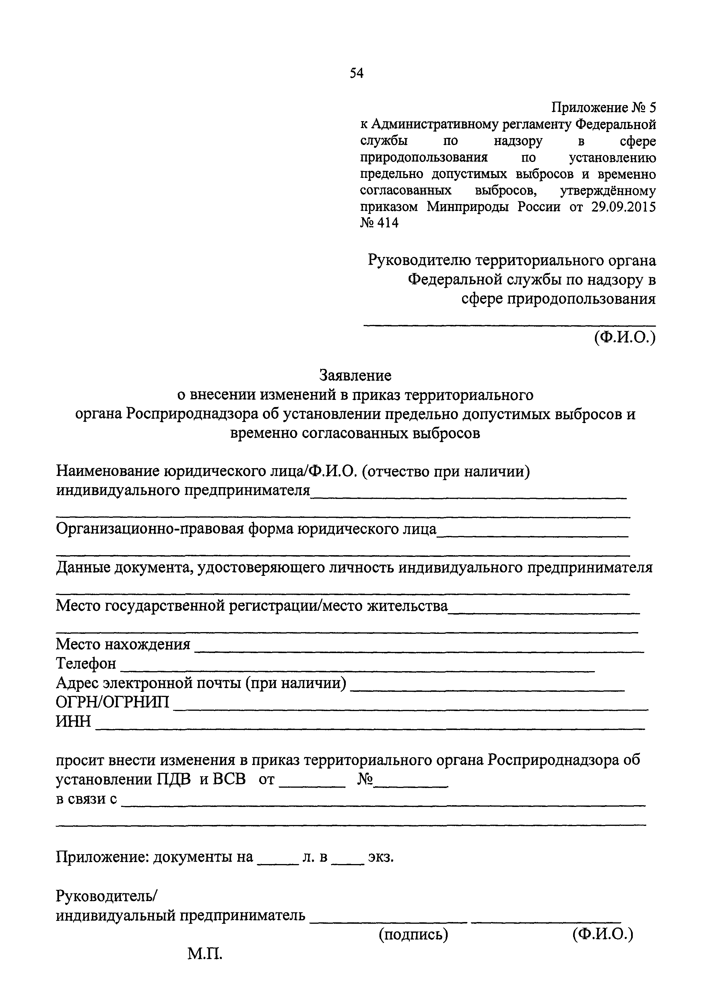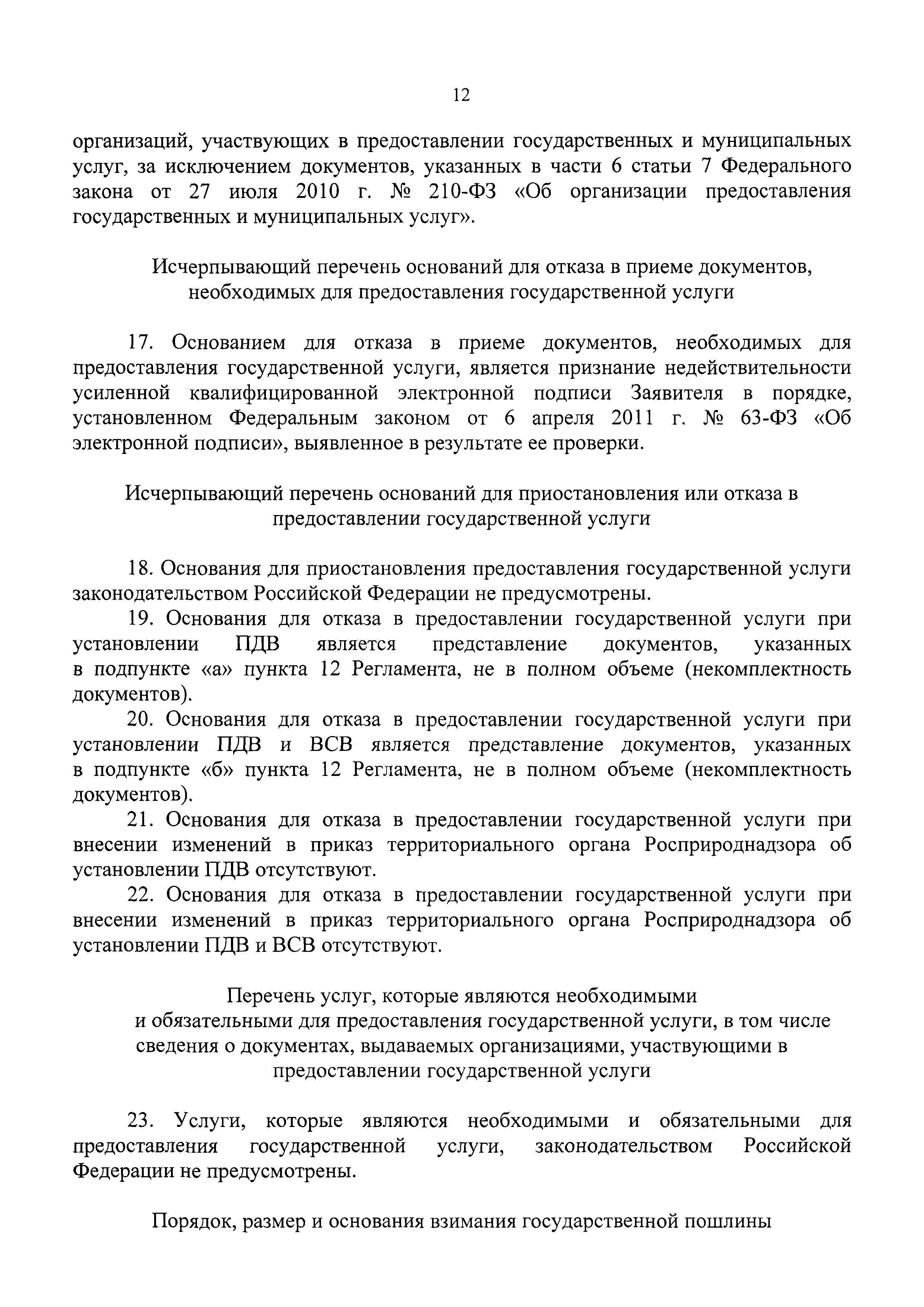 | Оглавление: | I. Общие положения II. Стандарт предоставления государственной услуги III. Состав, последовательность и сроки выполнения административных процедур, требования к порядку их выполнения IV. Формы контроля за предоставлением государственной услуги V. Досудебный (внесудебный) порядок обжалования решений и действий (бездействия) территориальных органов Росприроднадзора и их должностных лиц, предоставляющих государственную услугу Приложение № 1 Приложение № 2. Заявление об установлении предельно допустимых выбросов Приложение № 3. Заявление об установлении предельно допустимых выбросов и временно согласованных выбросов Приложение № 4. Заявление о внесении изменений в приказ территориального органа Росприроднадзора об установлении предельно допустимых выбросов Приложение № 5. Заявление о внесении изменений в приказ территориального органа Росприроднадзора об установлении предельно допустимых выбросов и временно согласованных выбросов Приложение № 6. Блок-схема предоставления государственной услуги установления ПДВ Приложение № 7. Блок-схема предоставления государственной услуги установления ПДВ и ВСВ Приложение № 8. Блок-схема исполнения административной процедуры по внесению изменений в приказ территориального органа Росприроднадзора об установлении ПДВ Приложение № 8. Блок-схема исполнения административной процедуры по внесению изменений в приказ территориального органа Росприроднадзора об установлении ПДВ и ВСВ |