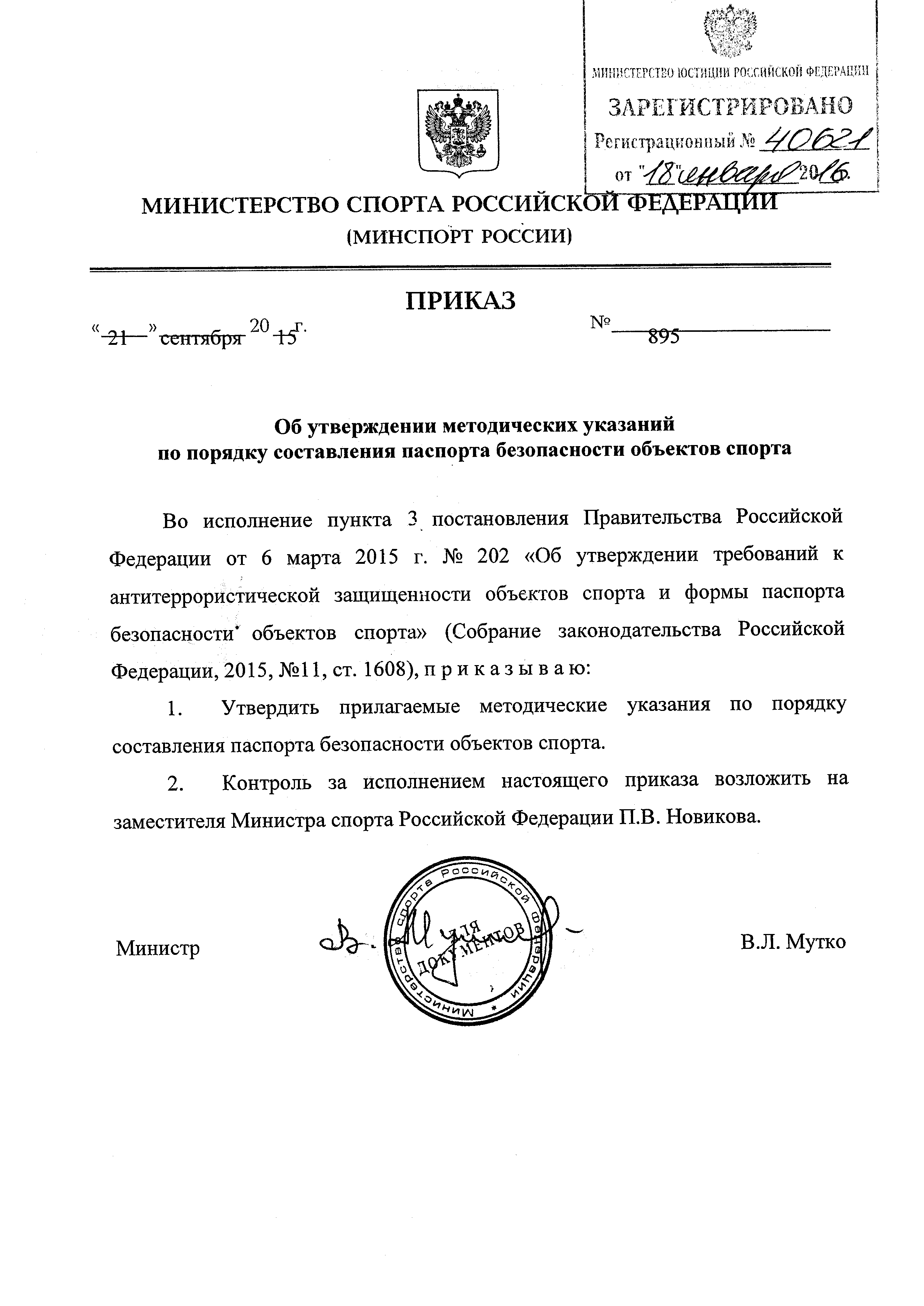 | Утверждён: | 21.09.2015 Министерство спорта РФ (895)