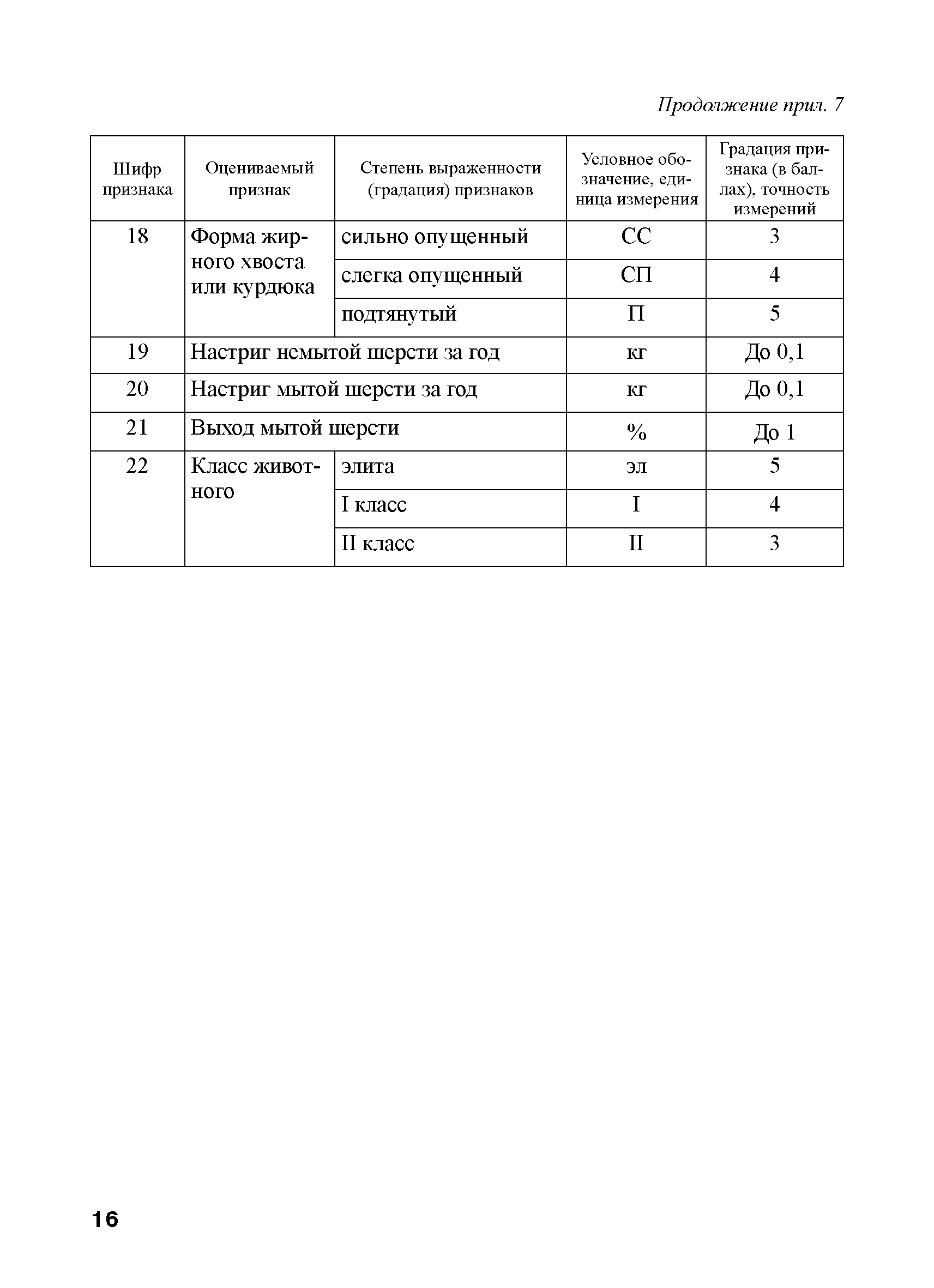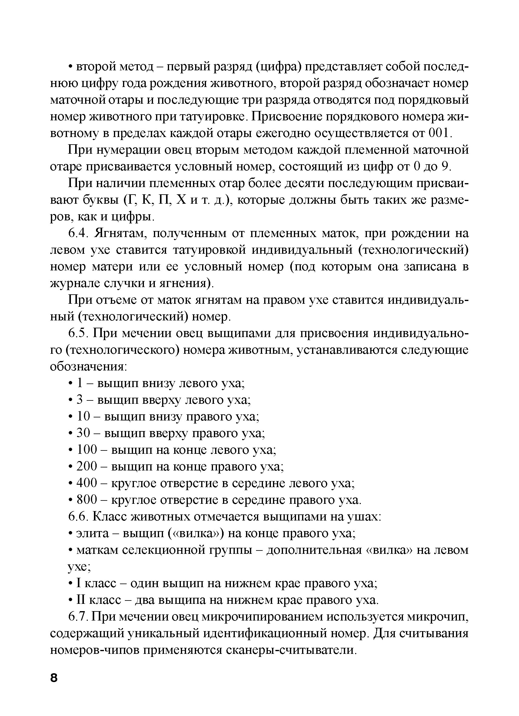 | Оглавление: | I Цель и организация проведения бонитировки II Оценка племенных и продуктивных качеств овец III Требования к овцам IV Разделение овец на классы V Бонитировочный ключ VI Мечение овец Приложение 1. Признаки, оцениваемые при бонитировке овец различных половозрастных групп Приложение 2. Подразделение шерсти овец на классы Приложение 3. Минимальные требования к показателям продуктивности овец Приложение 4. Минимальные требования к показателям продуктивности ягнят при отъеме от маток в возрасте четырех месяцев Приложение 5. Минимальные требования к скороспелости овец Приложение 6. Шкала условных обозначений и шифров полугрубошерстных пород овец Приложение 7. Шкала условных обозначений и шифров оцениваемых признаков овец Приложение 8. Шкала условных обозначений и шифров дальнейшего использования животных |