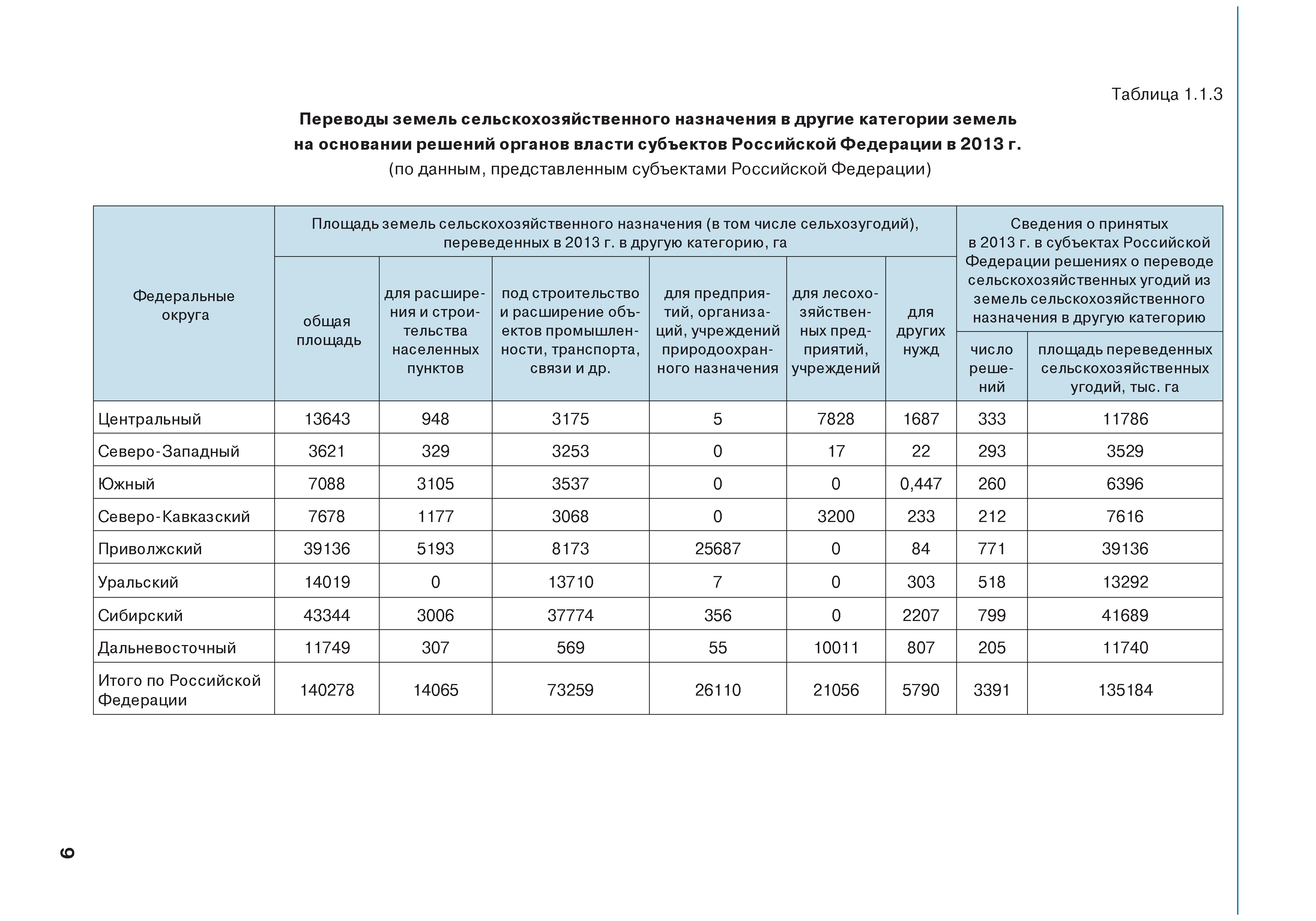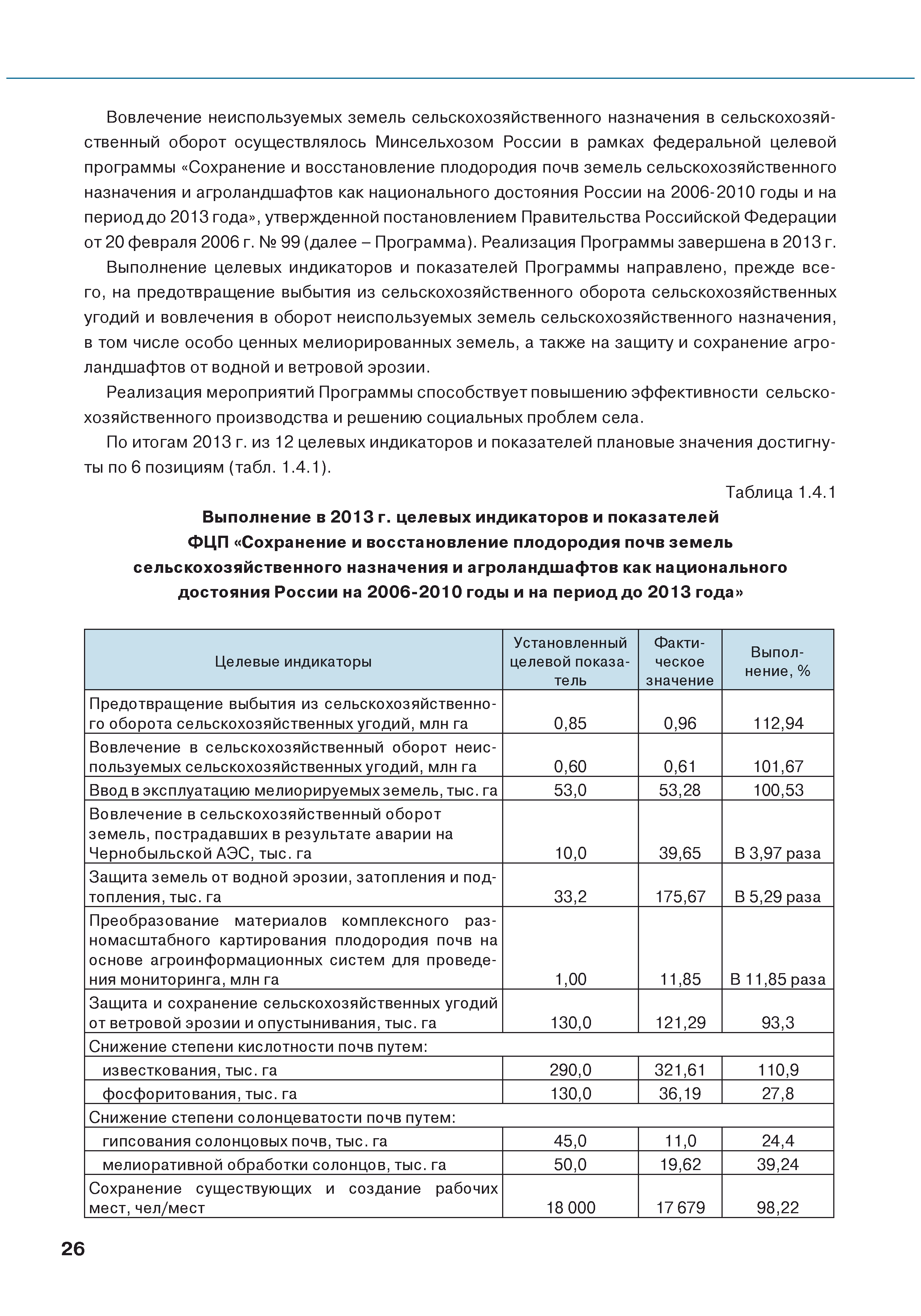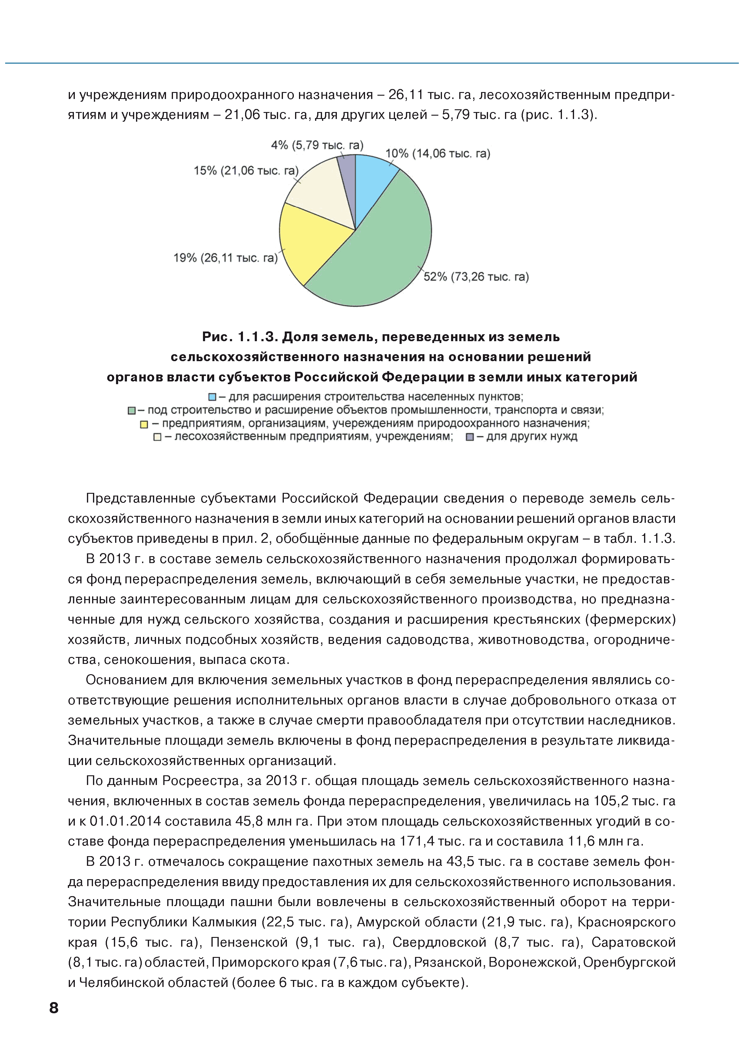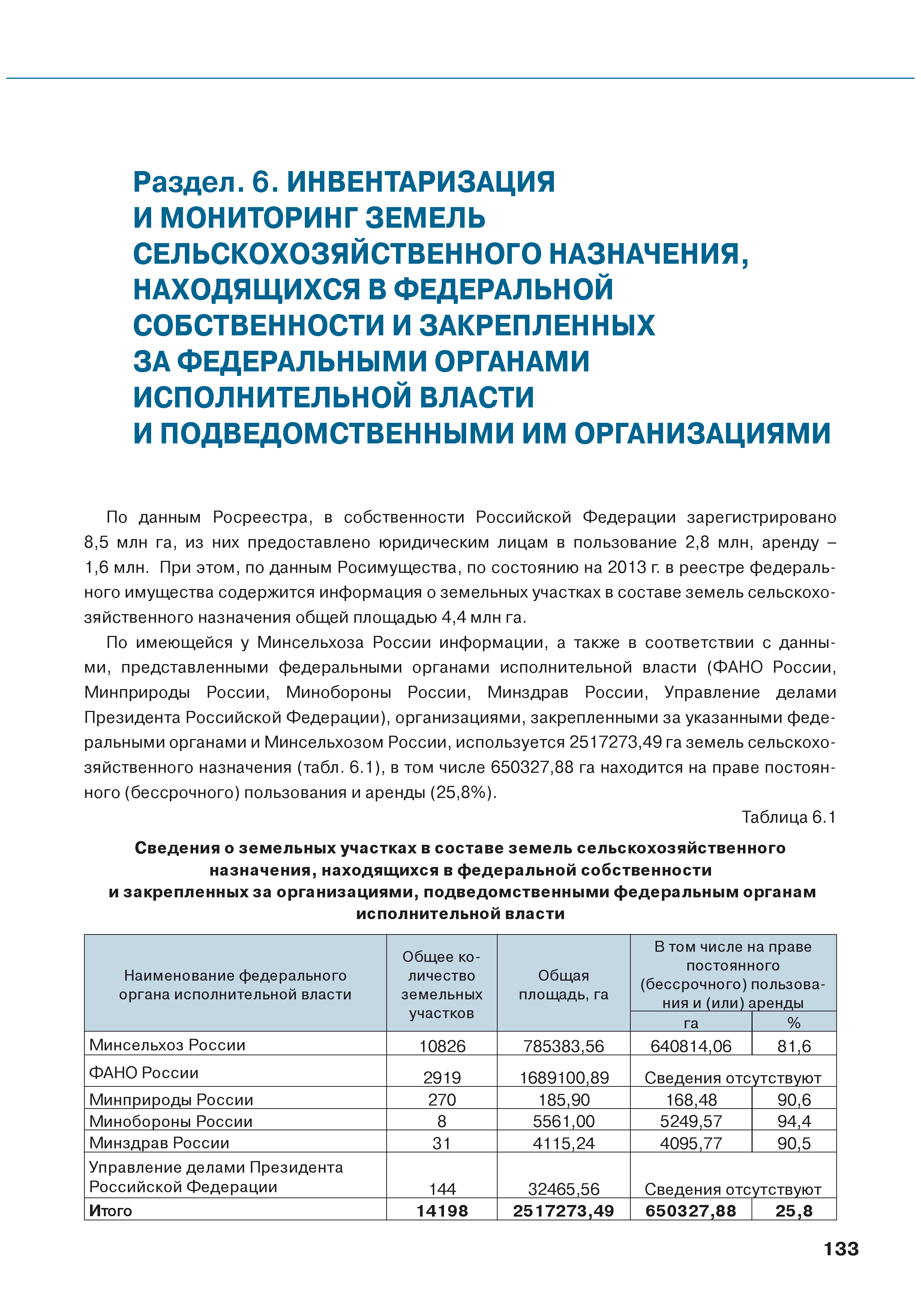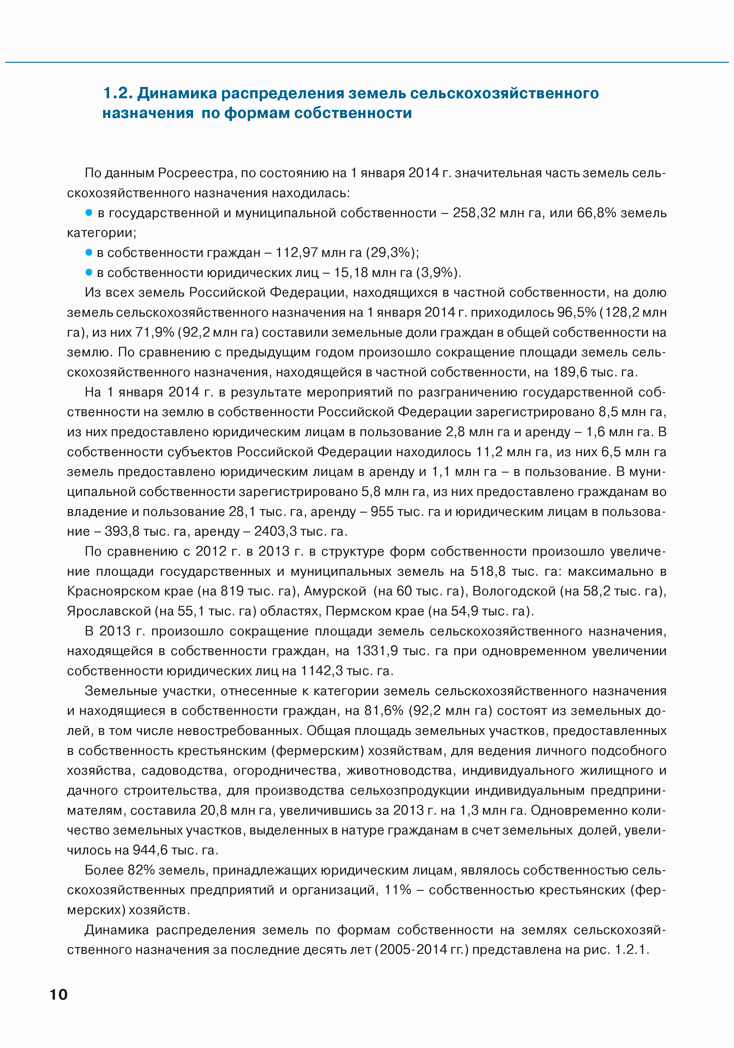 | Оглавление: | Введение 1. Использование земель сельскохозяйственного назначения в Российской Федерации 1.1. Структура земель сельскохозяйственного назначения в Российской Федерации и динамика их площадей с оценкой влияния различных факторов 1.2. Динамика распределения земель сельскохозяйственного назначения по формам собственности 1.3. Невостребованные земельные доли 1.4. Неиспользуемые земли сельскохозяйственного назначения и их вовлечение в сельскохозяйственный оборот 2. Состояние земель сельскохозяйственного назначения в Российской Федерации 2.1. Государственная кадастровая оценка земель сельскохозяйственного назначения 2.2. Состояние плодородия земель сельскохозяйственного назначения 2.3. Мониторинг (оценка) негативных процессов на землях сельскохозяйственного назначения 2.4. Состояние посевных площадей и урожайность сельскохозяйственных угодий 2.5. Состояние и использование мелиорированных земель 2.6. Особо ценные сельскохозяйственные земли 3. Нормативно-правовое регупирование использования земель сельскохозяйственного назначения 3.1. Совершенствование нормативной правовой базы в части использования земель сельскохозяйственного назначения 3.2. Государственная поддержка крестьянских (фермерских) хозяйств при оформлении земельных участков в собственность 4. Результаты деятельности россельхознадзора по осуществлению государственного земельного надзора на землях сельскохозяйственного назначения 5. Развитие государственного мониторинга земель сельскохозяйственного назначения 5.1. Совершенствование нормативной правовой базы государственного мониторинга земель сельскохозяйственного назначения 5.2. Формирование государственных информационных ресурсов о землях сельскохозяйственного назначения 5.3. Региональный опыт работы по осуществлению государственного мониторинга земель, используемых или предоставленных для ведения сельского хозяйства 6. Инвентаризация и мониторинг земель сельскохозяйственного назначения, находящихся в федеральной собственности и закрепленных за федеральными органами исполнительной власти и подведомственными им организациями Заключение Приложение 1. Структура земель сельскохозяйственного назначения Российской Федерации Приложение 2. Сведения о переводах земель сельскохозяйственного назначения в другие категории земель на основании решений органов власти субъектов Российской Федерации в 2013г. (по данным субъектов Российской Федерации) Приложение 3. Сведения о неиспользуемых землях сельскохозяйственного назначения Приложение 4. Выполнение основных индикаторов |