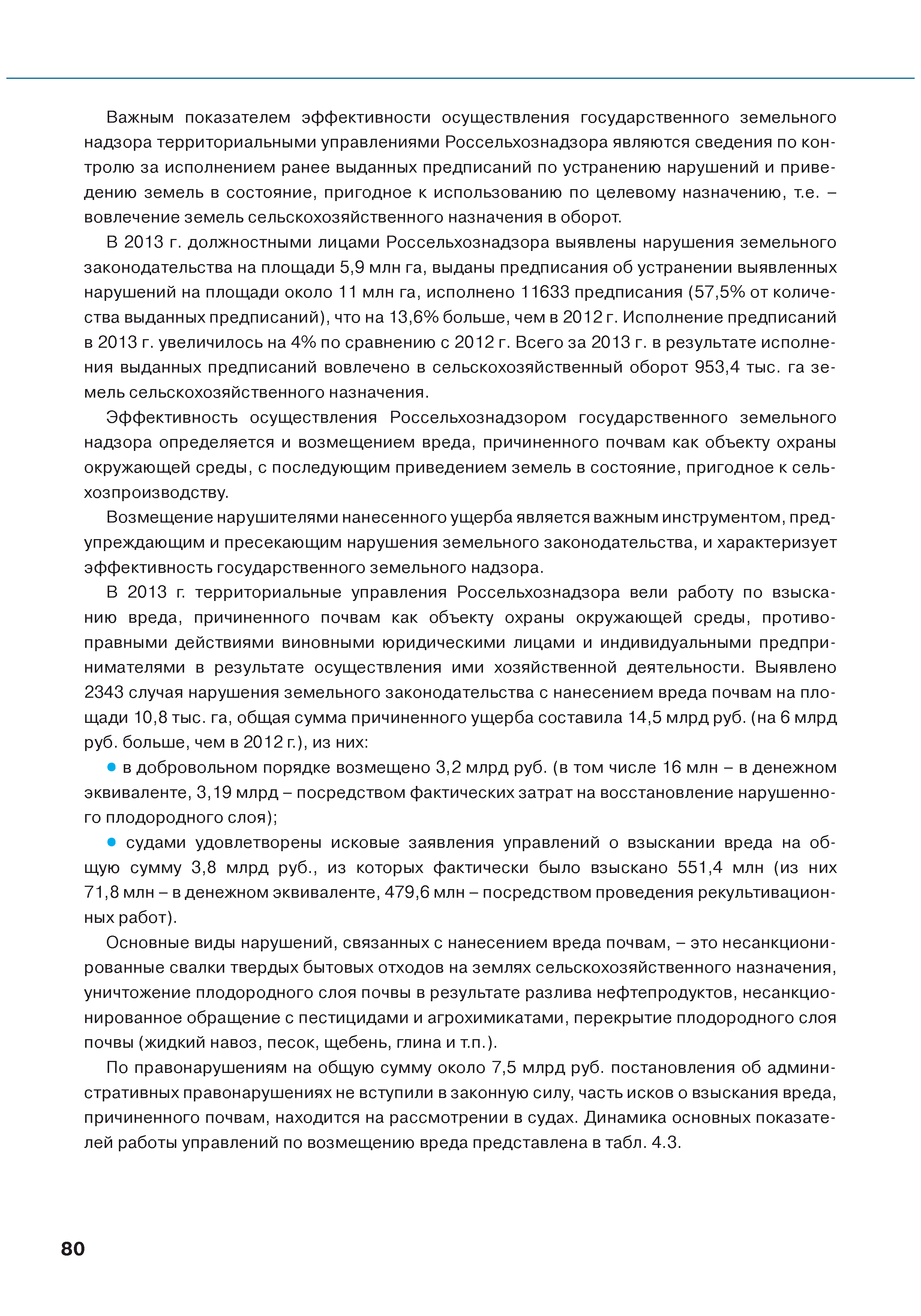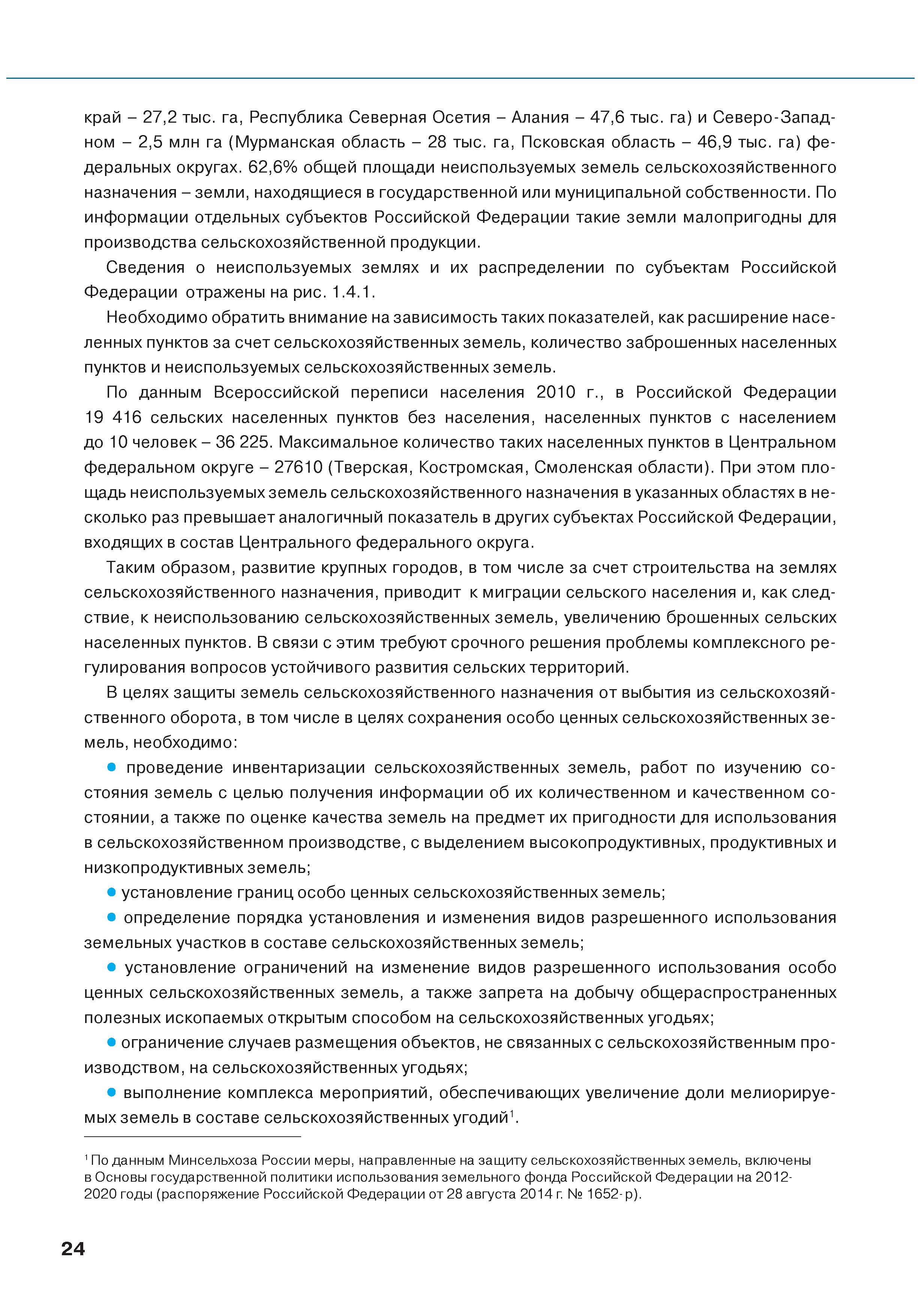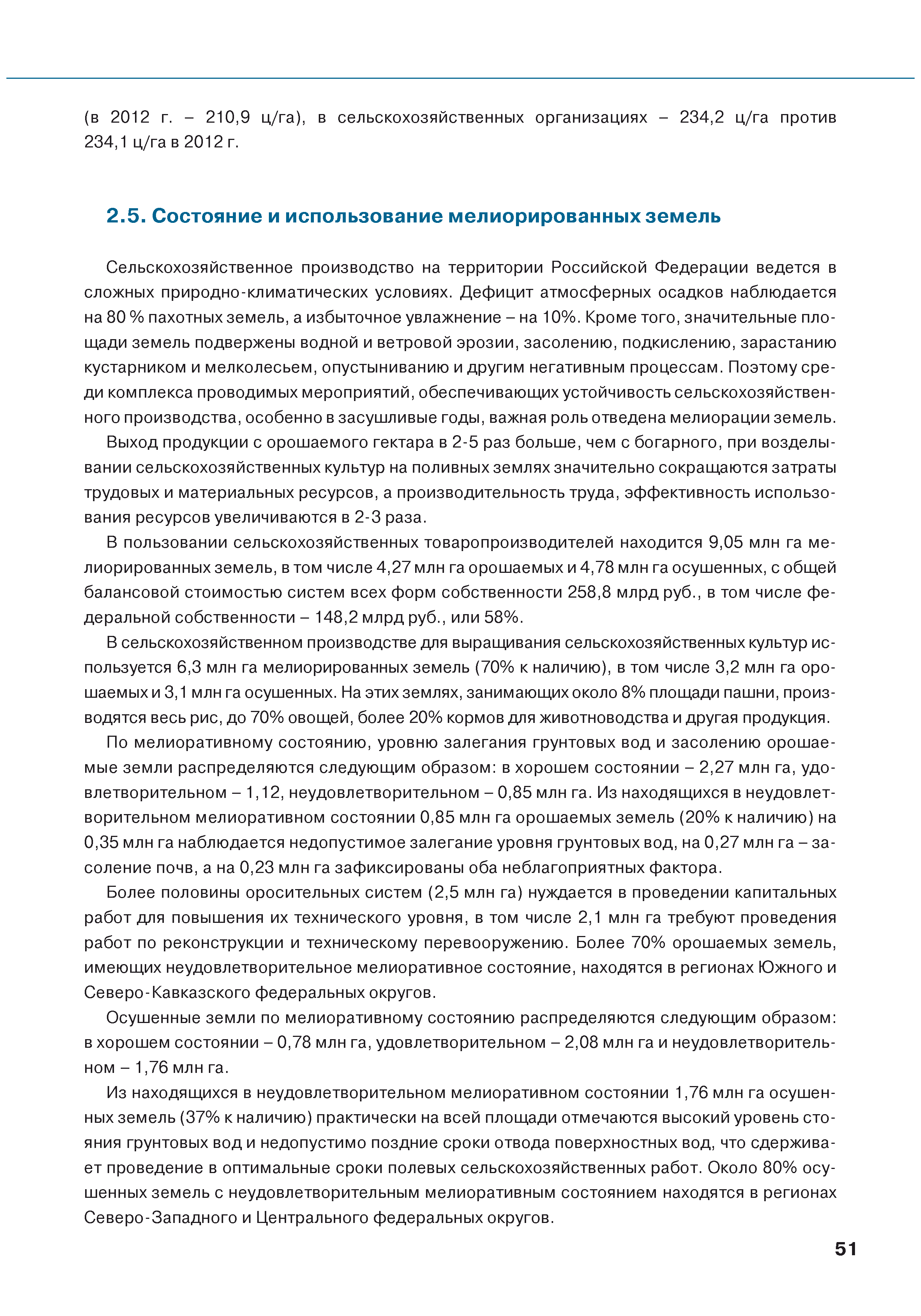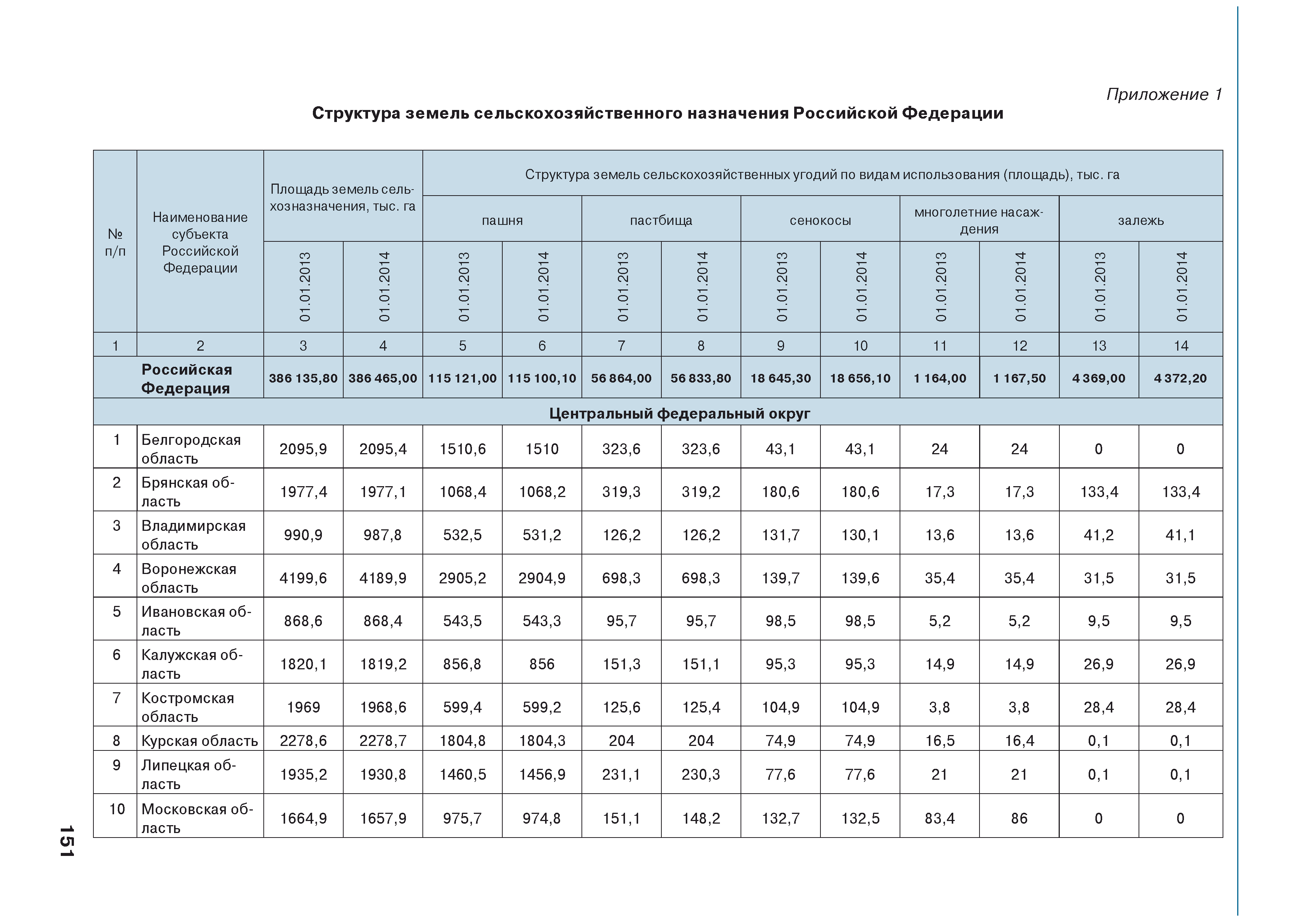 | Оглавление: | Введение 1. Использование земель сельскохозяйственного назначения в Российской Федерации 1.1. Структура земель сельскохозяйственного назначения в Российской Федерации и динамика их площадей с оценкой влияния различных факторов 1.2. Динамика распределения земель сельскохозяйственного назначения по формам собственности 1.3. Невостребованные земельные доли 1.4. Неиспользуемые земли сельскохозяйственного назначения и их вовлечение в сельскохозяйственный оборот 2. Состояние земель сельскохозяйственного назначения в Российской Федерации 2.1. Государственная кадастровая оценка земель сельскохозяйственного назначения 2.2. Состояние плодородия земель сельскохозяйственного назначения 2.3. Мониторинг (оценка) негативных процессов на землях сельскохозяйственного назначения 2.4. Состояние посевных площадей и урожайность сельскохозяйственных угодий 2.5. Состояние и использование мелиорированных земель 2.6. Особо ценные сельскохозяйственные земли 3. Нормативно-правовое регупирование использования земель сельскохозяйственного назначения 3.1. Совершенствование нормативной правовой базы в части использования земель сельскохозяйственного назначения 3.2. Государственная поддержка крестьянских (фермерских) хозяйств при оформлении земельных участков в собственность 4. Результаты деятельности россельхознадзора по осуществлению государственного земельного надзора на землях сельскохозяйственного назначения 5. Развитие государственного мониторинга земель сельскохозяйственного назначения 5.1. Совершенствование нормативной правовой базы государственного мониторинга земель сельскохозяйственного назначения 5.2. Формирование государственных информационных ресурсов о землях сельскохозяйственного назначения 5.3. Региональный опыт работы по осуществлению государственного мониторинга земель, используемых или предоставленных для ведения сельского хозяйства 6. Инвентаризация и мониторинг земель сельскохозяйственного назначения, находящихся в федеральной собственности и закрепленных за федеральными органами исполнительной власти и подведомственными им организациями Заключение Приложение 1. Структура земель сельскохозяйственного назначения Российской Федерации Приложение 2. Сведения о переводах земель сельскохозяйственного назначения в другие категории земель на основании решений органов власти субъектов Российской Федерации в 2013г. (по данным субъектов Российской Федерации) Приложение 3. Сведения о неиспользуемых землях сельскохозяйственного назначения Приложение 4. Выполнение основных индикаторов |