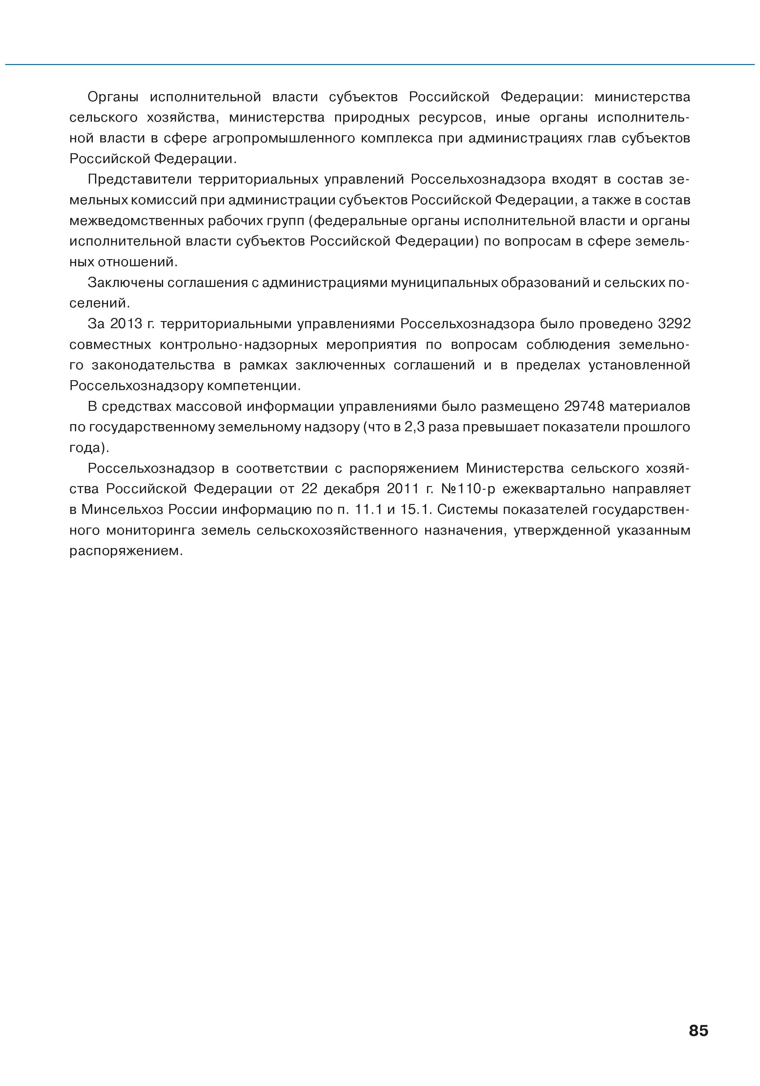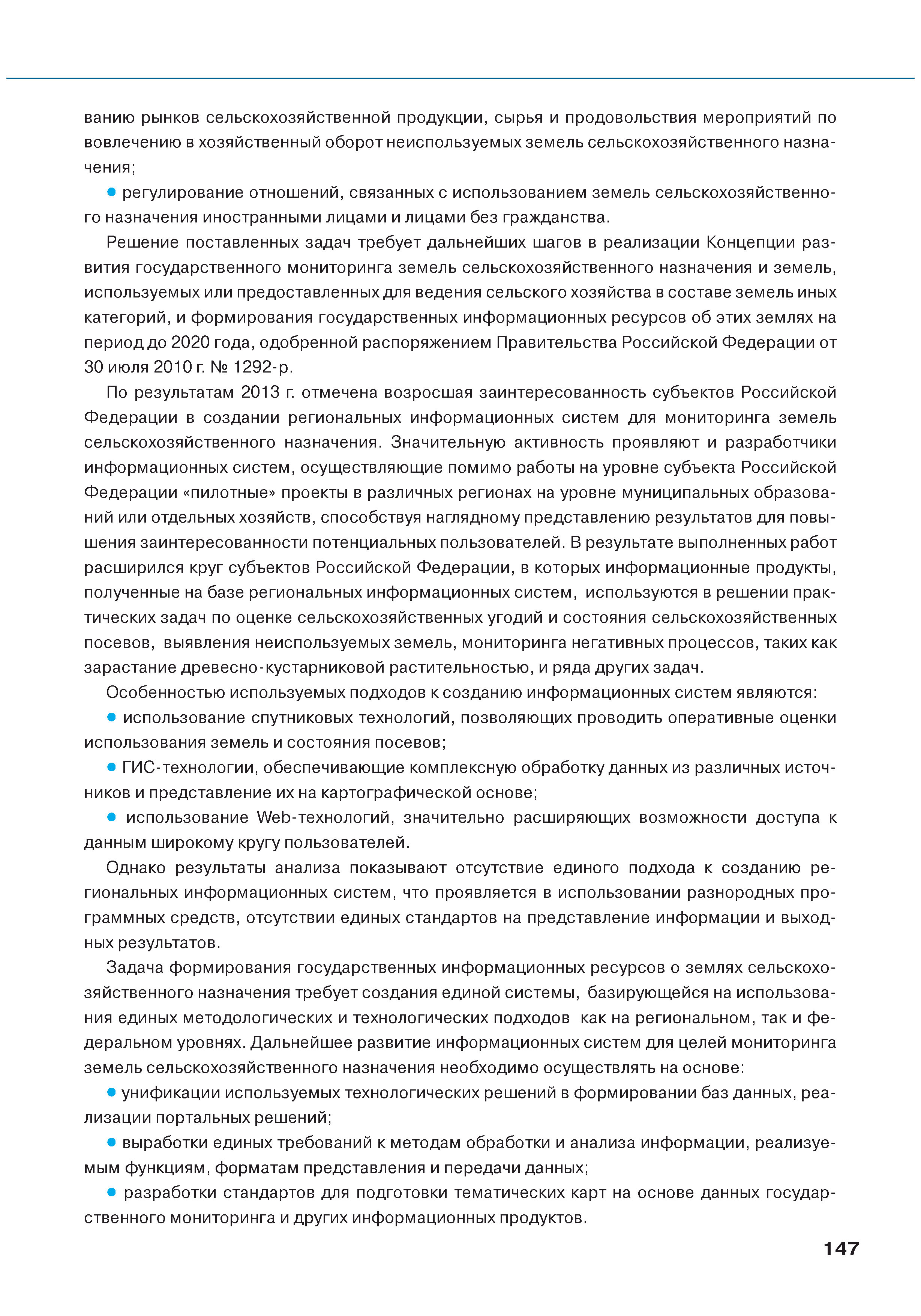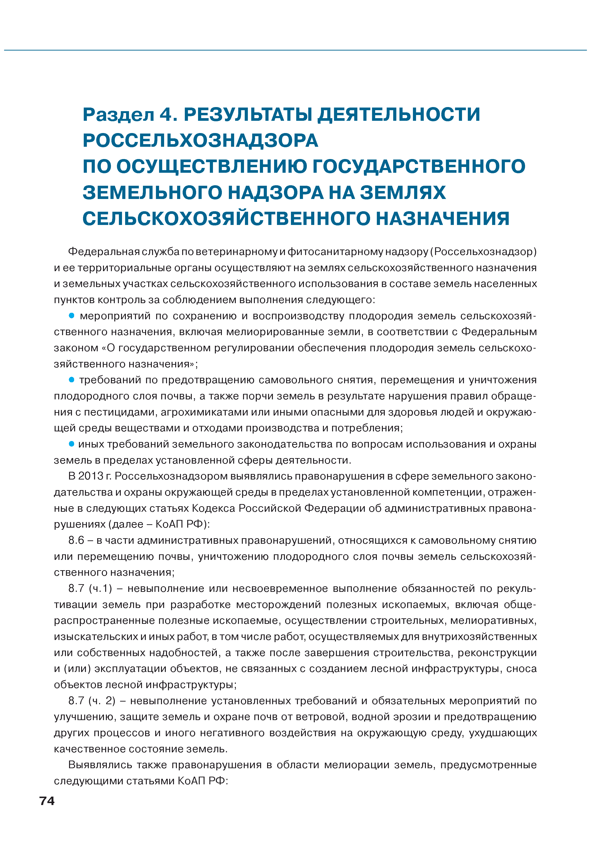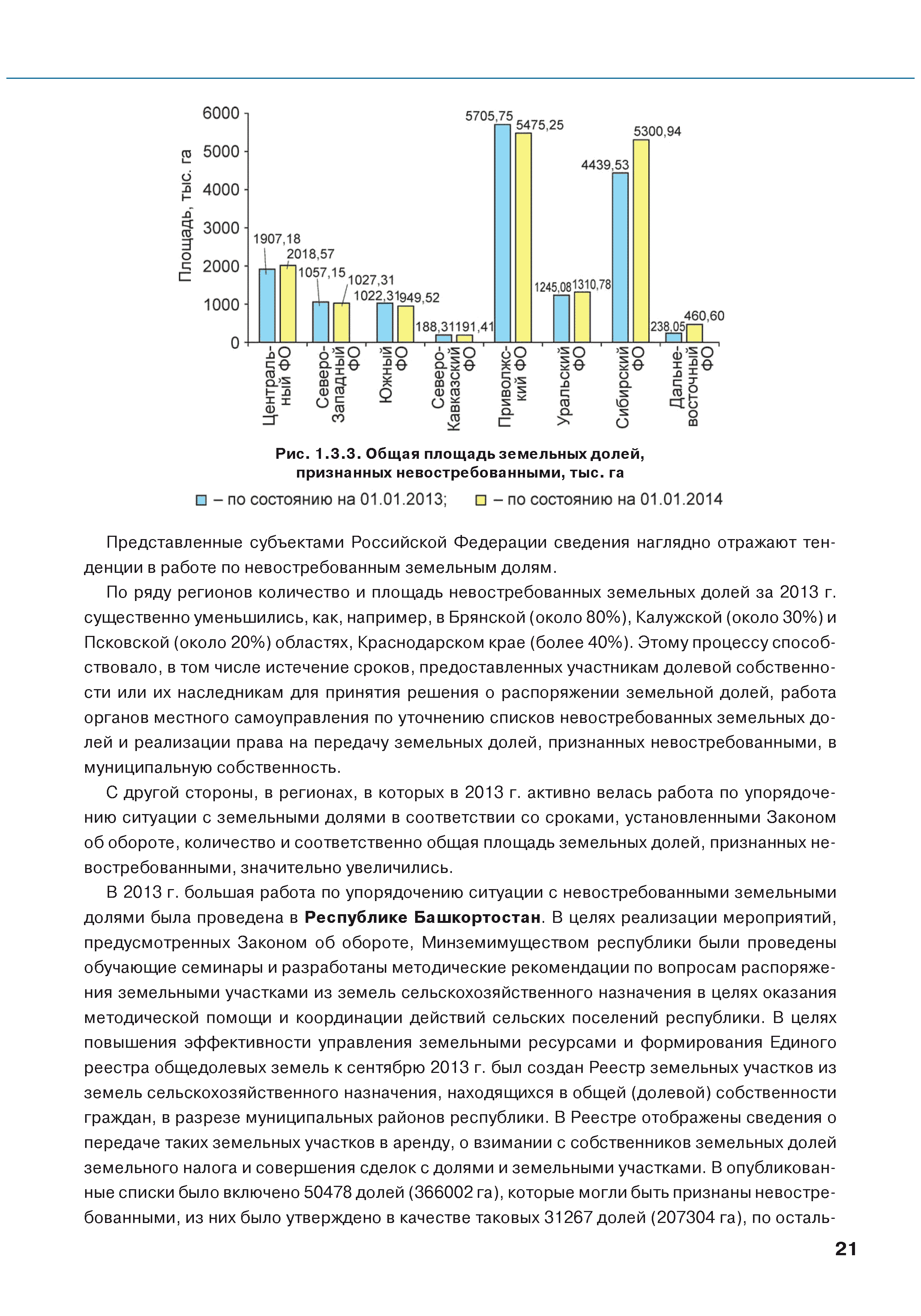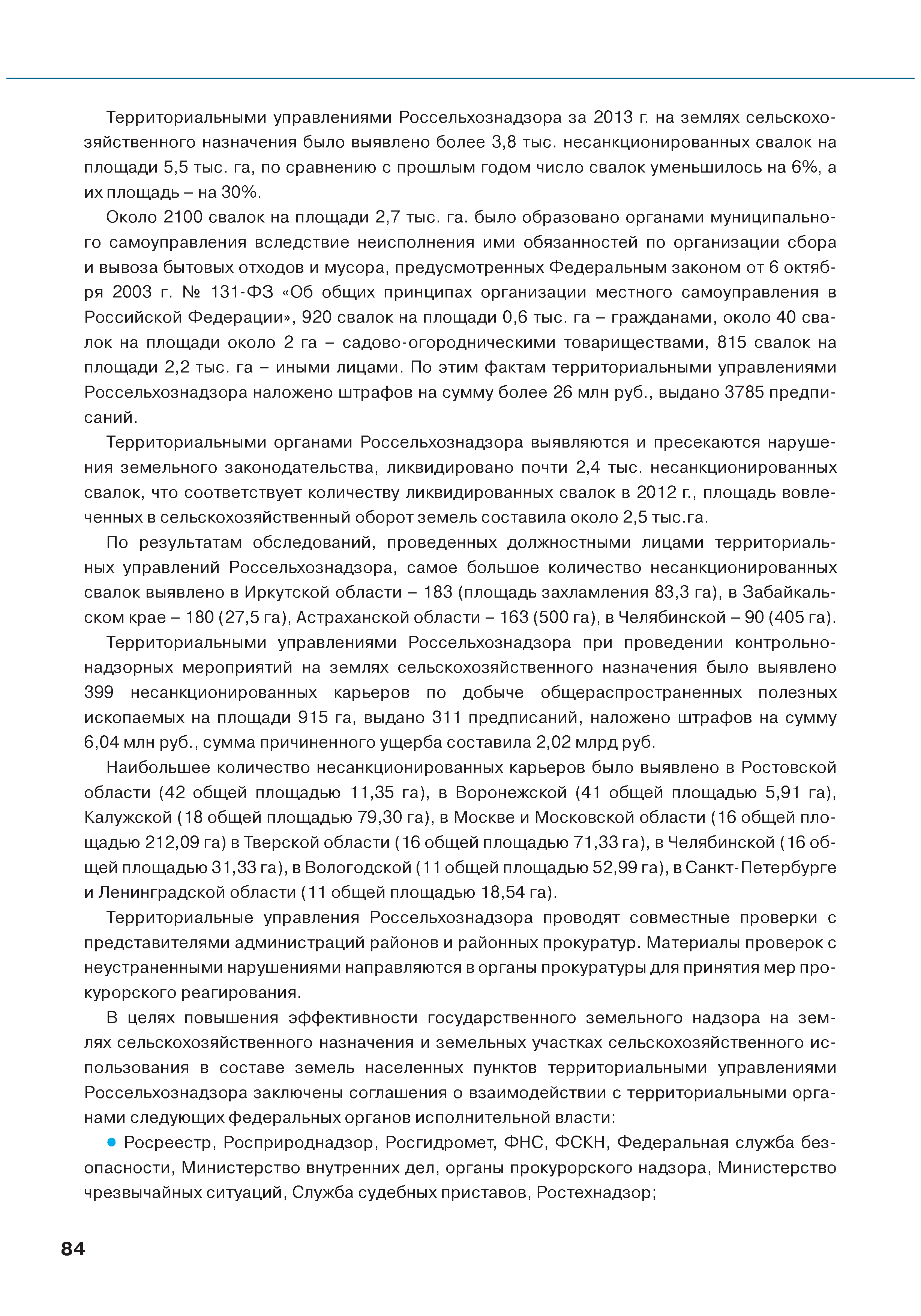 | Оглавление: | Введение 1. Использование земель сельскохозяйственного назначения в Российской Федерации 1.1. Структура земель сельскохозяйственного назначения в Российской Федерации и динамика их площадей с оценкой влияния различных факторов 1.2. Динамика распределения земель сельскохозяйственного назначения по формам собственности 1.3. Невостребованные земельные доли 1.4. Неиспользуемые земли сельскохозяйственного назначения и их вовлечение в сельскохозяйственный оборот 2. Состояние земель сельскохозяйственного назначения в Российской Федерации 2.1. Государственная кадастровая оценка земель сельскохозяйственного назначения 2.2. Состояние плодородия земель сельскохозяйственного назначения 2.3. Мониторинг (оценка) негативных процессов на землях сельскохозяйственного назначения 2.4. Состояние посевных площадей и урожайность сельскохозяйственных угодий 2.5. Состояние и использование мелиорированных земель 2.6. Особо ценные сельскохозяйственные земли 3. Нормативно-правовое регупирование использования земель сельскохозяйственного назначения 3.1. Совершенствование нормативной правовой базы в части использования земель сельскохозяйственного назначения 3.2. Государственная поддержка крестьянских (фермерских) хозяйств при оформлении земельных участков в собственность 4. Результаты деятельности россельхознадзора по осуществлению государственного земельного надзора на землях сельскохозяйственного назначения 5. Развитие государственного мониторинга земель сельскохозяйственного назначения 5.1. Совершенствование нормативной правовой базы государственного мониторинга земель сельскохозяйственного назначения 5.2. Формирование государственных информационных ресурсов о землях сельскохозяйственного назначения 5.3. Региональный опыт работы по осуществлению государственного мониторинга земель, используемых или предоставленных для ведения сельского хозяйства 6. Инвентаризация и мониторинг земель сельскохозяйственного назначения, находящихся в федеральной собственности и закрепленных за федеральными органами исполнительной власти и подведомственными им организациями Заключение Приложение 1. Структура земель сельскохозяйственного назначения Российской Федерации Приложение 2. Сведения о переводах земель сельскохозяйственного назначения в другие категории земель на основании решений органов власти субъектов Российской Федерации в 2013г. (по данным субъектов Российской Федерации) Приложение 3. Сведения о неиспользуемых землях сельскохозяйственного назначения Приложение 4. Выполнение основных индикаторов |