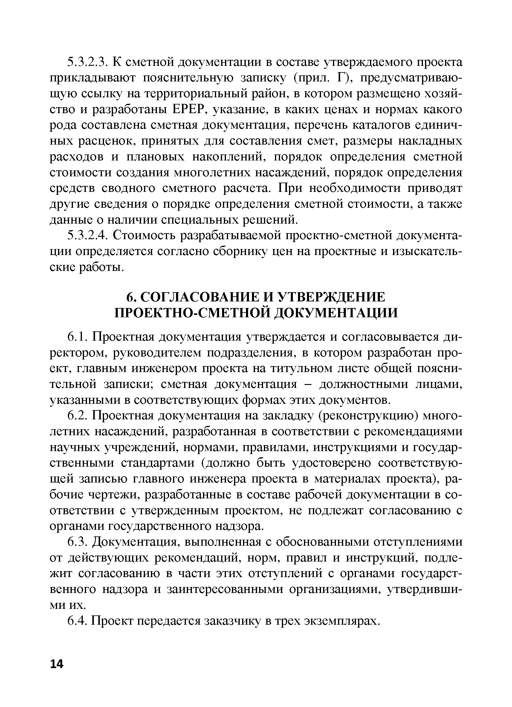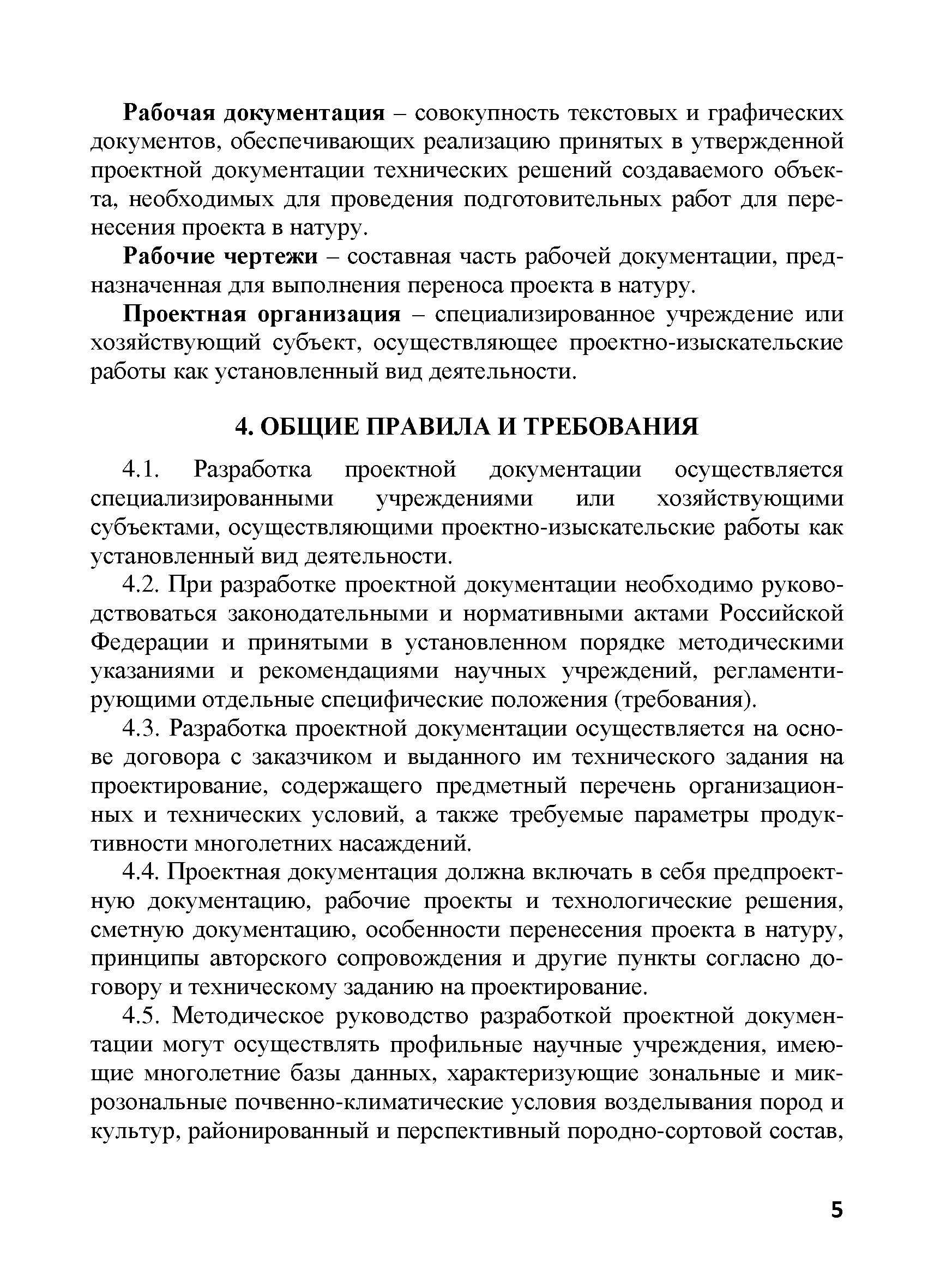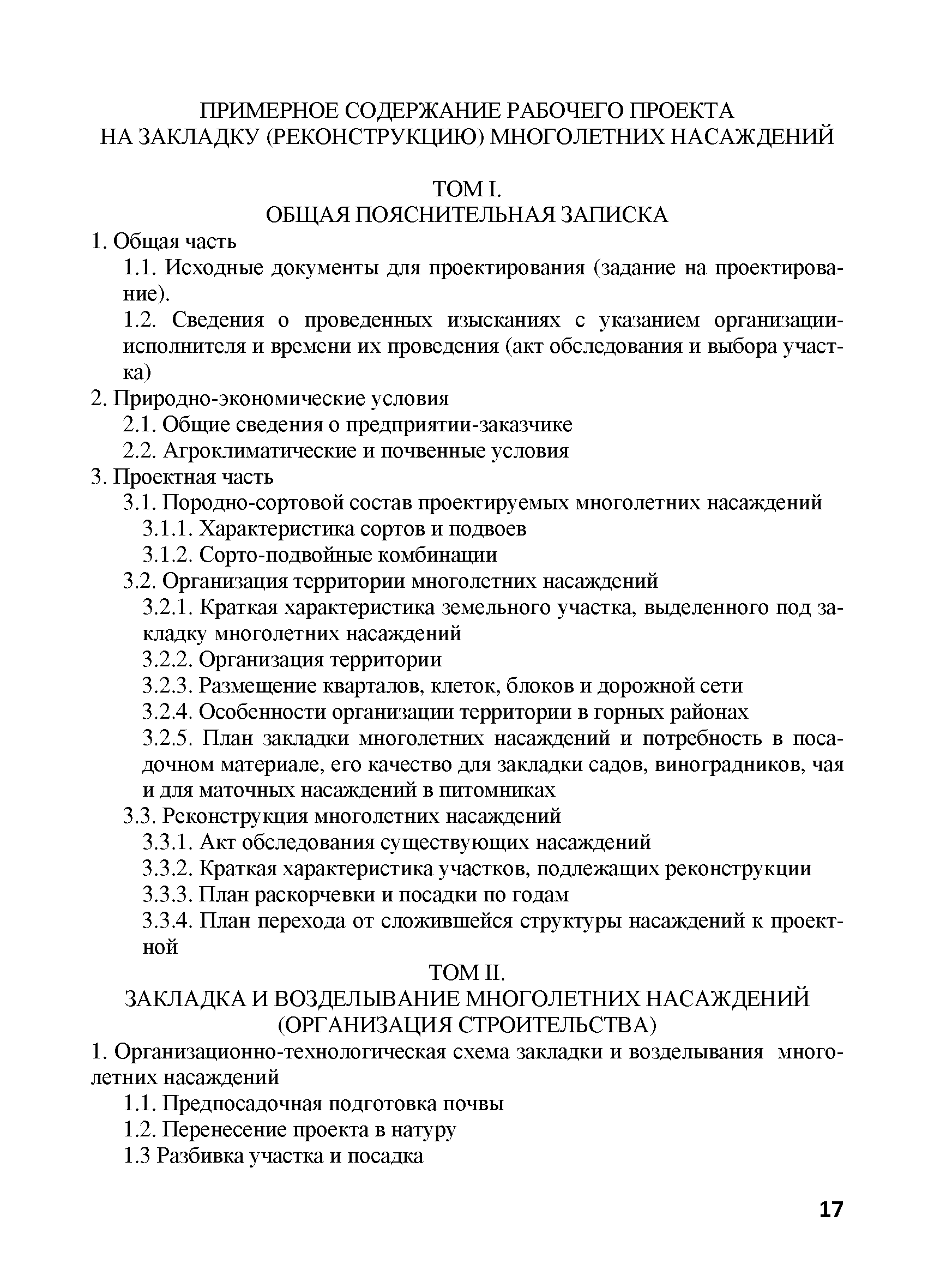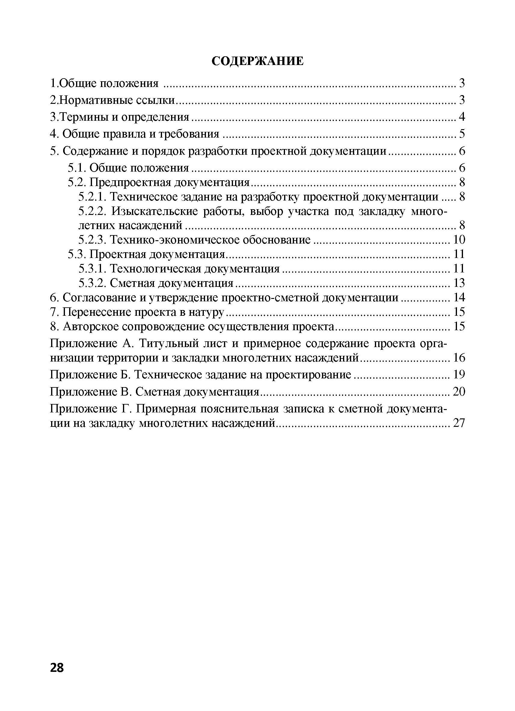 | Оглавление: | 1. Общие положения 2. Нормативные ссылки 3. Термины и определения 4. Общие правила и требования 5. Содержание и порядок разработки проектной документации 5.1. Общие положения 5.2. Предпроектная документация 5.2.1. Техническое задание на разработку проектной документации 5.2.2. Изыскательские работы, выбор участка под закладку многолетних насаждений 5.2.3. Технико-экономическое обоснование 5.3. Проектная документация 5.3.1. Технологическая документация 5.3.2. Сметная документация 6. Согласование и утверждение проектно-сметной документации 7. Перенесение проекта в натуру 8. Авторское сопровождение осуществления проекта Приложение А. Титульный лист и примерное содержание проекта организации территории и закладки многолетних насаждений Приложение Б. Техническое задание на проектирование Приложение В. Сметная документация Приложение Г. Примерная пояснительная записка к сметной документации на закладку многолетних насаждений |
