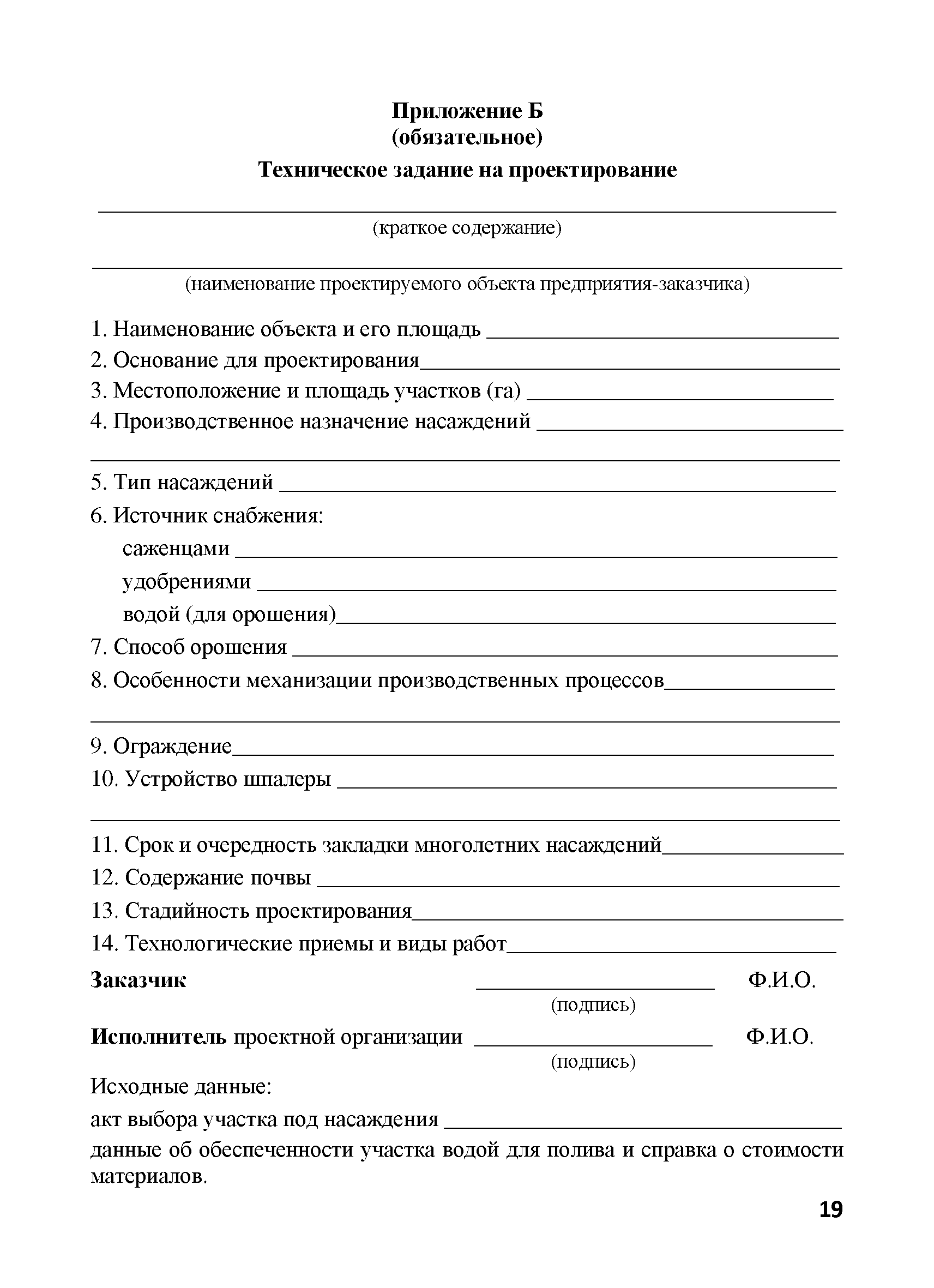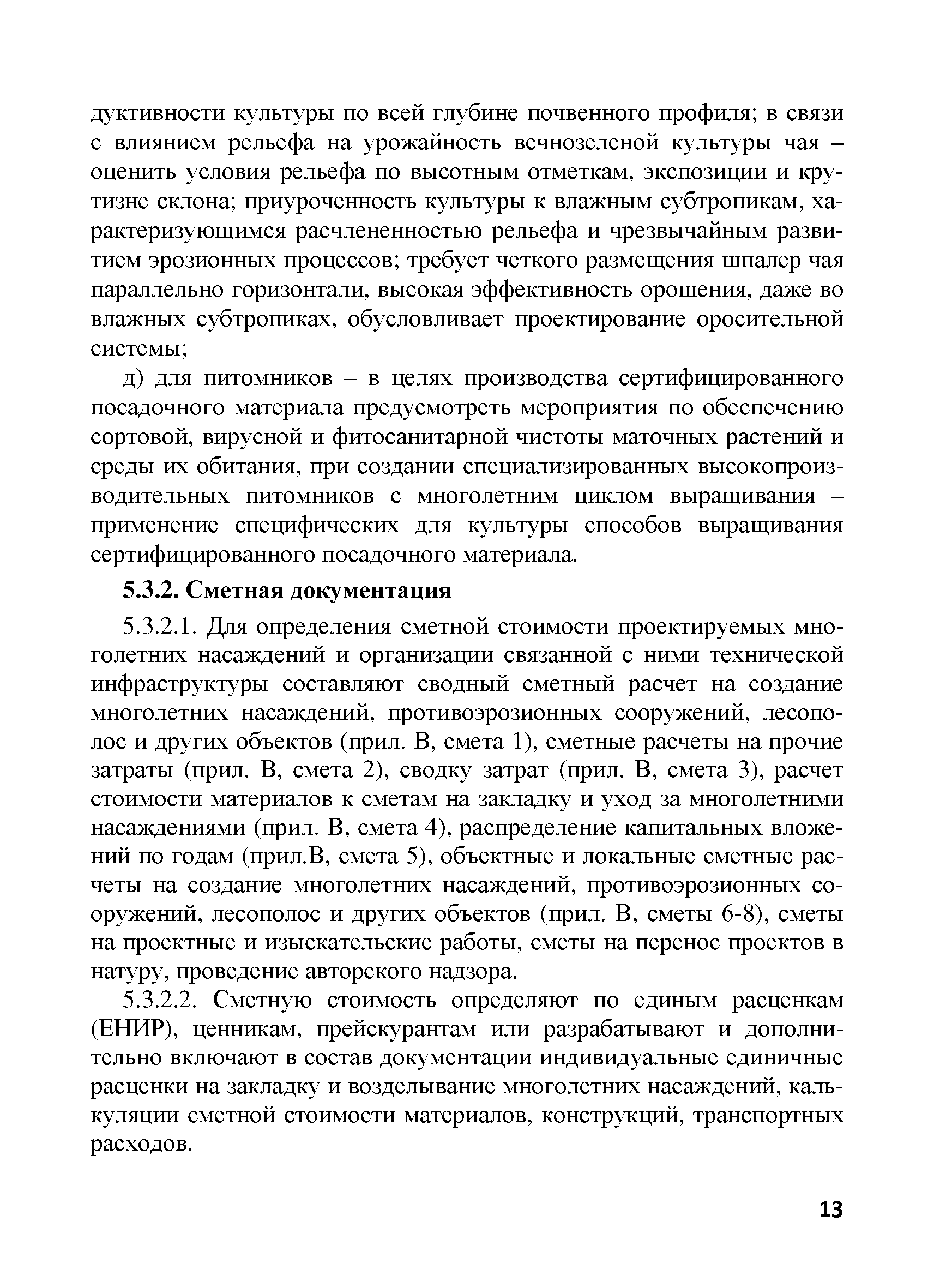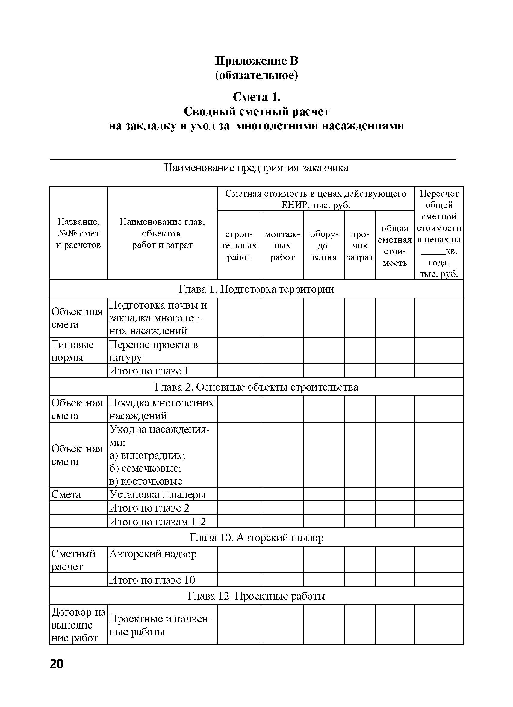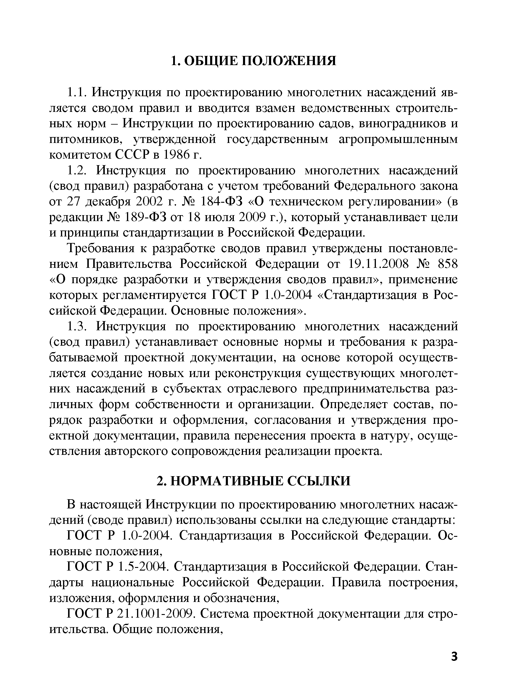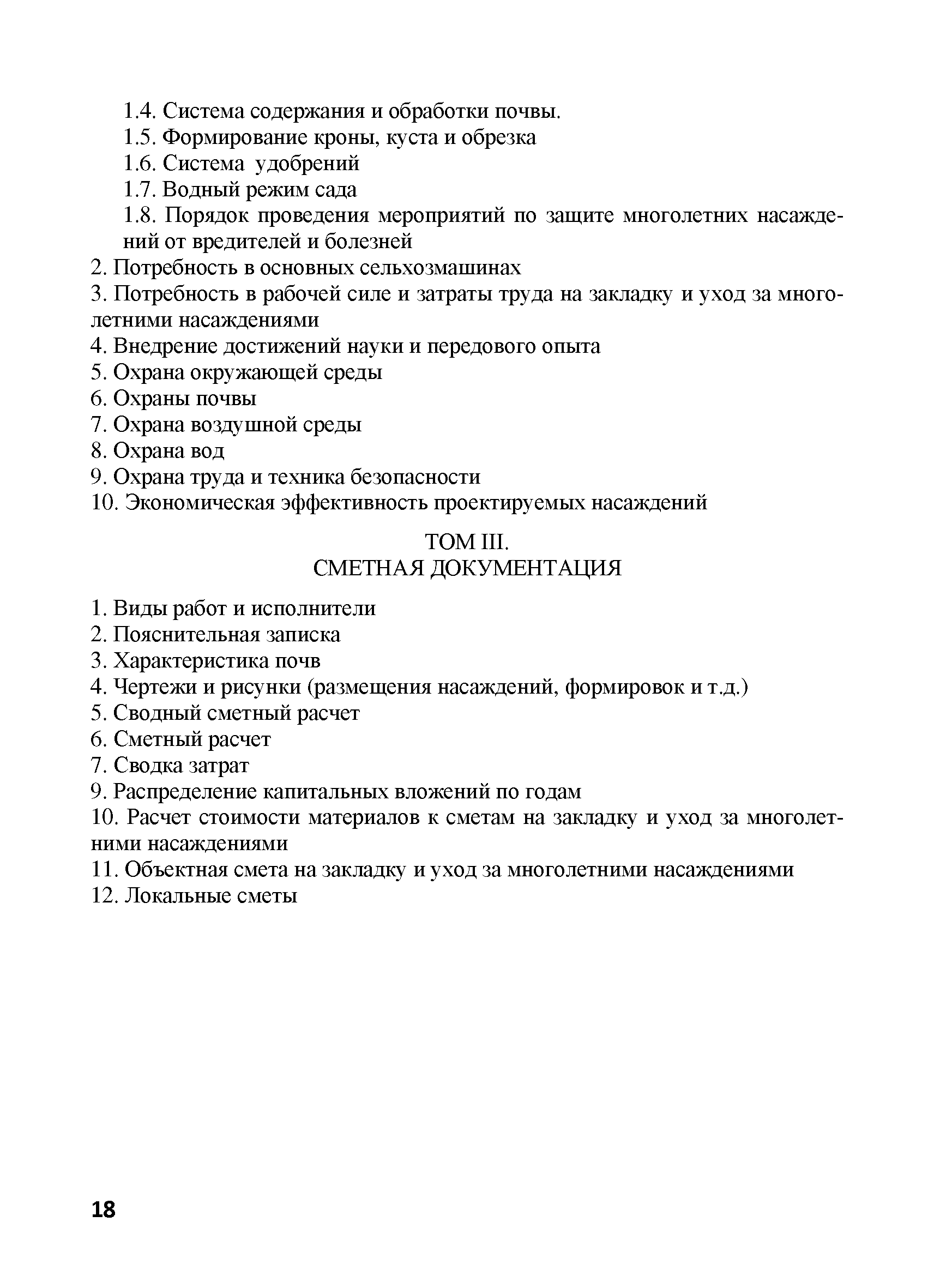 | Оглавление: | 1. Общие положения 2. Нормативные ссылки 3. Термины и определения 4. Общие правила и требования 5. Содержание и порядок разработки проектной документации 5.1. Общие положения 5.2. Предпроектная документация 5.2.1. Техническое задание на разработку проектной документации 5.2.2. Изыскательские работы, выбор участка под закладку многолетних насаждений 5.2.3. Технико-экономическое обоснование 5.3. Проектная документация 5.3.1. Технологическая документация 5.3.2. Сметная документация 6. Согласование и утверждение проектно-сметной документации 7. Перенесение проекта в натуру 8. Авторское сопровождение осуществления проекта Приложение А. Титульный лист и примерное содержание проекта организации территории и закладки многолетних насаждений Приложение Б. Техническое задание на проектирование Приложение В. Сметная документация Приложение Г. Примерная пояснительная записка к сметной документации на закладку многолетних насаждений |