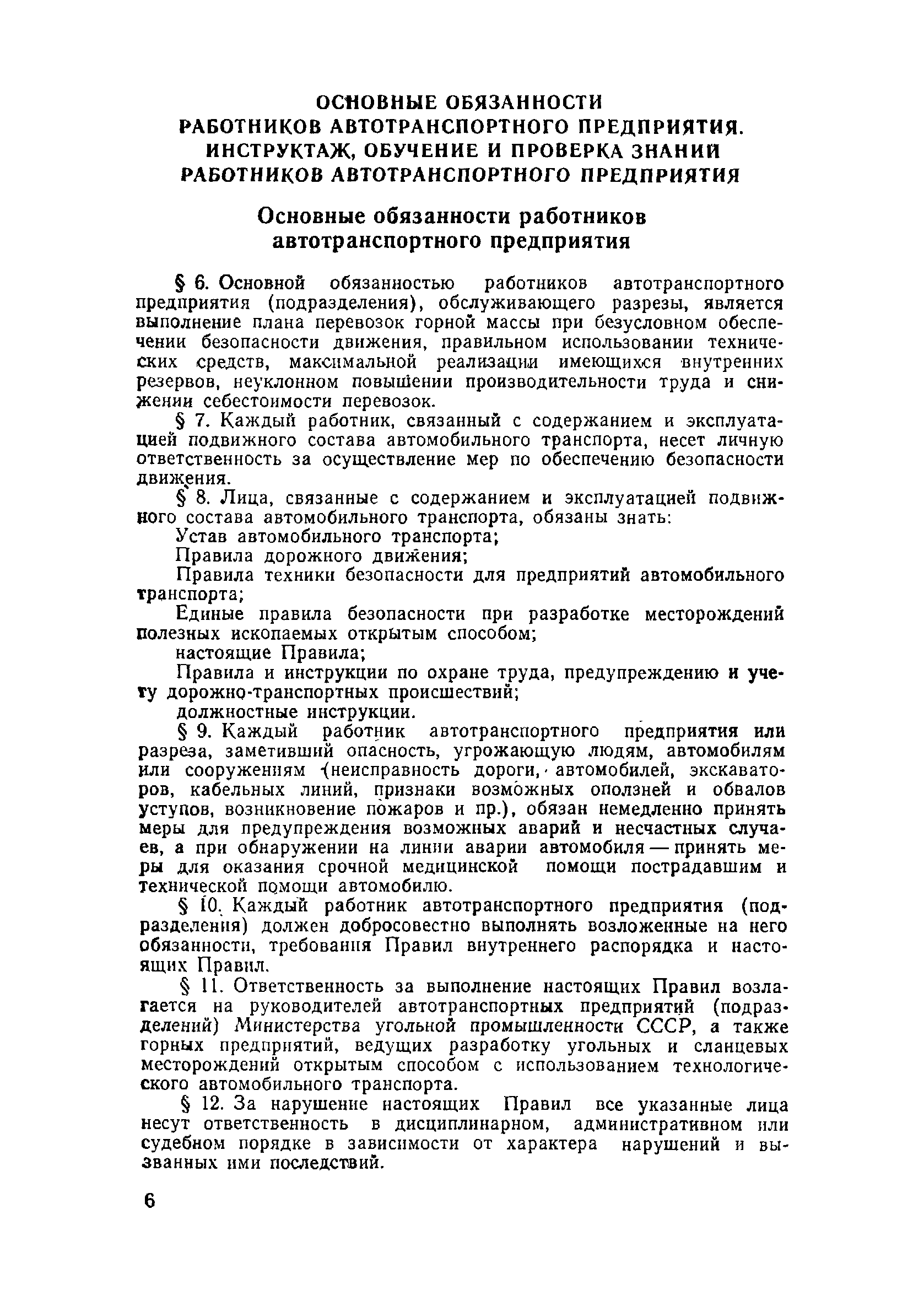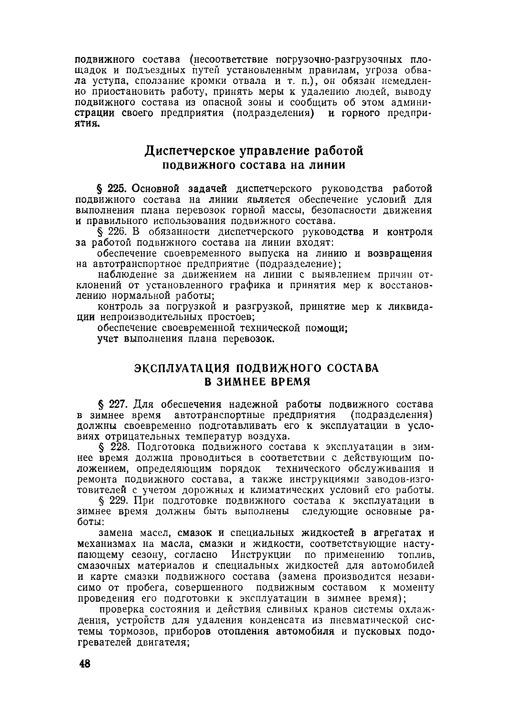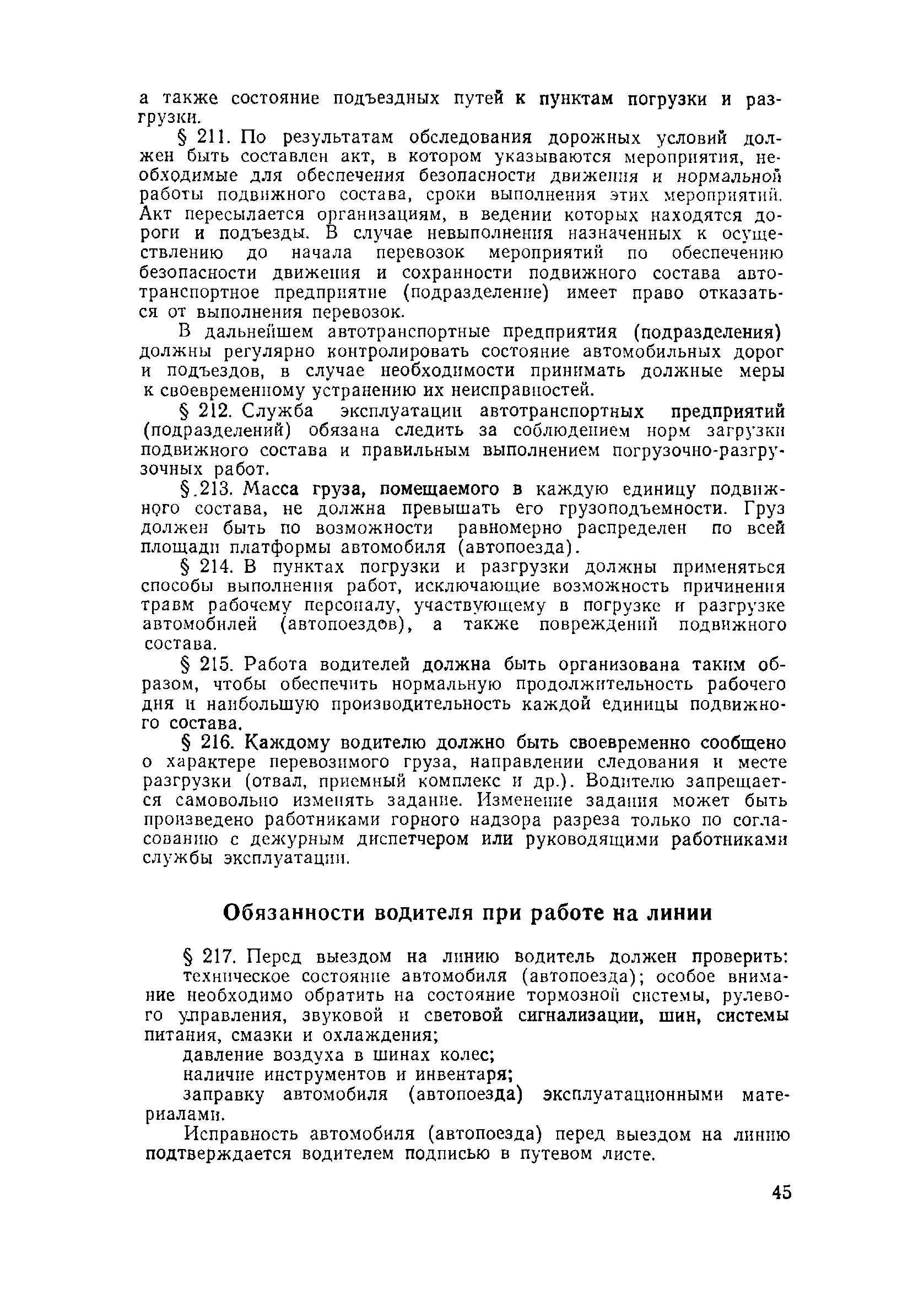 | Оглавление: | Предисловие Общие положения Основные обязанности работников автотранспортного предприятия. Инструктаж, обучение и проверка знаний работников автотранспортного предприятия Основные обязанности работников, автотранспортного предприятия Инструктаж, обучение и проверка знаний работников автотранспортного предприятия Подготовка водителей к эксплуатации технологических автомобилей Подвижной состав технологического автомобильного транспорта Виды подвижного состава и область его применения Требования к техническому состоянию подвижного состава Ввод подвижного состава в эксплуатацию Списание подвижного состава Техническое обслуживание и ремонт подвижного состава . Назначение и виды технического обслуживания и ремонта Общие принципы организации технического обслуживания и ремонта подвижного состава Ежедневное техническое обслуживание Первое и второе техническое обслуживание Текущий ремонт Капитальный ремонт Техническая помощь подвижному составу на линии Контроль качества и учет выполнения технического обслуживания и ремонта подвижного состава Здания, сооружения и оборудование для хранения, обслуживания и ремонта подвижного состава Общие требования к территории, зданиям и сооружениям Сооружения для хранения подвижного состава Здания, сооружения и оборудование для обслуживания и ремонта подвижного состава Складские помещения и сооружения Здания и помещения для личного состава автотранспортного предприятия Эксплуатационные материалы, аккумуляторные батареи и автомобильные шины Топливо, масла и смазочные материалы Охлаждающие жидкости Аккумуляторные батареи Автомобильные шины Азот для цилиндров подвески Условия эксплуатации подвижного состава и автомобильные дороги на угольных разрезах Условия эксплуатации подвижного состава технологического автотранспорта Устройство и обслуживание дорог Погрузочно-разгрузочные пункты Техническая эксплуатация подвижного состава на линии Организация работы подвижного состава на линии Обязанности водителя при работе ка линии Диспетчерское управление работой подвижного состава на линии Эксплуатация подвижного состава в зимнее время Организация работы по охране труда, технике безопасности и безопасности движения Организация работы по охране труда и технике безопасности Обеспечение безопасности движения Требования - безопасности при погрузочно-разгрузочных работах Требования техники безопасности при эксплуатации автомобилей (автопоездов) Требования пожарной безопасности при эксплуатации автомобилей (автопоездов) Приложение 1. Перечень основных операций технического обслуживания Технологических автомобилей (автопоездов) Приложение 2. Эксплуатационные материалы |