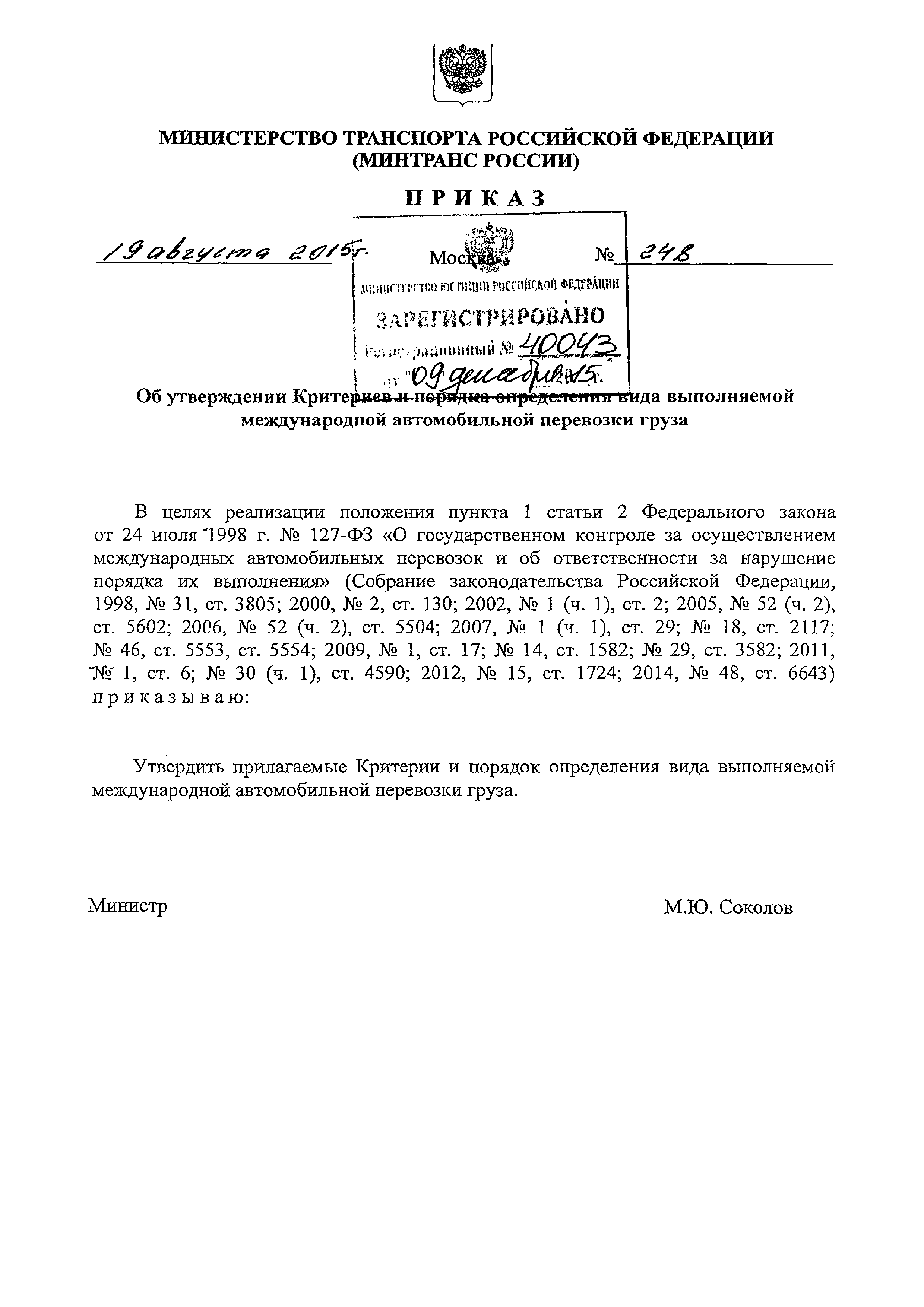 | Утверждён: | 19.08.2015 Минтранс России (Russian Federation Mintrans 248)