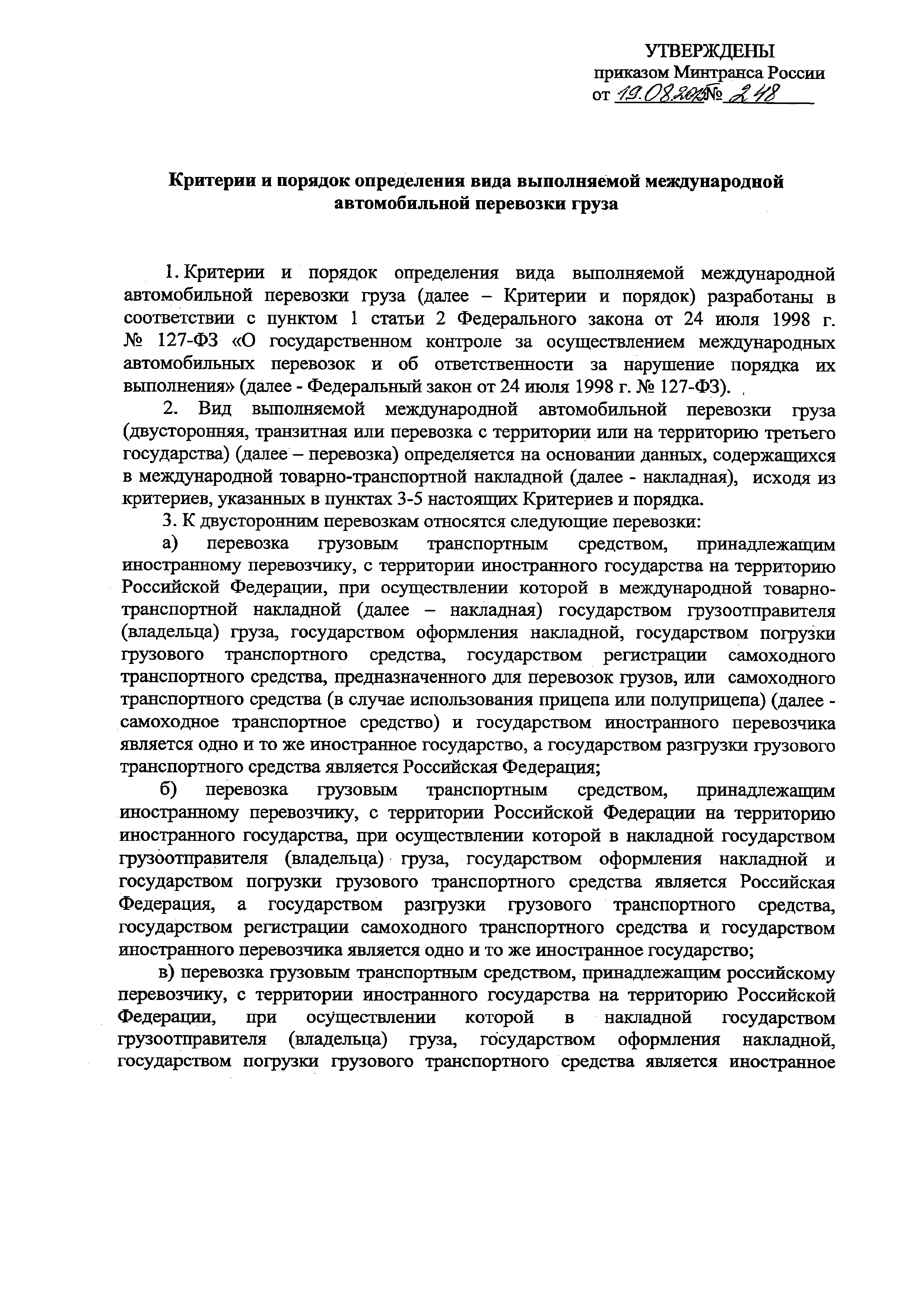 | Название рус.: | Критерии и порядок определения вида выполняемой международной автомобильной перевозки груза |