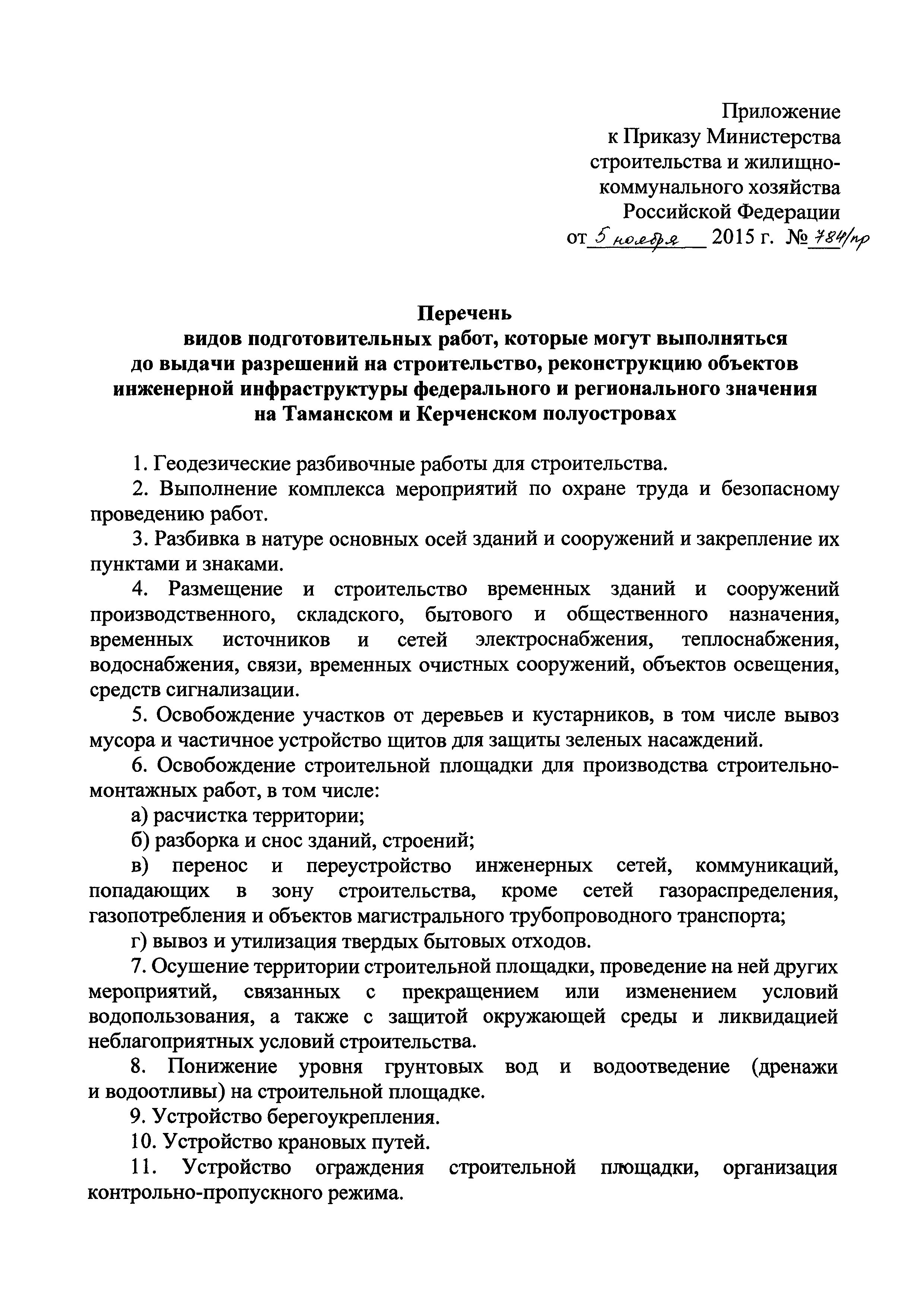 Перечень видов подготовительных работ, которые могут выполняться до выдачи разрешений на строительство, реконструкцию объектов инженерной инфраструктуры федерального и регионального значения на Таманском и Керченском полуостровах| Статус: | действует | | Название рус.: | Перечень видов подготовительных работ, которые могут выполняться до выдачи разрешений на строительство, реконструкцию объектов инженерной инфраструктуры федерального и регионального значения на Таманском и Керченском полуостровах | | Дата добавления в базу: | 12.02.2016 | | Дата актуализации: | 01.01.2021 | | Дата введения: | 08.12.2015 | | Утверждён: | 05.11.2015 Министерство строительства и жилищно-коммунального хозяйства Российской Федерации (784/пр)