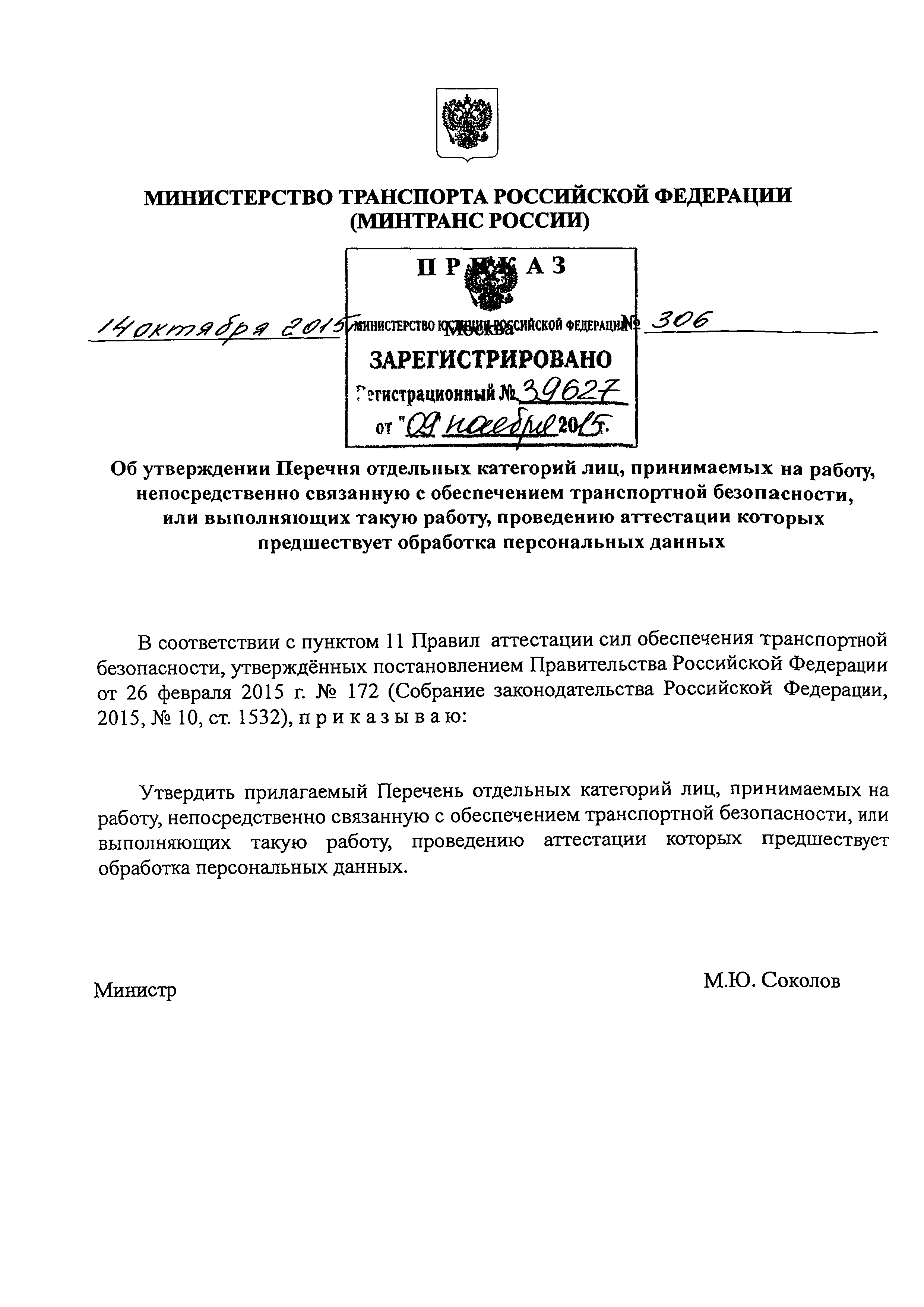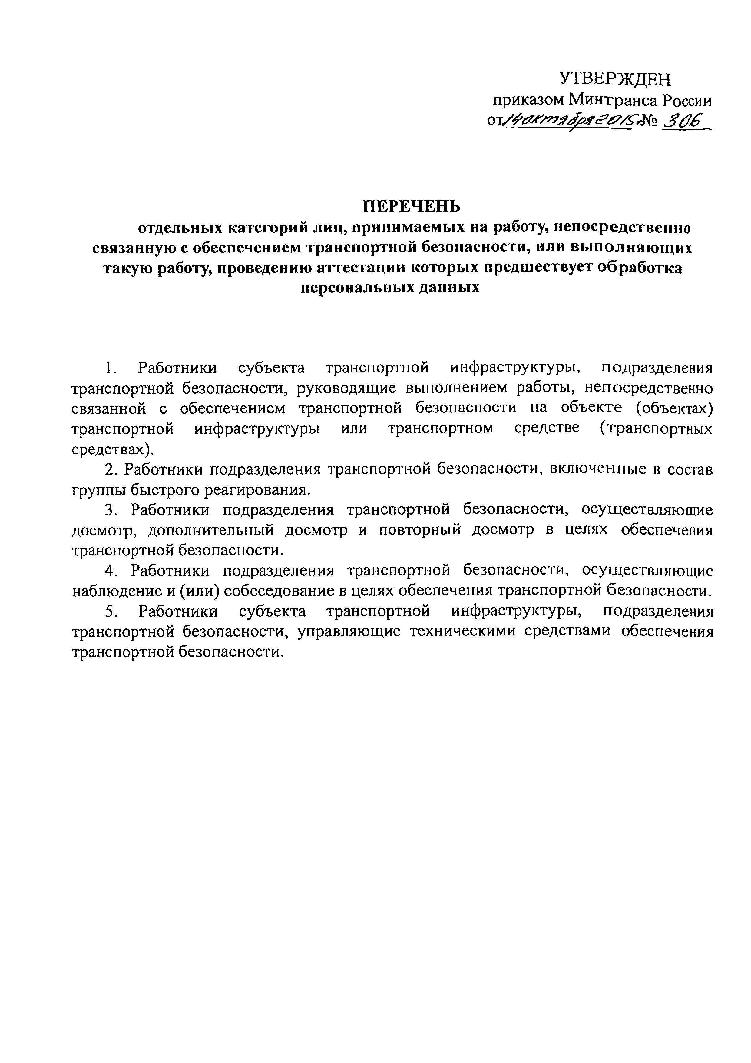 Перечень отдельных категорий лиц, принимаемых на работу, непосредственно связанную с обеспечением транспортной безопасности, или выполняющих такую работу, проведению аттестации которых предшествует обработка персональных данных| Статус: | действует | | Название рус.: | Перечень отдельных категорий лиц, принимаемых на работу, непосредственно связанную с обеспечением транспортной безопасности, или выполняющих такую работу, проведению аттестации которых предшествует обработка персональных данных | | Дата добавления в базу: | 12.02.2016 | | Дата актуализации: | 01.01.2021 | | Дата введения: | 22.11.2015 | | Утверждён: | 14.10.2015 Министерство транспорта Российской Федерации (Russian Federation Ministry of Transportation 306)