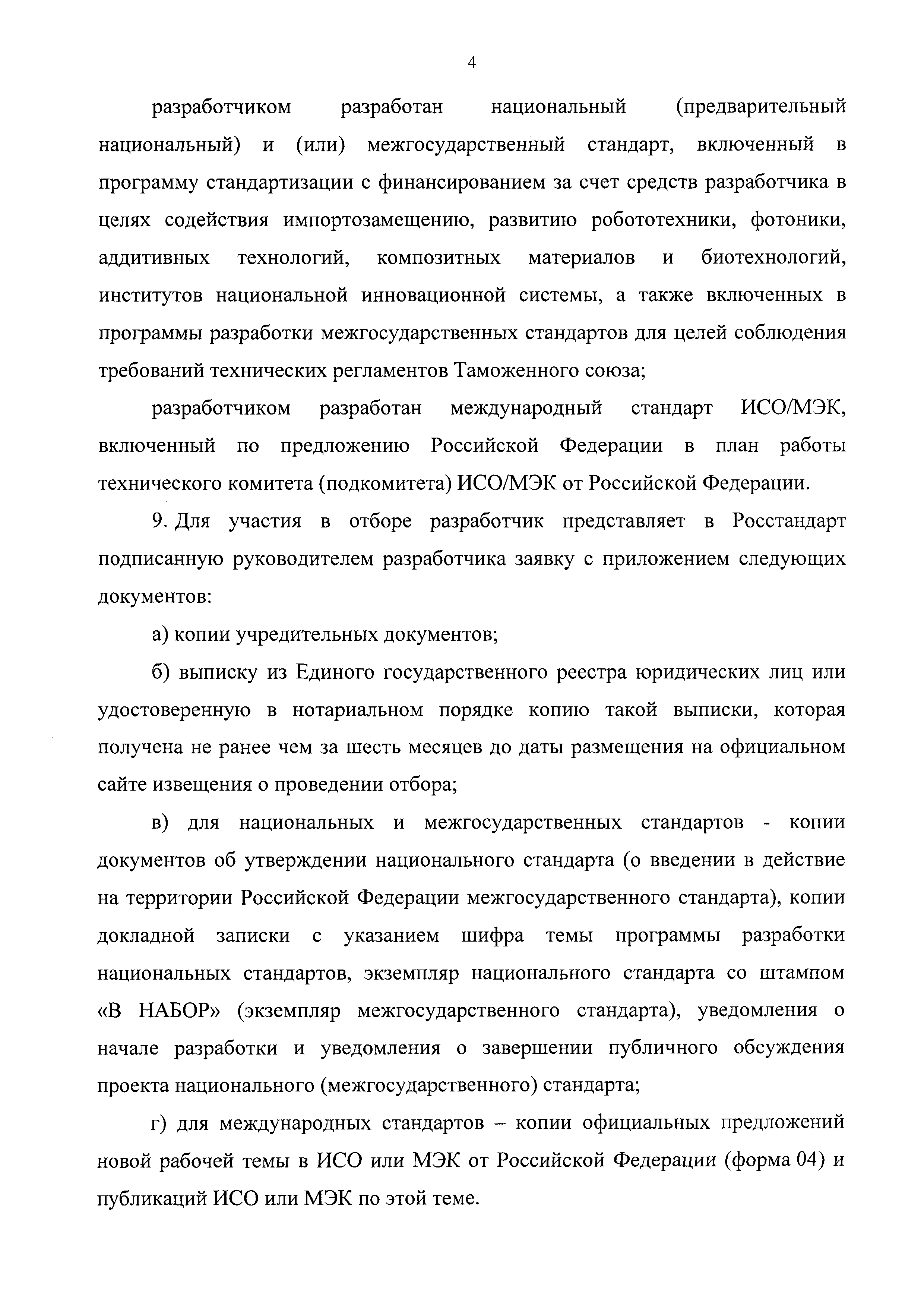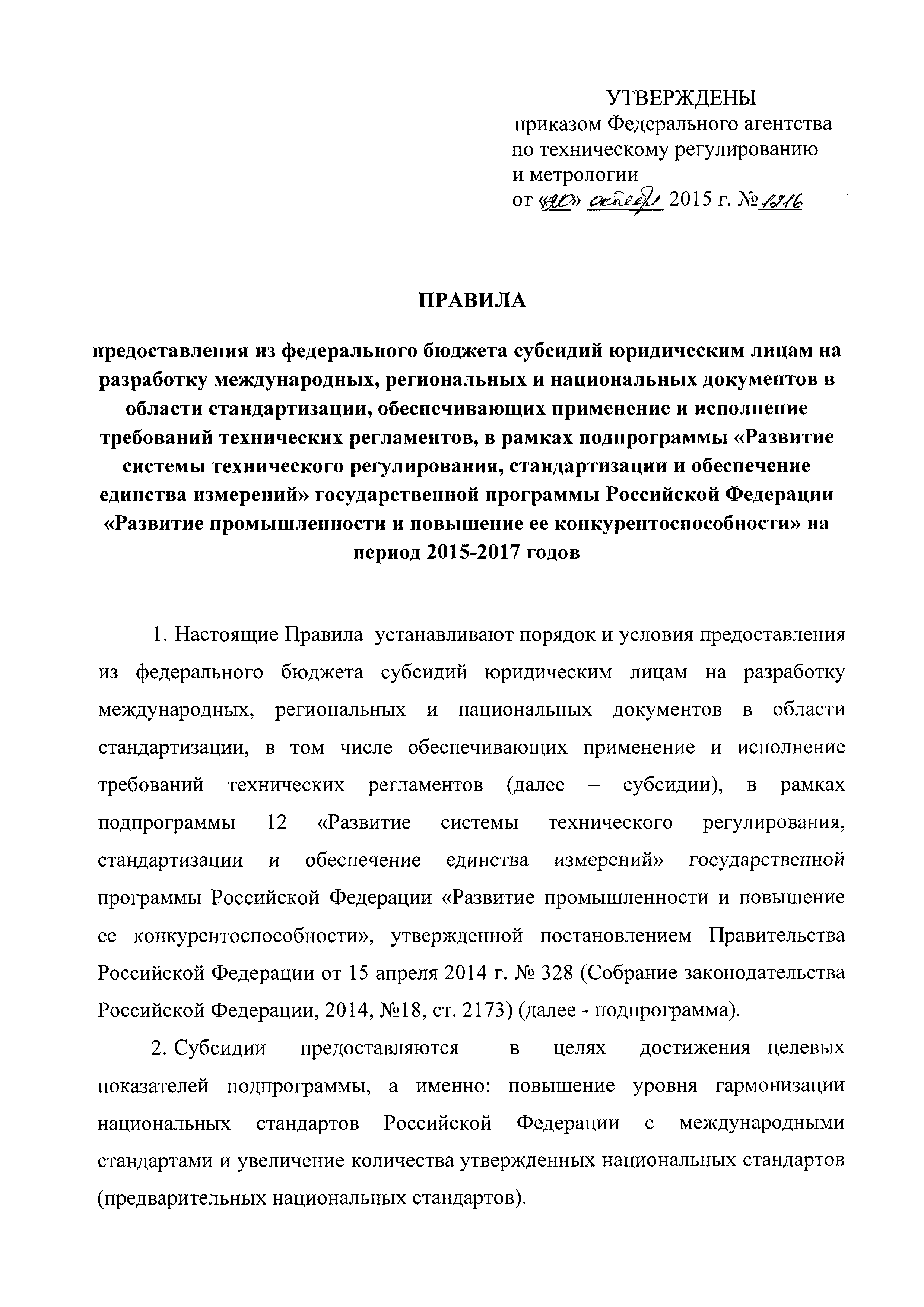 Правила предоставления из федерального бюджета субсидий юридическим лицам на разработку международных, региональных и национальных документов в области стандартизации, обеспечивающих применение и исполнение требований технических регламентов, в рамках подпрограммы "Развитие системы технического регулирования, стандартизации и обеспечение единства измерений" государственной программы Российской Федерации "Развитие промышленности и повышение ее конкурентоспособности" на период 2015 - 2017 годов| Статус: | действует | | Название рус.: | Правила предоставления из федерального бюджета субсидий юридическим лицам на разработку международных, региональных и национальных документов в области стандартизации, обеспечивающих применение и исполнение требований технических регламентов, в рамках подпрограммы "Развитие системы технического регулирования, стандартизации и обеспечение единства измерений" государственной программы Российской Федерации "Развитие промышленности и повышение ее конкурентоспособности" на период 2015 - 2017 годов | | Дата добавления в базу: | 12.02.2016 | | Дата актуализации: | 01.01.2021 | | Дата введения: | 30.11.2015 | | Область применения: | Правила устанавливают порядок и условия предоставления из федерального бюджета субсидий юридическим лицам на разработку международных, региональных и национальных документов в области стандартизации, в том числе обеспечивающих применение и исполнение требований технических регламентов, в рамках подпрограммы 12 "Развитие системы технического регулирования, стандартизации и обеспечение единства измерений" государственной программы Российской Федерации "Развитие промышленности и повышение ее конкурентоспособности", утвержденной постановлением Правительства Российской Федерации от 15 апреля 2014 г. № 328 | | Оглавление: | Приложение № 1 Приложение № 2 | | Утверждён: | 20.10.2015 Федеральное агентство по техническому регулированию и метрологии (1216)