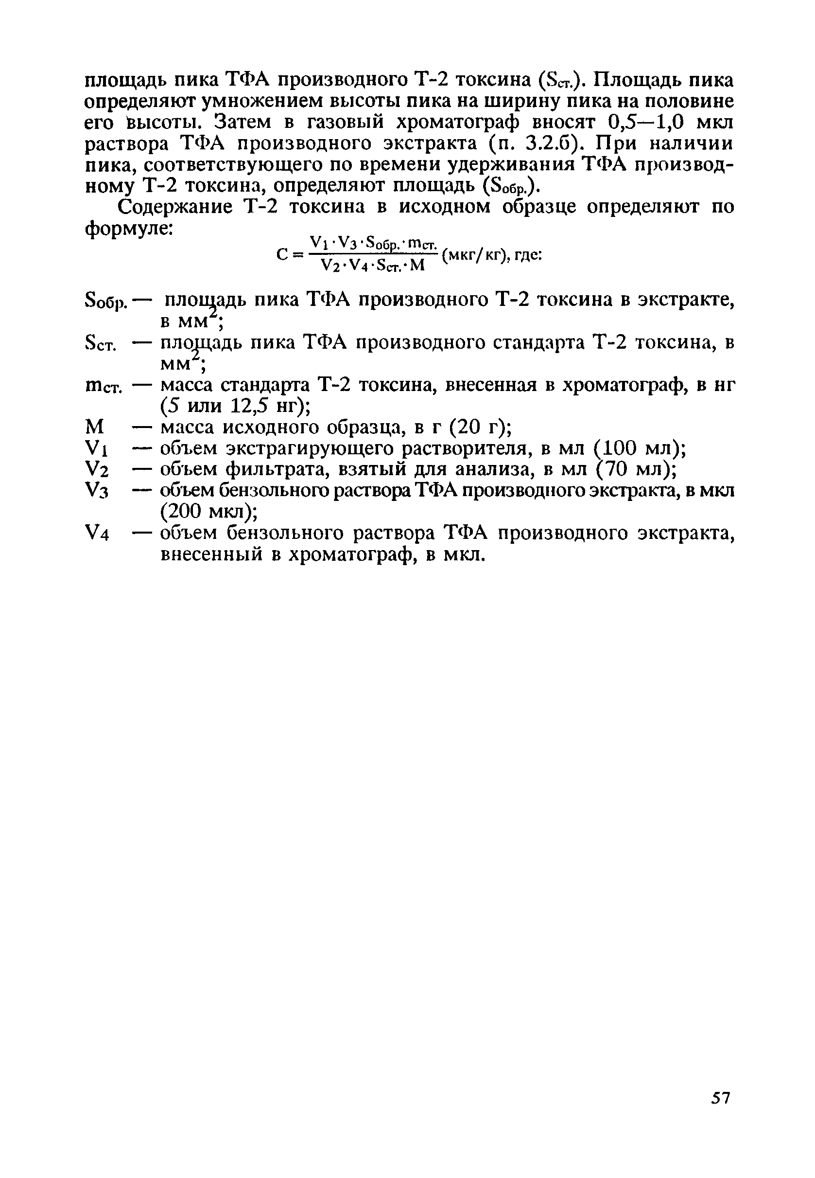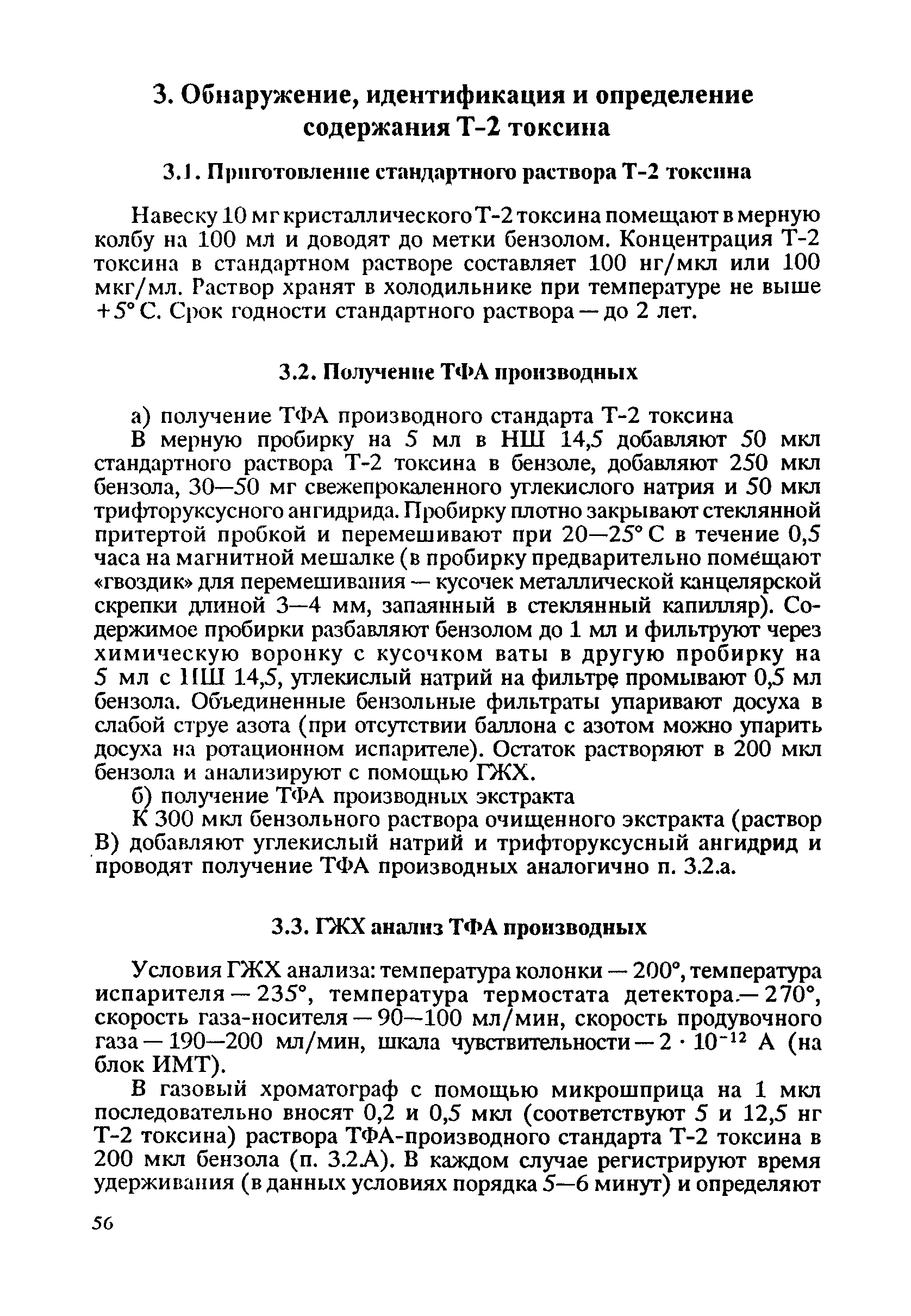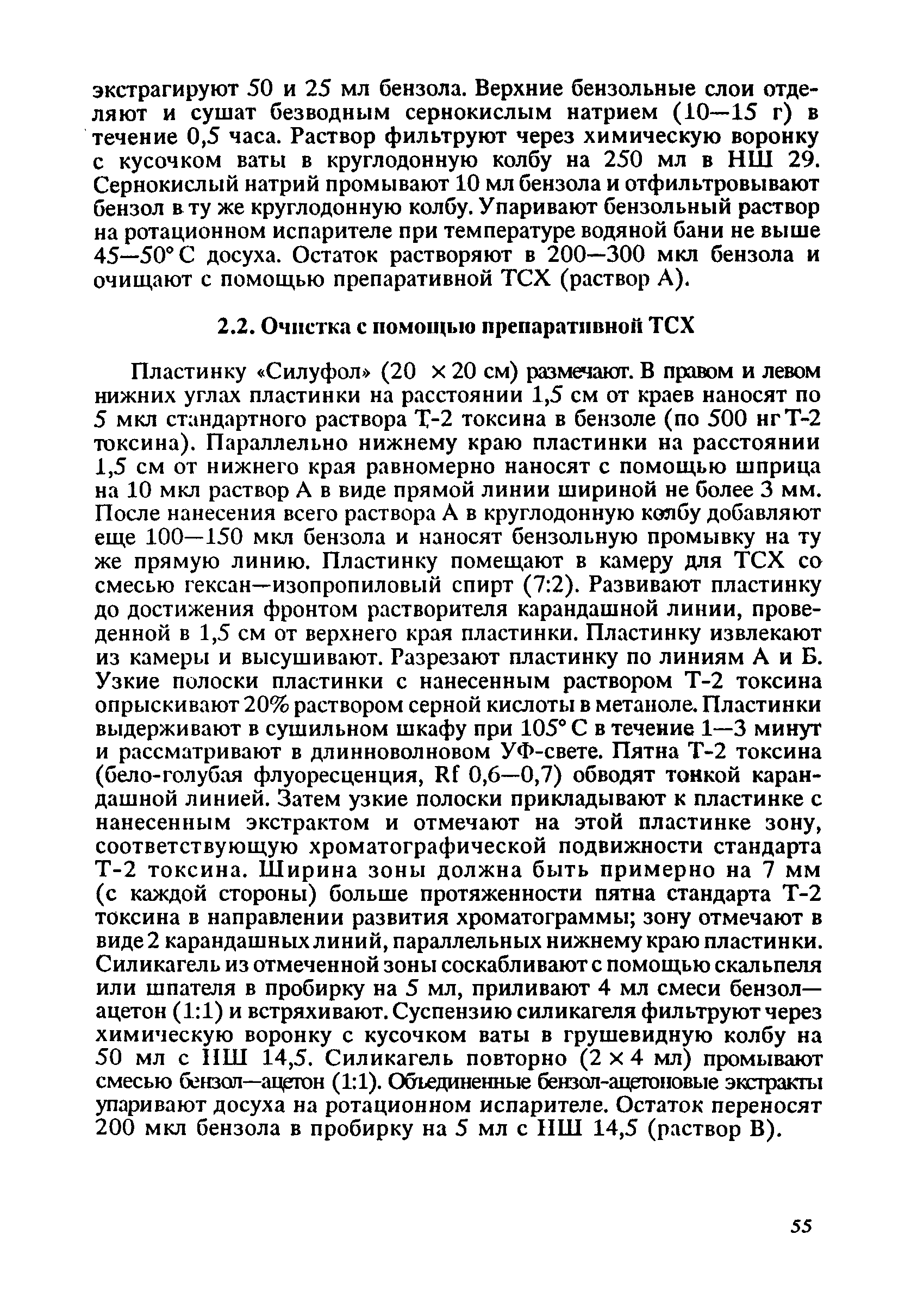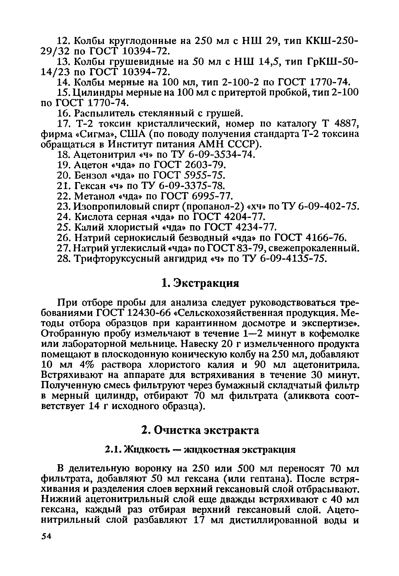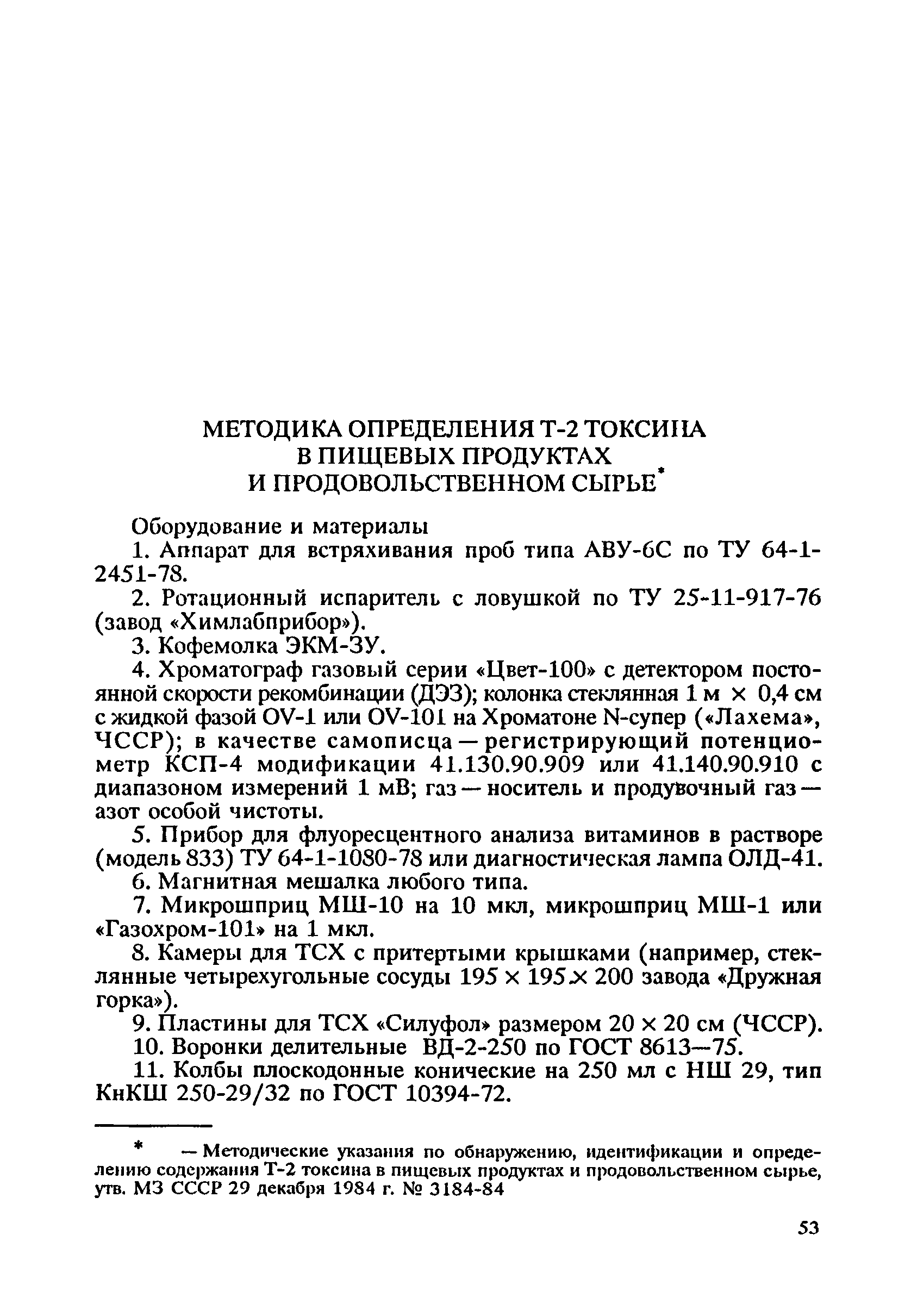 Методика определения Т-2 токсина в пищевых продуктах и продовольственном сырье| Статус: | справочные материалы, мп, тпр | | Название рус.: | Методика определения Т-2 токсина в пищевых продуктах и продовольственном сырье | | Дата добавления в базу: | 12.02.2016 | | Дата актуализации: | 01.01.2021 | | Оглавление: | Оборудование и материалы 1. Экстракция 2. Очистка экстракта 3. Обнаружение, идентификация и определение содержания Т-2 | | Утверждён: | 29.12.1984 МЗ СССР