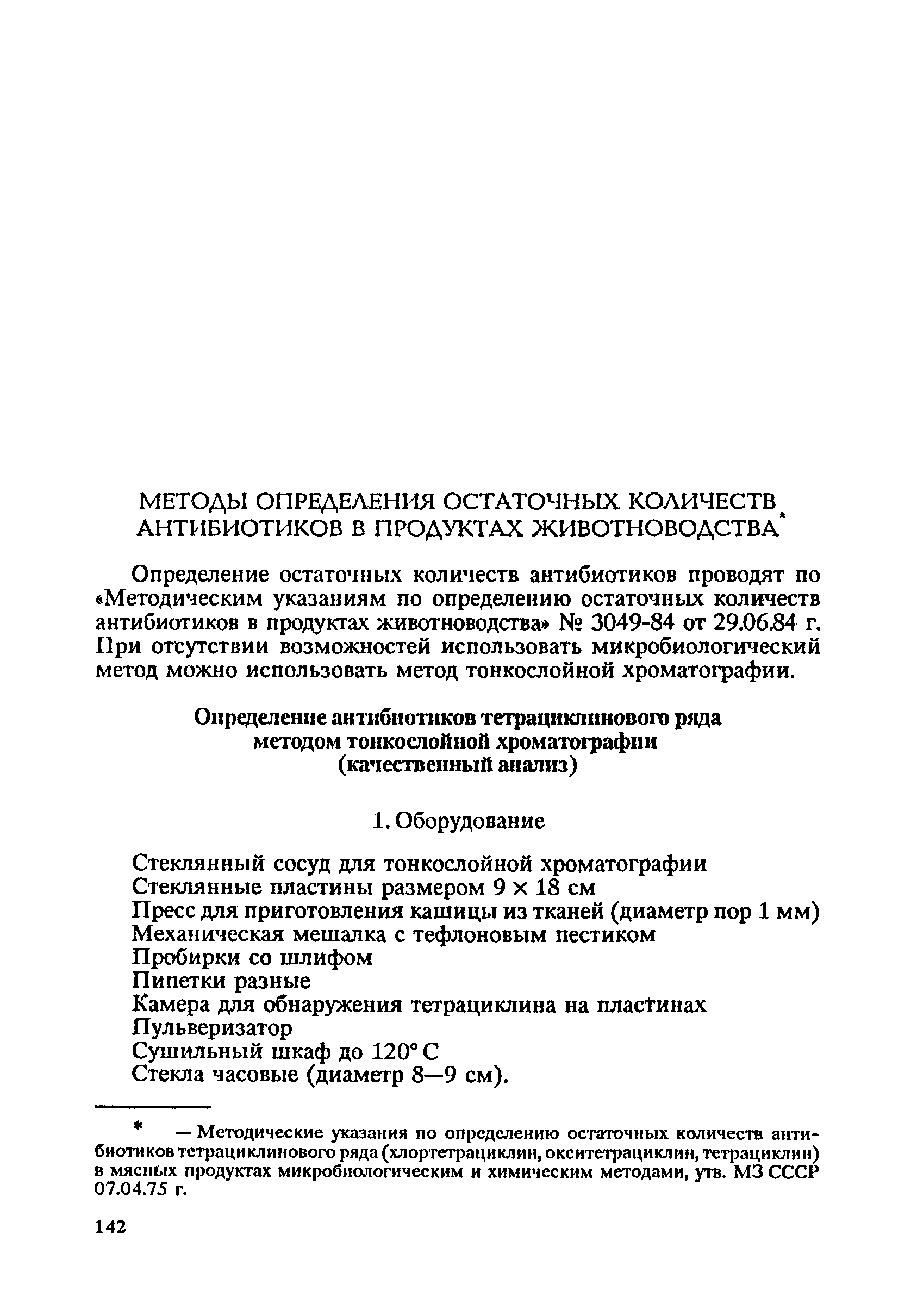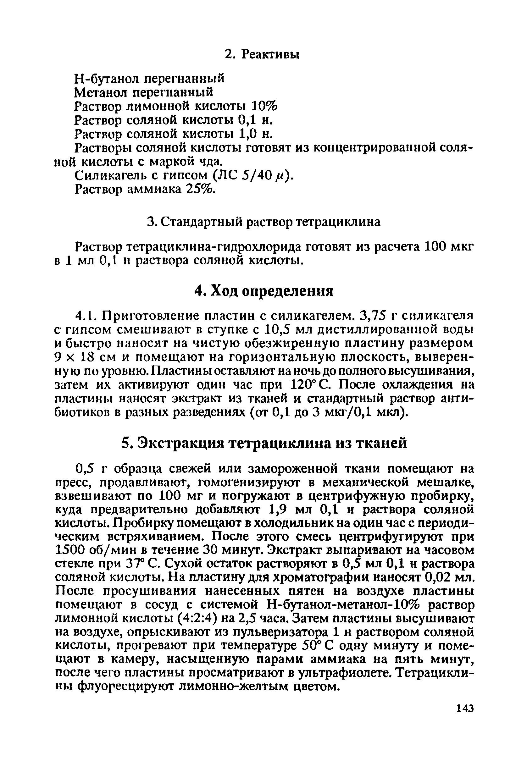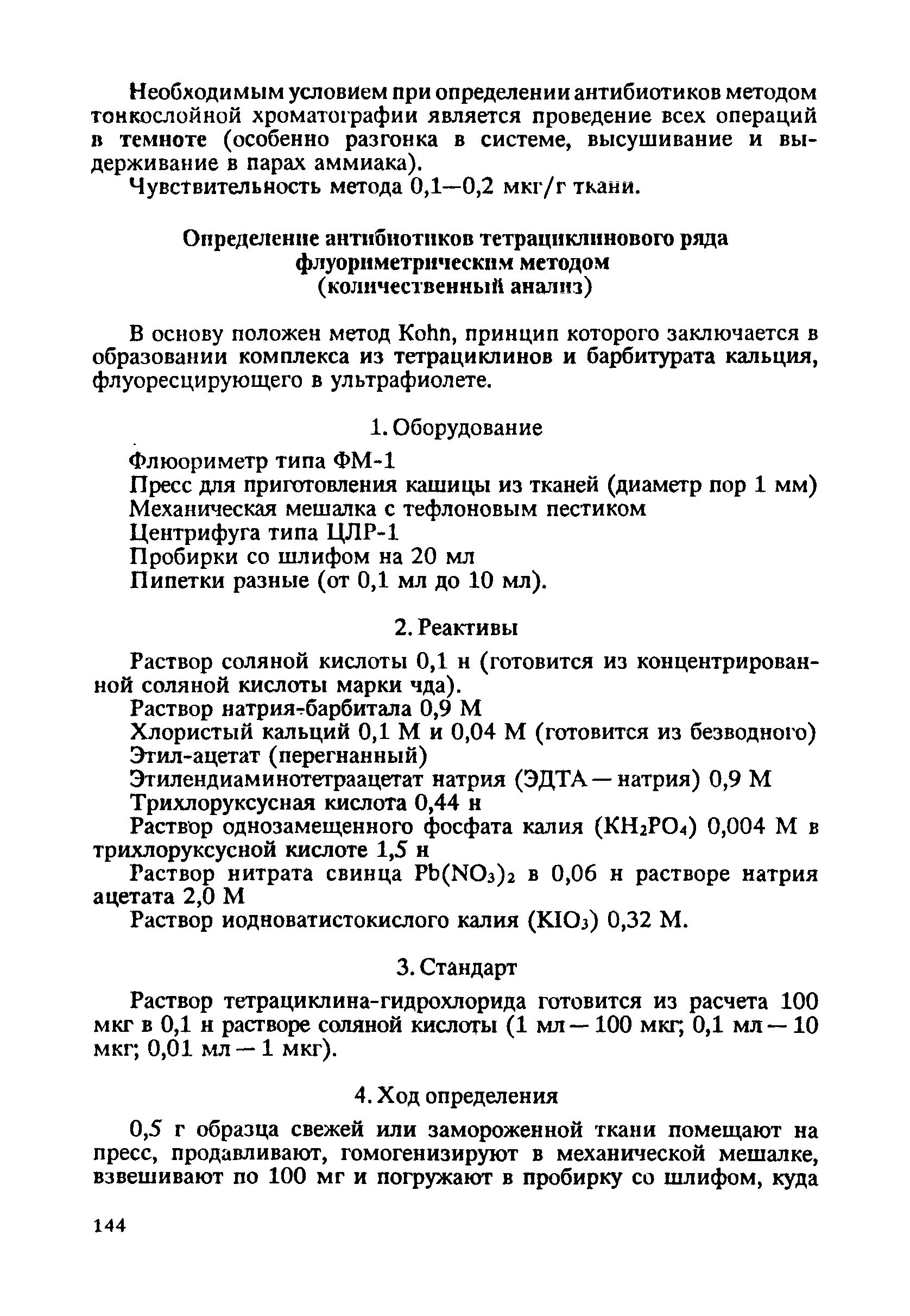 Методы определения остаточных количеств антибиотиков в продуктах животноводства| Статус: | справочные материалы, мп, тпр | | Название рус.: | Методы определения остаточных количеств антибиотиков в продуктах животноводства | | Дата добавления в базу: | 12.02.2016 | | Дата актуализации: | 01.01.2021 | | Оглавление: | Определение антибиотиков тетрациклинового ряда методом тонкослойной хроматографии (качественный анализ) 1. Оборудование 2. Реактивы 3. Стандартный раствор тетрациклина 4. Ход определения 5. Экстракция тетрациклина из тканей Определение антибиотиков тетрациклинового ряда флуориметрическим методом (количественный анализ) 1. Оборудование 2. Реактивы 3. Стандарт 4. Ход определения 5. Расчет | | Утверждён: | 07.04.1975 МЗ СССР