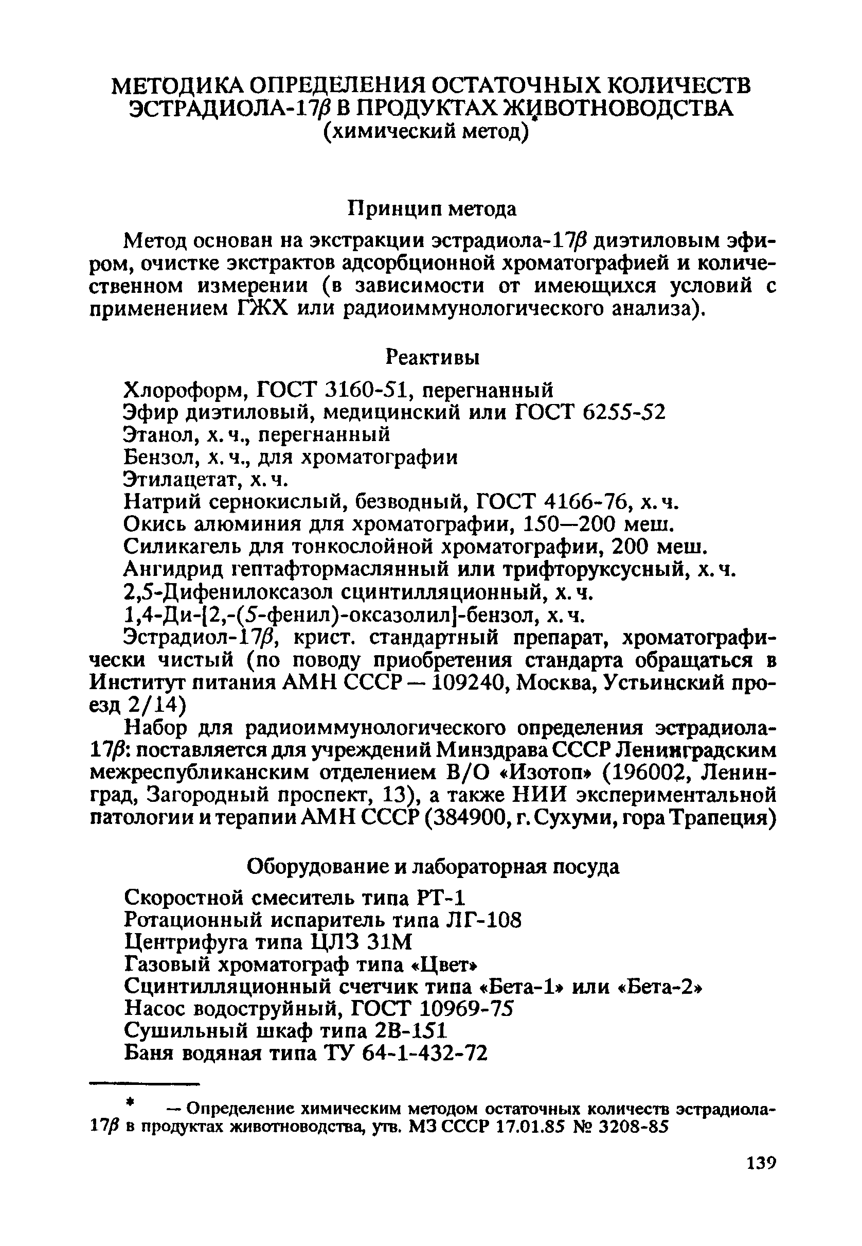 | Название рус.: | Методика определения остаточных количеств эстрадиола-17бета в продуктах животноводства (химический метод) |