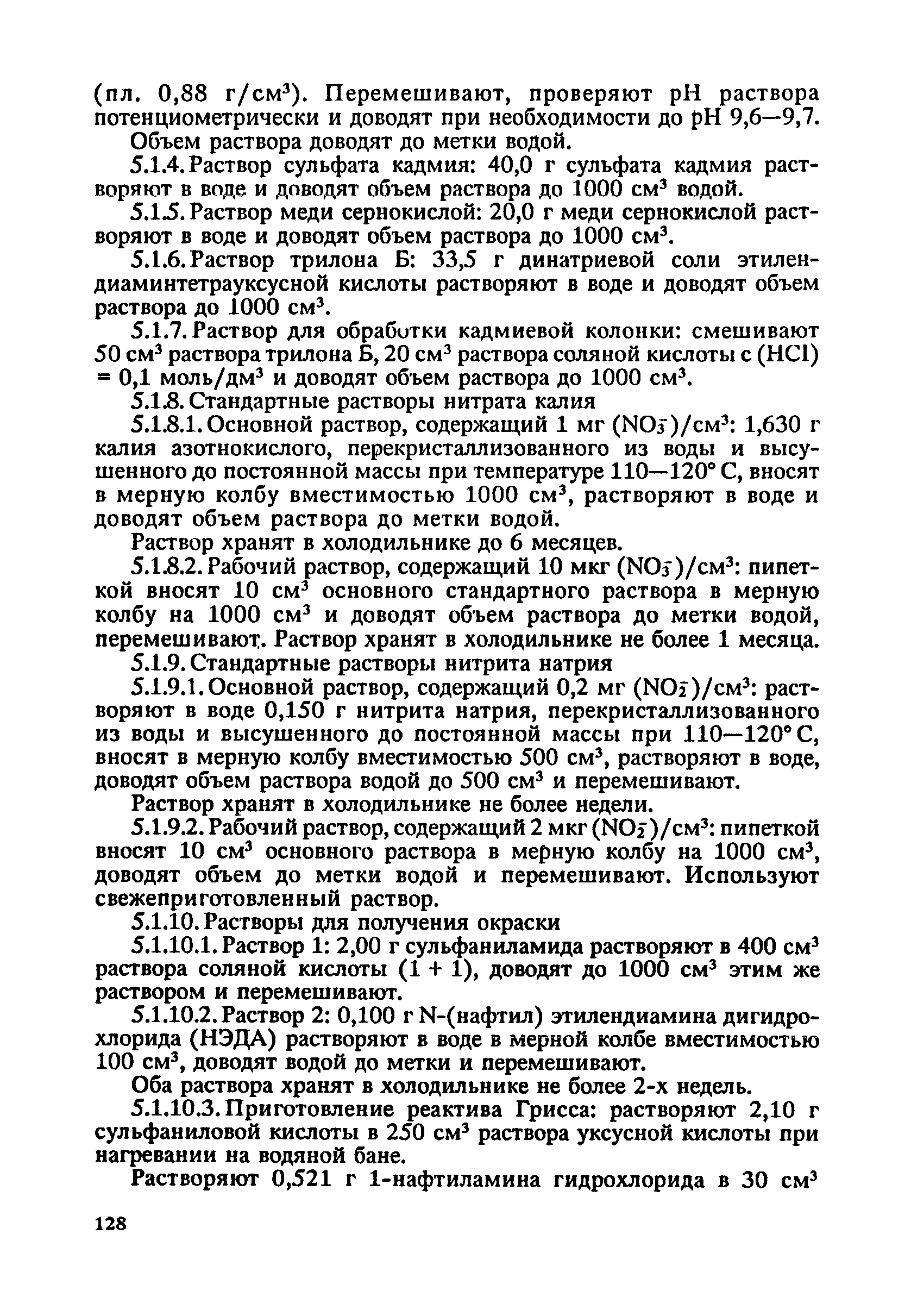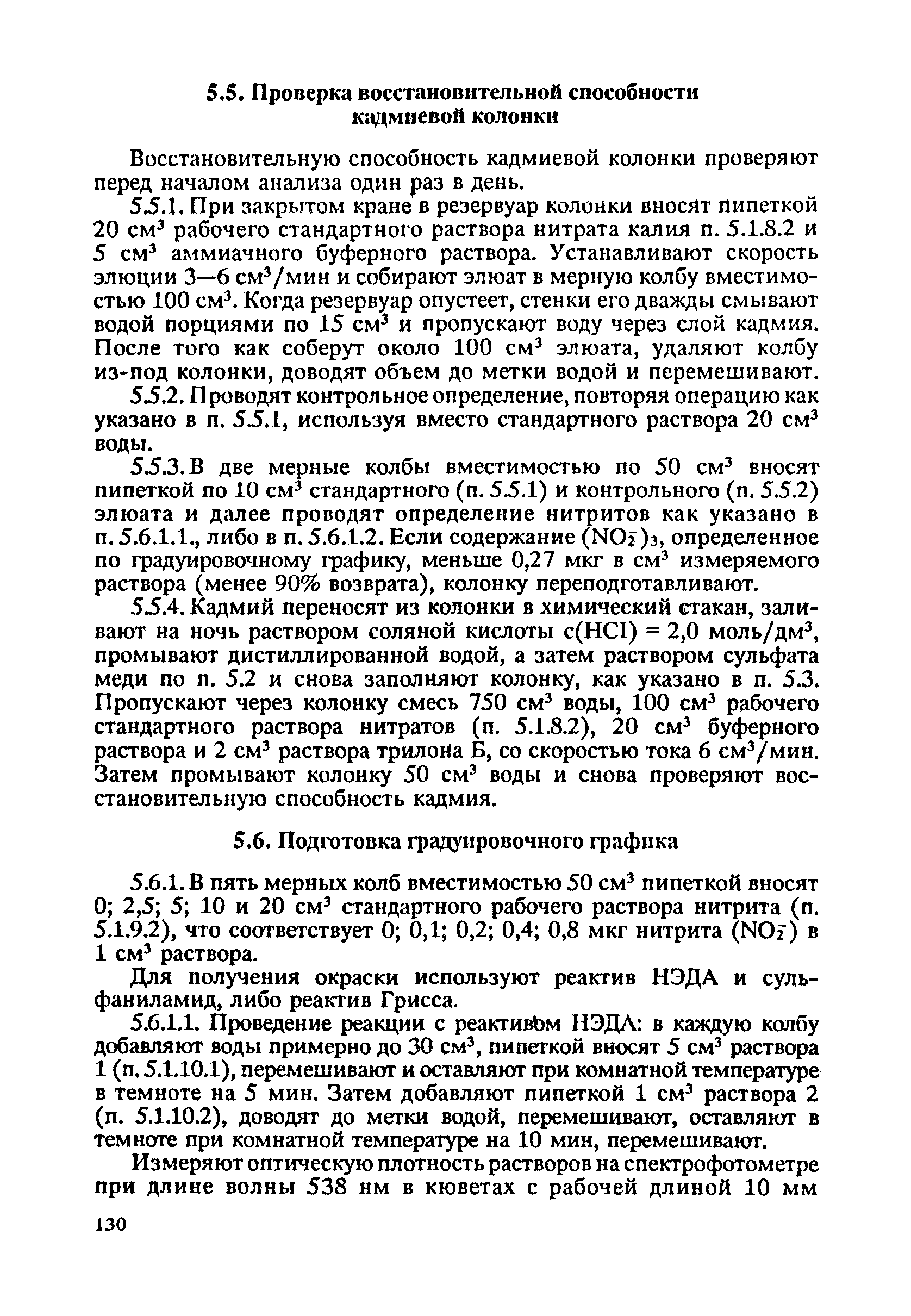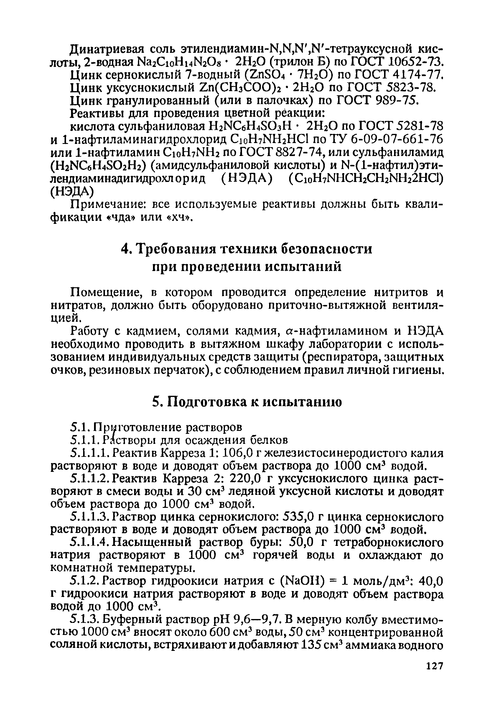 | | Нормативные ссылки: |   ГОСТ 6709-72 «Вода дистиллированная. Технические условия» ГОСТ 10652-73 «Реактивы. Соль динатриевая этилендиамин-N,N,N',N'- тетрауксусной кислоты, 2-водная (трилон Б). Технические условия»  ГОСТ 12026-76 «Бумага фильтровальная лабораторная. Технические условия» ГОСТ 1770-74 «Посуда мерная лабораторная стеклянная. Цилиндры, мензурки, колбы, пробирки. Общие технические условия» ГОСТ 20292-74 «Приборы мерные лабораторные стеклянные. Бюретки, пипетки. Технические условия» ГОСТ 25336-82 «Посуда и оборудование лабораторные стеклянные. Типы, основные параметры и размеры» ГОСТ 26313-84 «Продукты переработки плодов и овощей. Правила приемки, методы отбора проб» ГОСТ 4165-78 «Реактивы. Медь II сернокислая 5-водная. Технические условия» ГОСТ 4174-77 «Реактивы. Цинк сернокислый 7-водный. Технические условия» ГОСТ 4197-74 «Реактивы. Натрий азотисто-кислый. Технические условия» ГОСТ 4207-75 «Реактивы. Калий железистосинеродистый 3-водный. Технические условия» ГОСТ 4217-77 «Реактивы. Калий азотнокислый. Технические условия» ГОСТ 4456-75 «Реактивы. Кадмий сернокислый. Технические условия» ГОСТ 5823-78 «Реактивы. Цинк уксуснокислый 2-водный. Технические условия»  ГОСТ 61-75 «Реактивы. Кислота уксусная. Технические условия» ГОСТ 989-75 «Реактивы. Цинк гранулированный»