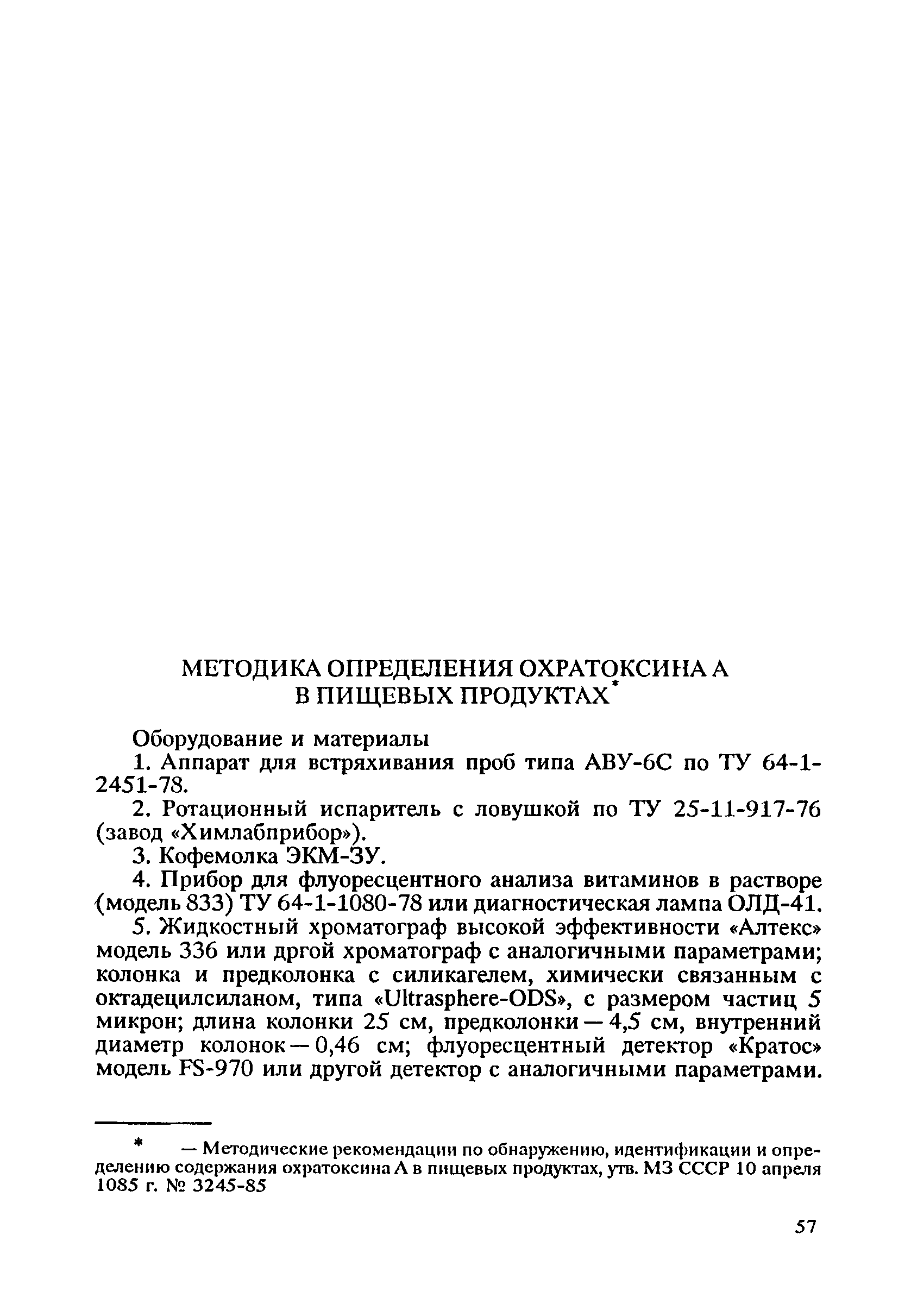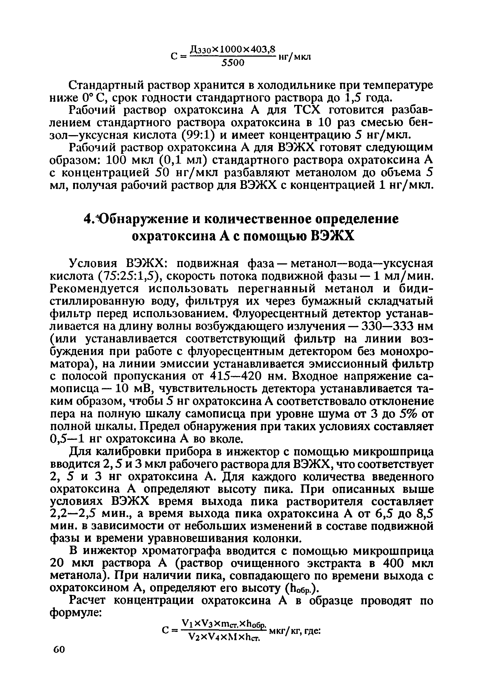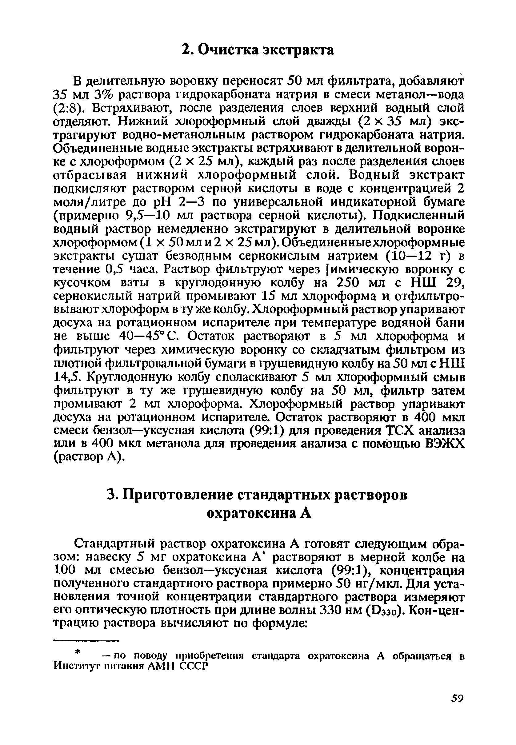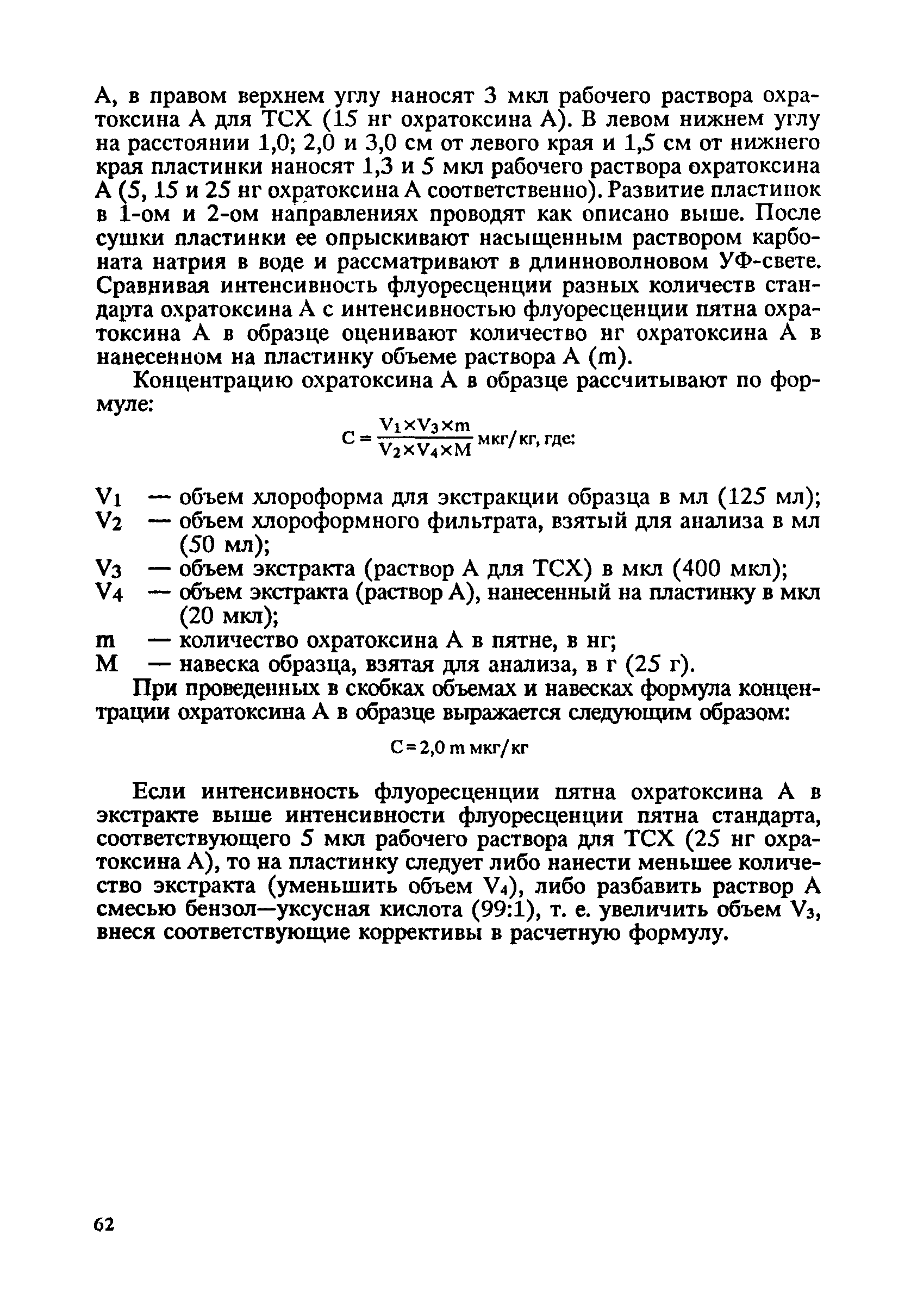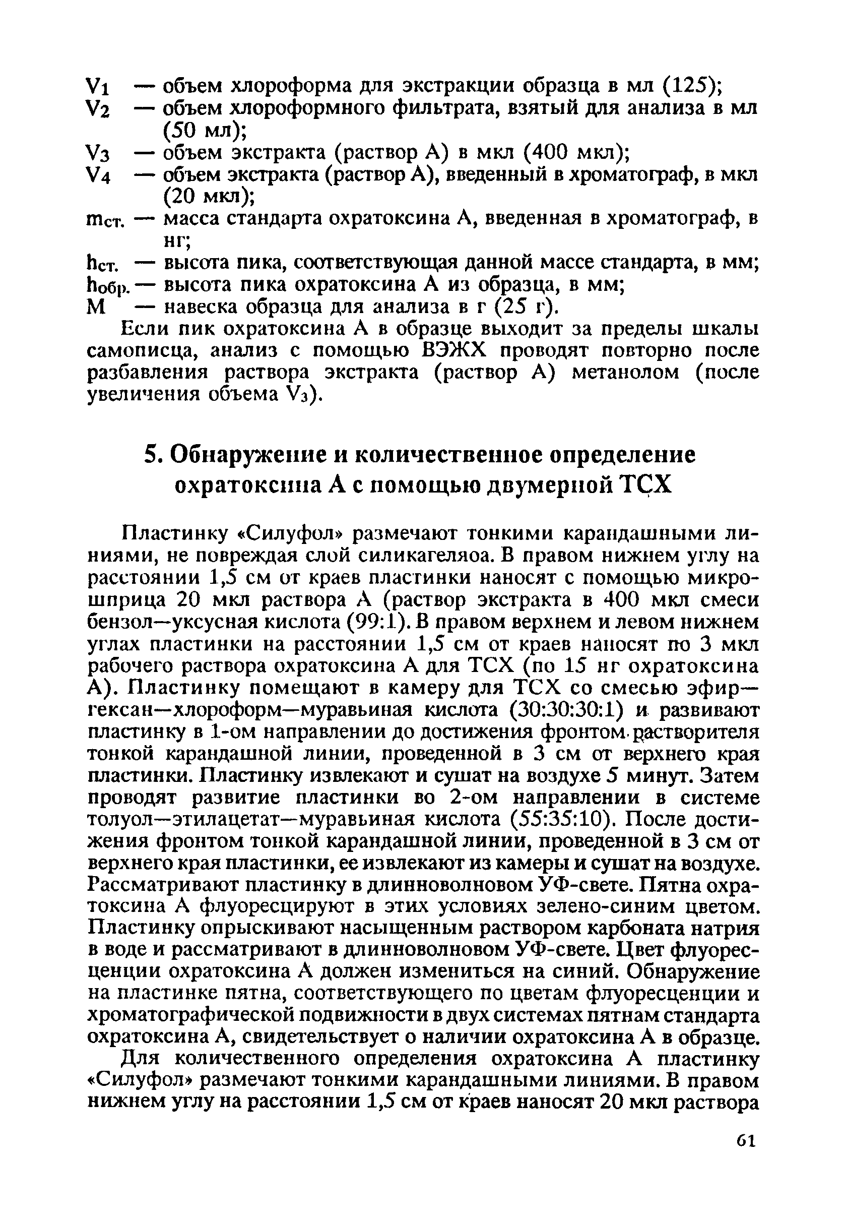 | Оглавление: | Оборудование и материалы 1. Экстракция 2. Очистка экстракта 3. Приготовление стандартных растворов охратоксина А 4. Обнаружение и количественное определение охратоксина А с помощью ВЭЖХ 5. Обнаружение и количественное определение охратоксина двумерной ТСХ |