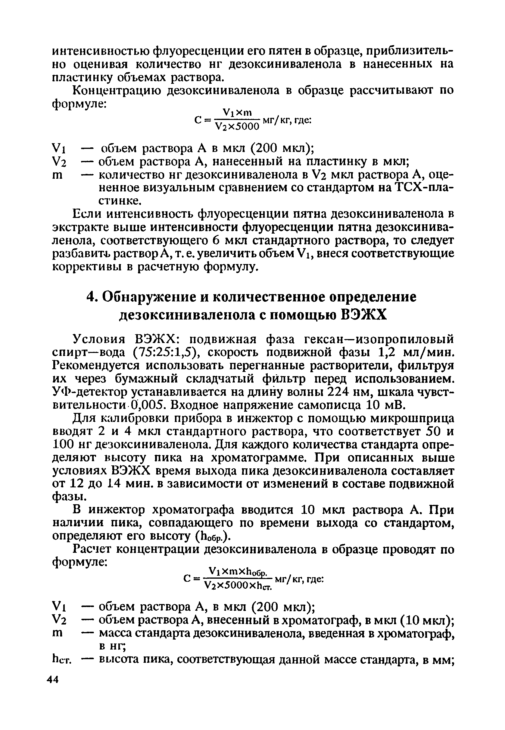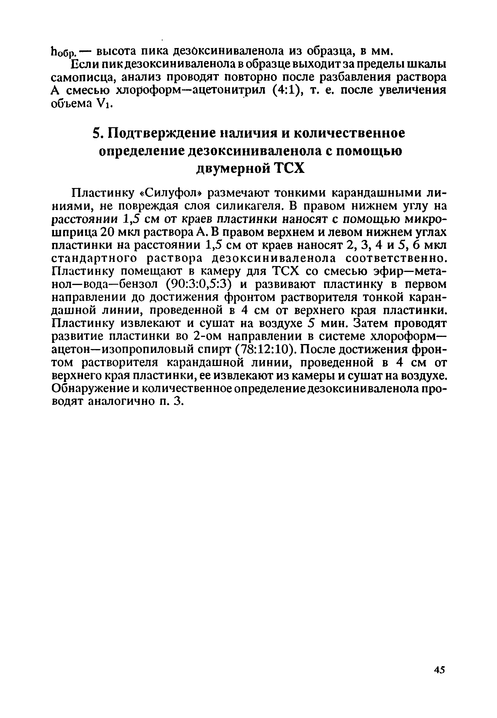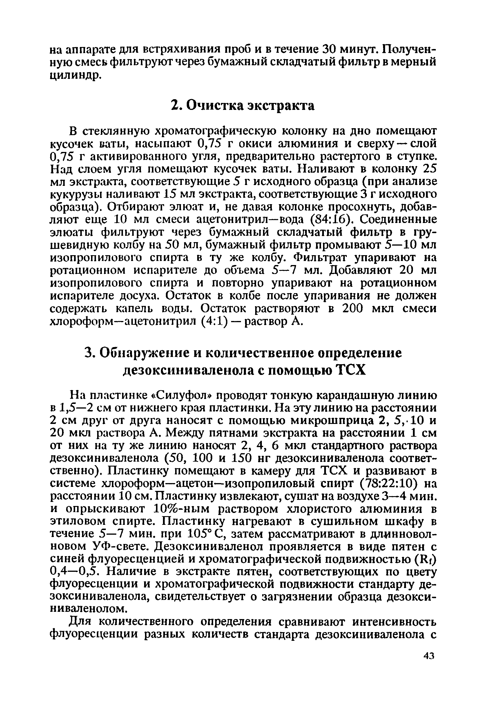 | Оглавление: | Оборудование и материалы 1. Экстракция 2. Очистка экстракта 3. Обнаружение и количественное определение дезоксиниваленола с помощью ТСХ 4. Обнаружение и количественное определение дезоксиниваленола с помощью ВЭЖХ 5. Подтверждение наличия и количественное определение дезоксиниваленола с помощью двумерной ТСХ |