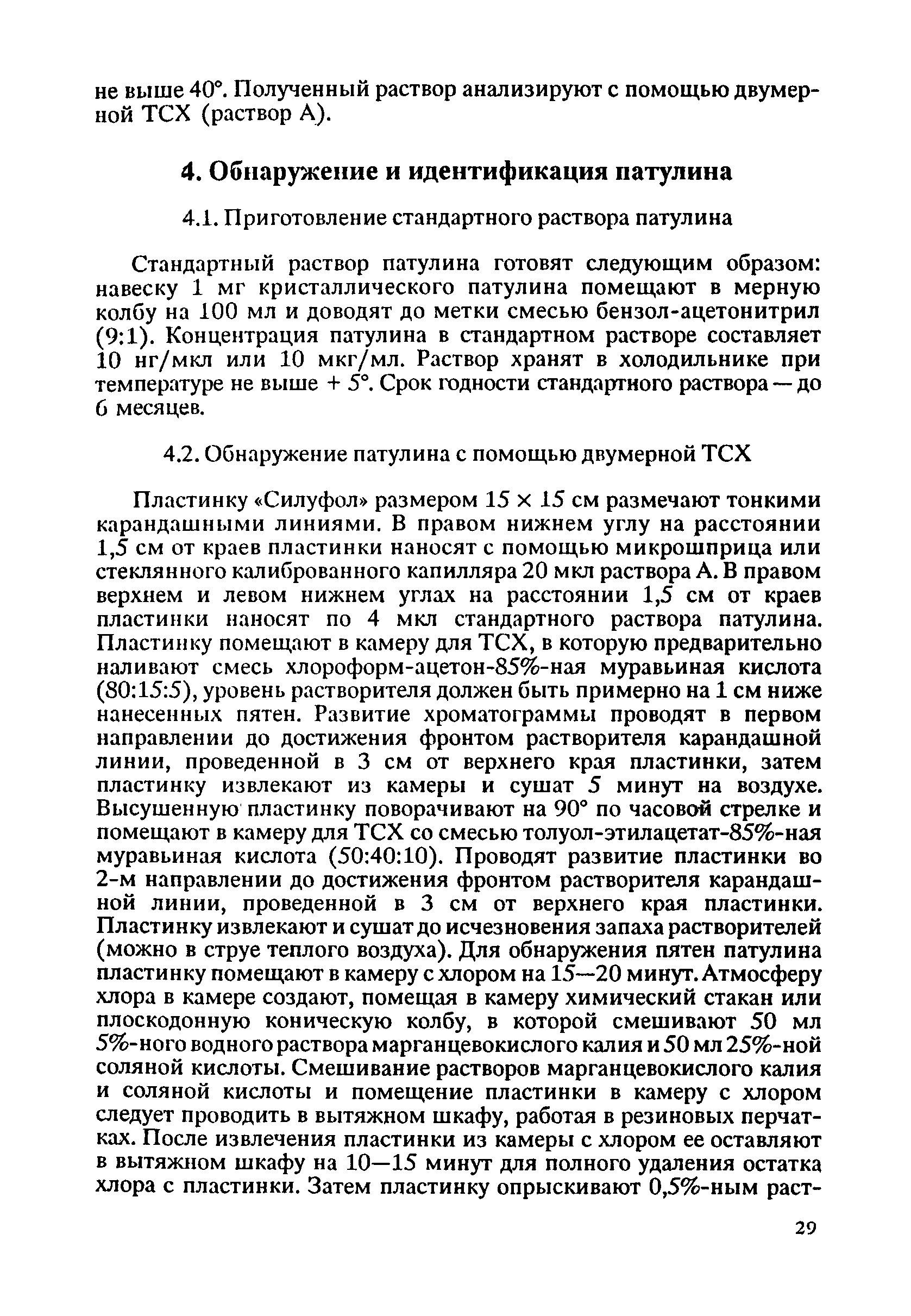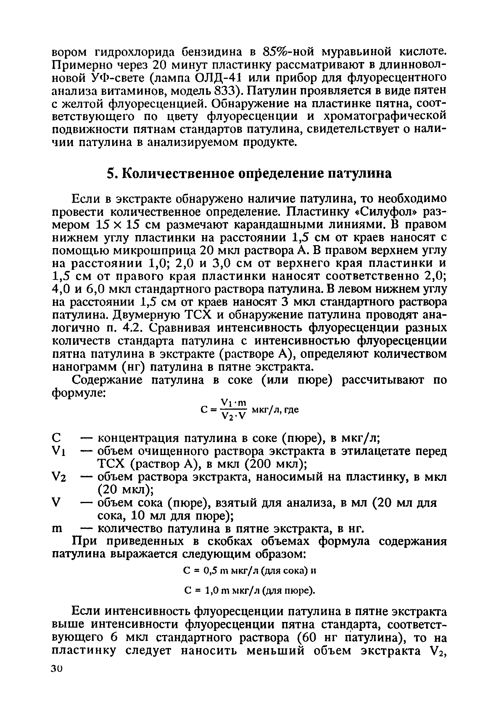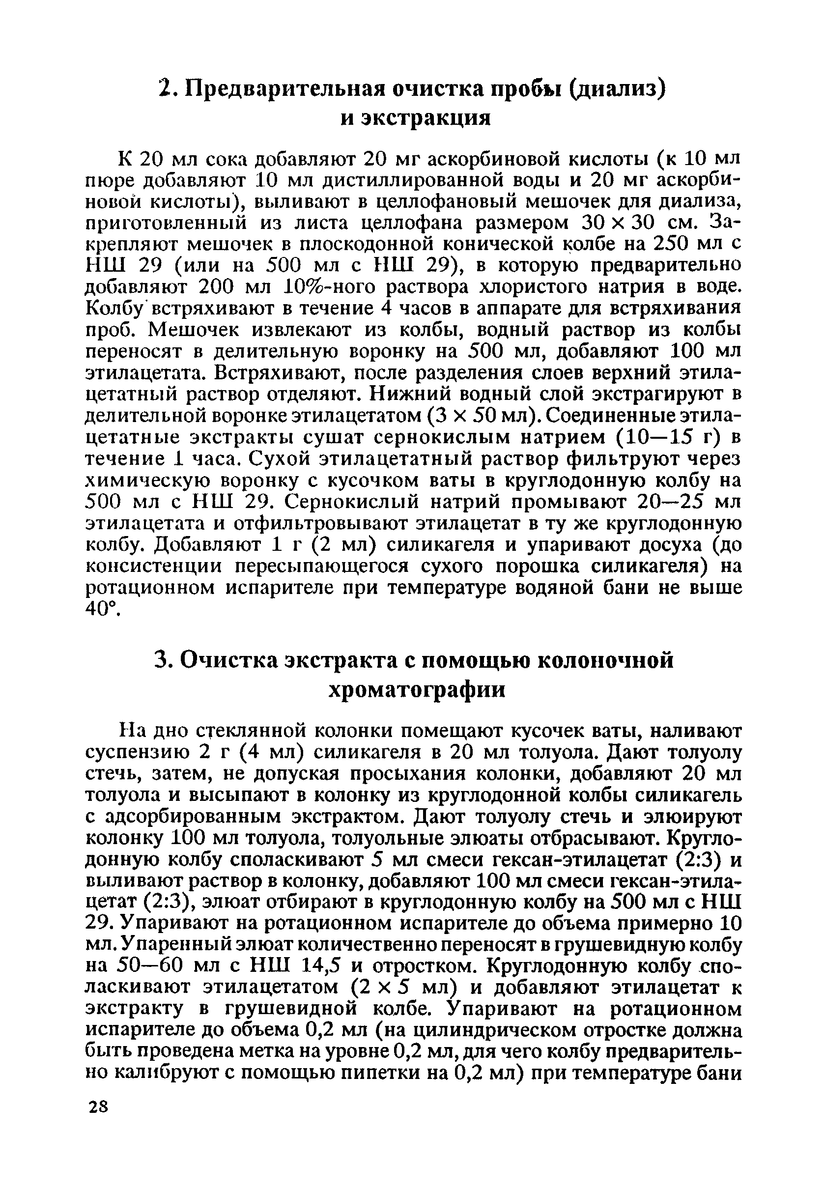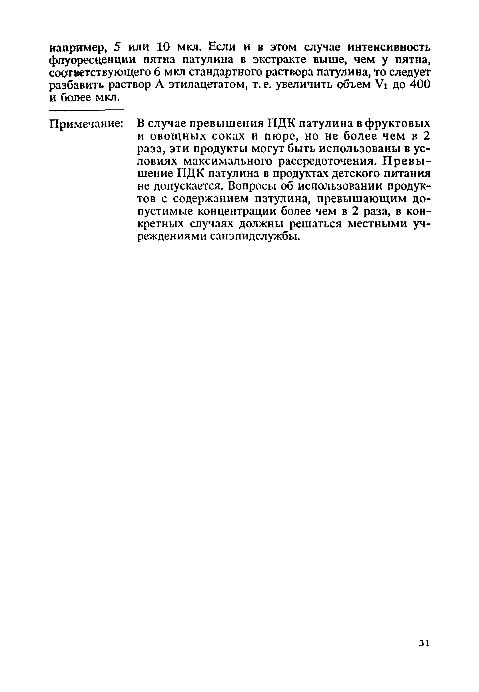 Методика определения содержания патулина в фруктовых и овощных соках и пюре| Статус: | справочные материалы, мп, тпр | | Название рус.: | Методика определения содержания патулина в фруктовых и овощных соках и пюре | | Дата добавления в базу: | 12.02.2016 | | Дата актуализации: | 01.01.2021 | | Оглавление: | Оборудование и материалы 1. Подготовка пробы для анализа 2. Предварительная очистка пробы (диализ) и экстракция 3. Очистка экстракта с помощью колоночной хроматографии 4. Обнаружение и идентификация патулина 5. Количественное определение патулина | | Утверждён: | 30.12.1982 МЗ СССР