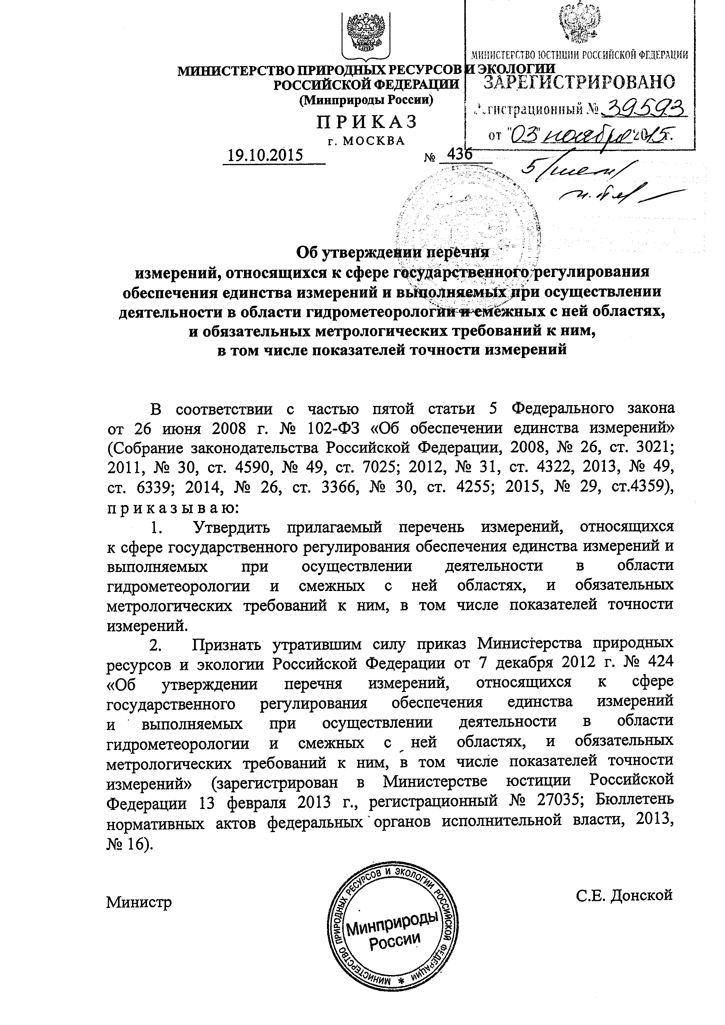 | | Заменяет собой: | - Приказ от 07.12.2012 г. № 424 «Об утверждении перечня измерений, относящихся к сфере государственного регулирования обеспечения единства измерений и выполняемых при осуществлении деятельности в области гидрометеорологии и смежных с ней областях, и обязательных метрологических требований к ним, в том числе показателей точности измерений»