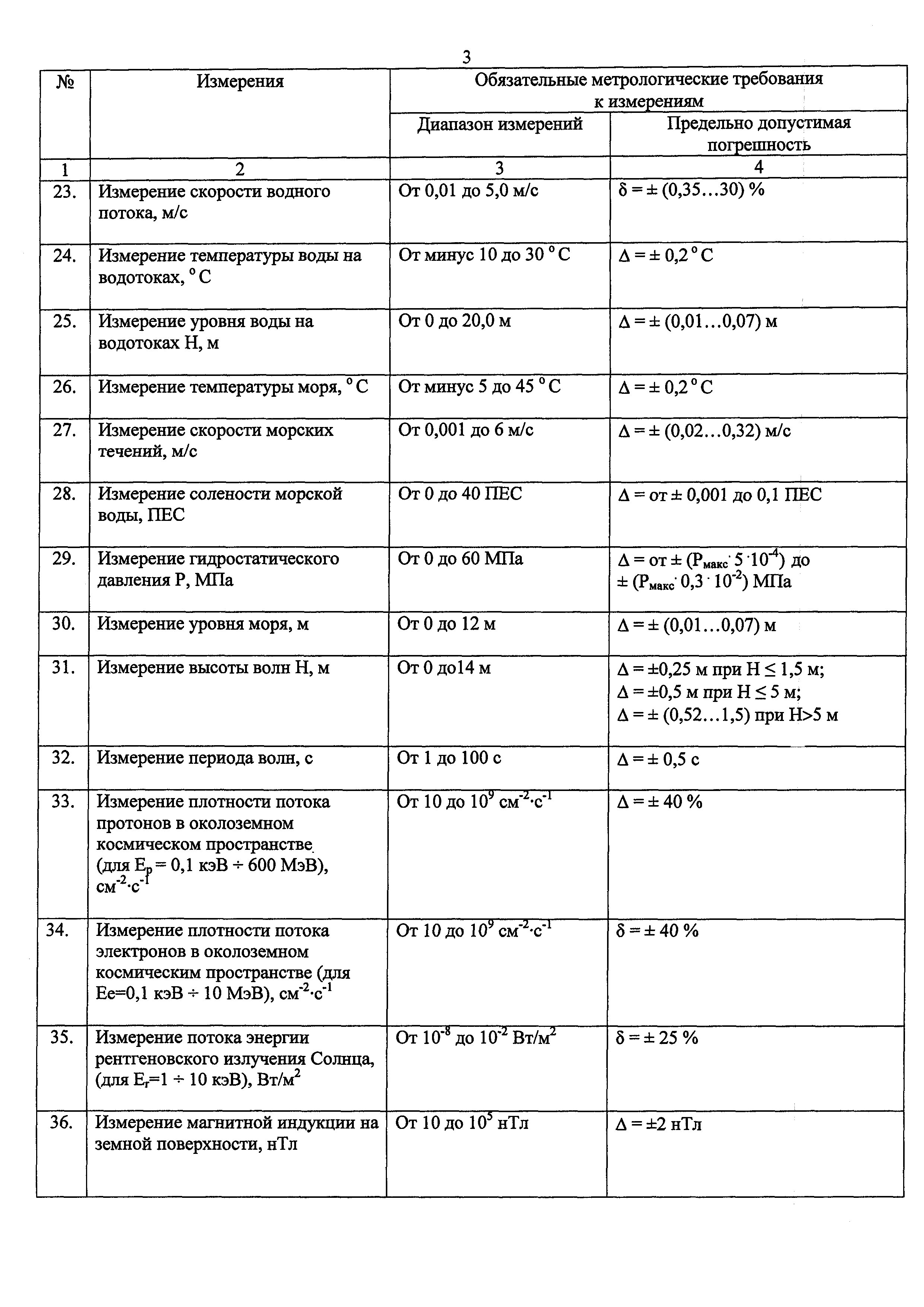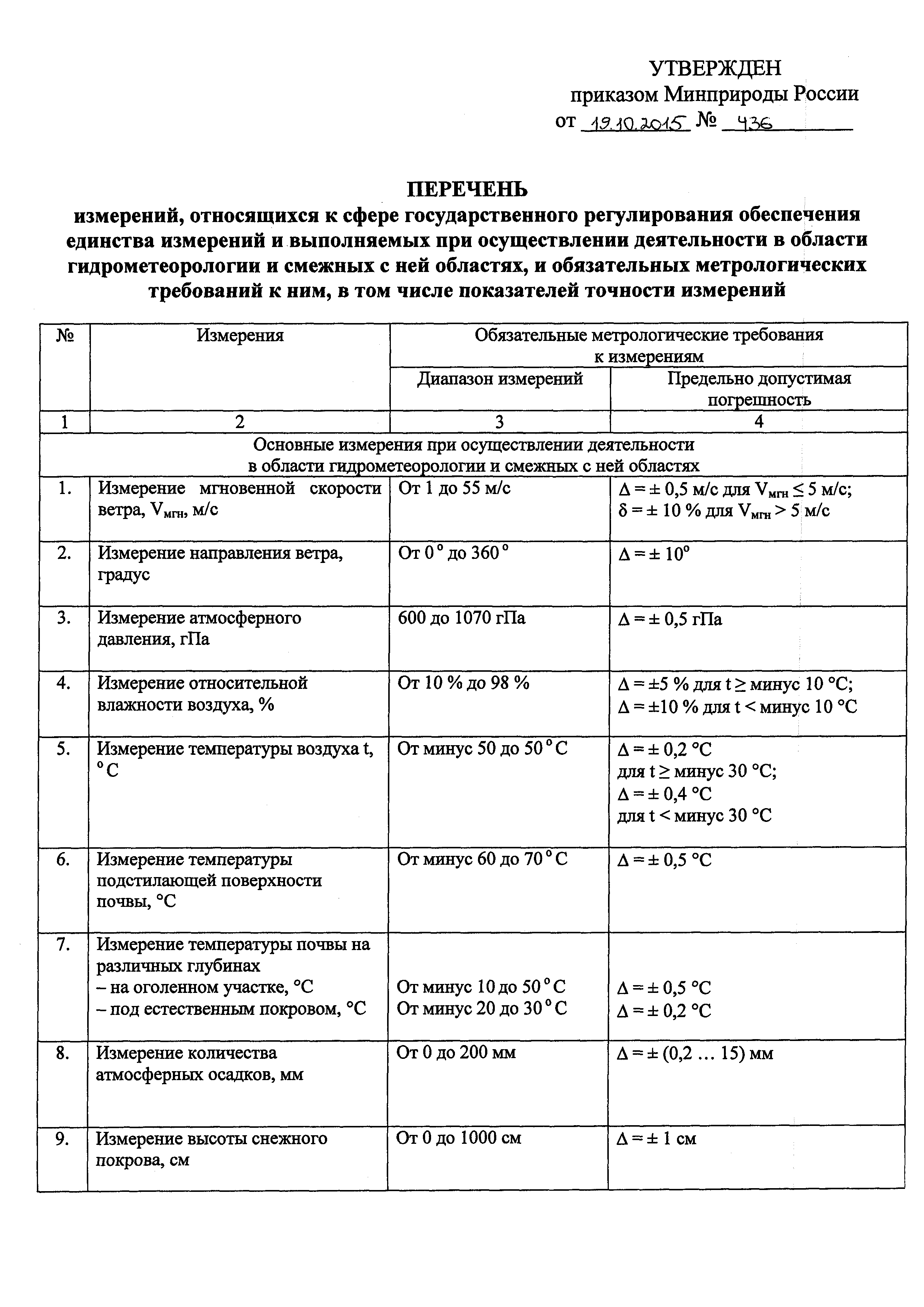 Перечень измерений, относящихся к сфере государственного регулирования обеспечения единства измерений и выполняемых при осуществлении деятельности в области гидрометеорологии и смежных с ней областях, и обязательных метрологических требований к ним, в том числе показателей точности измерений| Статус: | действует | | Название рус.: | Перечень измерений, относящихся к сфере государственного регулирования обеспечения единства измерений и выполняемых при осуществлении деятельности в области гидрометеорологии и смежных с ней областях, и обязательных метрологических требований к ним, в том числе показателей точности измерений | | Дата добавления в базу: | 12.02.2016 | | Дата актуализации: | 01.01.2021 | | Дата введения: | 17.11.2015 | | Дата окончания срока действия: | 01.01.2021 | | Оглавление: | Об утверждении перечня измерений, относящихся к сфере государственного регулирования обеспечения единства измерений и выполняемых при осуществлении деятельности в области гидрометеорологии и смежных с ней областях, и обязательных метрологических ... Перечень измерений, относящихся к сфере государственного регулирования обеспечения единства измерений и выполняемых при осуществлении деятельности в области гидрометеорологии и смежных с ней областях, и обязательных метрологических требований к ним, ... | | Утверждён: | 19.10.2015 Минприроды России (Министерство природных ресурсов и экологии РФ) (436)