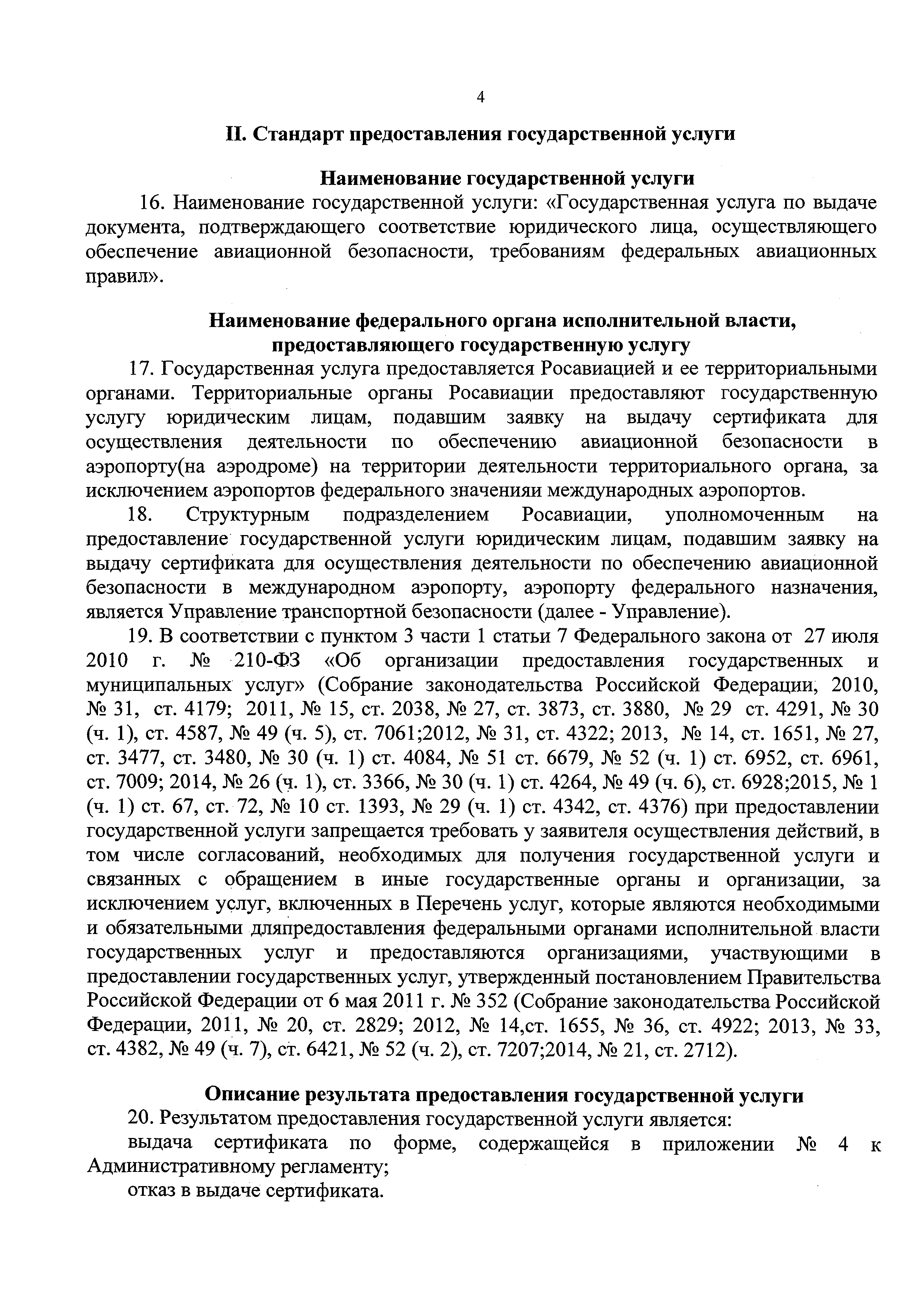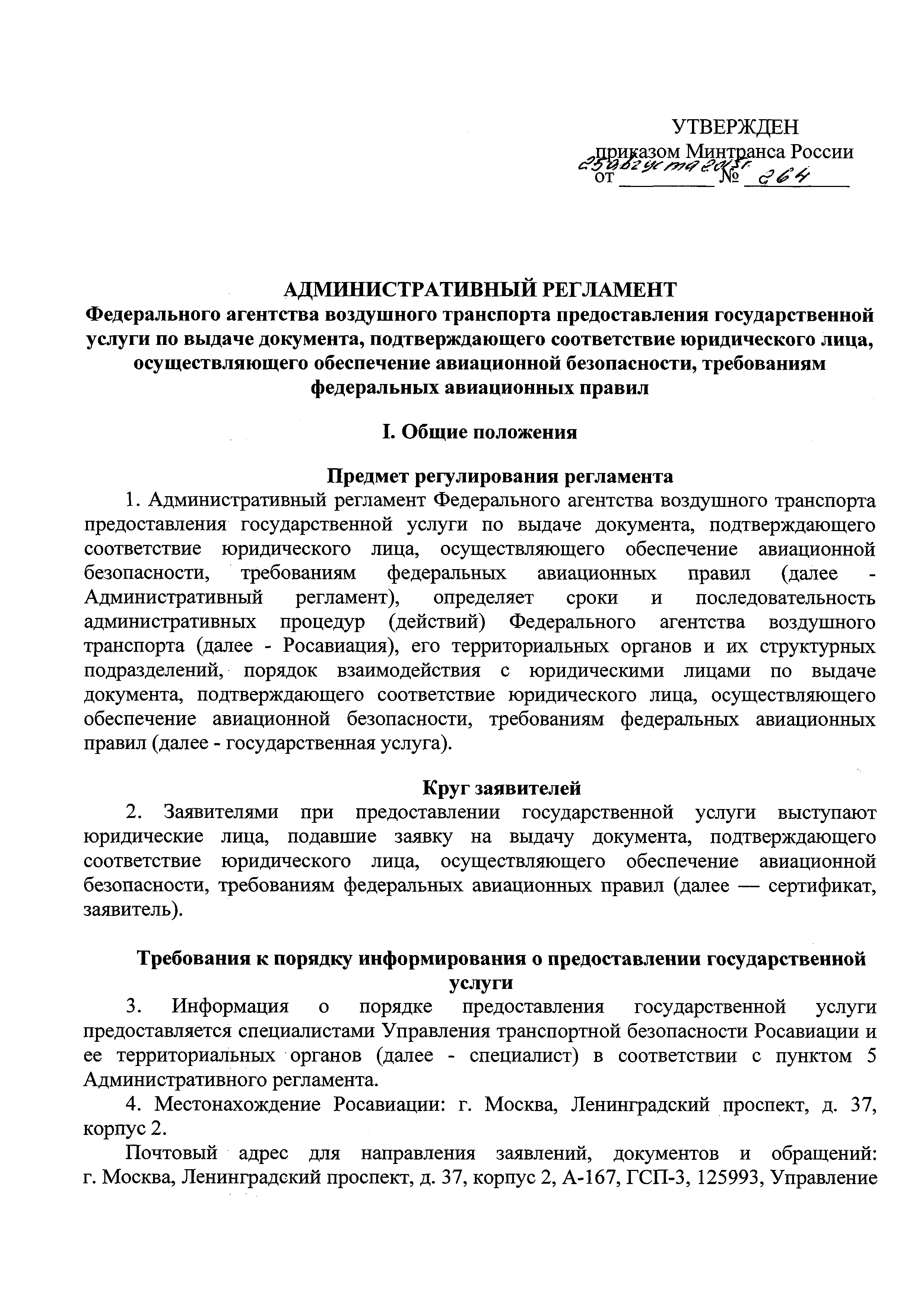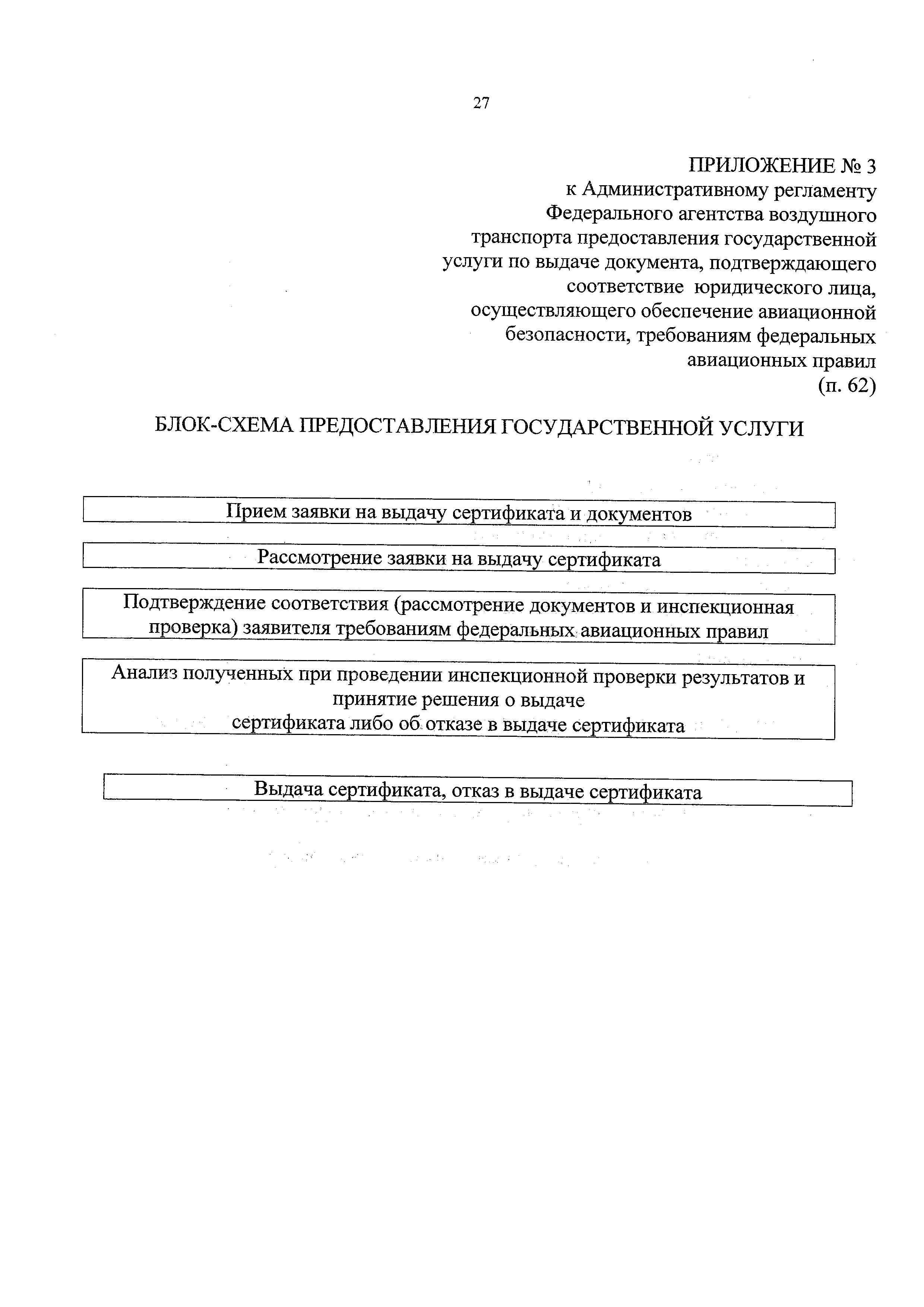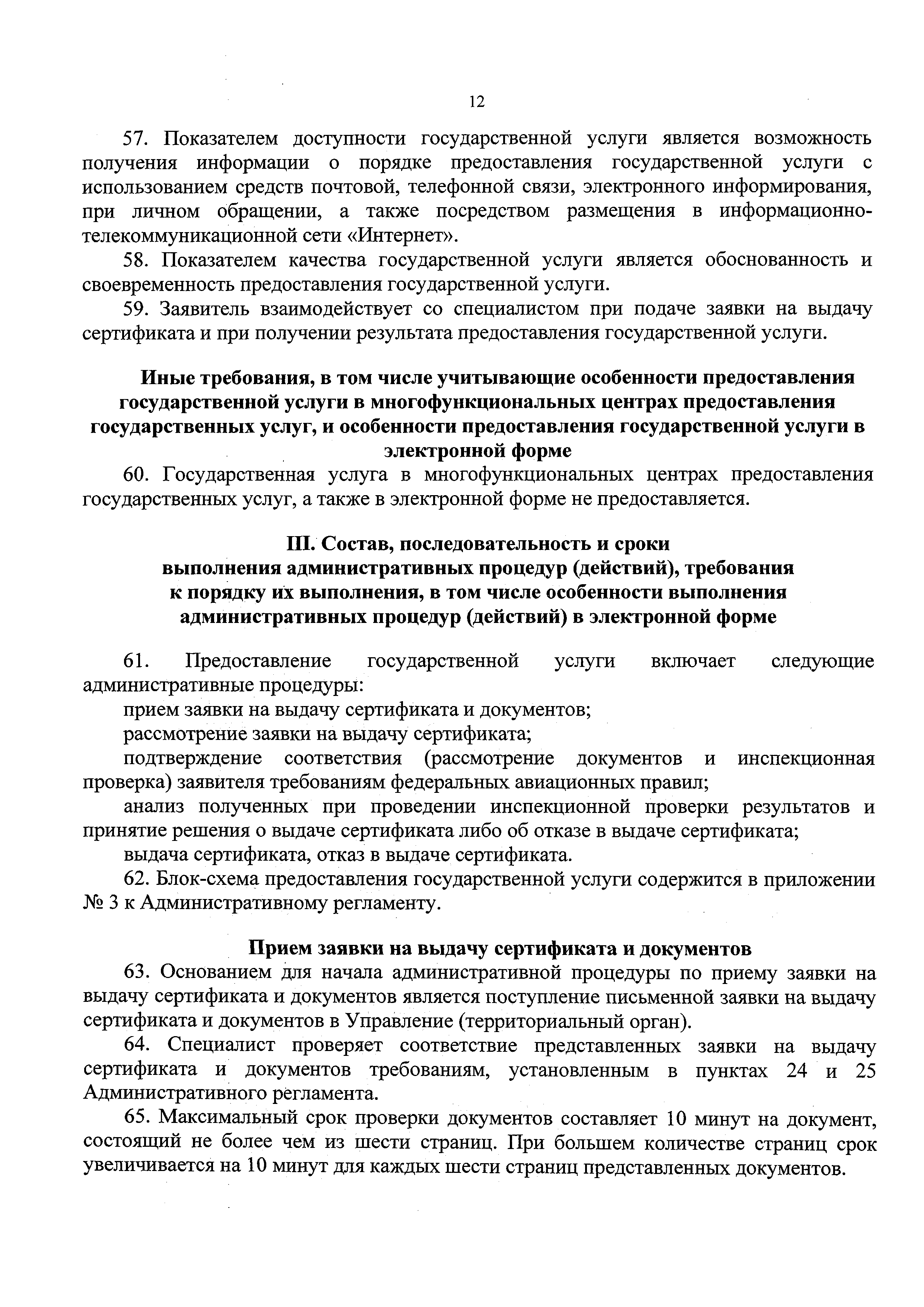 | Оглавление: | I. Общие положения II. Стандарт предоставления государственной услуги III. Состав, последовательность и сроки выполнения административных процедур (действий), требования к порядку их выполнения, в том числе особенности выполнения административных процедур (действий) в электронной форме IV. Формы контроля за исполнением регламента V. Досудебный (внесудебный) порядок обжалования решений и действий (бездействия) федерального органа исполнительной власти, предоставляющего государственную услугу, а также его должностных лиц Приложение № 1. Заявка на выдачу сертификата Приложение № 2. Сведения о Росавиации и ее территориальных органах Приложение № 3. Блок-схема предоставления государственной услуги Приложение № 4. Сертификат |