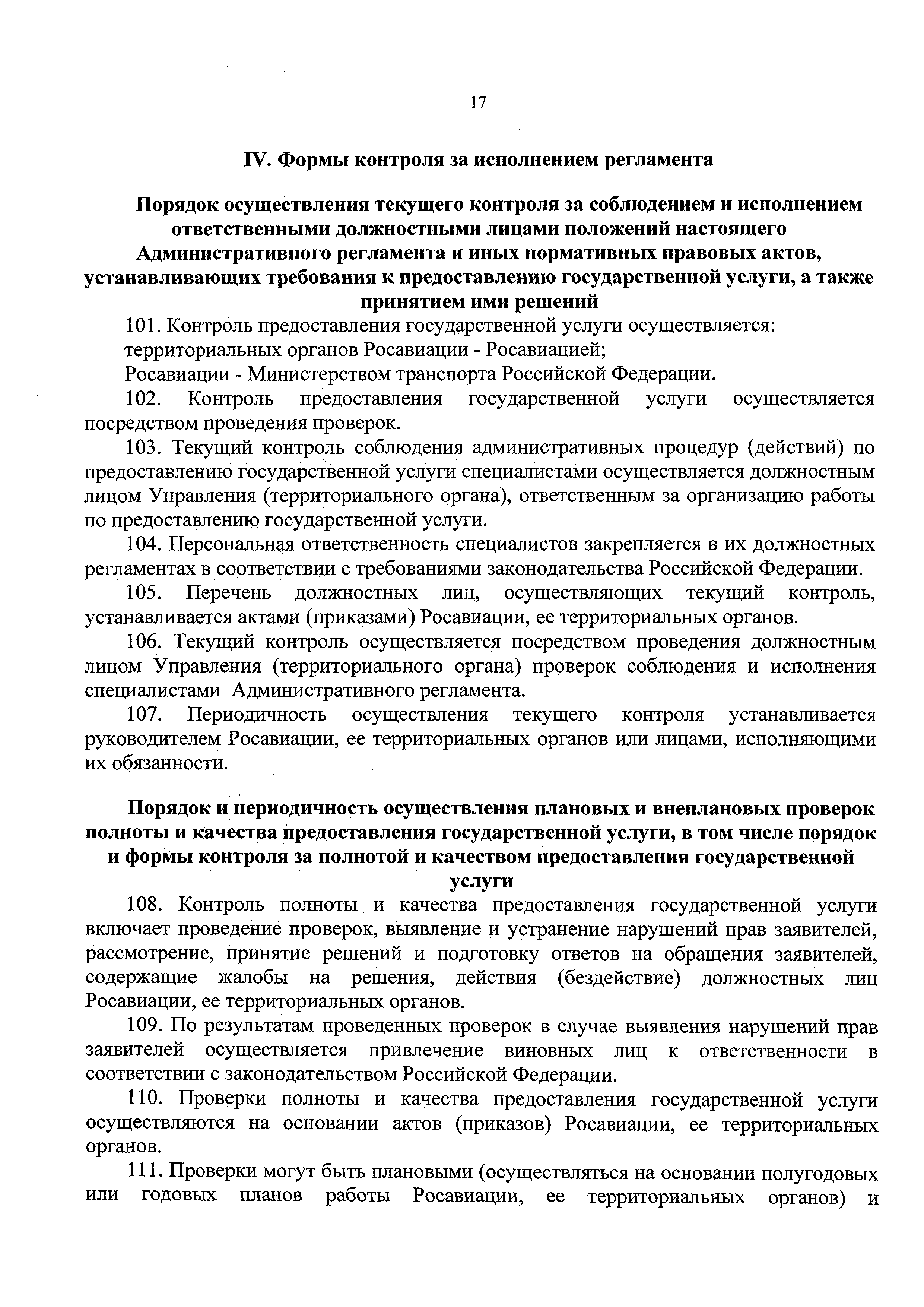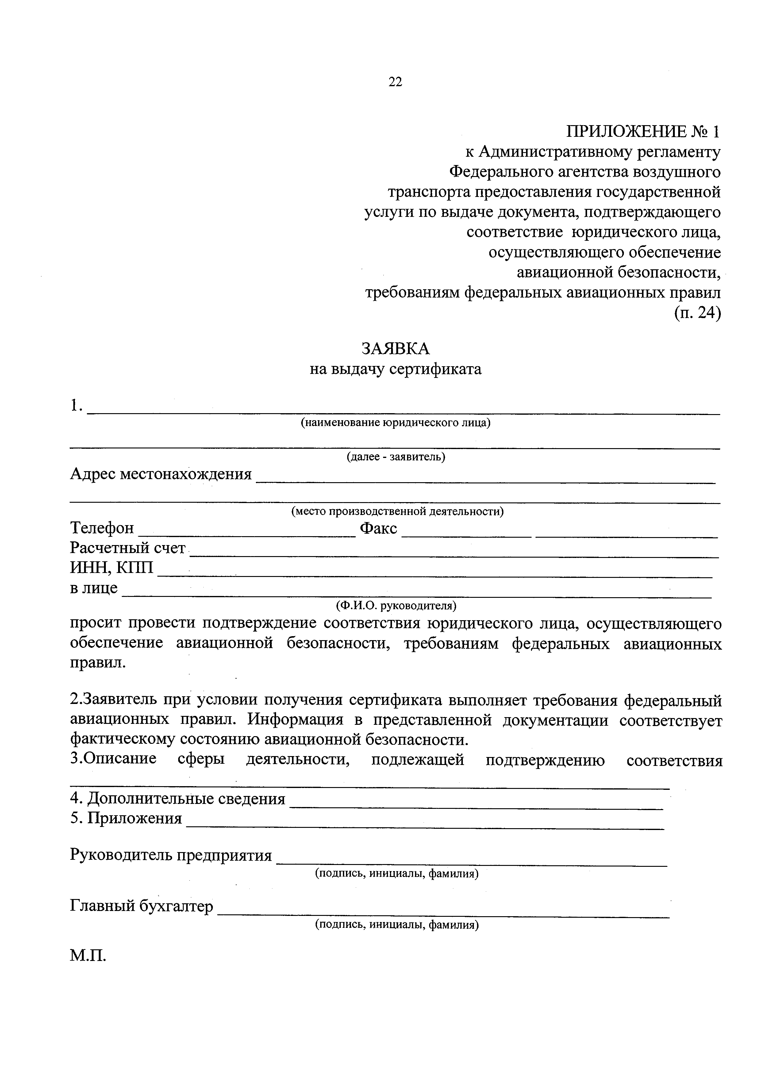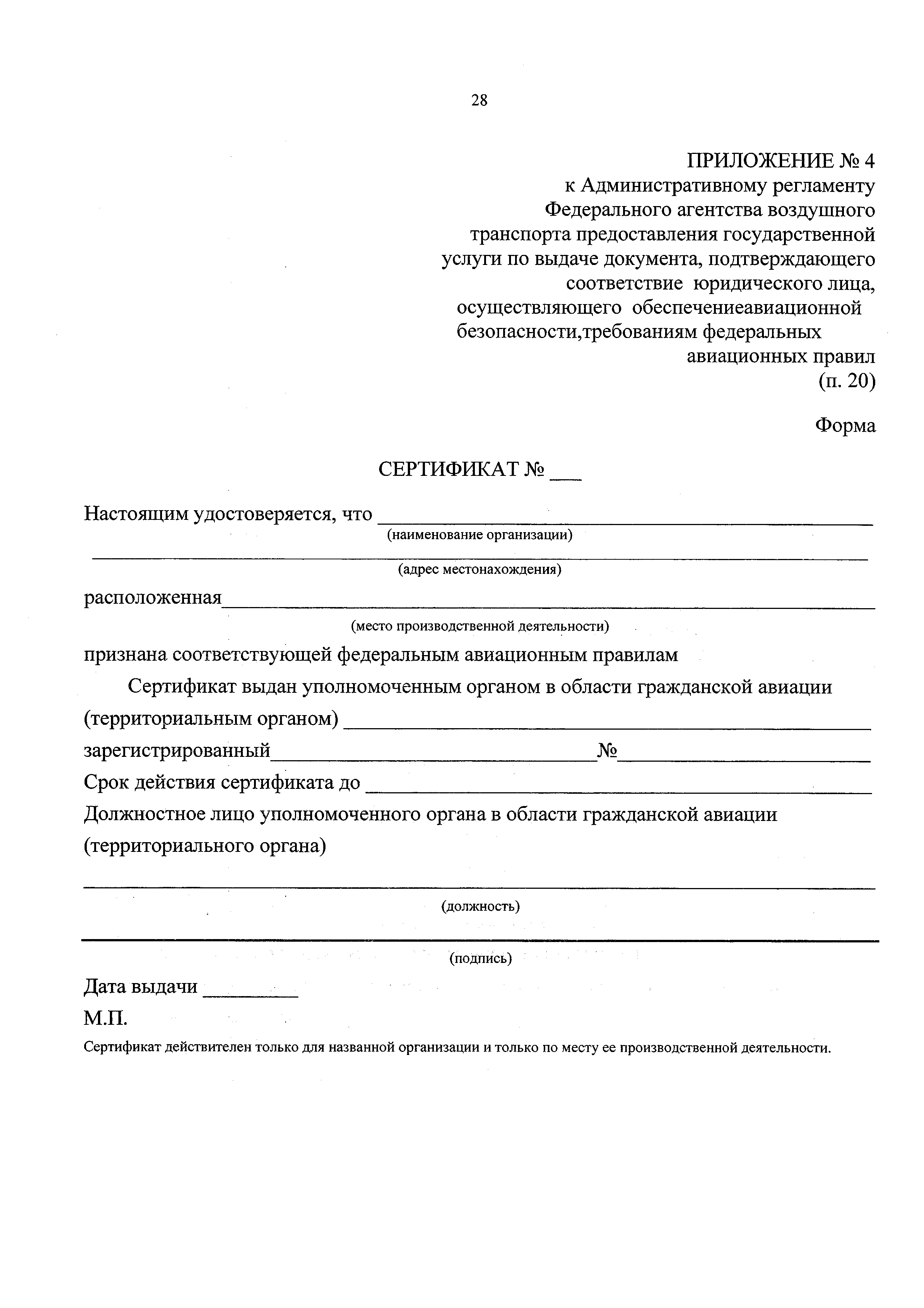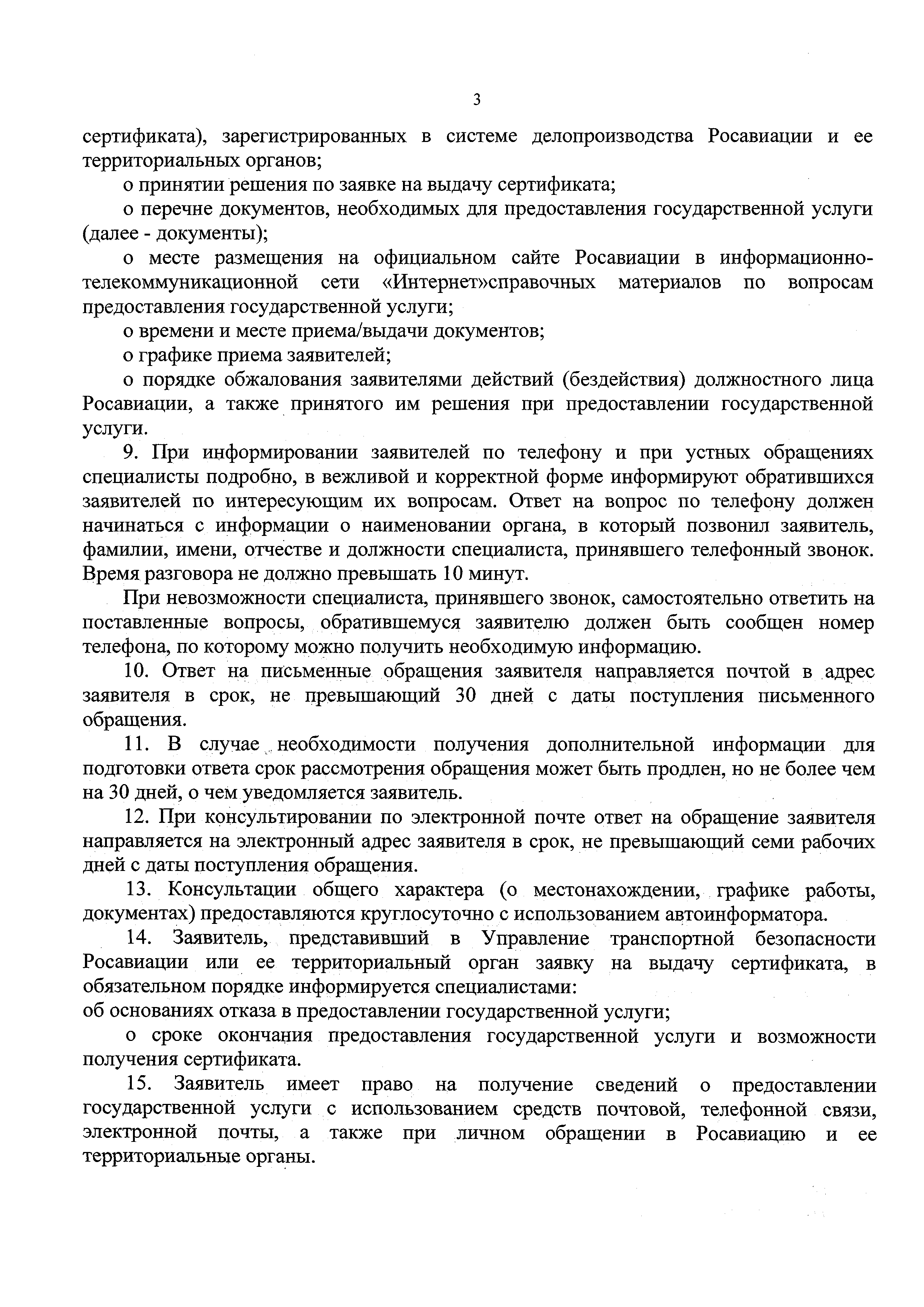 | Оглавление: | I. Общие положения II. Стандарт предоставления государственной услуги III. Состав, последовательность и сроки выполнения административных процедур (действий), требования к порядку их выполнения, в том числе особенности выполнения административных процедур (действий) в электронной форме IV. Формы контроля за исполнением регламента V. Досудебный (внесудебный) порядок обжалования решений и действий (бездействия) федерального органа исполнительной власти, предоставляющего государственную услугу, а также его должностных лиц Приложение № 1. Заявка на выдачу сертификата Приложение № 2. Сведения о Росавиации и ее территориальных органах Приложение № 3. Блок-схема предоставления государственной услуги Приложение № 4. Сертификат |