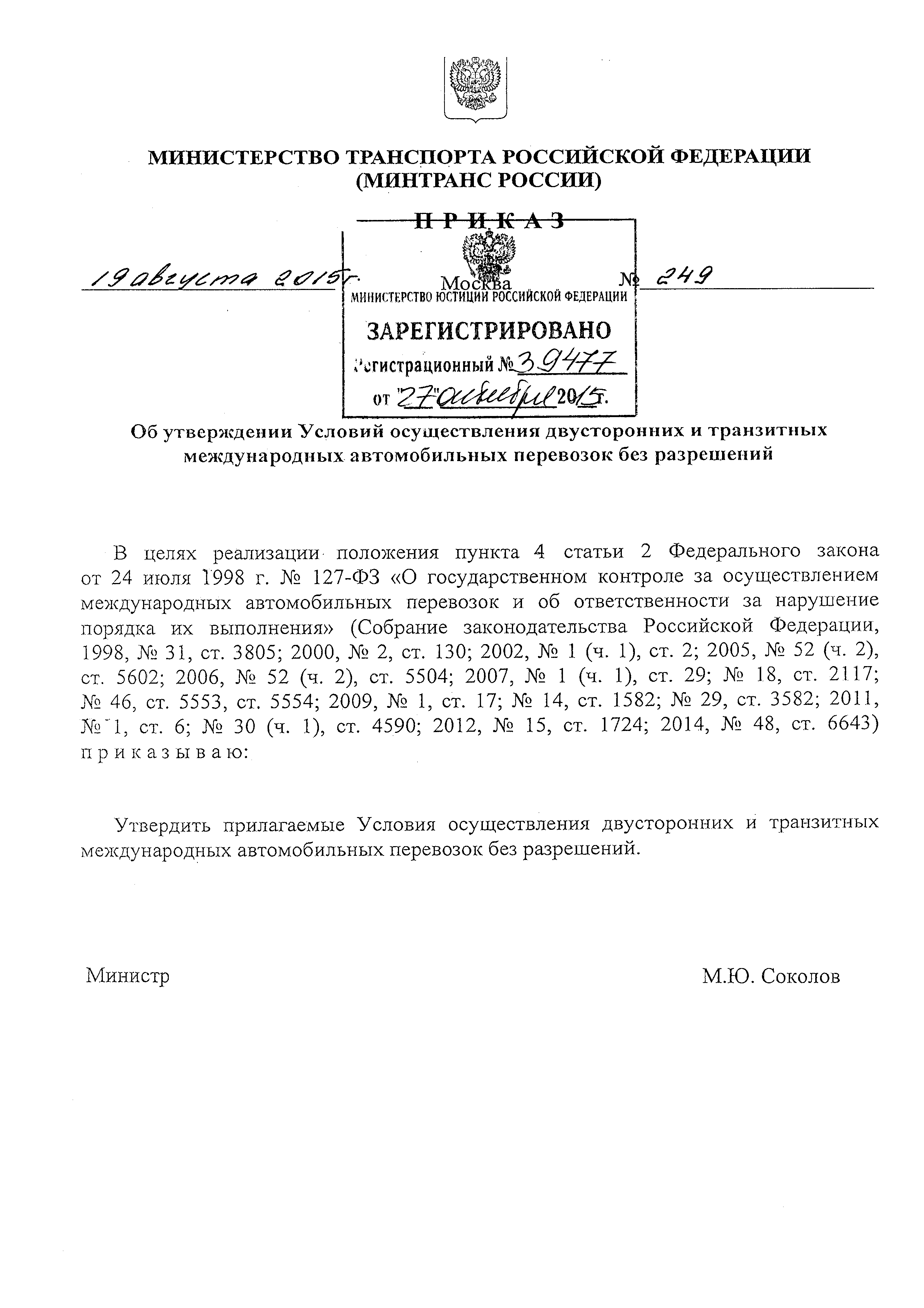 | Утверждён: | 19.08.2015 Минтранс России (Russian Federation Mintrans 249)