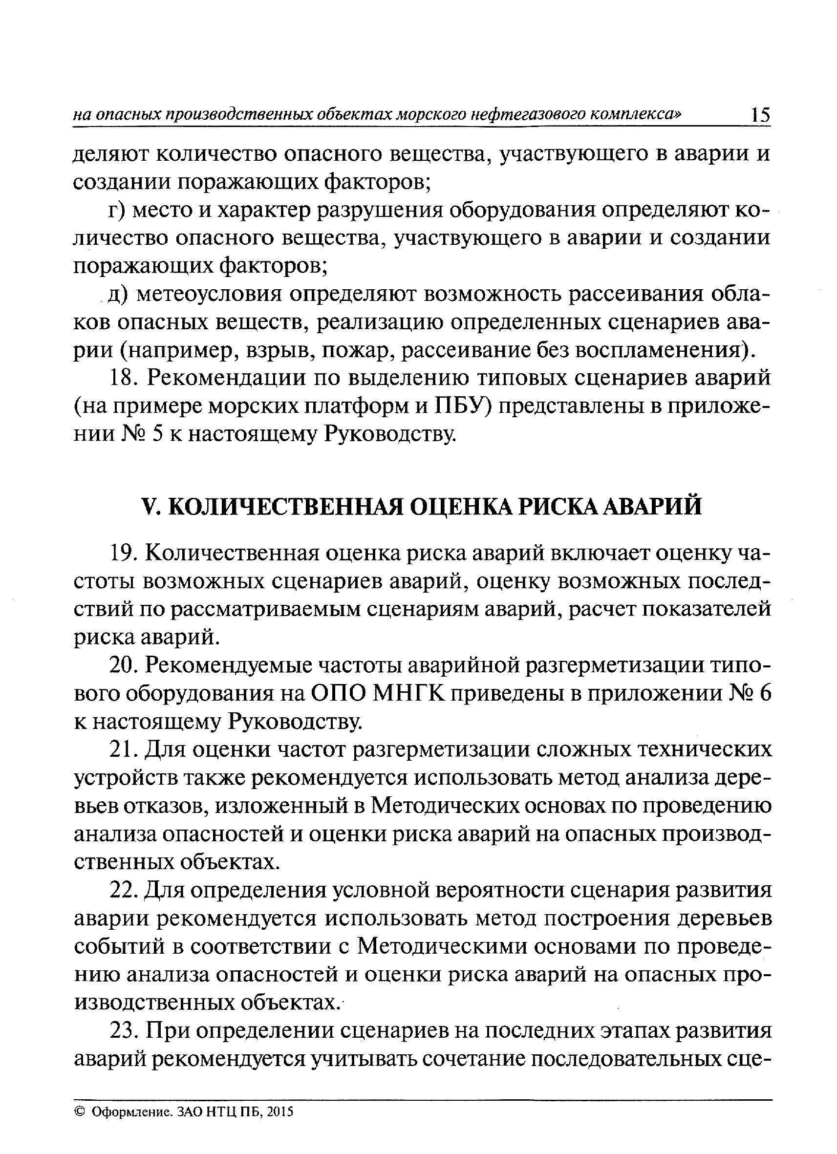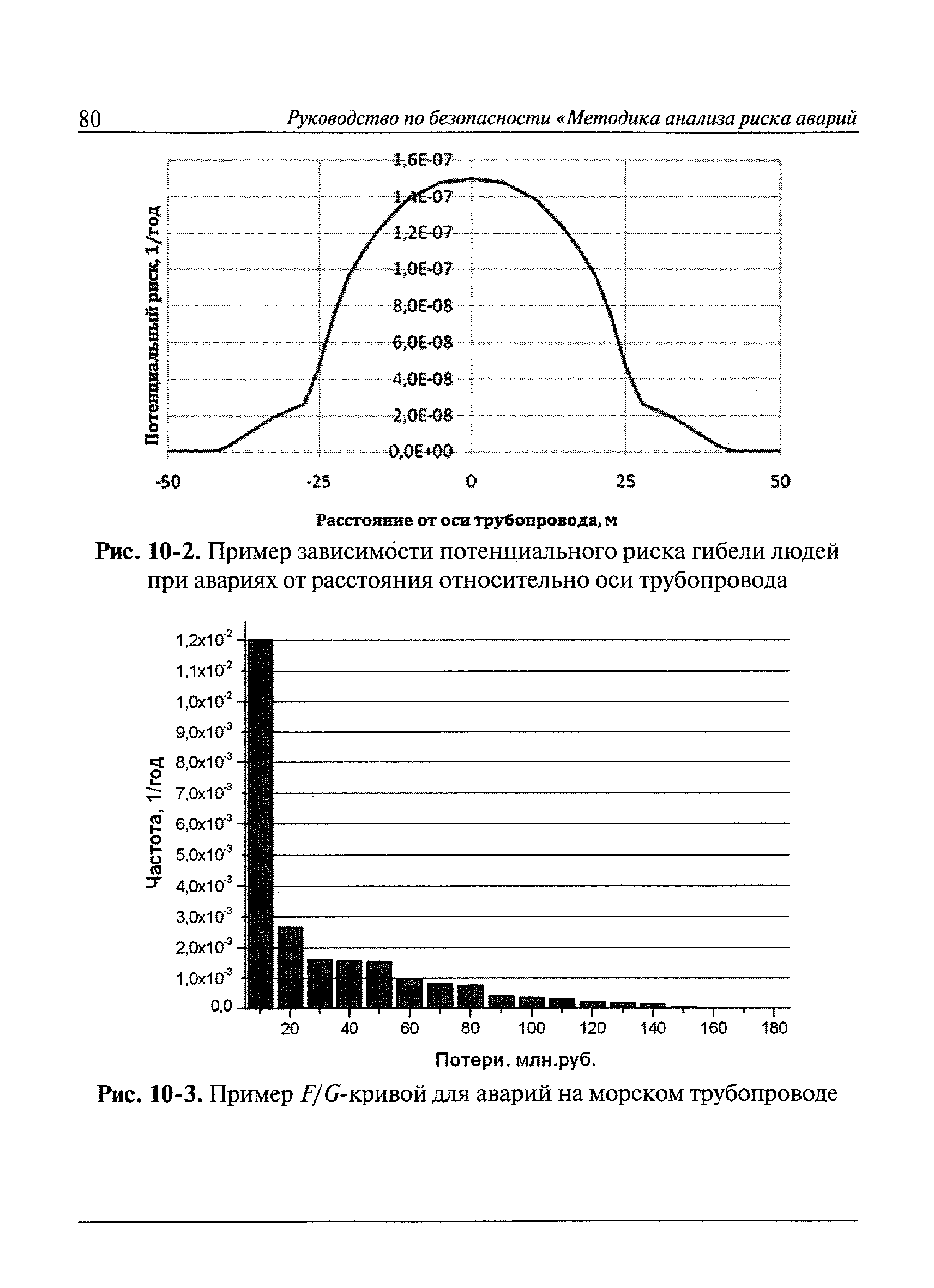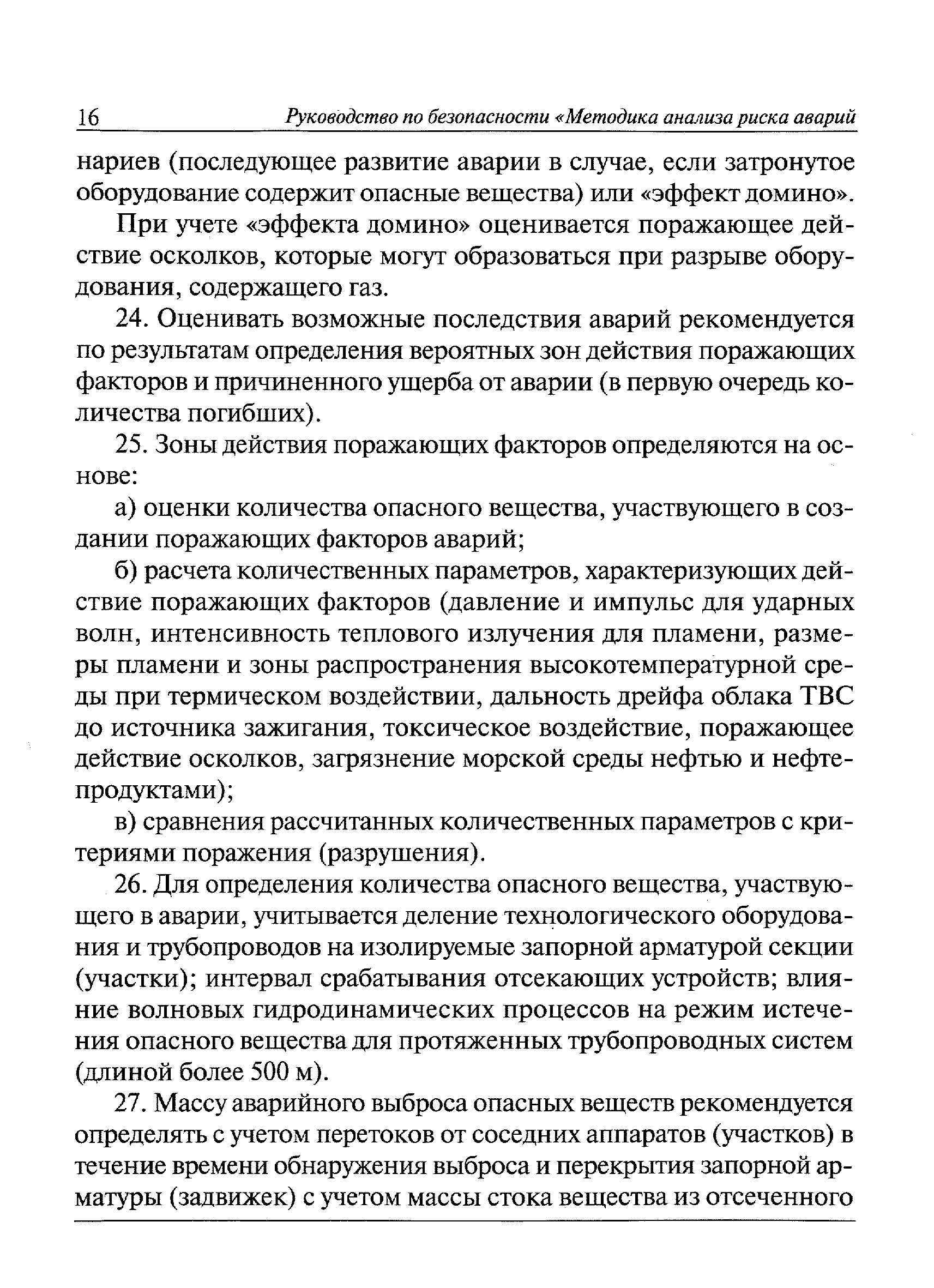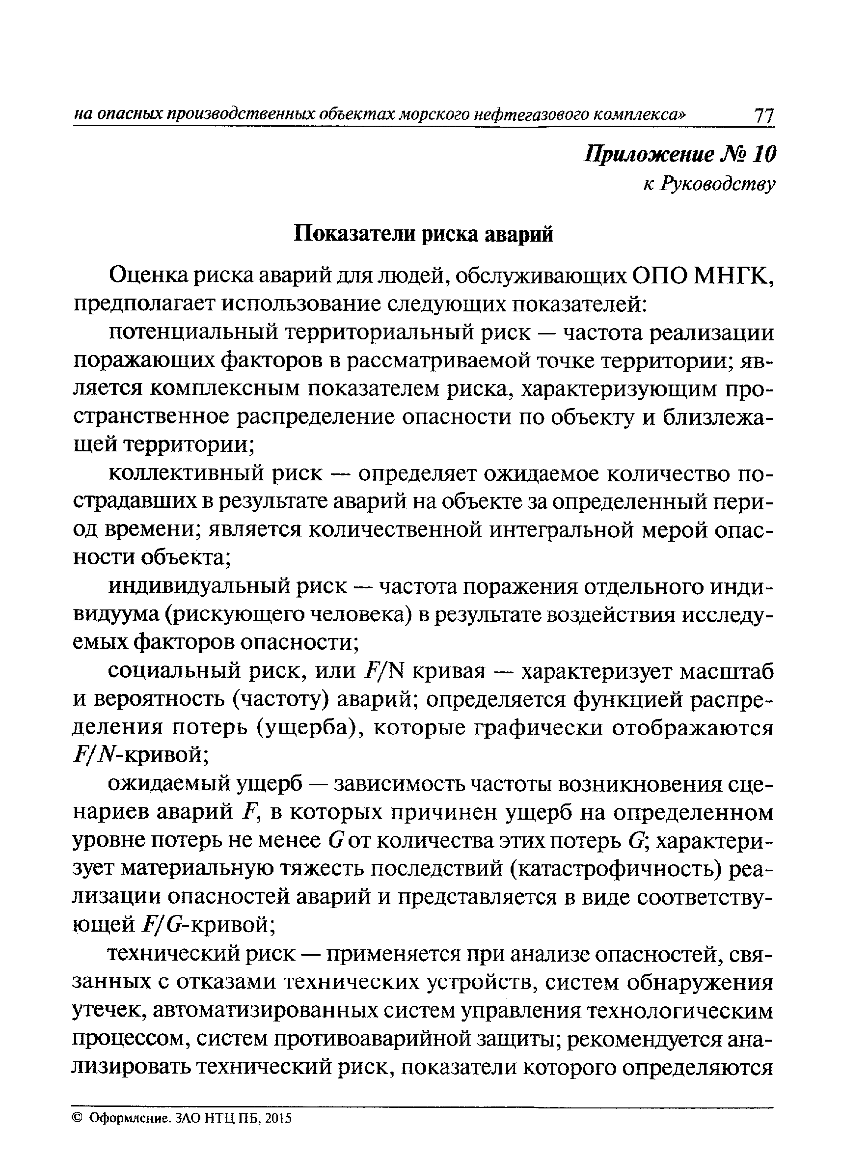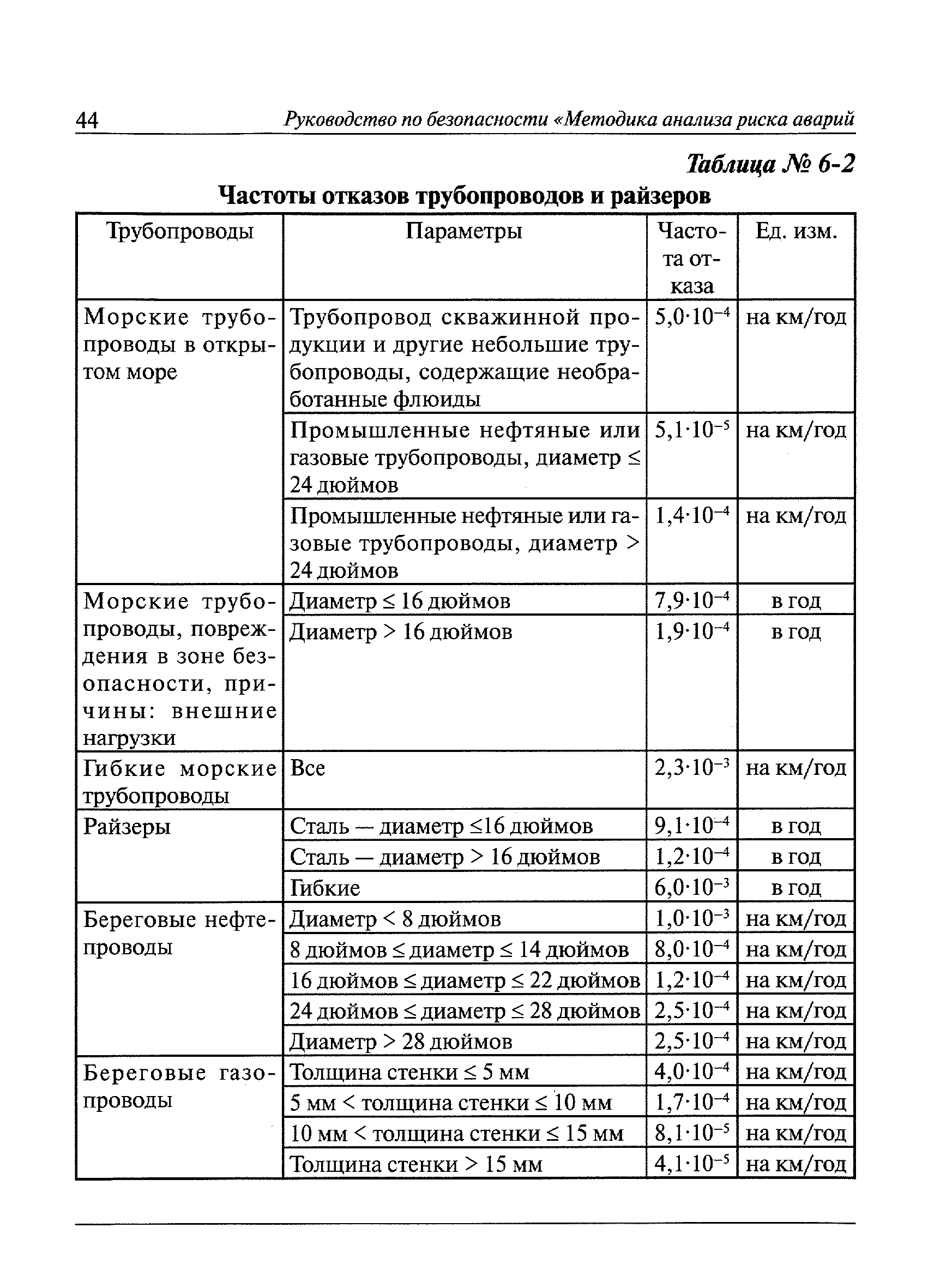 | Оглавление: | I. Общие положения II. Общие рекомендации по оценке риска аварий на ОНО МНГК III. Планирование и организация работ IV. Идентификация опасностей аварий V. Количественная оценка риска аварий VI. Определение степени опасности ОНО МНГК и их участков/составных частей VII. Рекомендации по снижению риска аварий на ОНО МНГК Приложение № 1. Список сокращений Приложение № 2. Термины и определения Приложение № 3. Типовой перечень исходной информации, применяемой для оценки риска аварий Приложение № 4. Рекомендуемые зоны/составные части в зависимости от размещения участков морских трубопроводов Приложение № 5. Рекомендации по выщелению типовых сценариев аварий (на примере морских платформ и ПБУ) Приложение № 6. Частоты аварийной разгерметизации и утечек из типового оборудования на ОНО МИГК Приложение № 7. Рекомендуемый порядок расчета истечения взрывопожароопасных жидкостей из морских трубопроводов Приложение № 8. Величина ожидаемого ущерба при аварии на ОПО МНГК Приложение № 9. Распространение загрязняющих веществ Приложение № 10. Показатели риска аварий Приложение № 11. Методика расчета интенсивности истечения при фонтанировании скважин Приложение № 12. Нормативные правовые и правовые акты для оценки возможных последствий аварий |