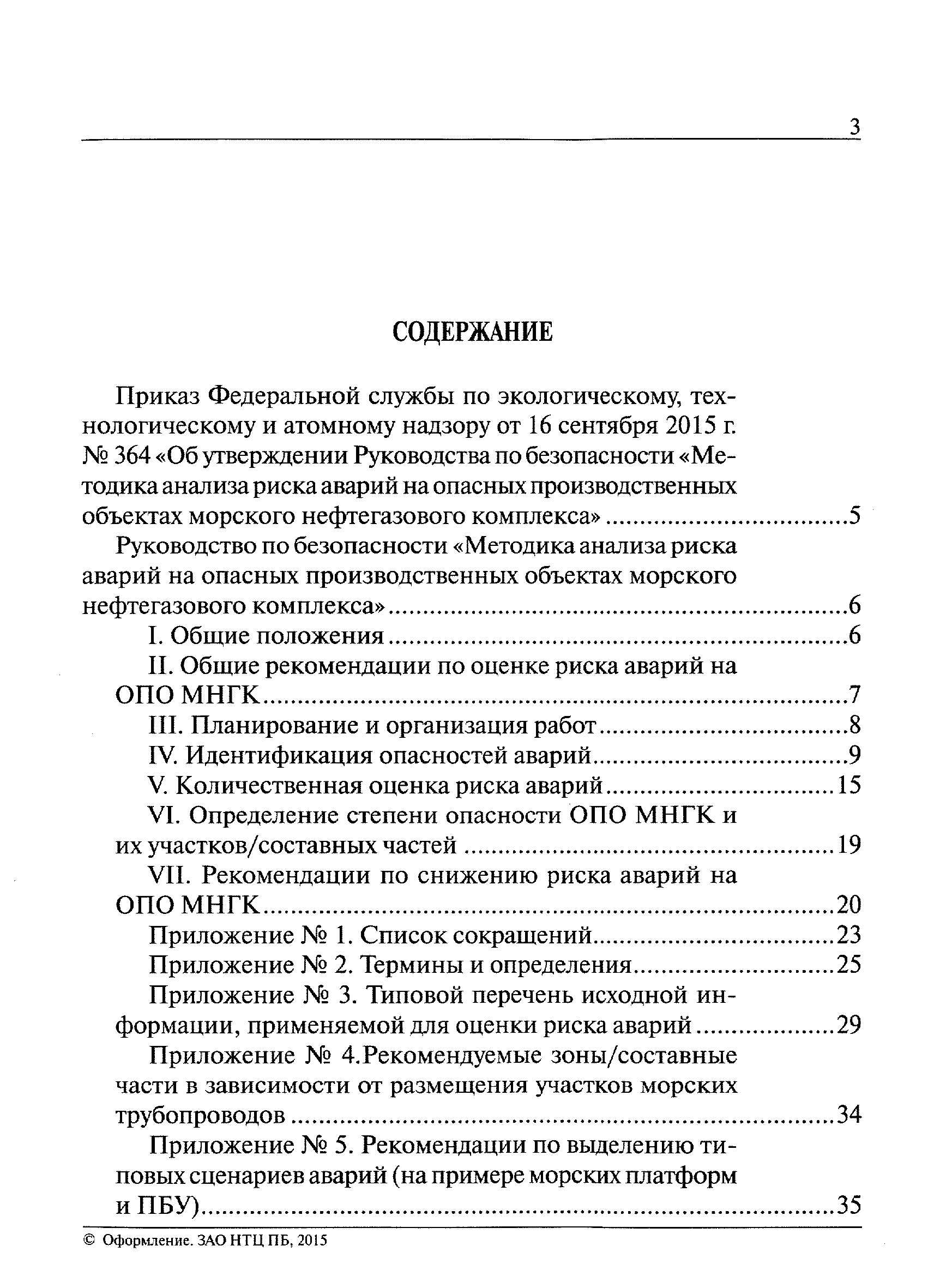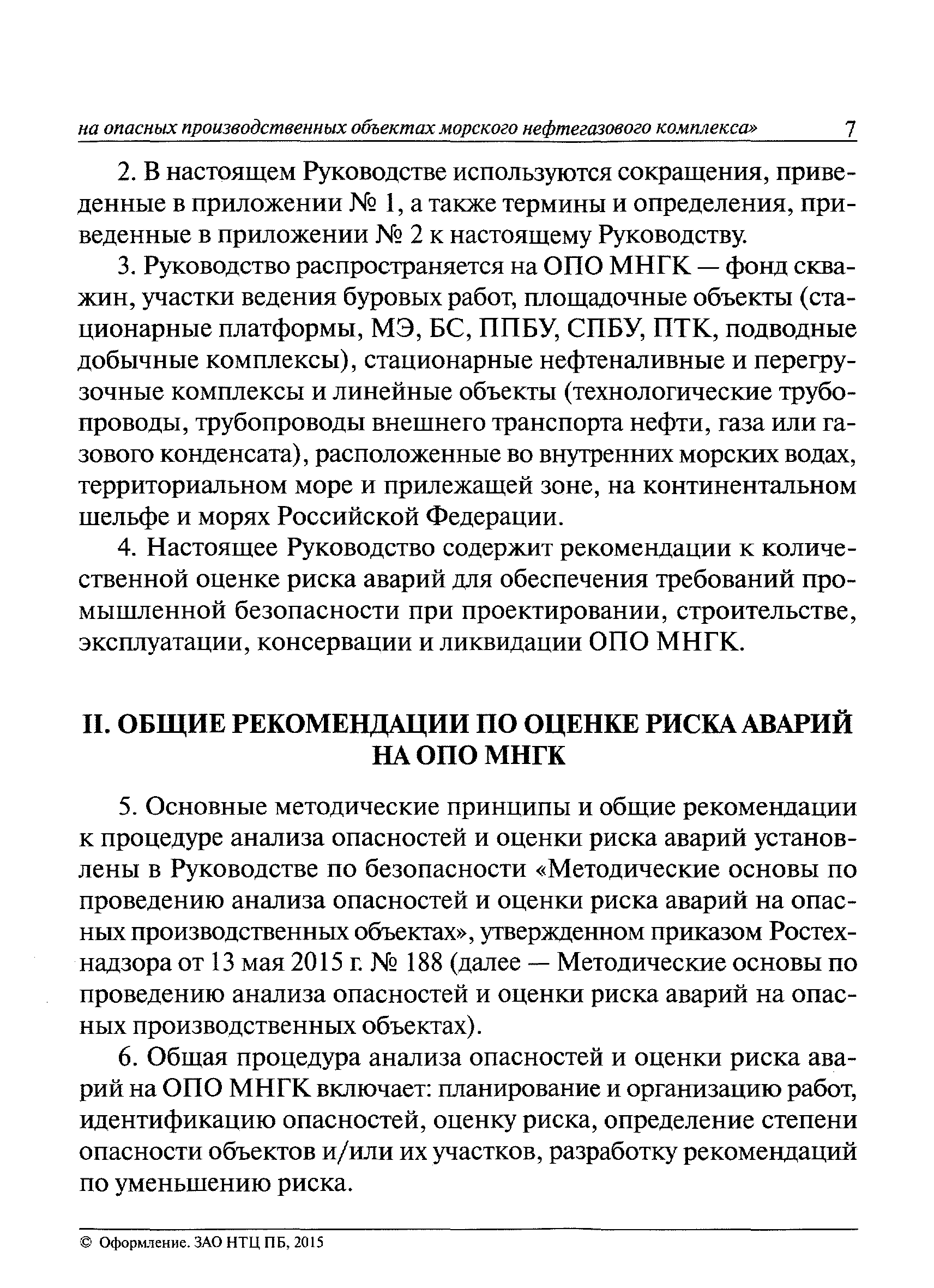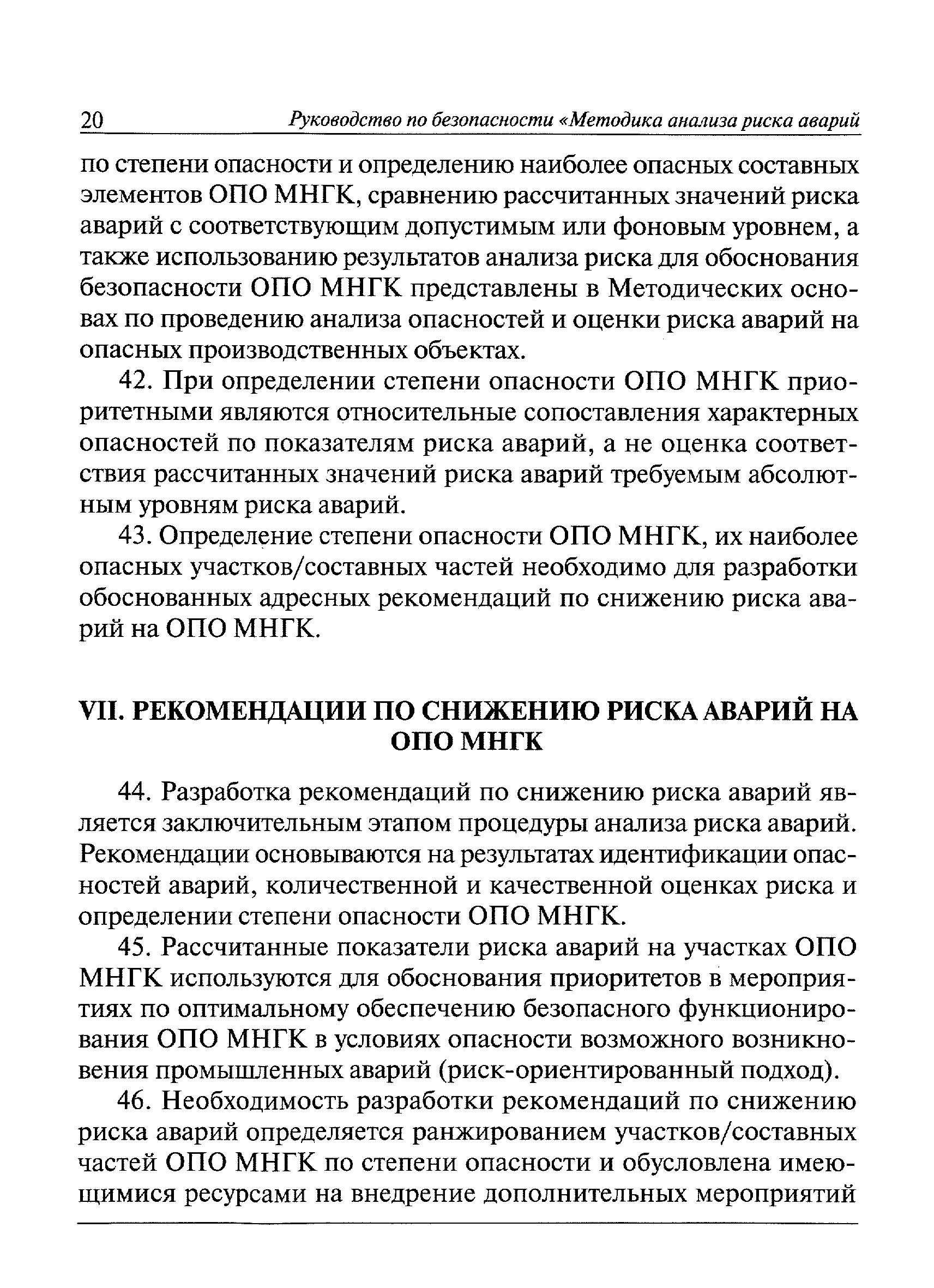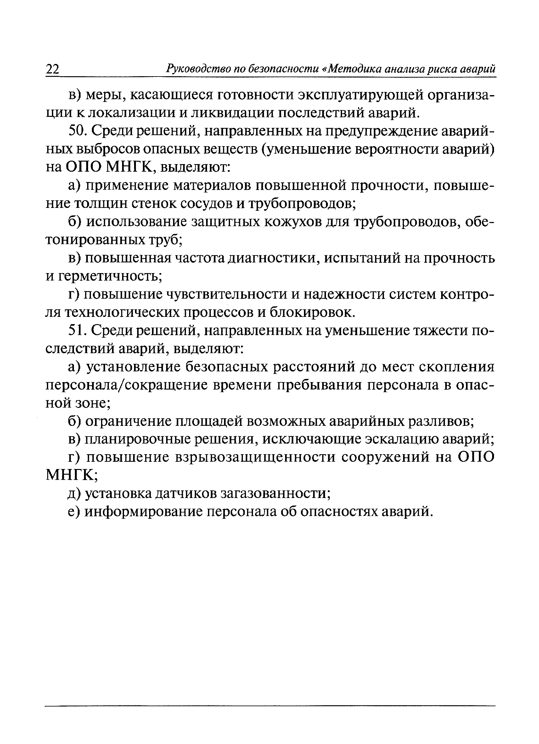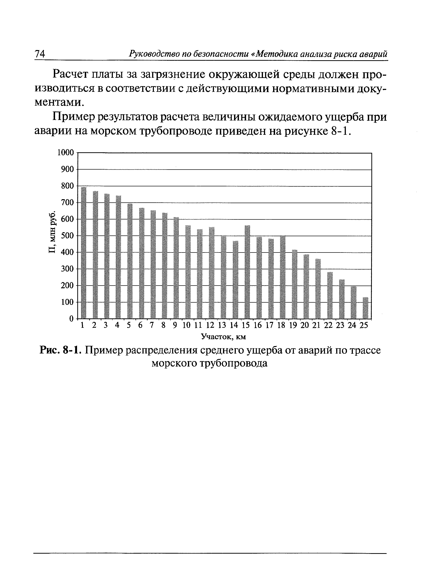 | Оглавление: | I. Общие положения II. Общие рекомендации по оценке риска аварий на ОНО МНГК III. Планирование и организация работ IV. Идентификация опасностей аварий V. Количественная оценка риска аварий VI. Определение степени опасности ОНО МНГК и их участков/составных частей VII. Рекомендации по снижению риска аварий на ОНО МНГК Приложение № 1. Список сокращений Приложение № 2. Термины и определения Приложение № 3. Типовой перечень исходной информации, применяемой для оценки риска аварий Приложение № 4. Рекомендуемые зоны/составные части в зависимости от размещения участков морских трубопроводов Приложение № 5. Рекомендации по выщелению типовых сценариев аварий (на примере морских платформ и ПБУ) Приложение № 6. Частоты аварийной разгерметизации и утечек из типового оборудования на ОНО МИГК Приложение № 7. Рекомендуемый порядок расчета истечения взрывопожароопасных жидкостей из морских трубопроводов Приложение № 8. Величина ожидаемого ущерба при аварии на ОПО МНГК Приложение № 9. Распространение загрязняющих веществ Приложение № 10. Показатели риска аварий Приложение № 11. Методика расчета интенсивности истечения при фонтанировании скважин Приложение № 12. Нормативные правовые и правовые акты для оценки возможных последствий аварий |
